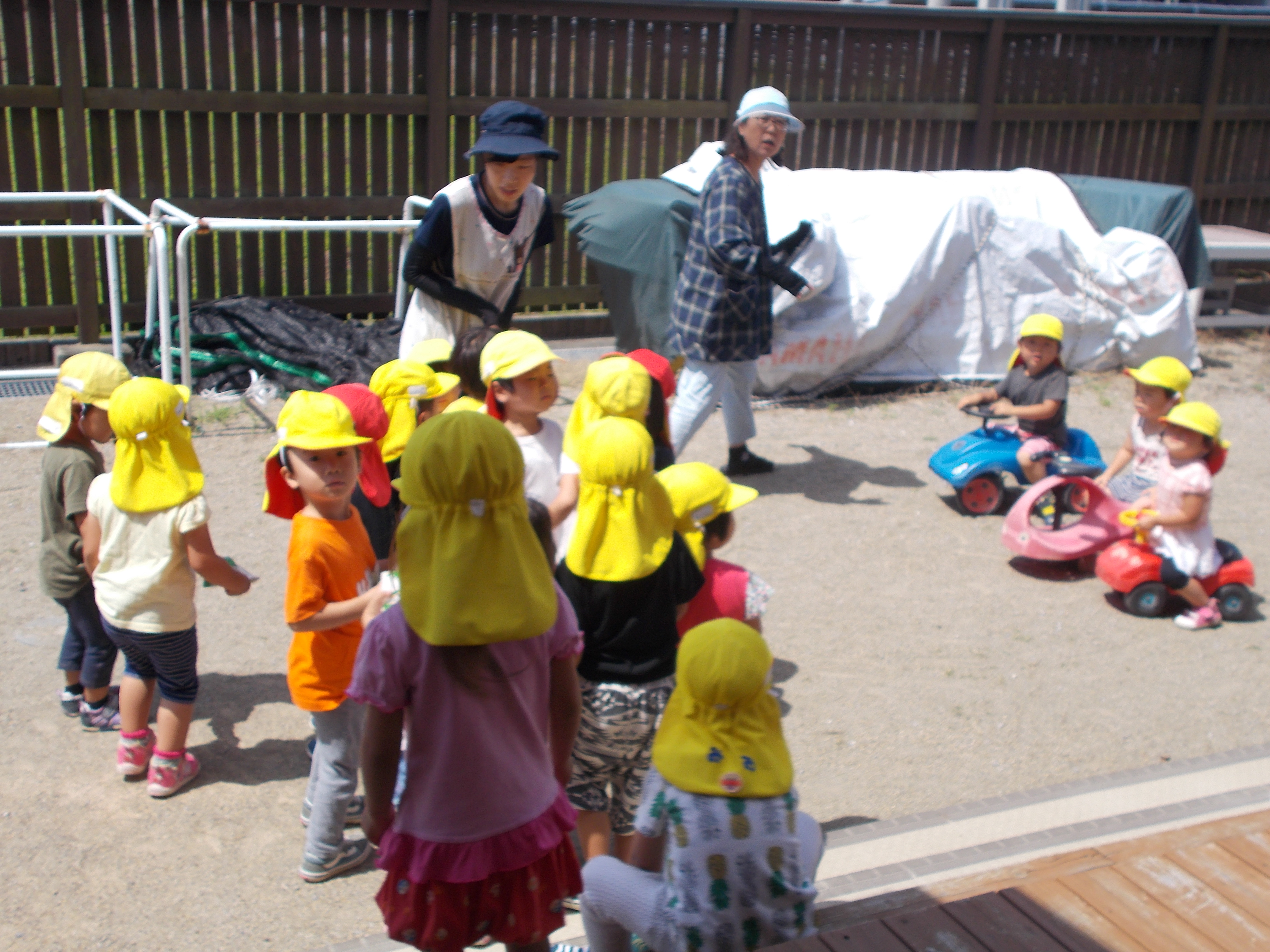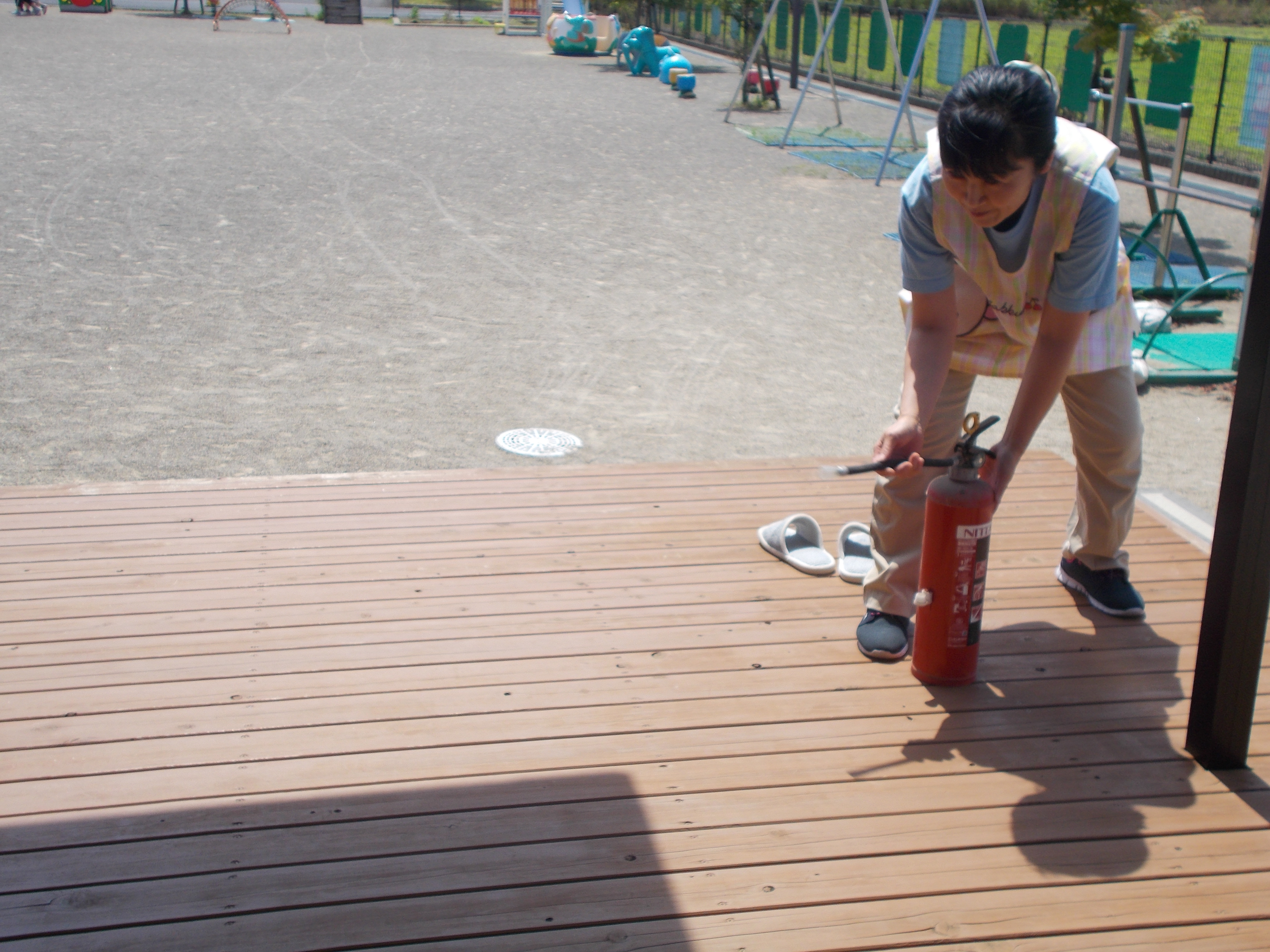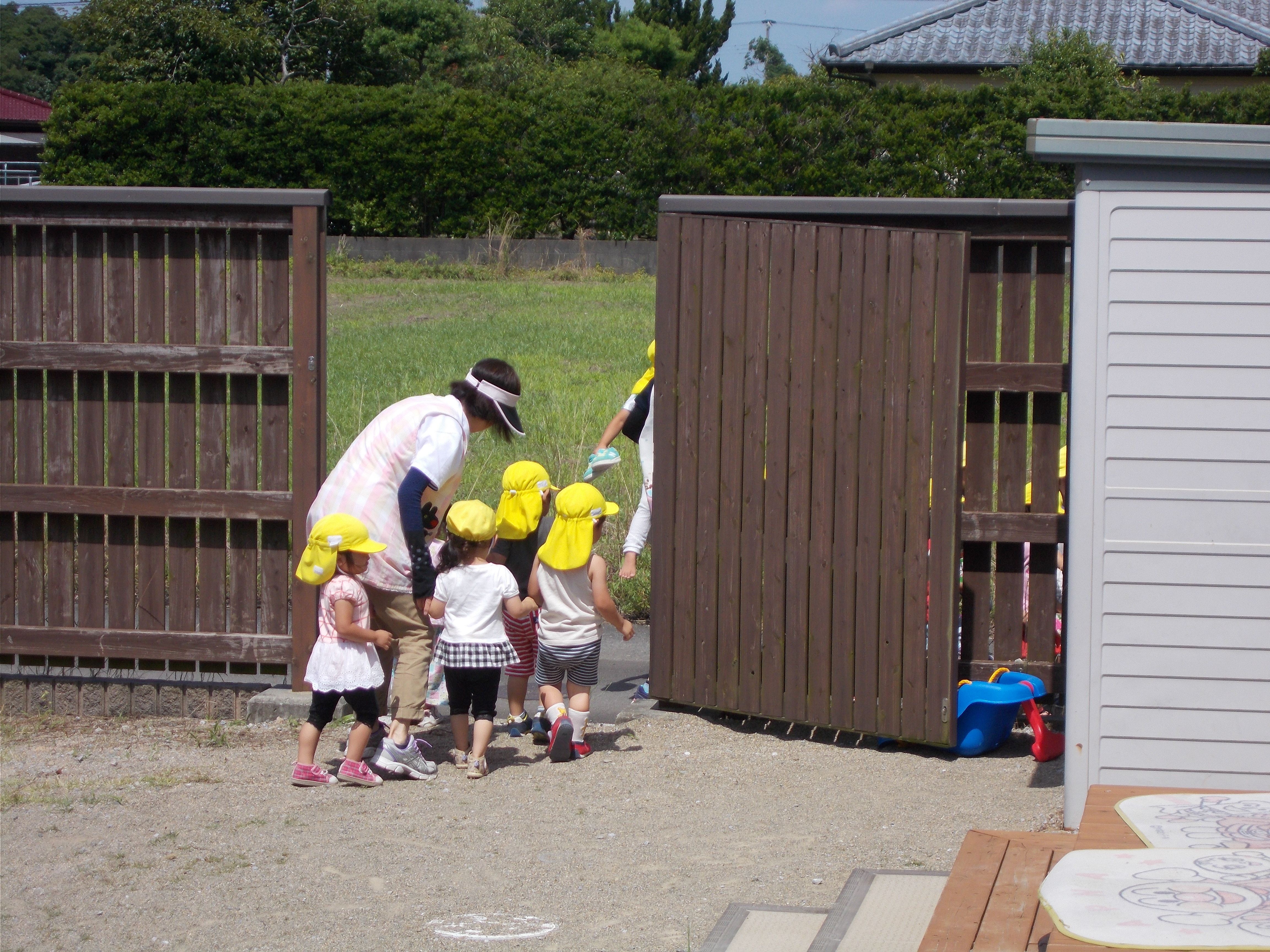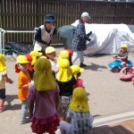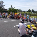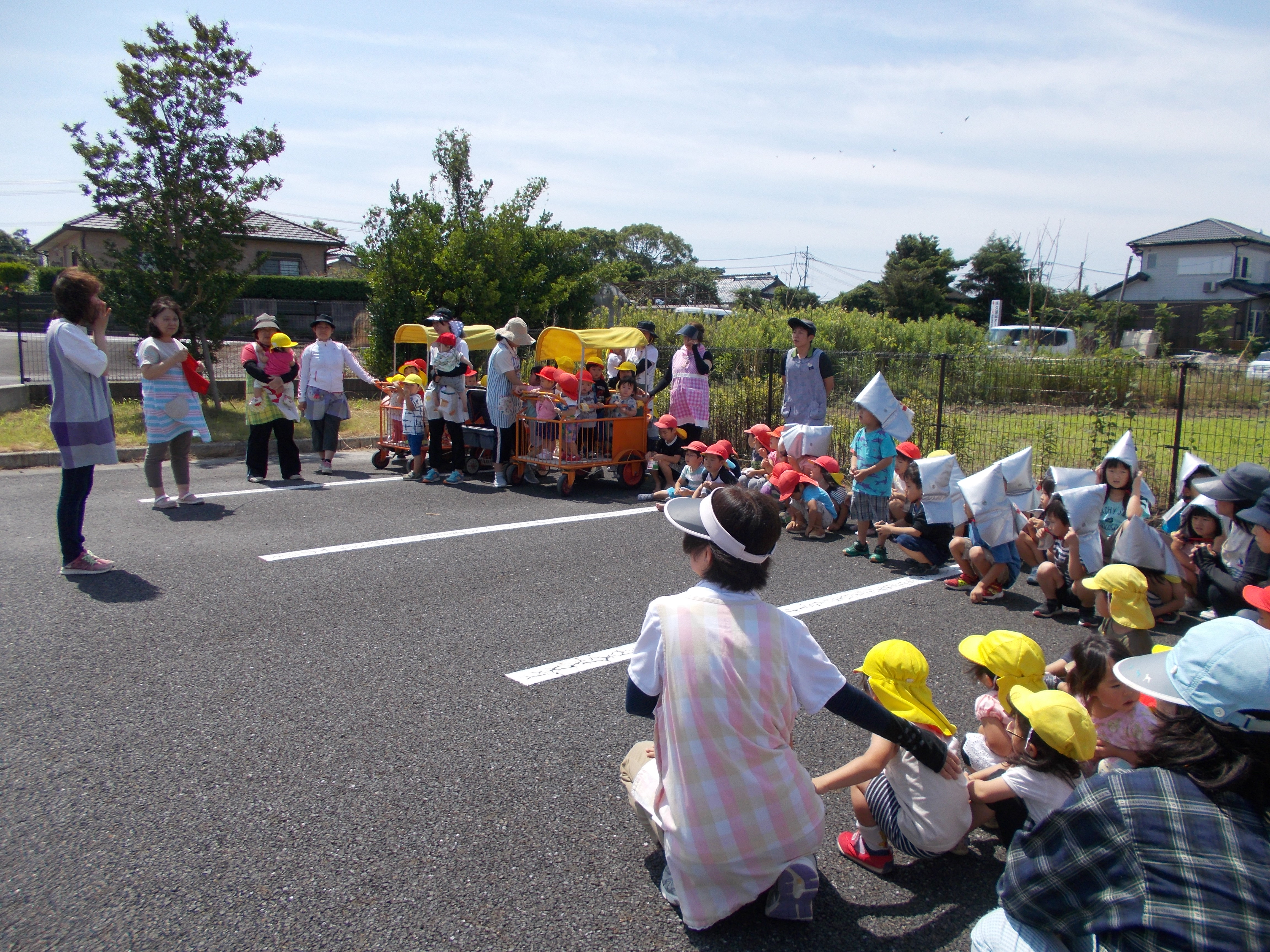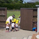6月の避難訓練 6月13日(木) 不審者侵入と火災の訓練を行いました。 不審者が園舎東門からの侵入してきました。途中、タバコの火で火事になり、消火をした後、各クラス担任の判断で避難することになりました。 西門から避難するクラスや不審者の動きをみながら、東門から避難するクラスとそれぞれスムーズに避難することができました。 日頃の訓練で子どもたちも無言で落ち着いて避難することができました。