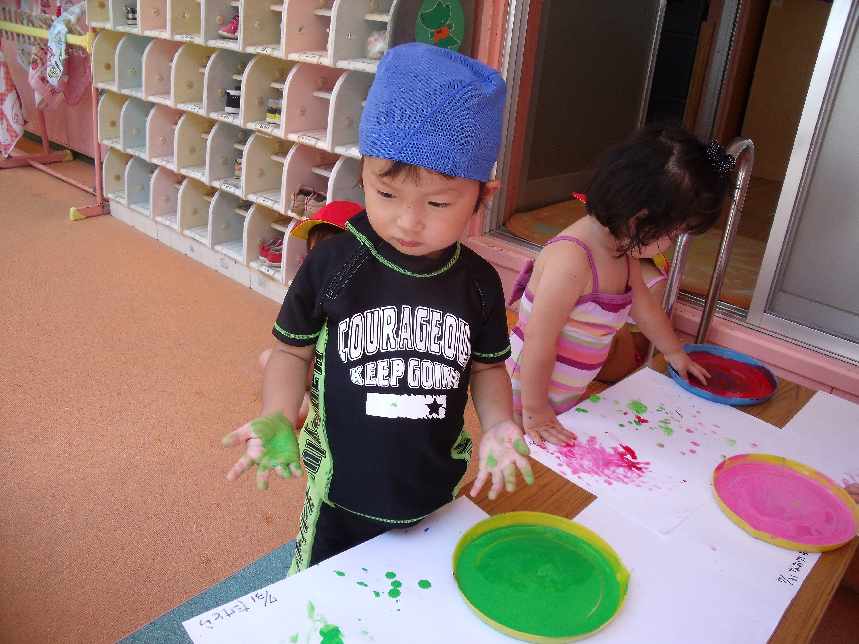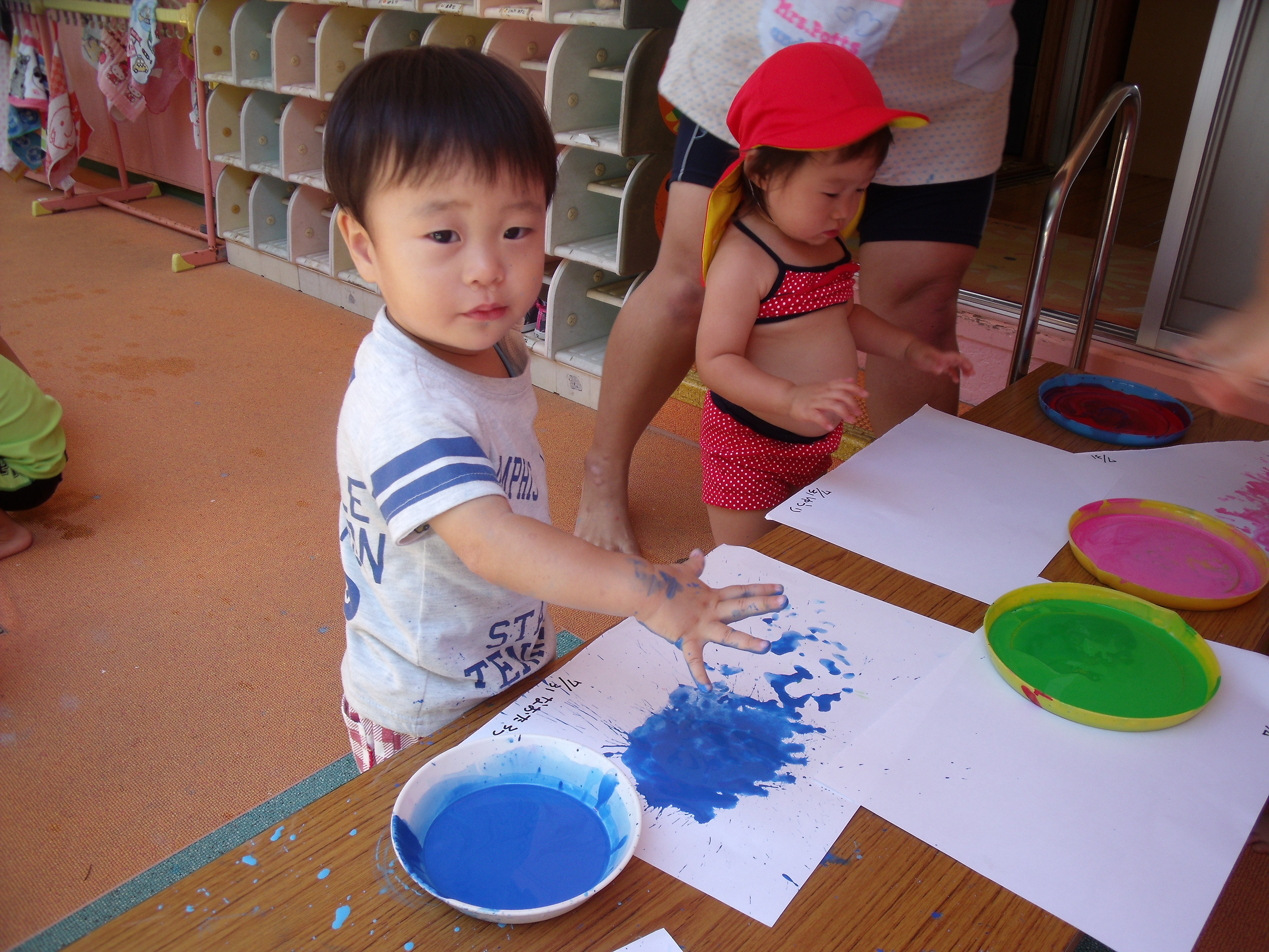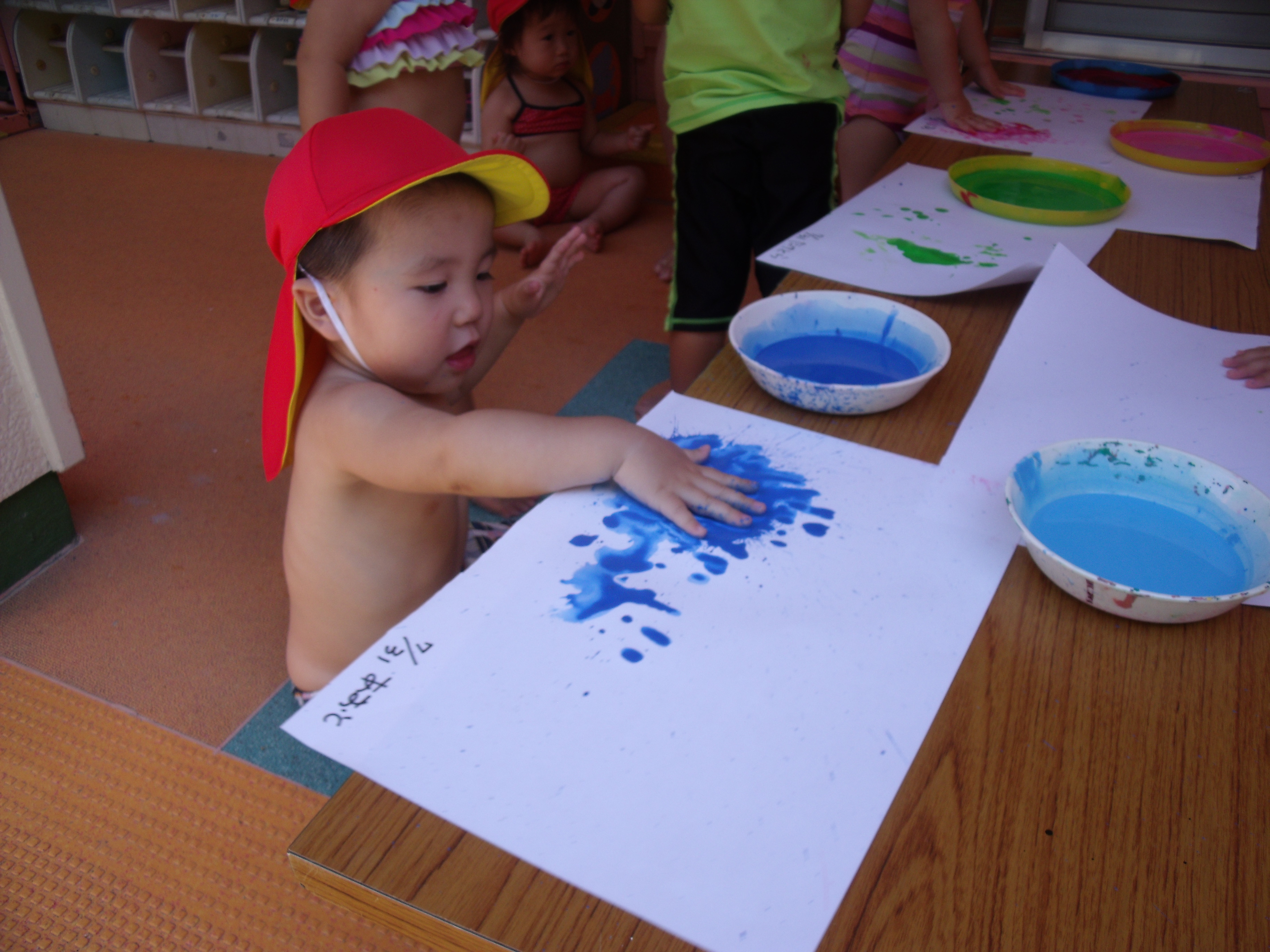 フィンガーペインティング 7月31日(水) りす組さんが、『フィンガーペインティング』を行いました。 手のひらに絵の具がつくと、不思議そうに眺めたり嫌がったりと様々な反応が・・・。 画用紙いっぱいにペタペタと、可愛い手形を沢山付けてくれました。