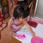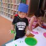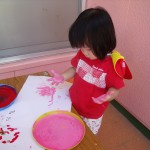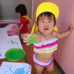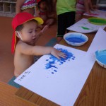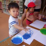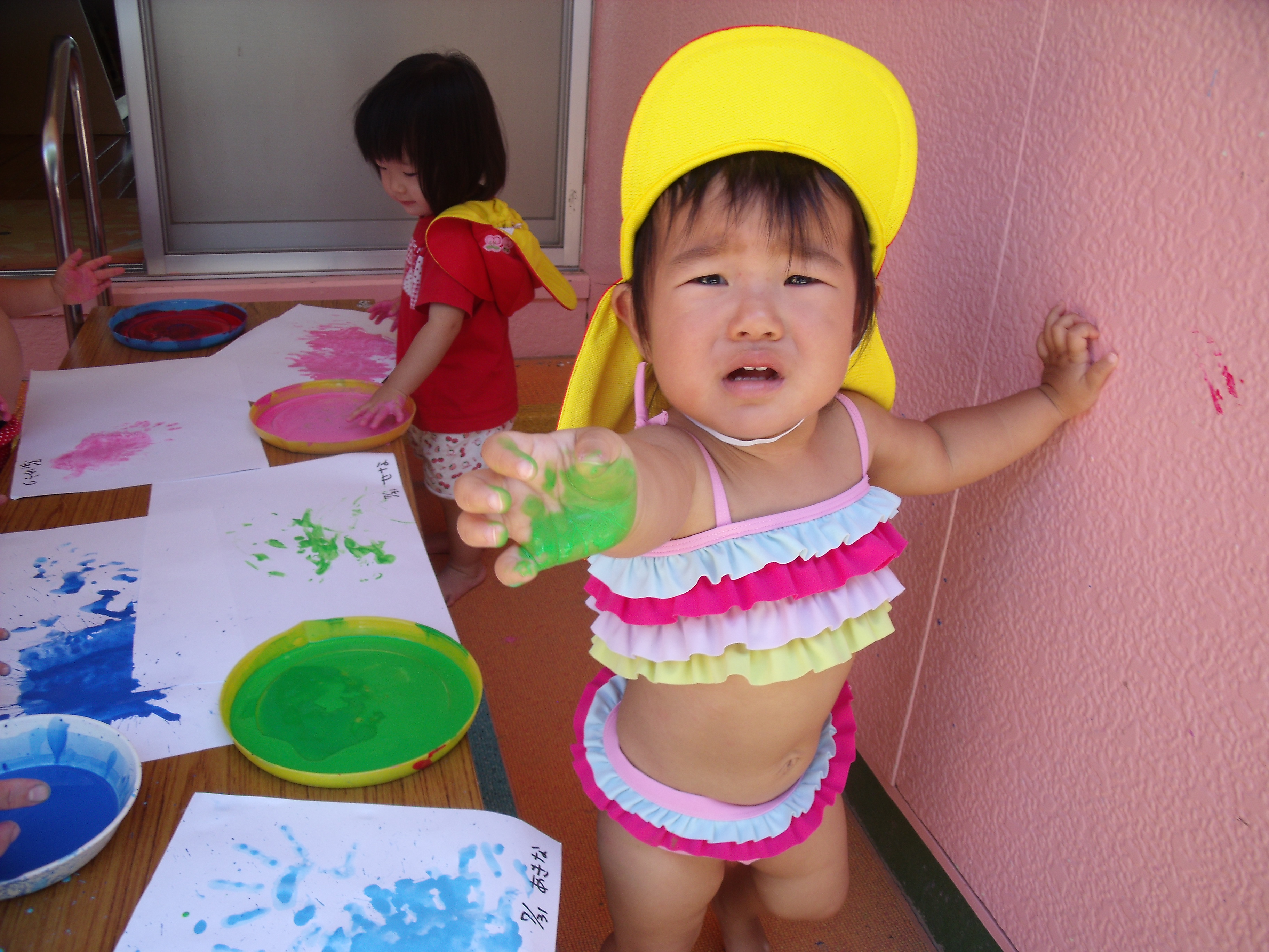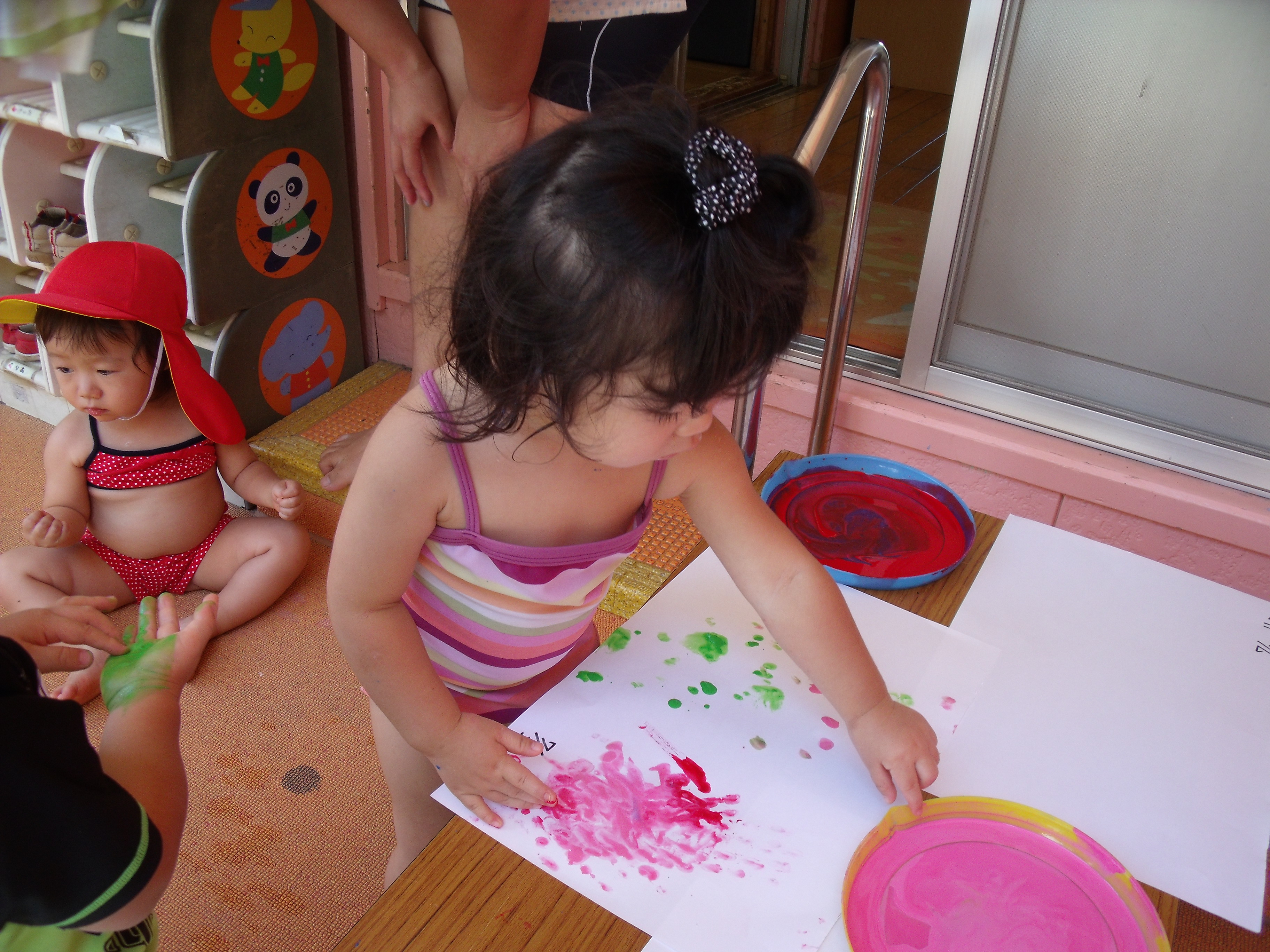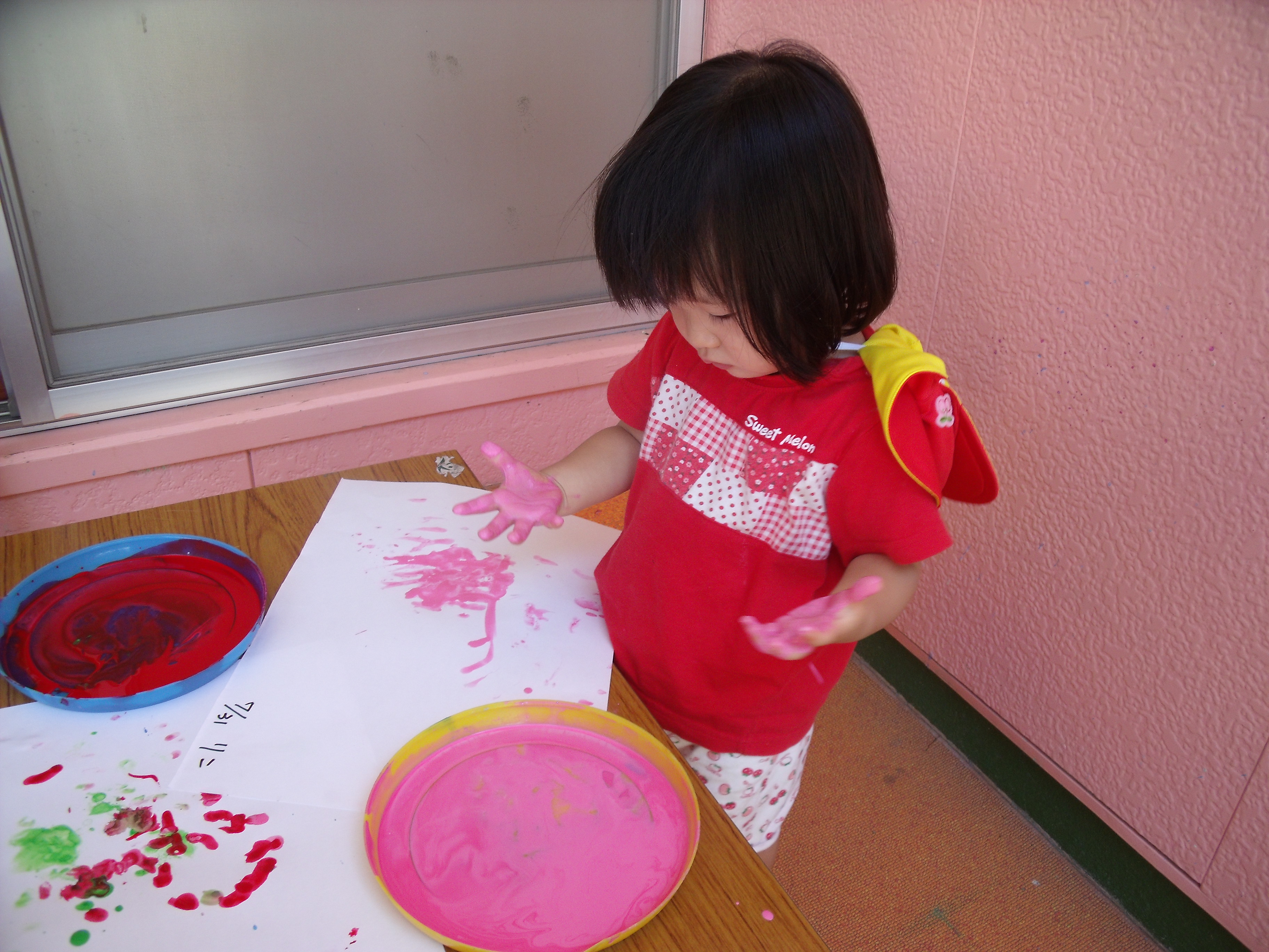 フィンガーペインティング 7月31日(水) りす組さんが、『フィンガーペインティング』を行いました。 手のひらに絵の具がつくと、不思議そうに眺めたり嫌がったりと様々な反応が・・・。 画用紙いっぱいにペタペタと、可愛い手形を沢山付けてくれました。