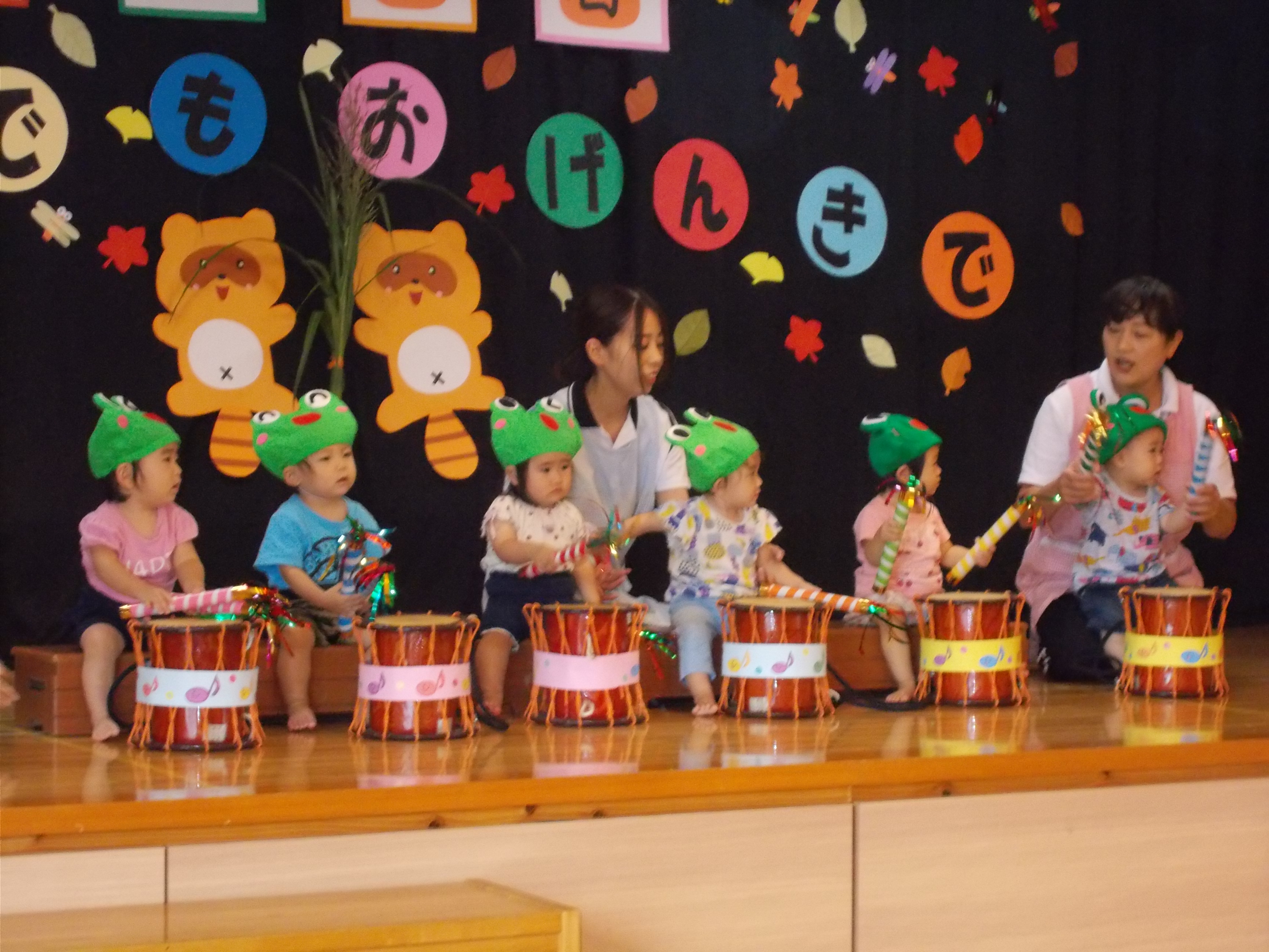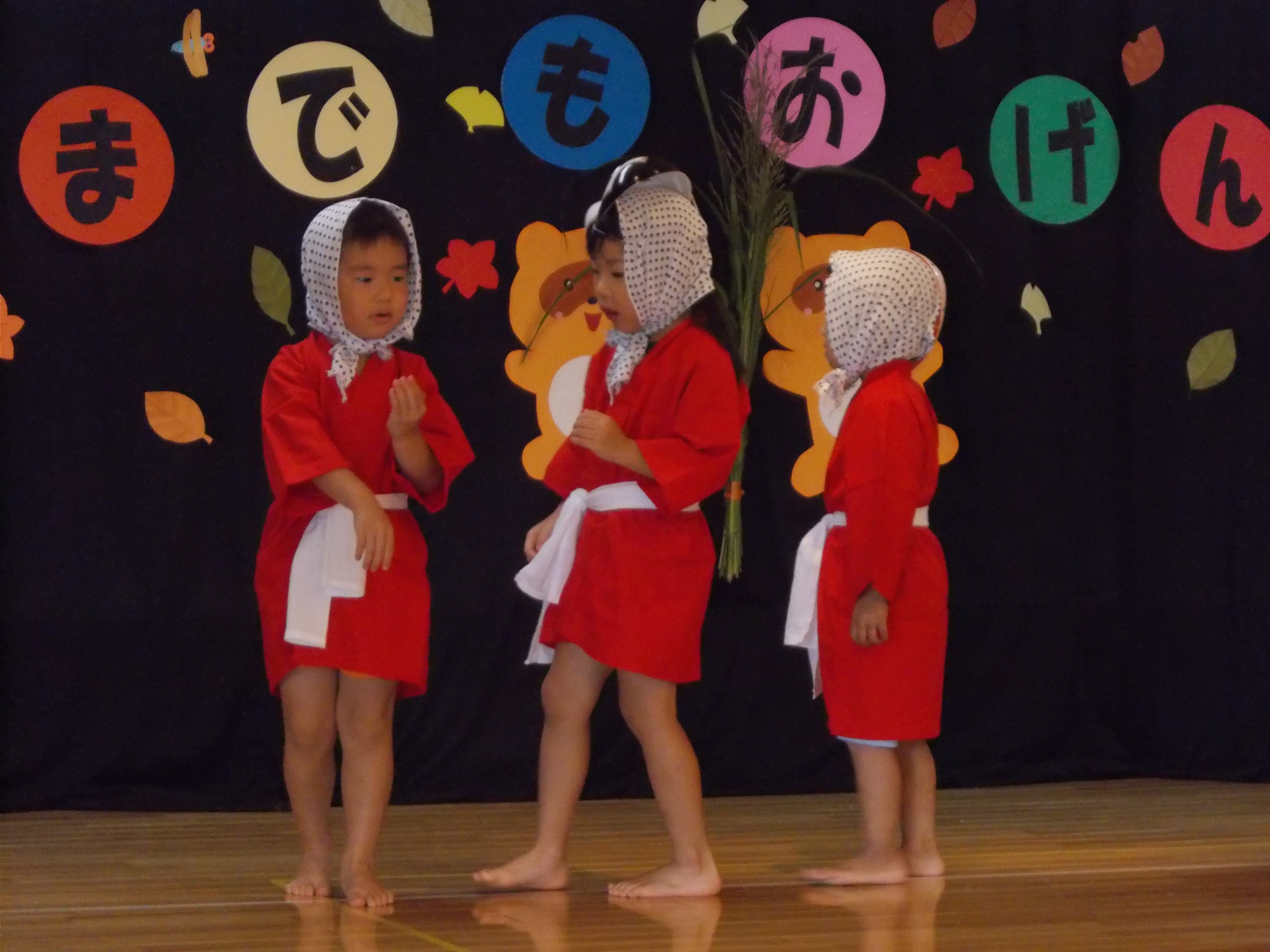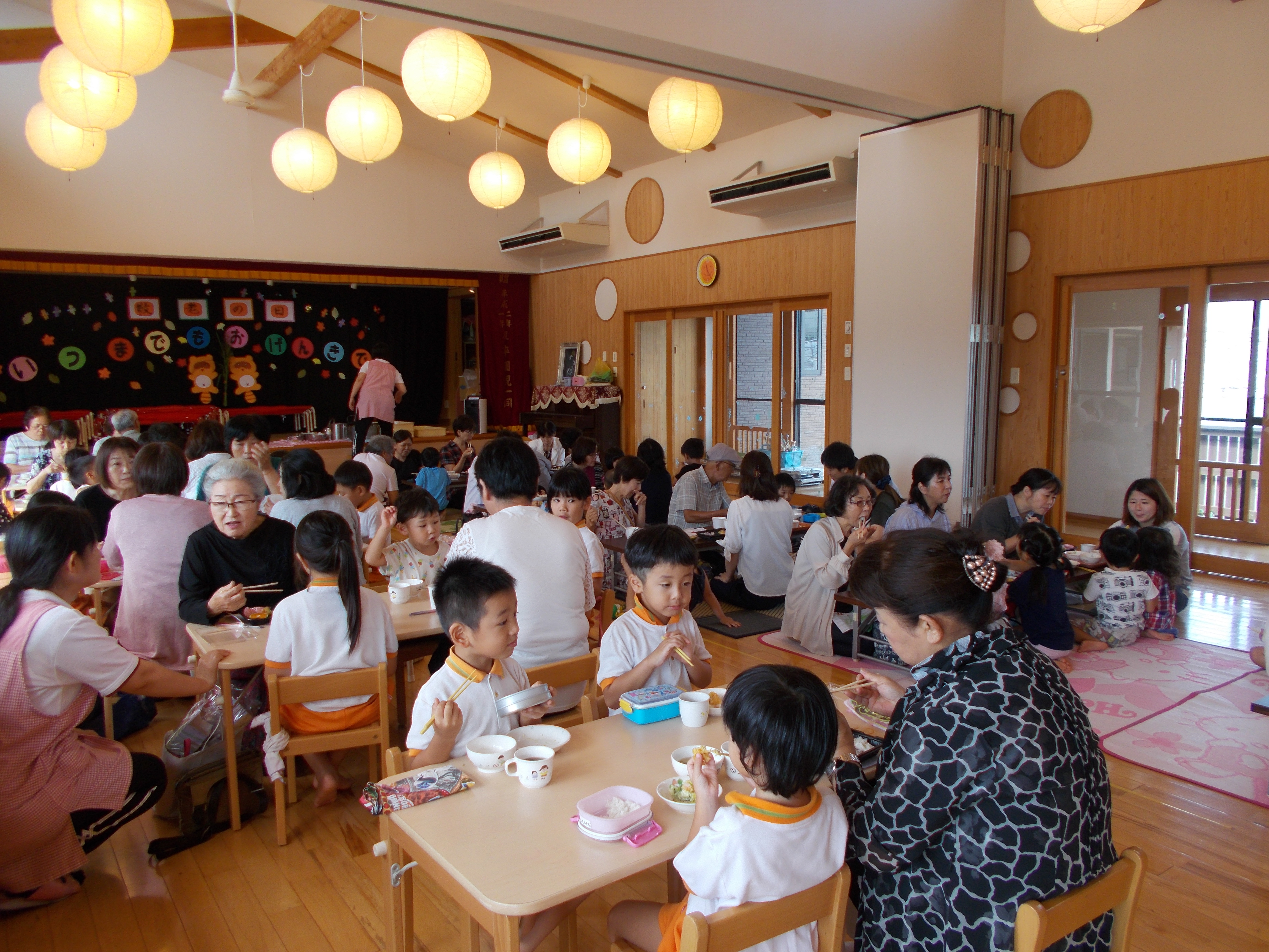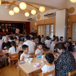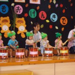 敬老祝い 9月13日(金) 敬老会が行われました。 各クラスからの出し物(和太鼓演奏、ダンス、ひょっとこ踊り等)を披露し、手作りのプレゼント贈呈、昼食会を行いました。 大好きなおじいちゃんおばあちゃんと会話を楽しみながらゆったりとした時間を過ごせ、子どもたちはとても嬉しそうでした。