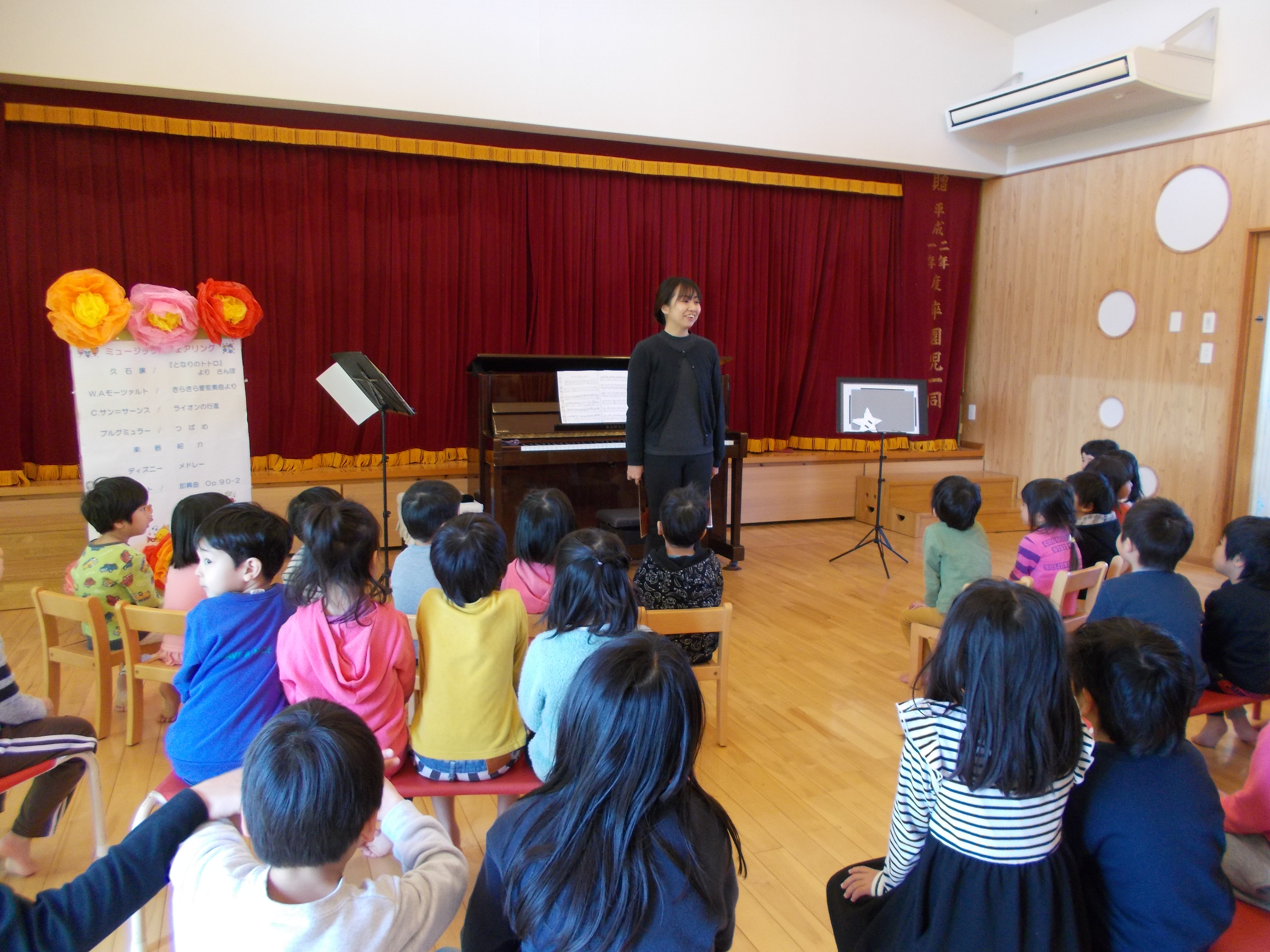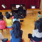 演奏家によるモーツアルトやシューベルトのピアノ演奏や、動物の絵を見ながら鳴き声や勇ましさを音で表現すると子どもたちはその音を興味津々で聴き入っていました。