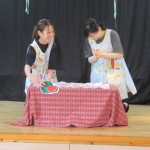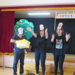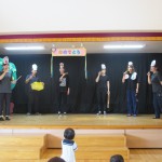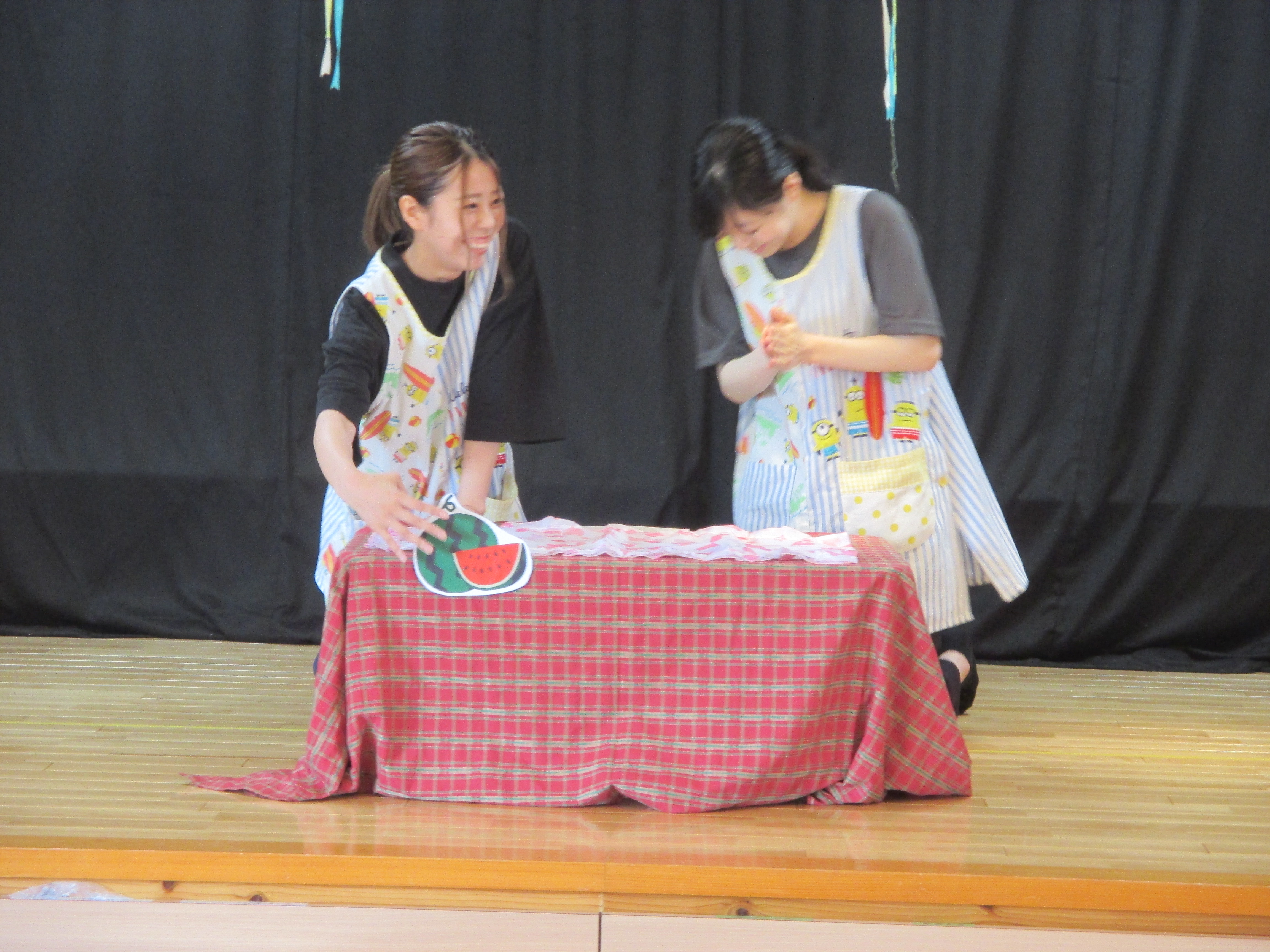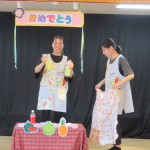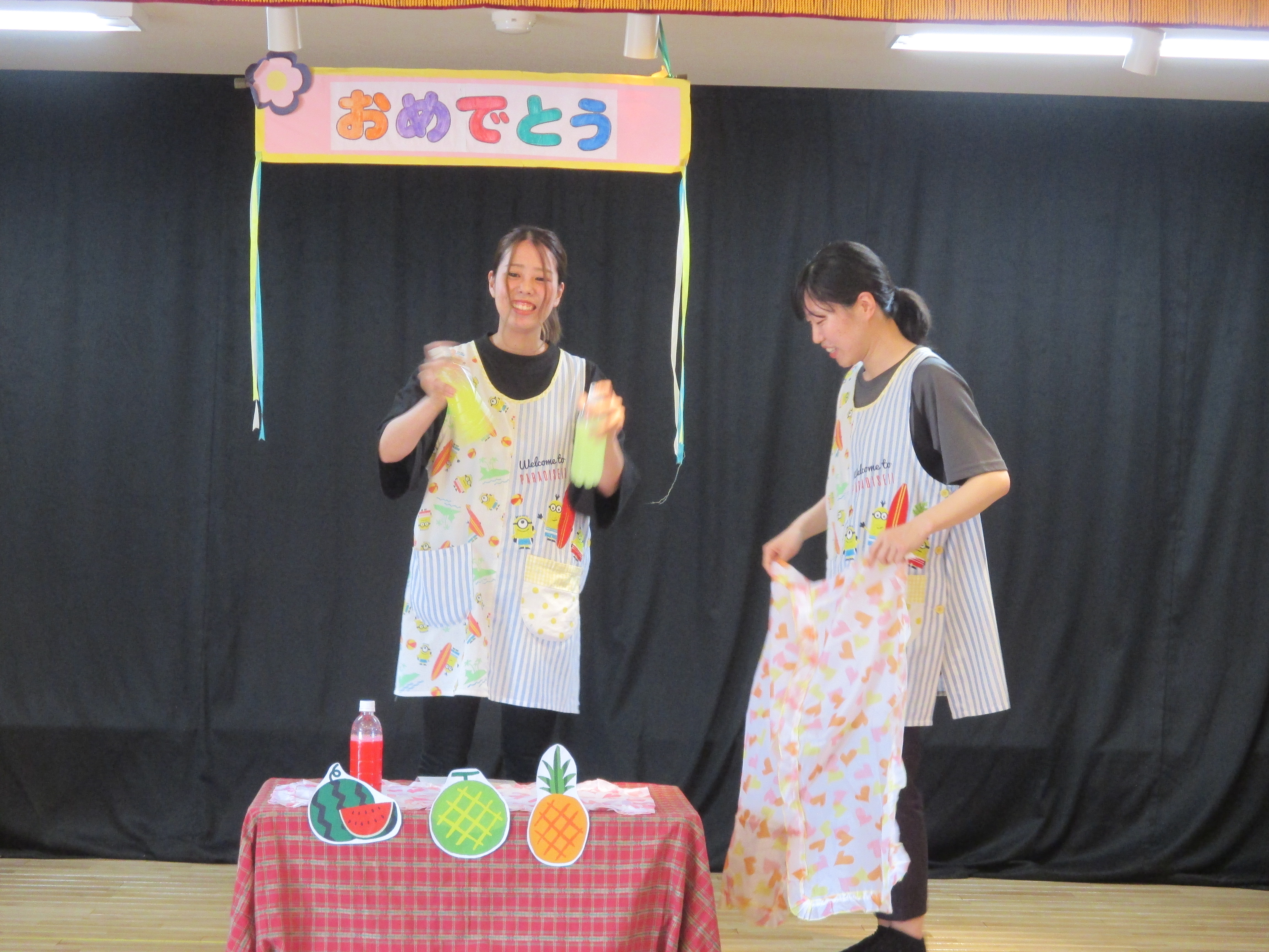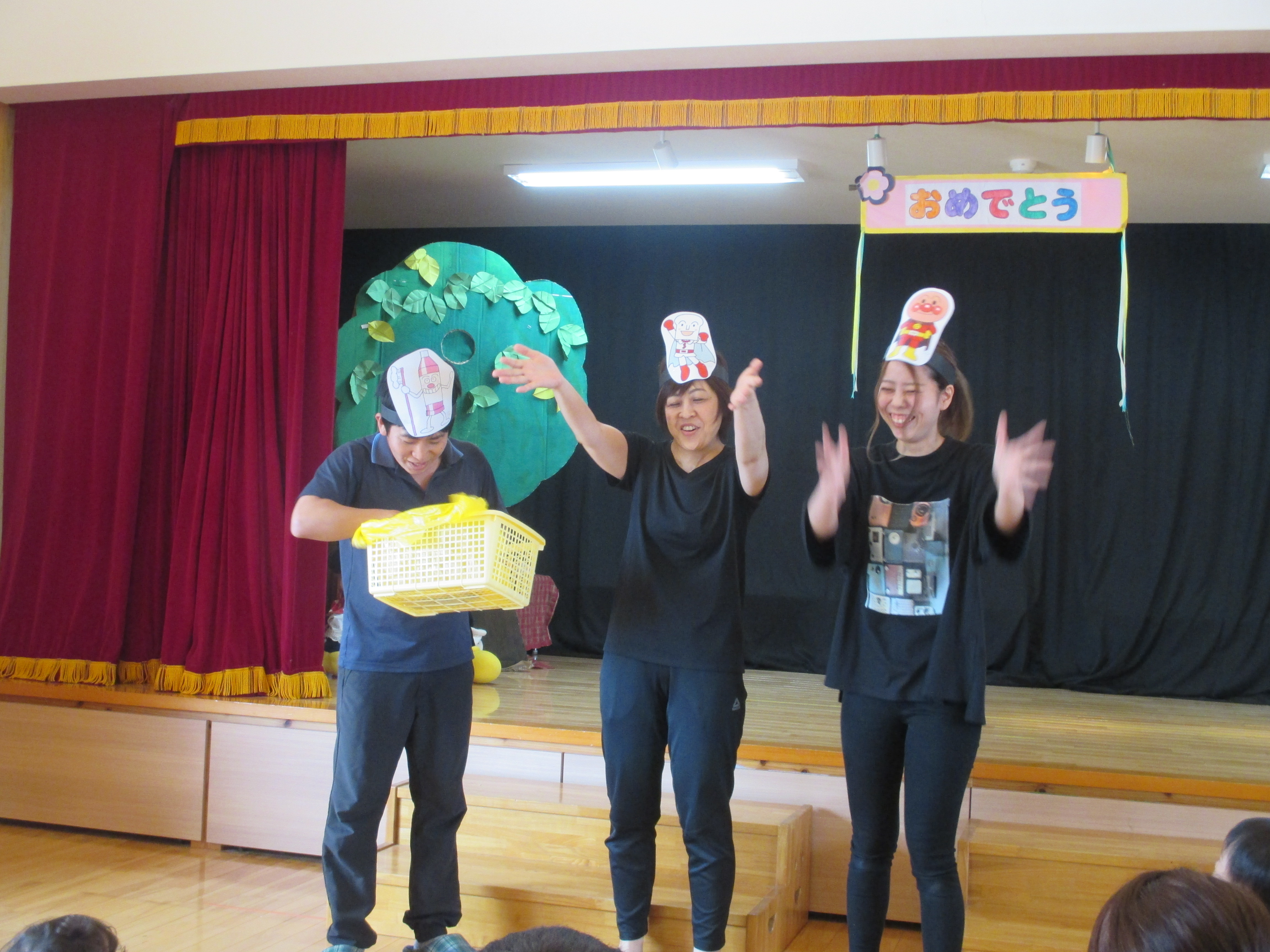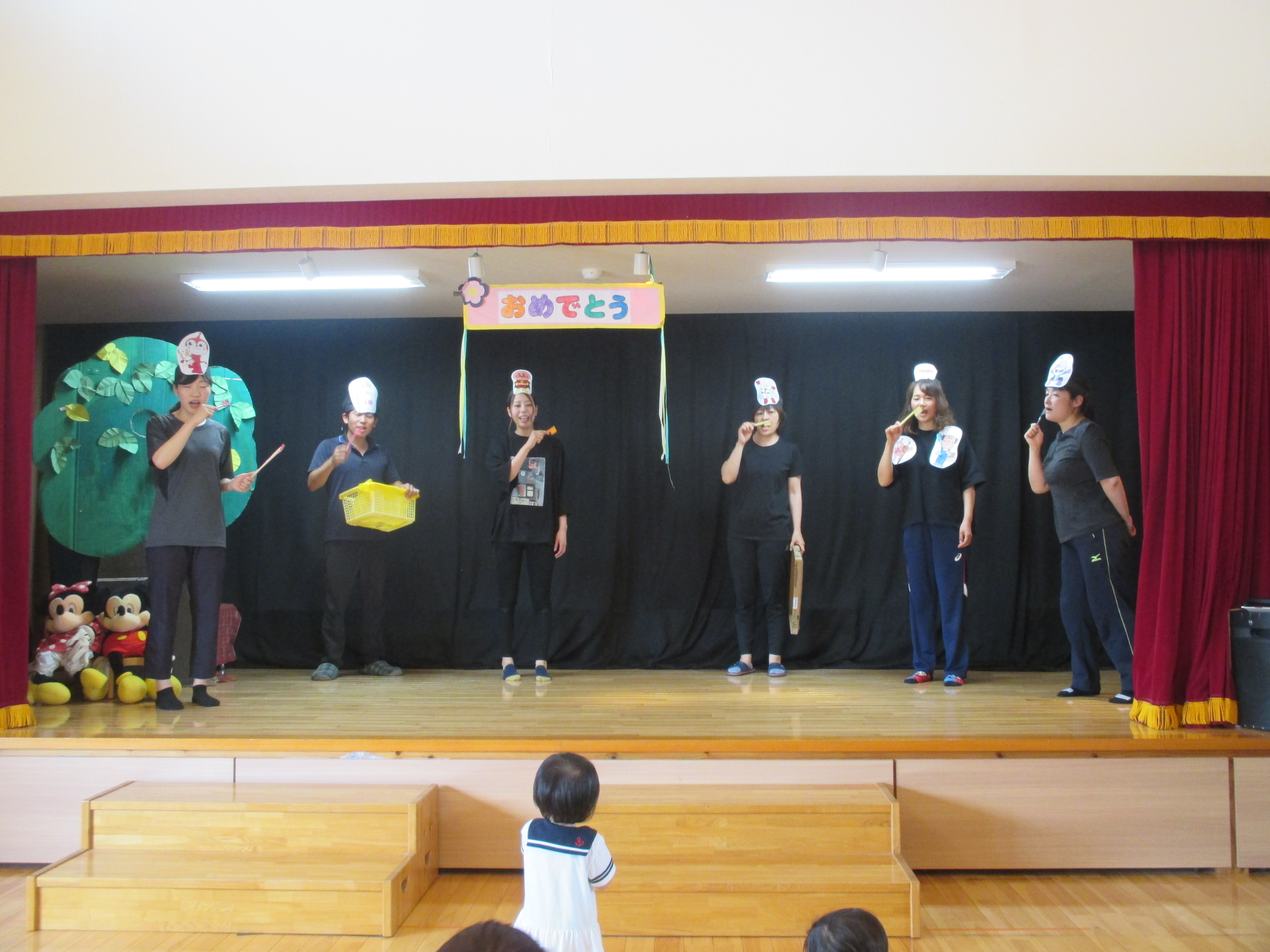 職員による出し物もみんな大喜び♪ ペットボトルの色が果物の色に変わるマジックを見たり「アンパンマンとハブラシマン」の劇を見て楽しく過ごしました。