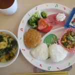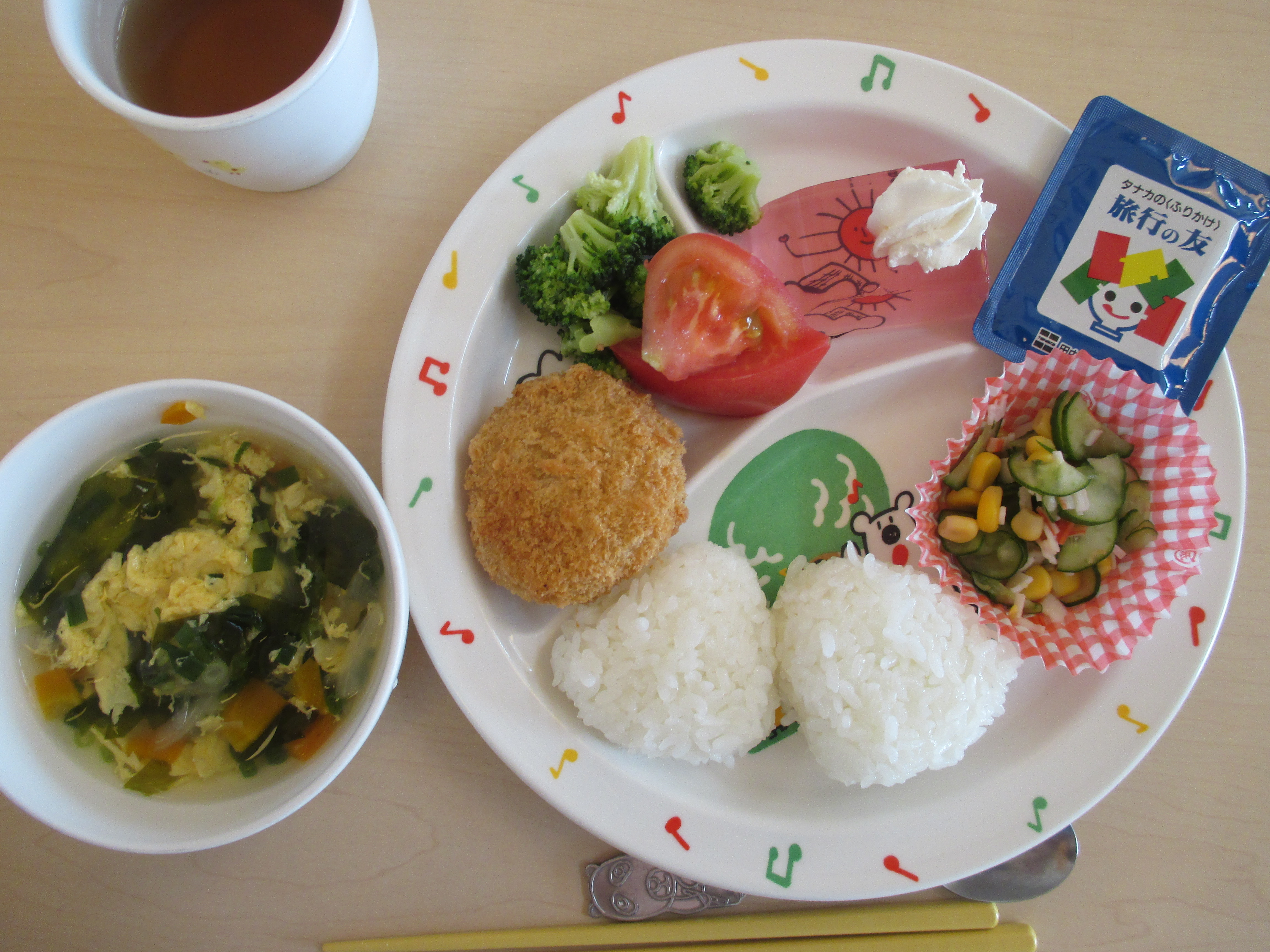 誕生会メニューはおにぎり、キャベツ入りメンチカツ、コーンの和え物、かきたま汁、ストロベリーゼリーと盛りだくさん!! モリモリ食べていましたよ~。