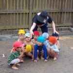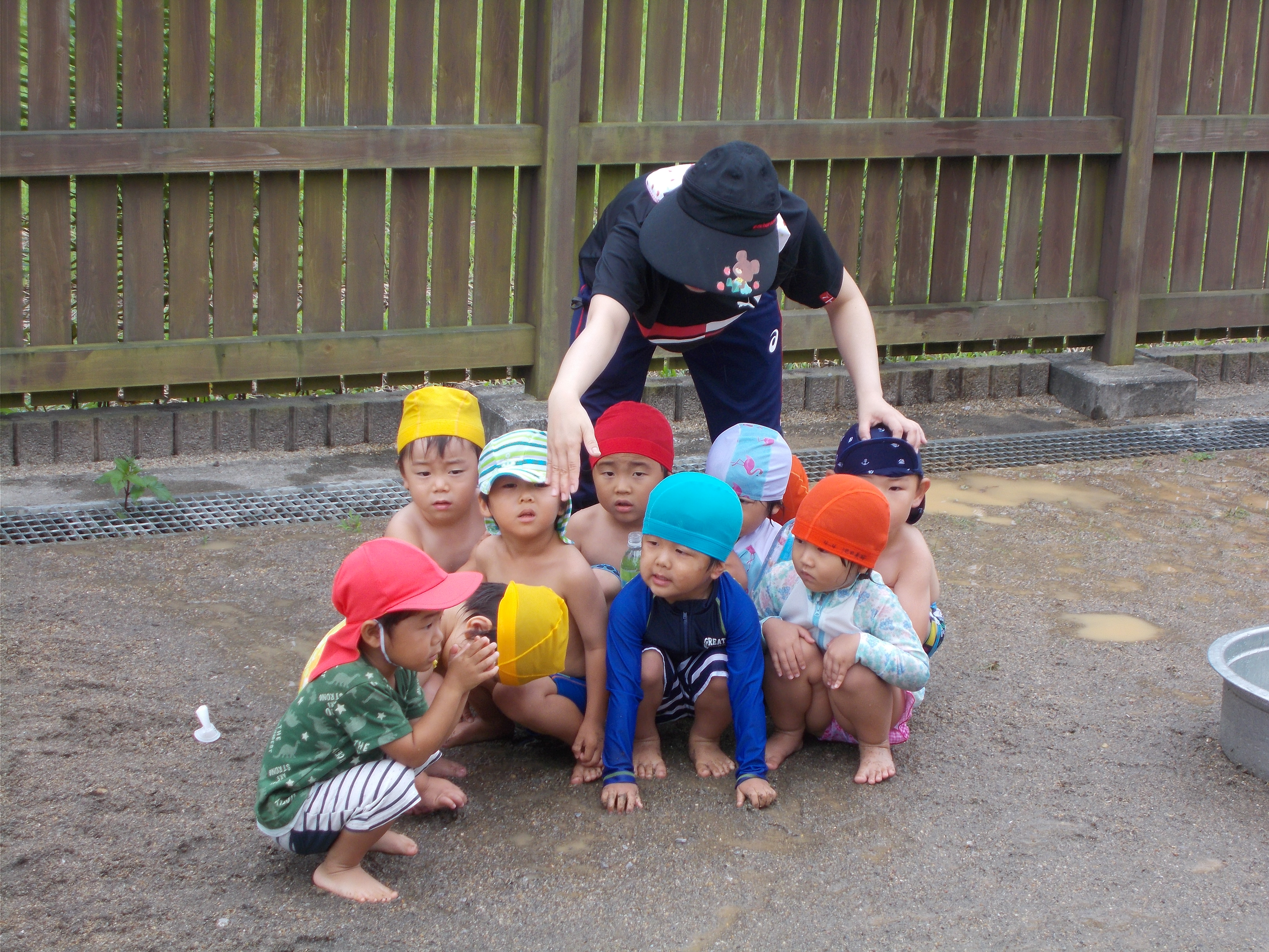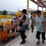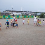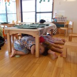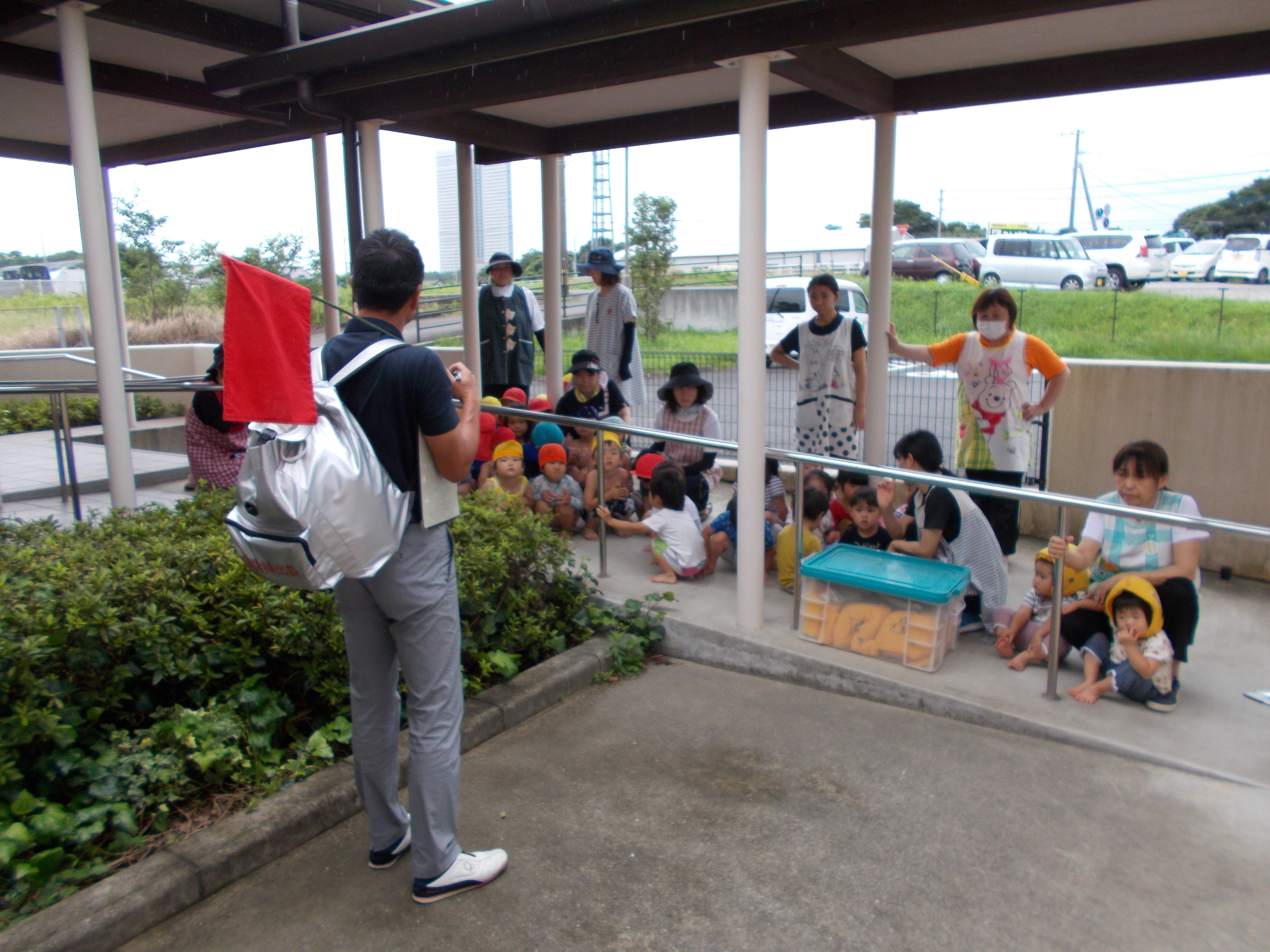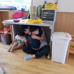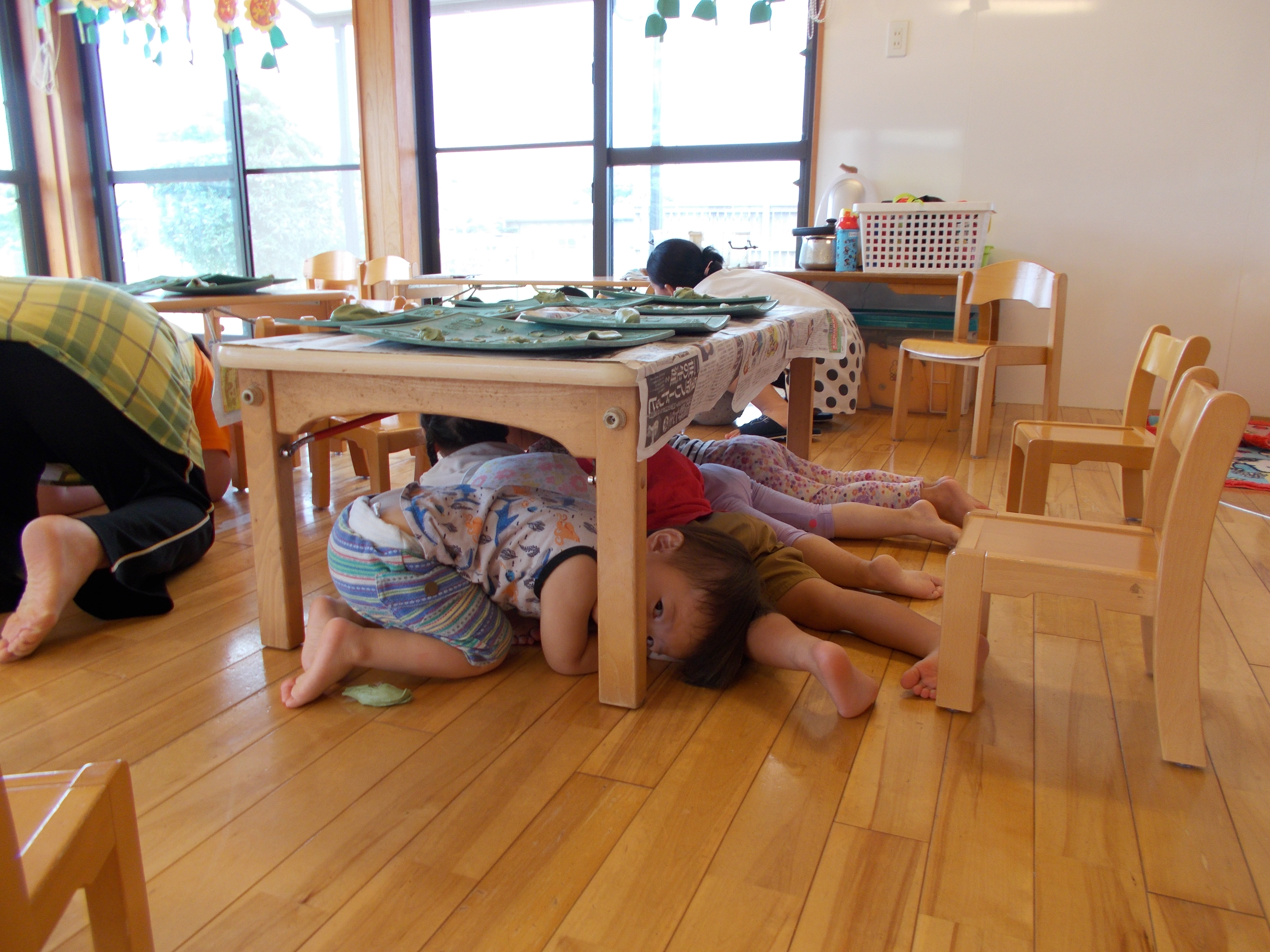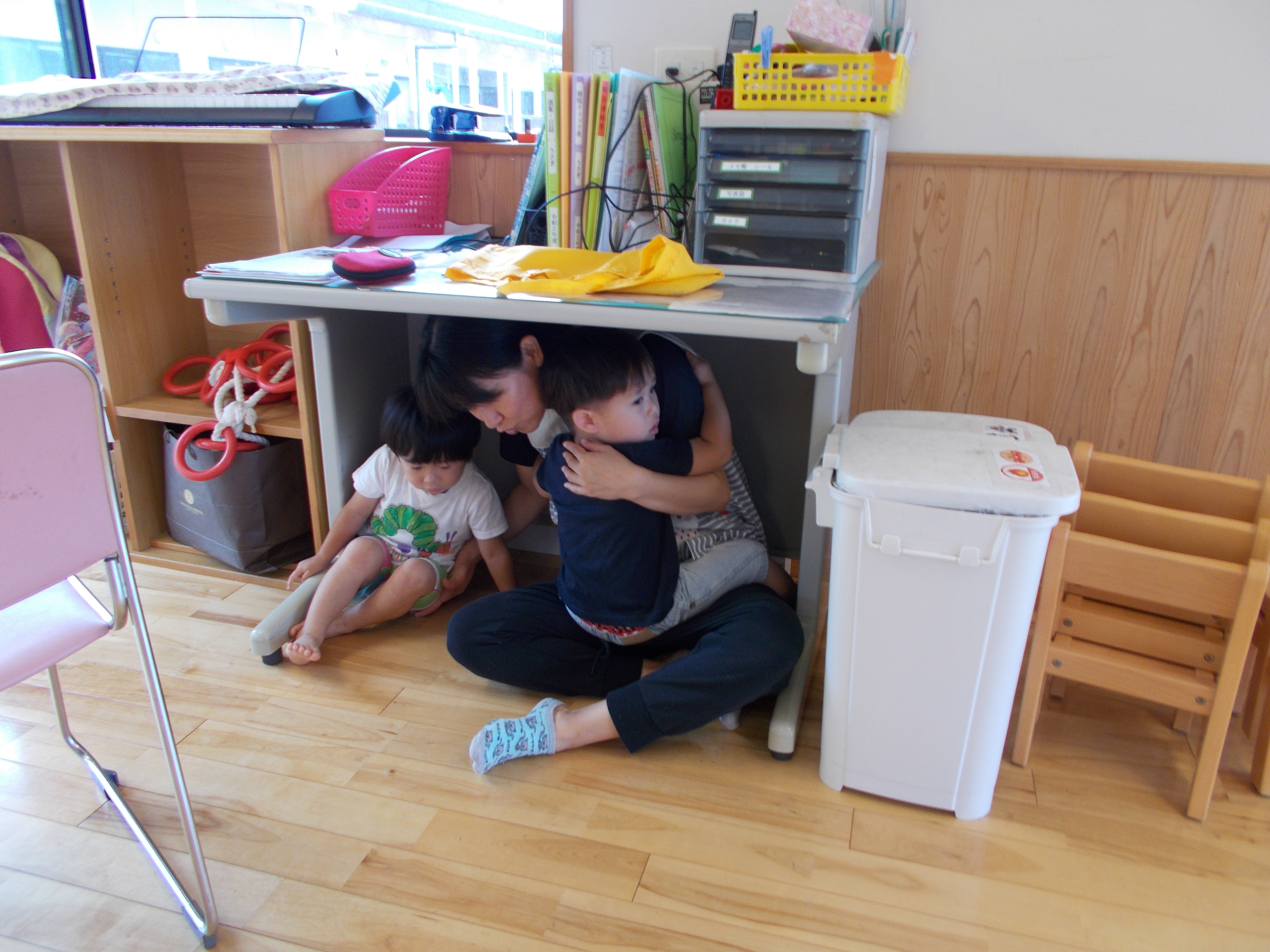 地震を知らせるベルが鳴ると室内で過ごしていた園児は机下にもぐったり、園庭では座って揺れが収まるのを待ちました。