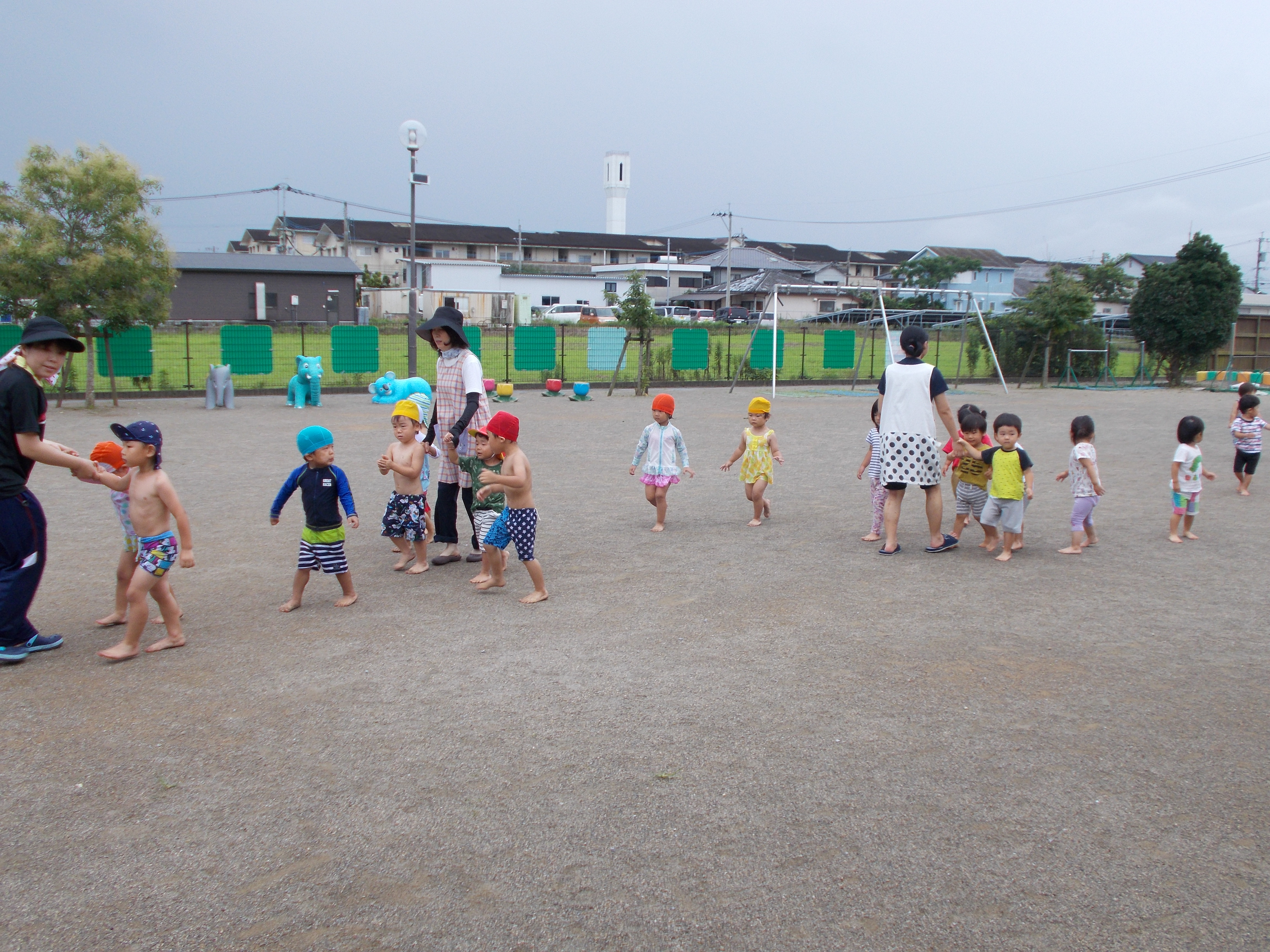 厨房からの出火を想定した訓練での避難の際は、年長クラスの子どもたちは自ら手で口を覆い玄関先まで避難しました。