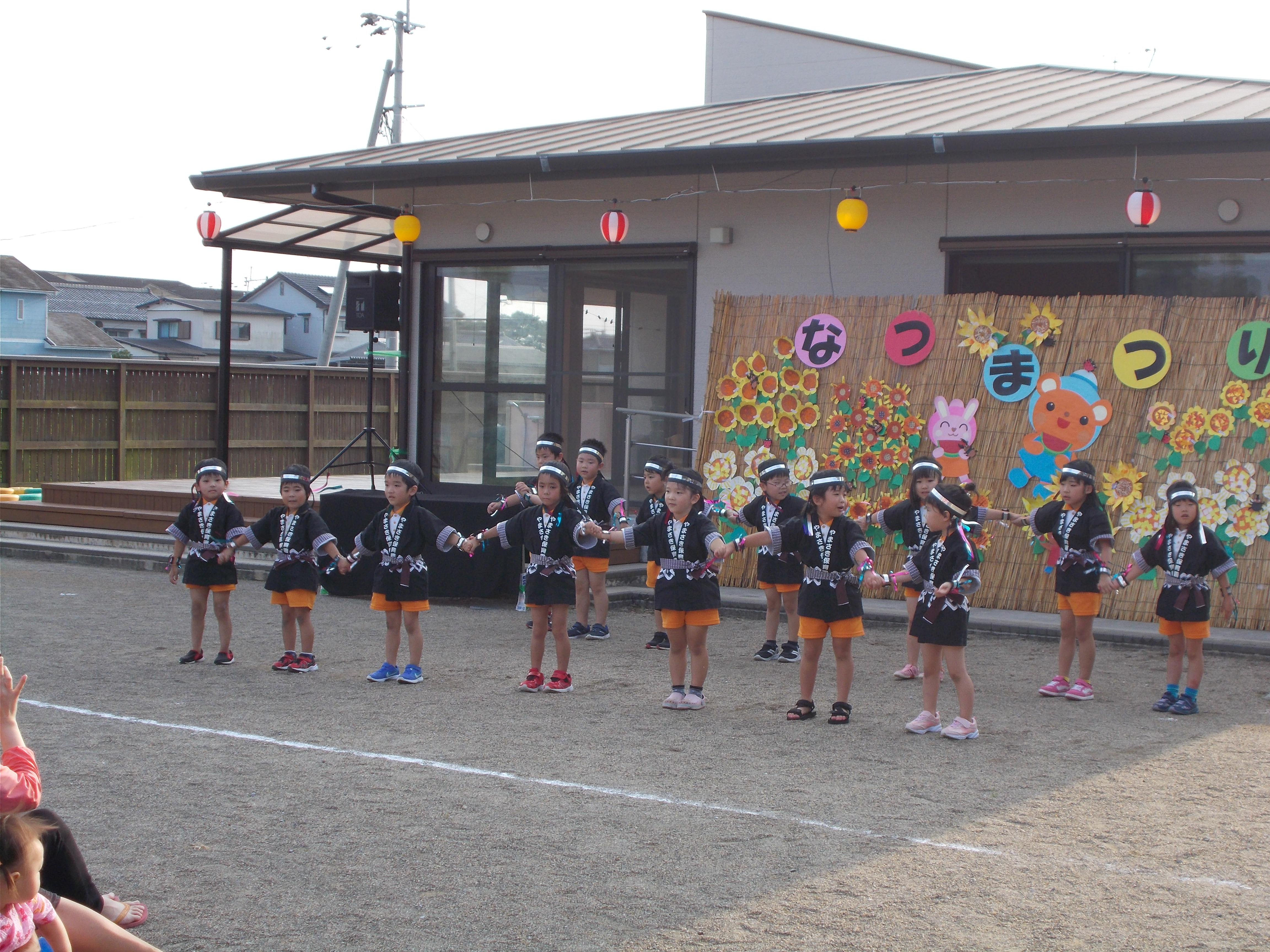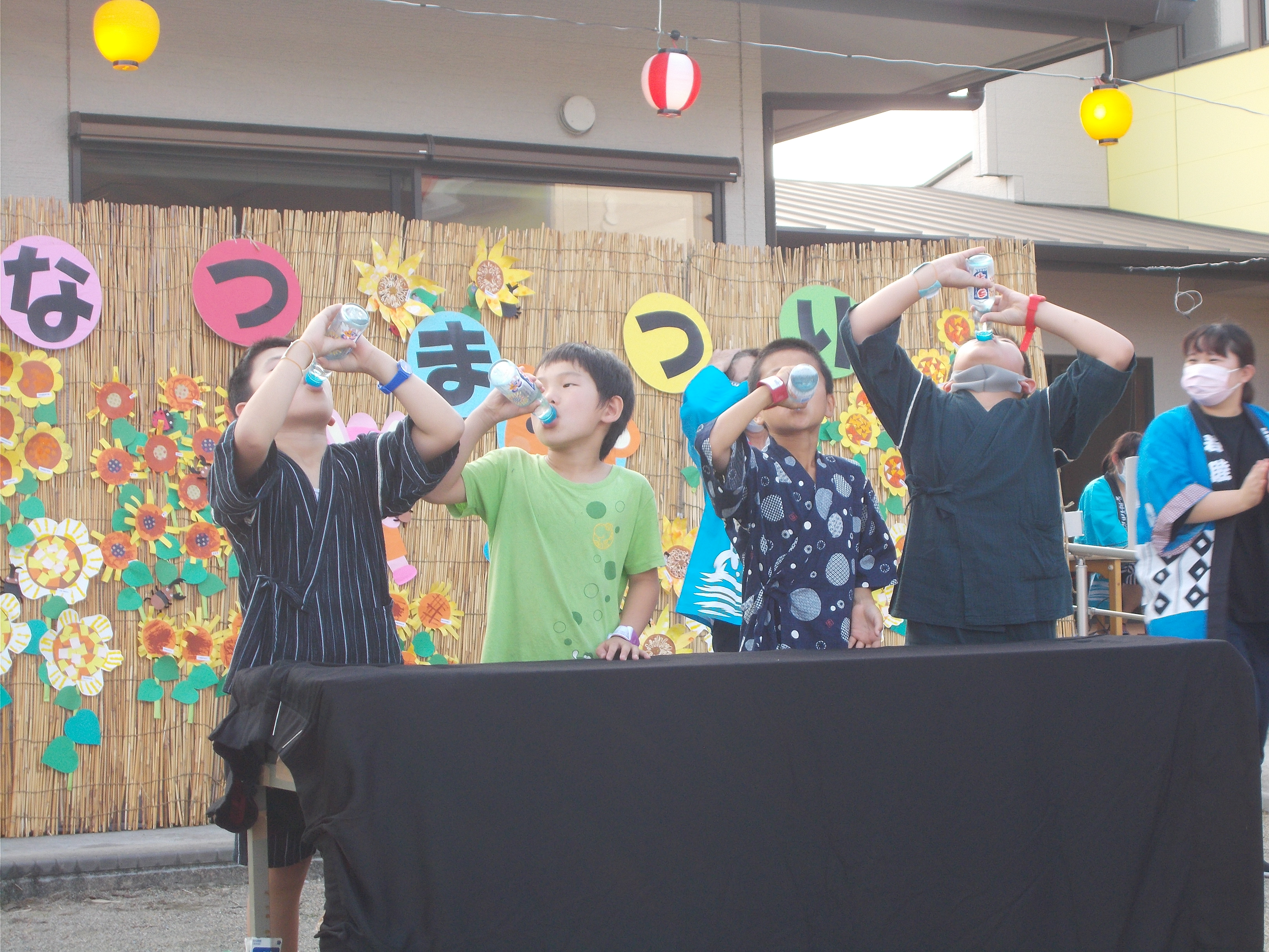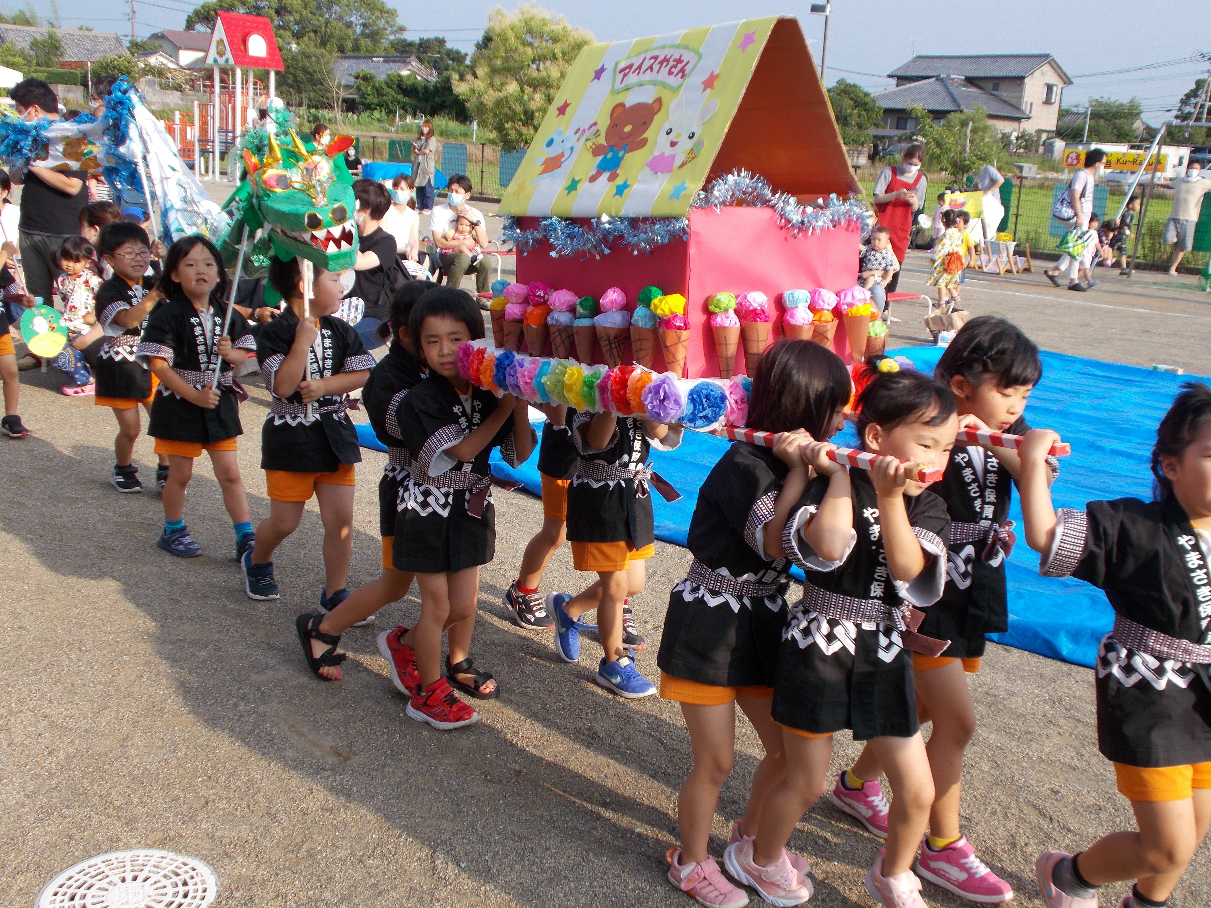オープニングは子ども達の”ワッショイ ワッショイ”とお神輿を担ぐ元気のよい声が園庭に響き渡りました。年長児の出し物、小学生によるラムネ早飲み競争、職員によるマジック&今流行りの「鬼滅の刃」のダンス♪等を見て楽しみました。