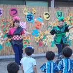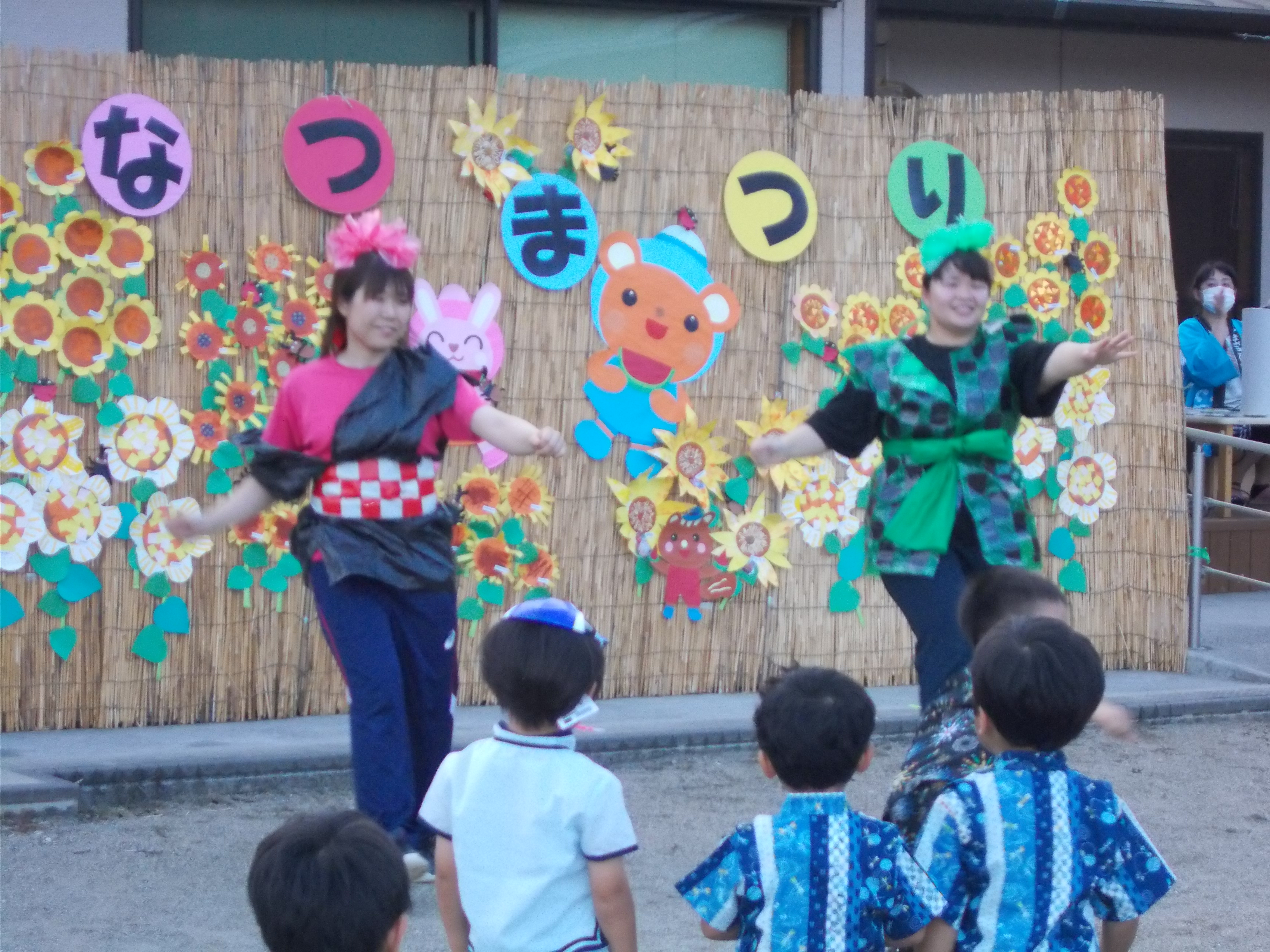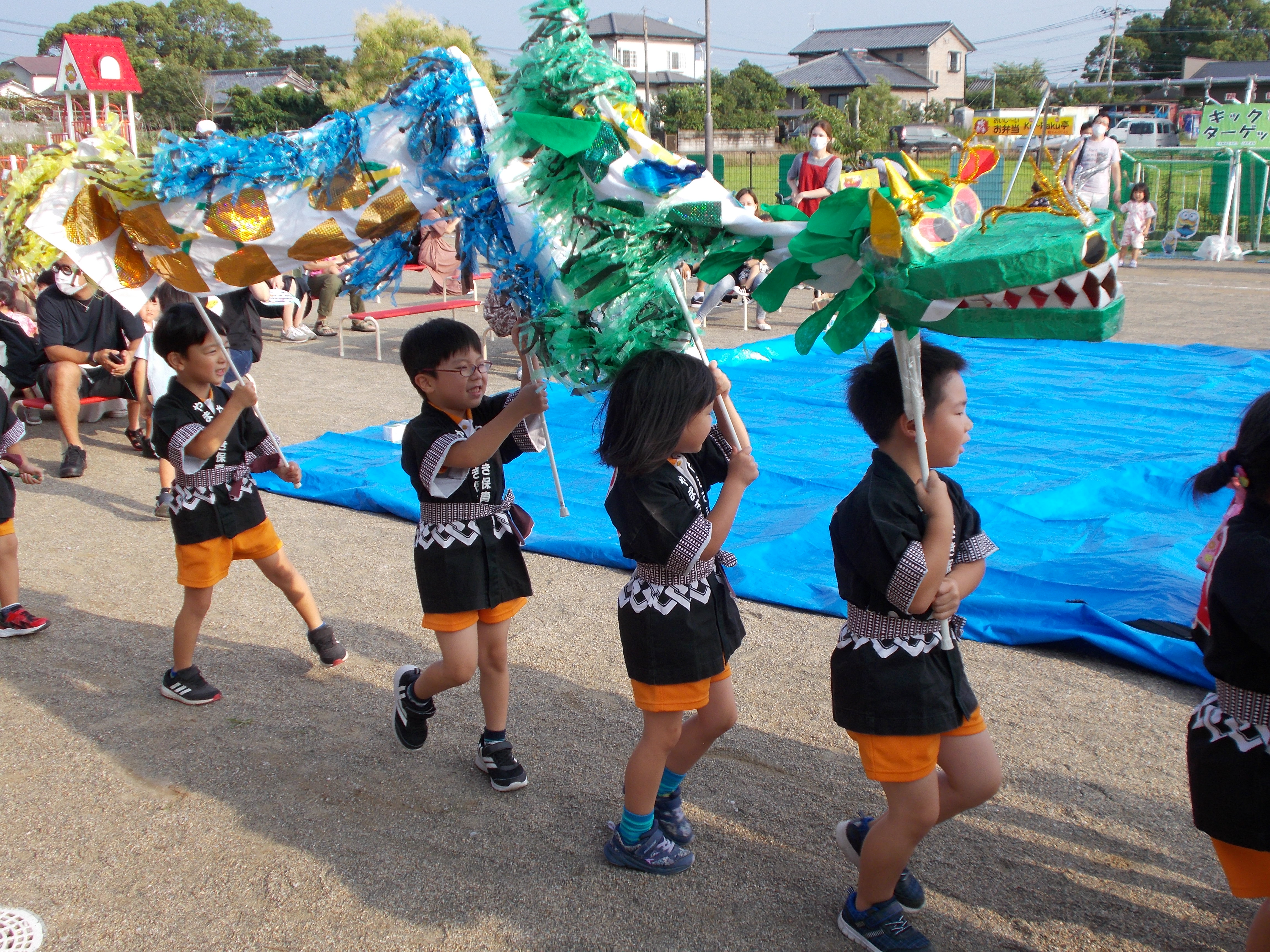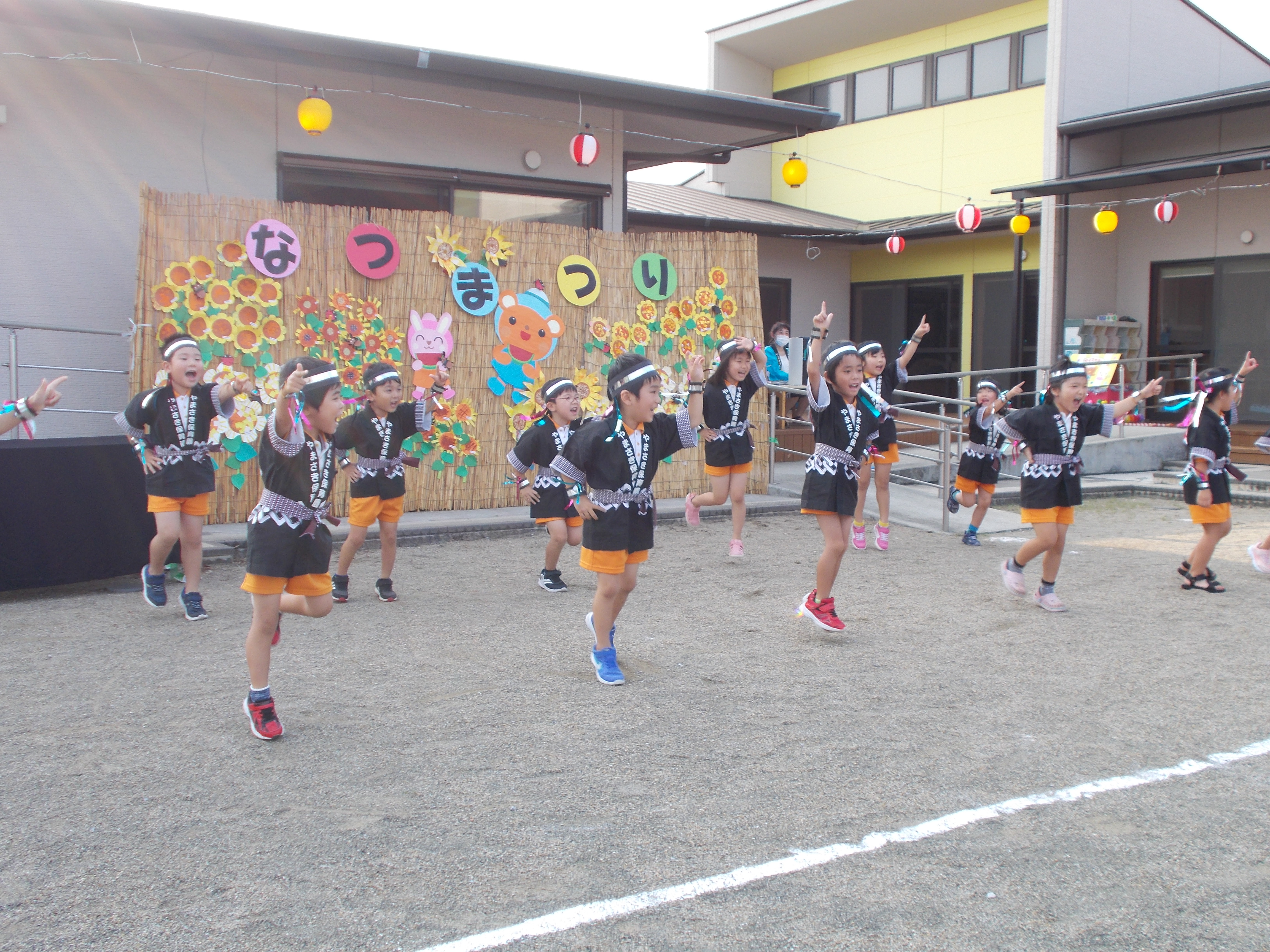 オープニングは子ども達の”ワッショイ ワッショイ”とお神輿を担ぐ元気のよい声が園庭に響き渡りました。年長児の出し物、小学生によるラムネ早飲み競争、職員によるマジック&今流行りの「鬼滅の刃」のダンス♪等を見て楽しみました。