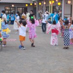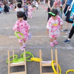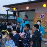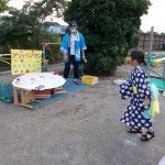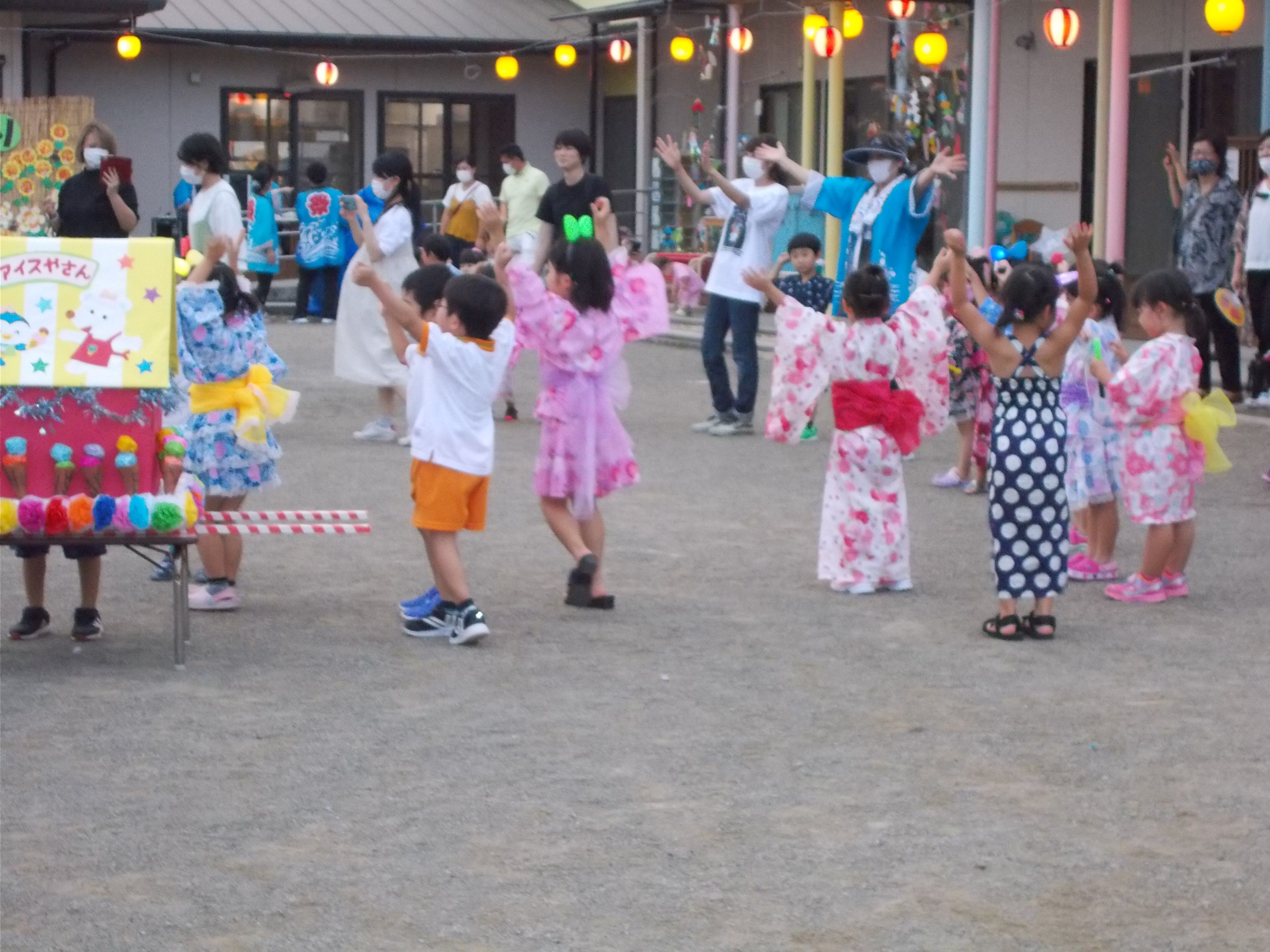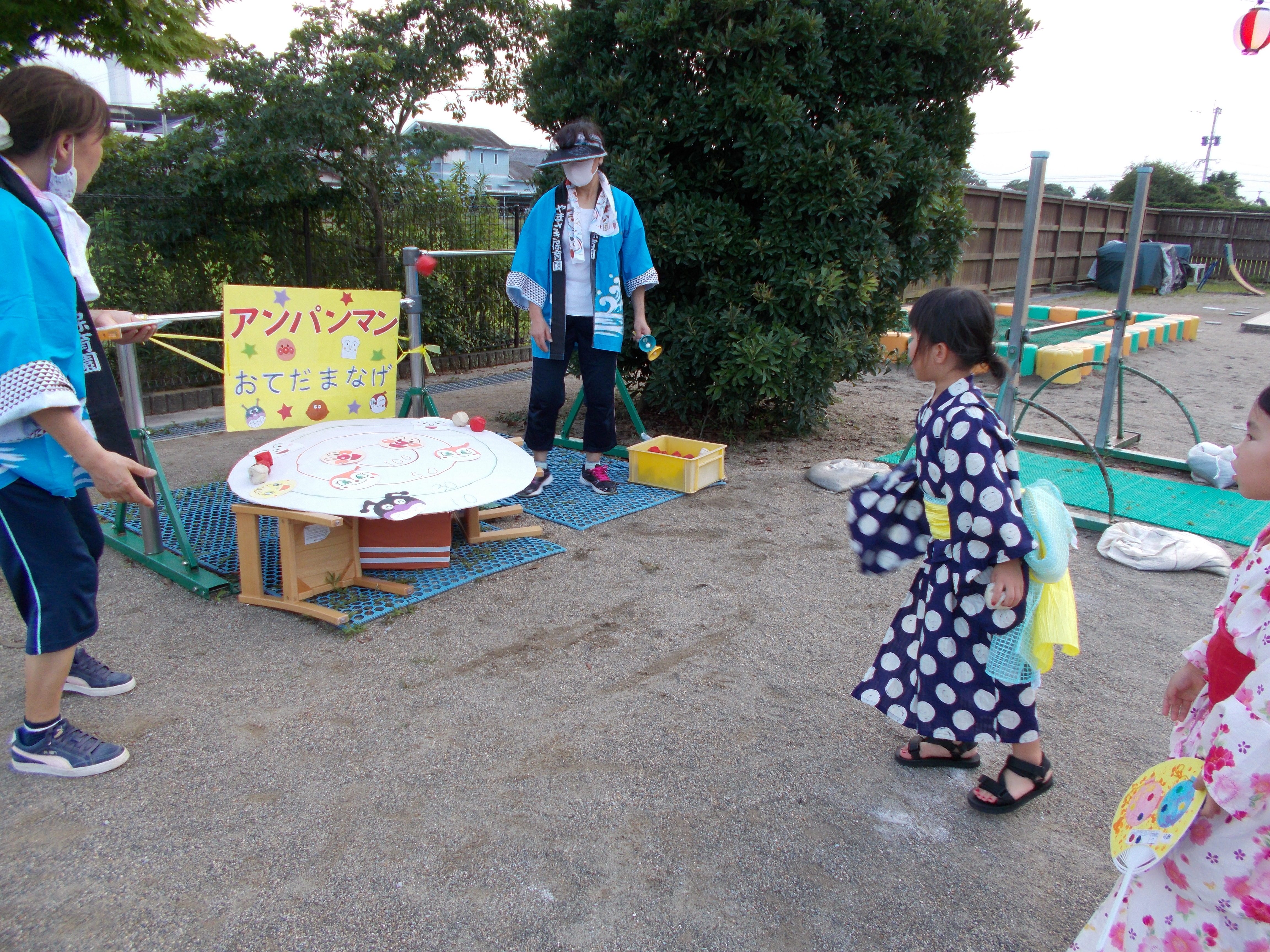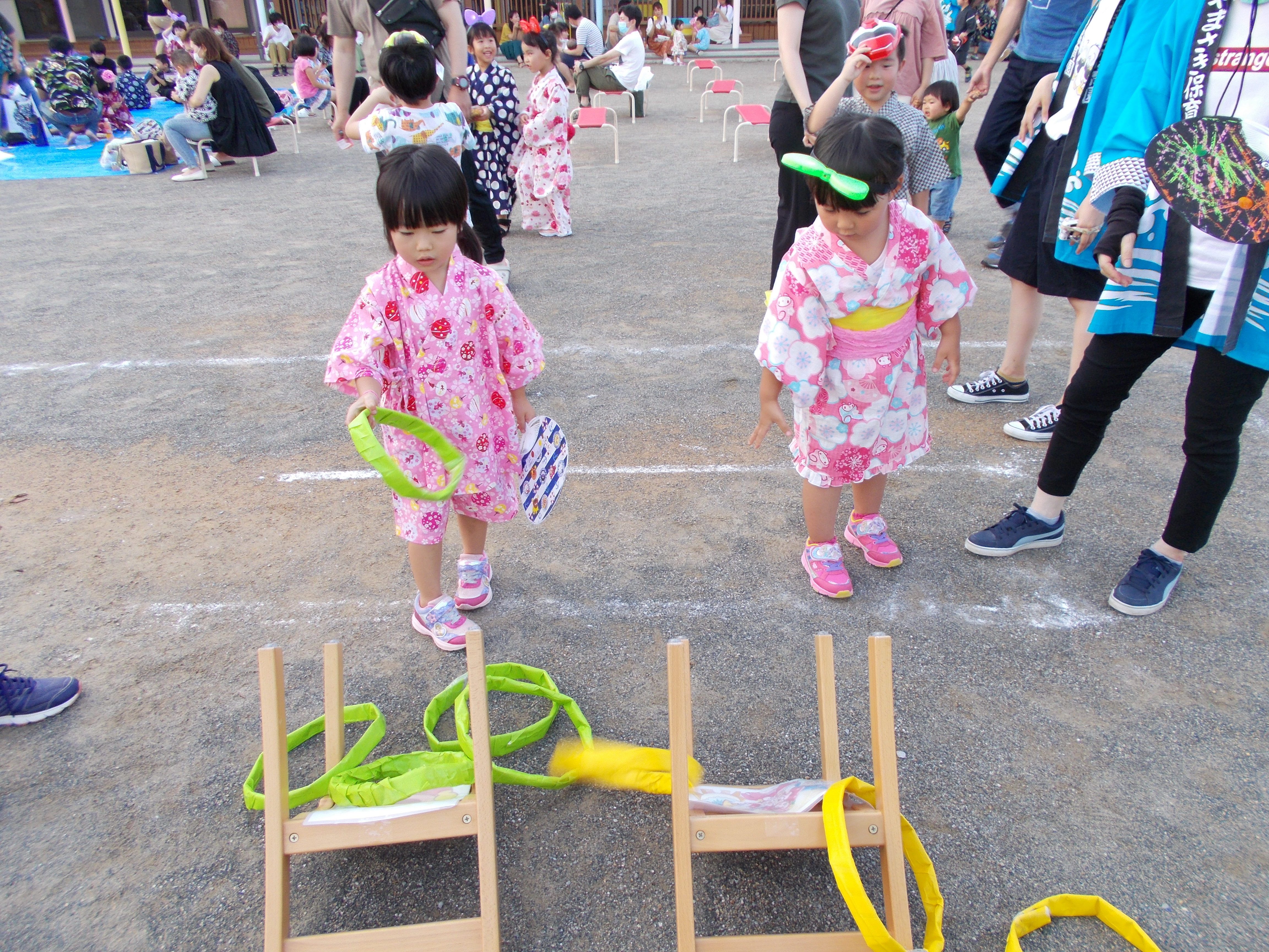 また、園庭に設置してある「輪投げ」「キックターゲット」「おてだま投げ」のゲームにも興味を持ち大喜びで参加していました。最後に盆踊りと抽選会もあり、楽しい夏祭りとなりました。