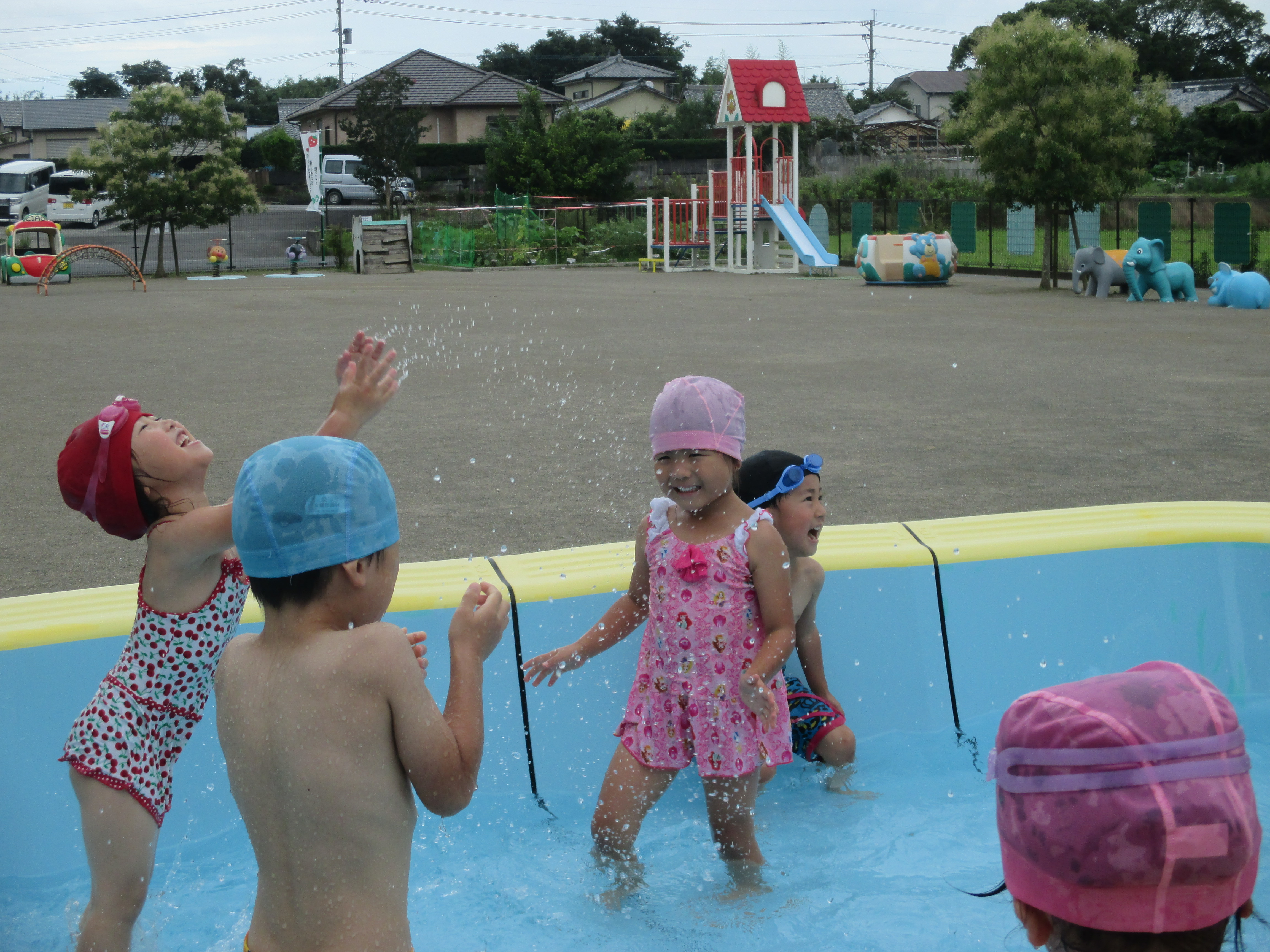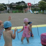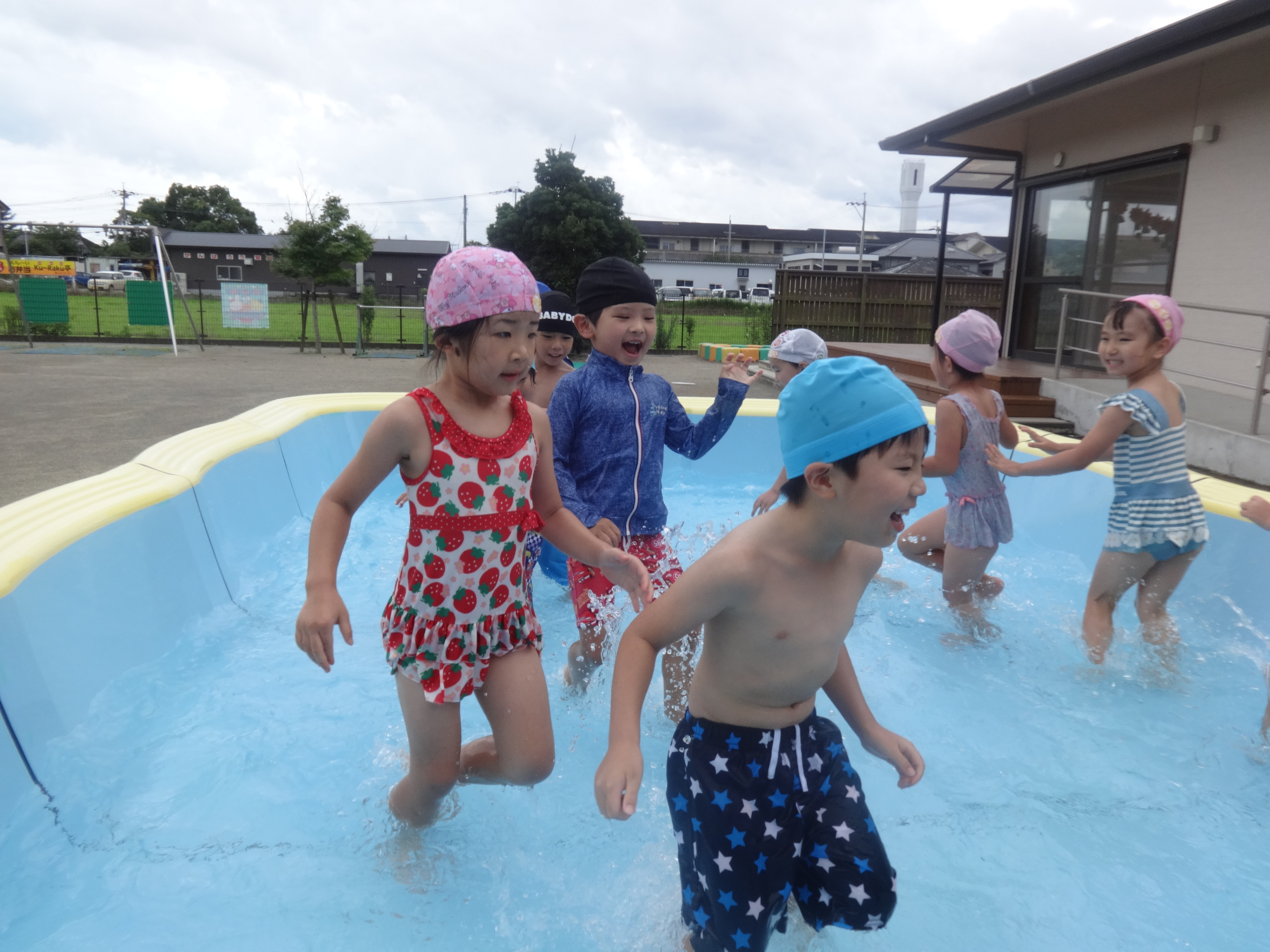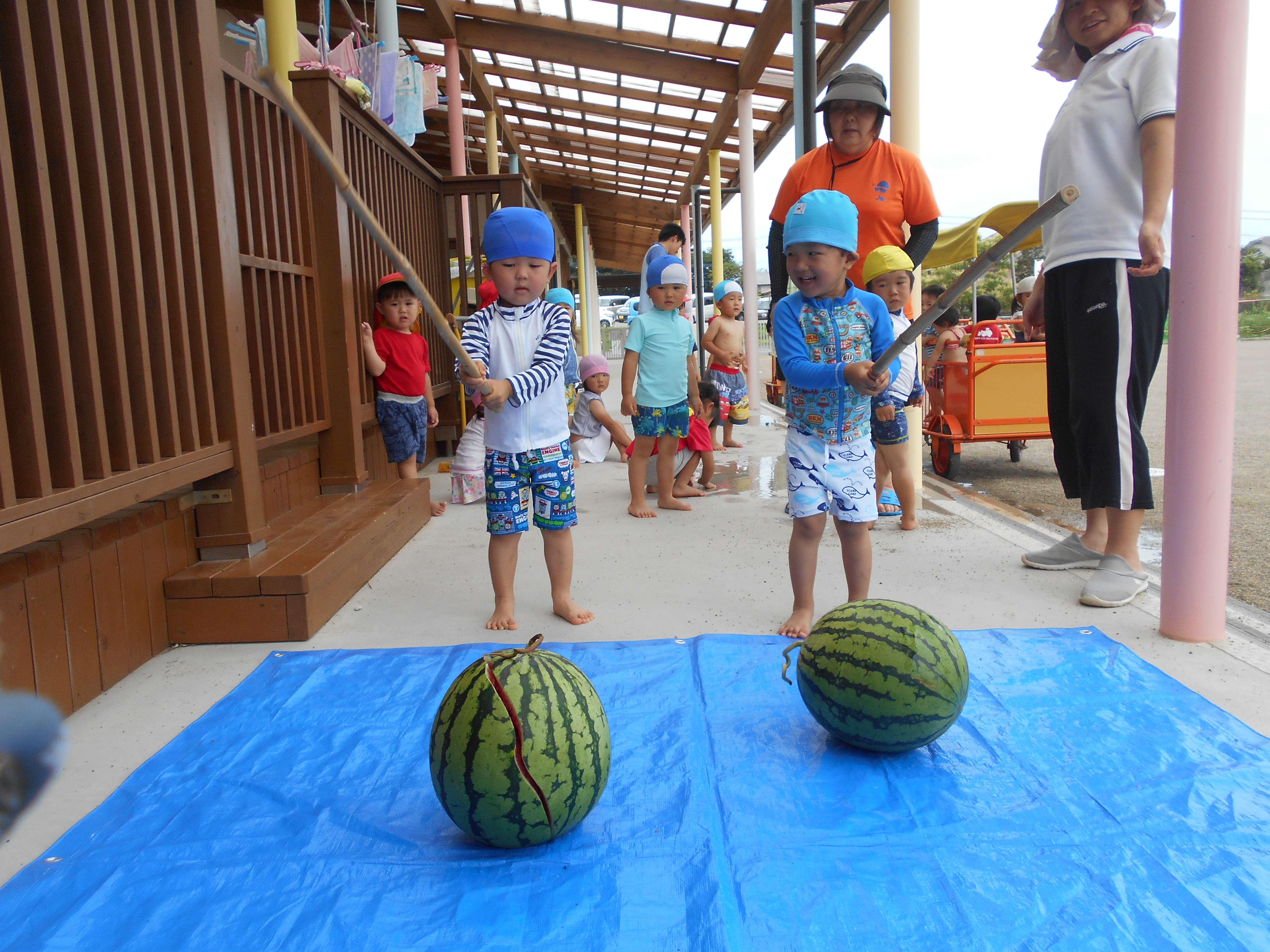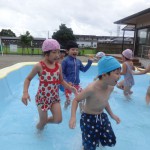 ちょっぴり天気がいまいちでしたが、子ども達はスイカ割りをしたり初プールに入り水しぶきをあげてプール遊びを楽しみました。