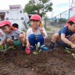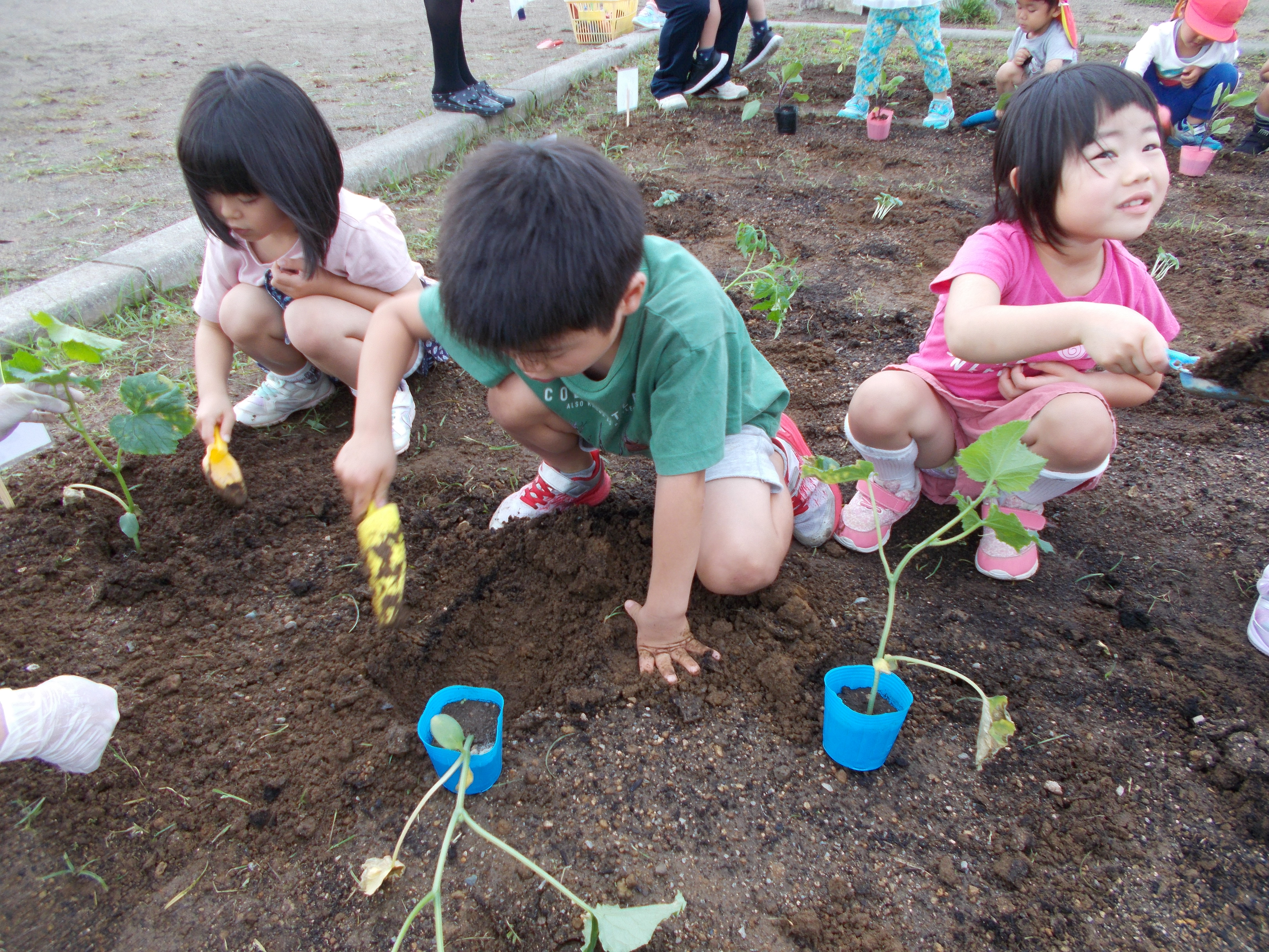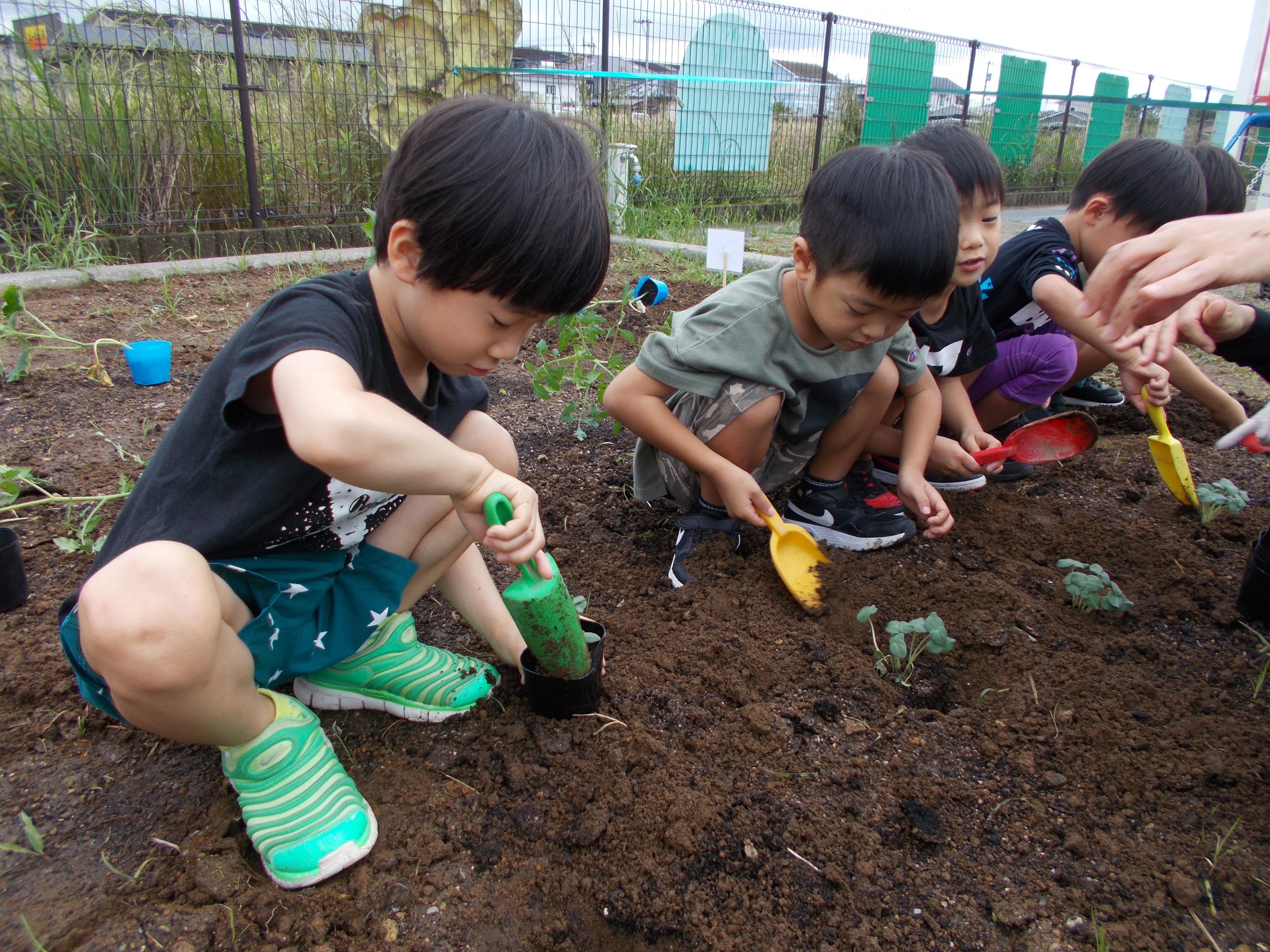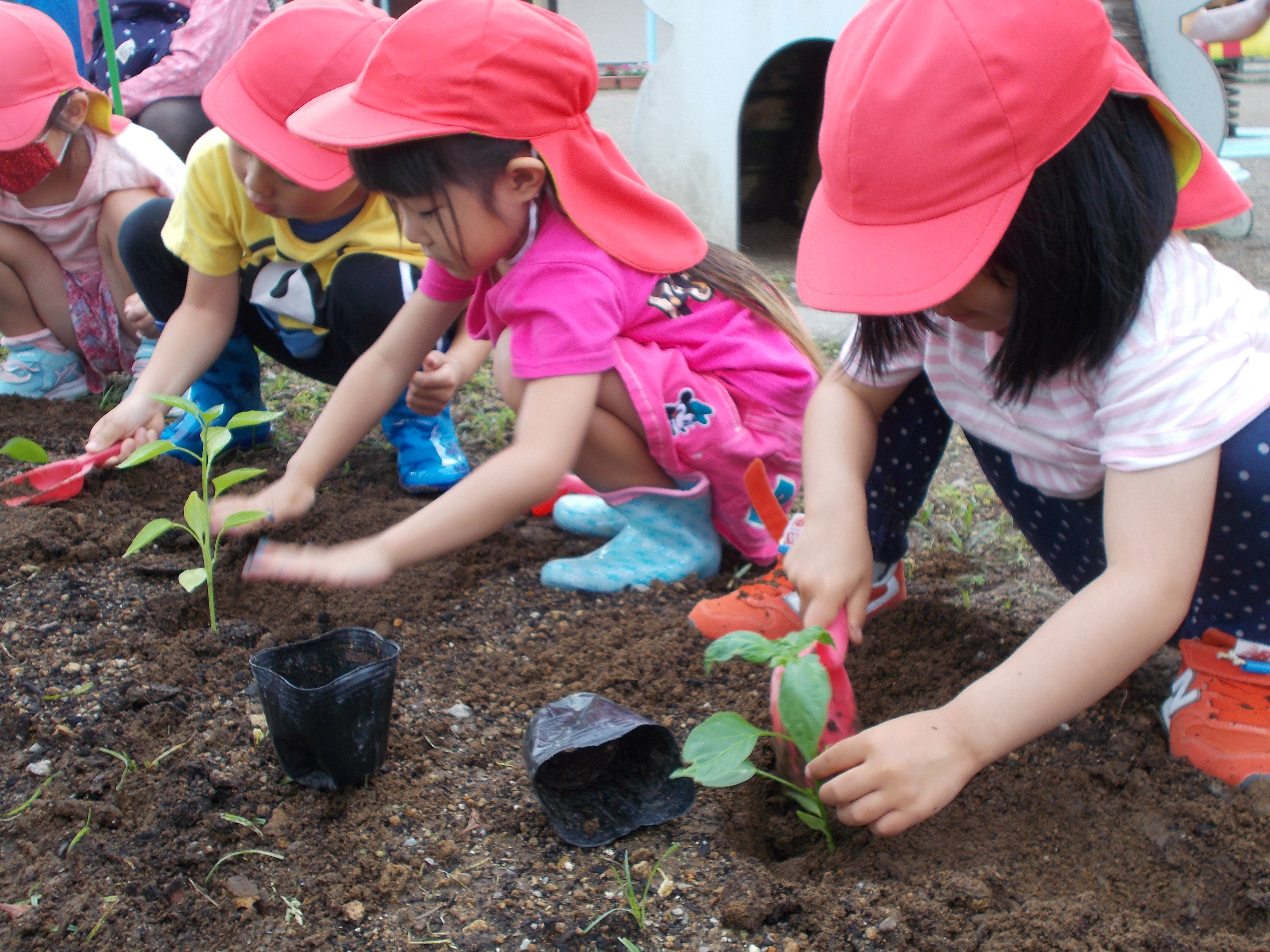 5月 食育 5月17日(月)トマト、きゅうり、オクラ、なすの苗植えをしました。 5月20日(木)トウモロコシの皮むきに4歳児がチャレンジしました。 みんなの給食や3時のおやつになるんだ!と、やる気満々。野菜に触れながら食育を楽しみたいと思います。