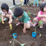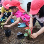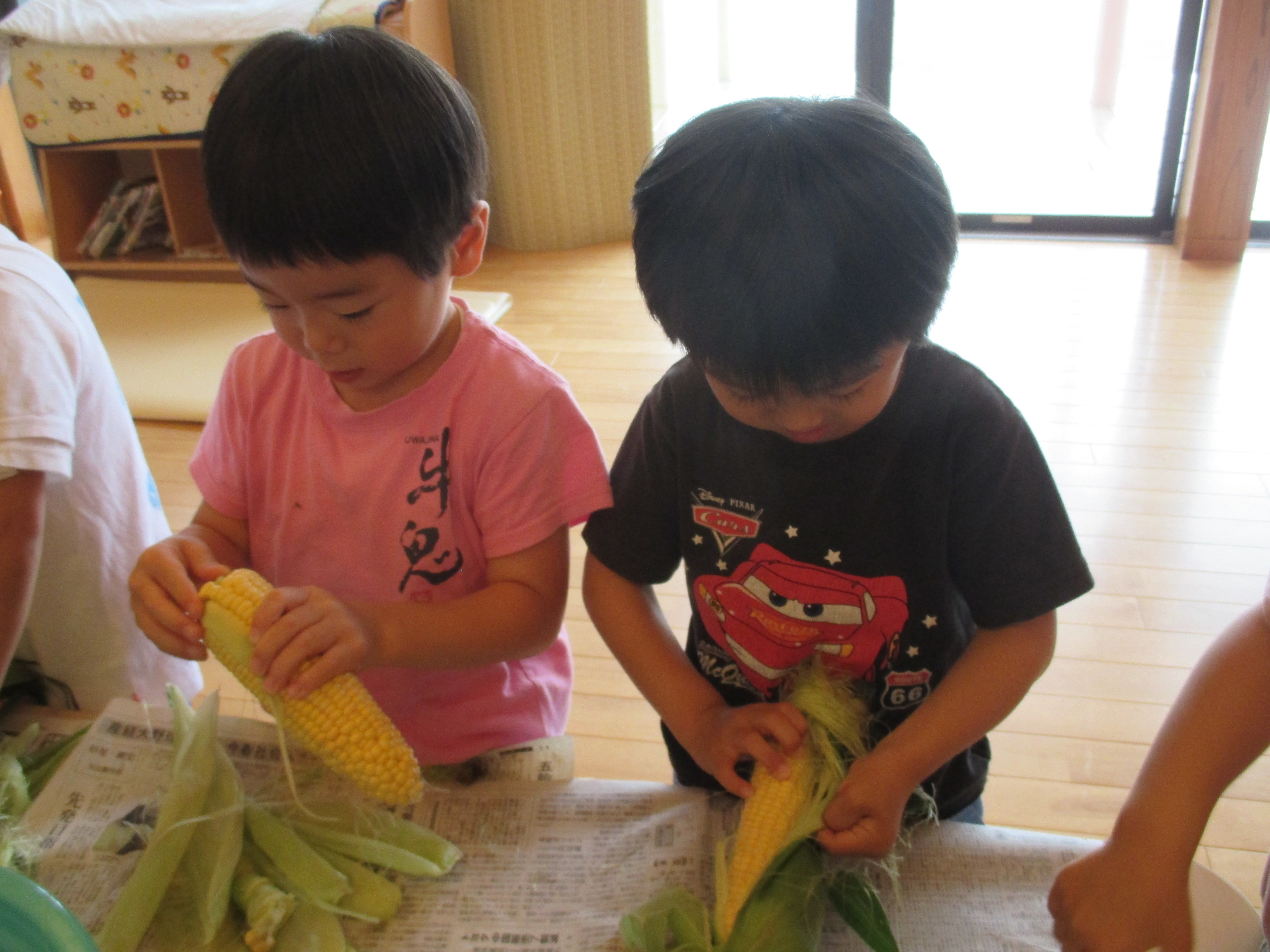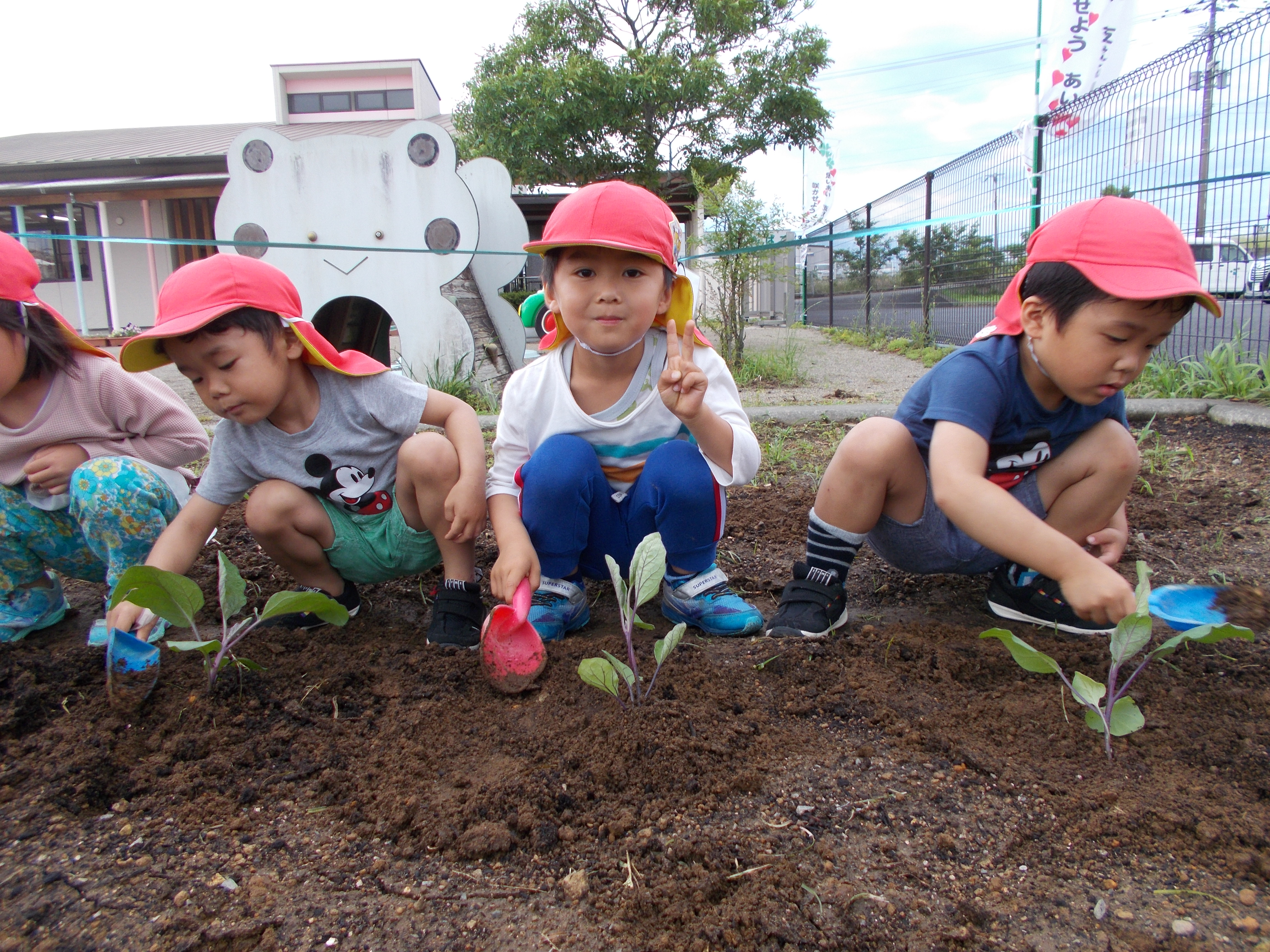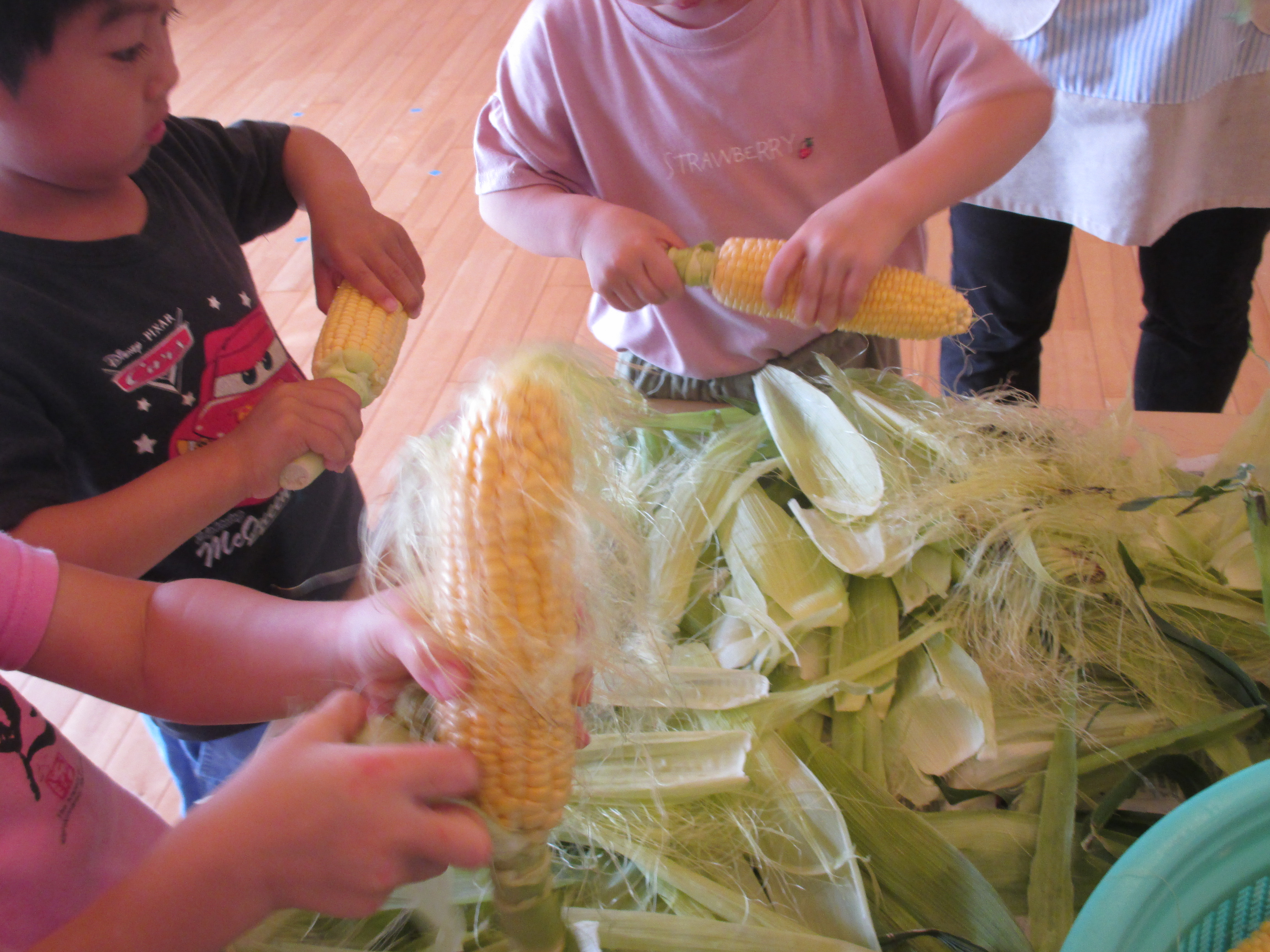 5月 食育 5月17日(月)トマト、きゅうり、オクラ、なすの苗植えをしました。 5月20日(木)トウモロコシの皮むきに4歳児がチャレンジしました。 みんなの給食や3時のおやつになるんだ!と、やる気満々。野菜に触れながら食育を楽しみたいと思います。