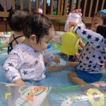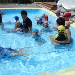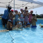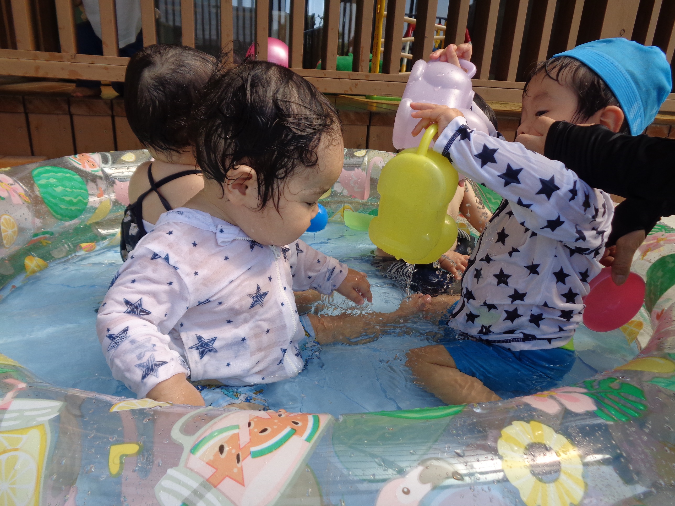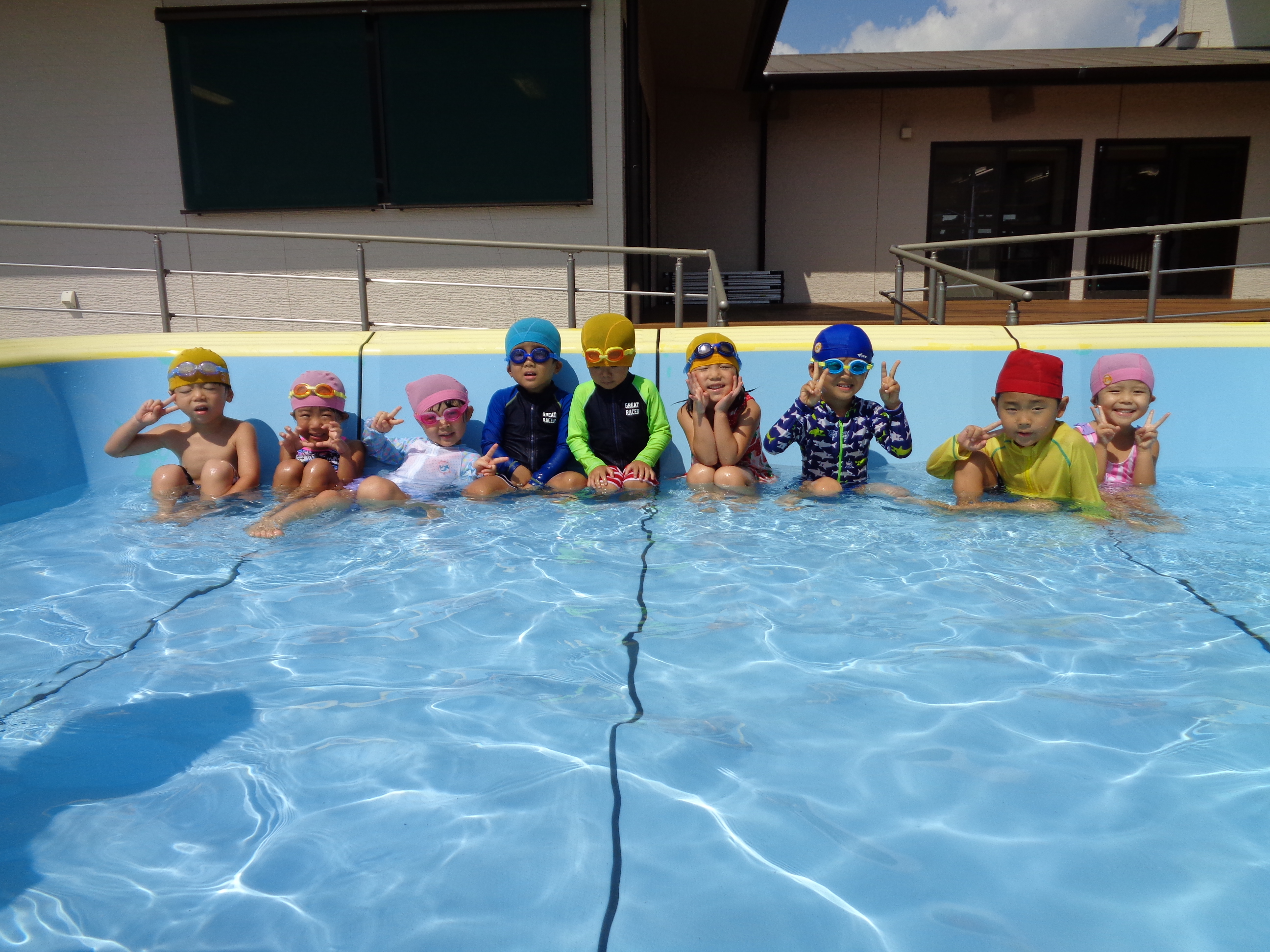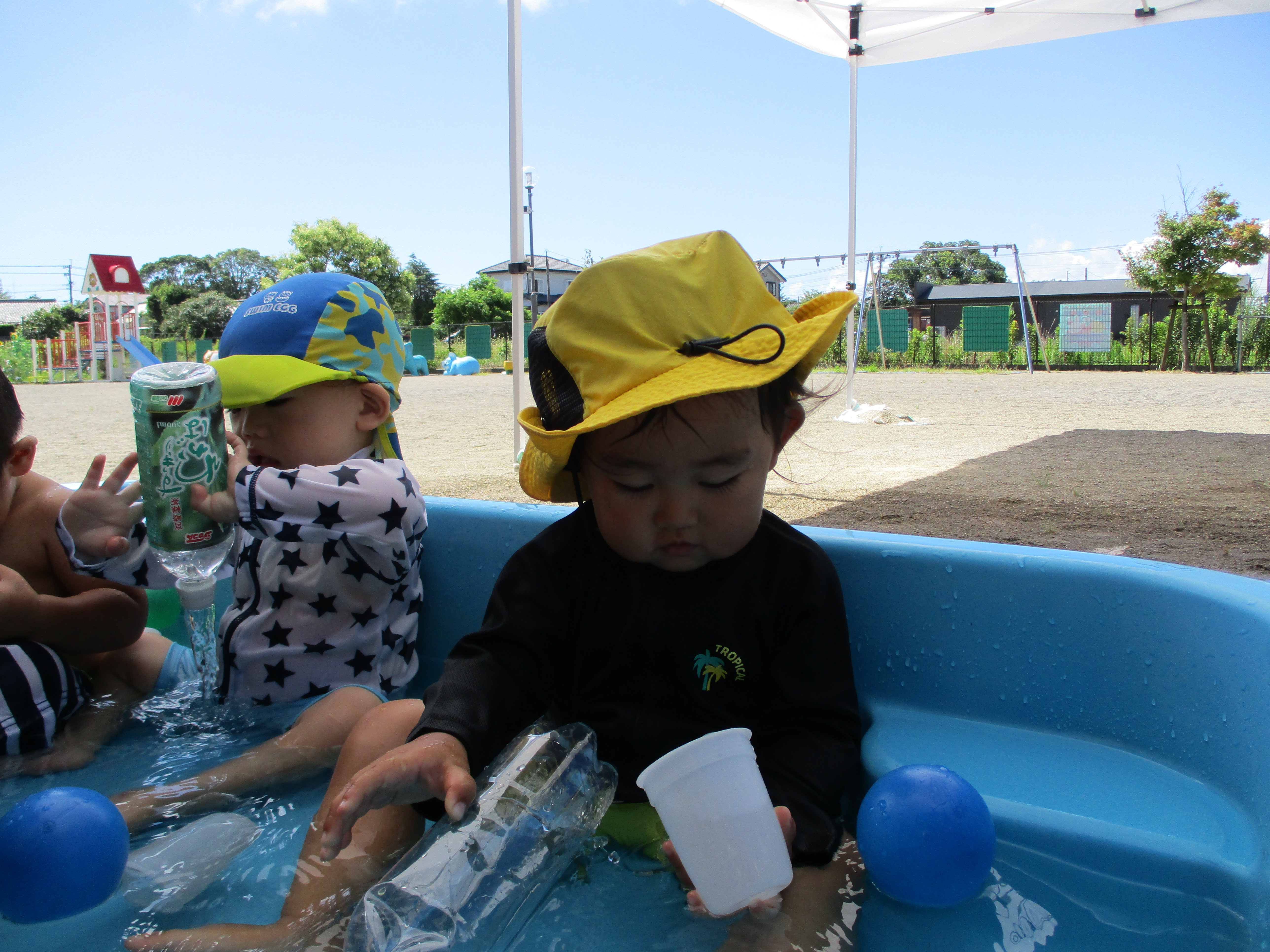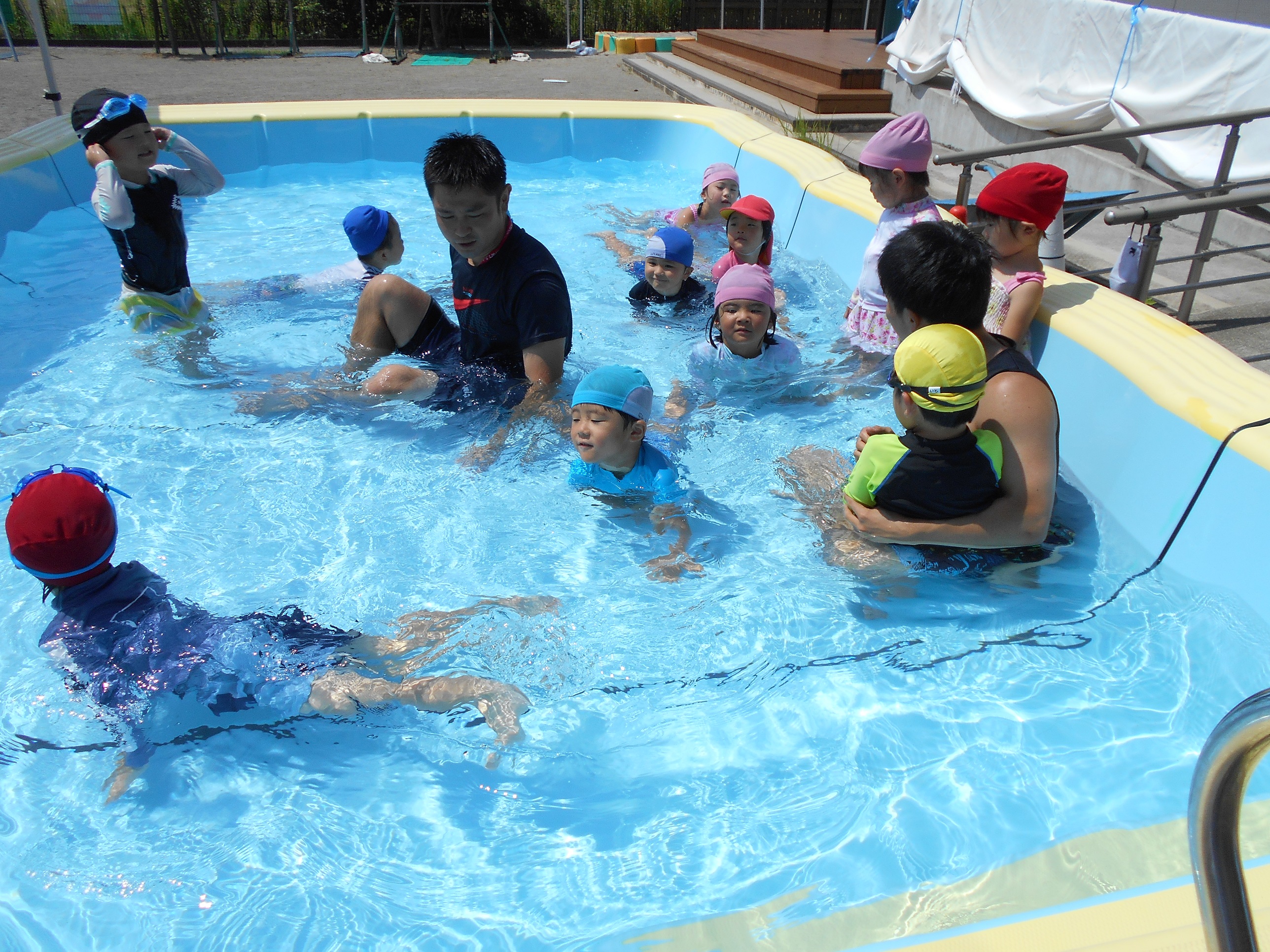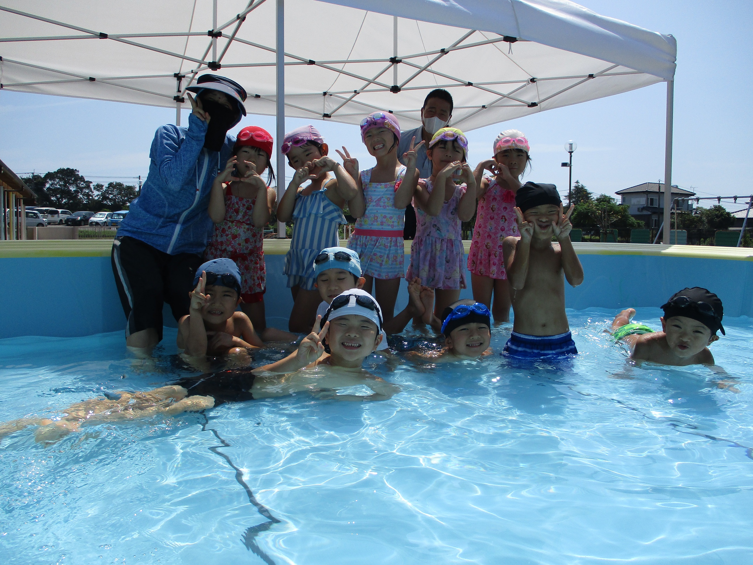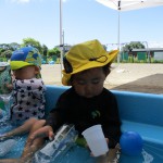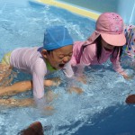 顔に水がかかることを怖がっていた子どもも、水に慣れてワニ泳ぎができるようになったり流れるプールを作ったりと、水しぶきをあげて遊びました。