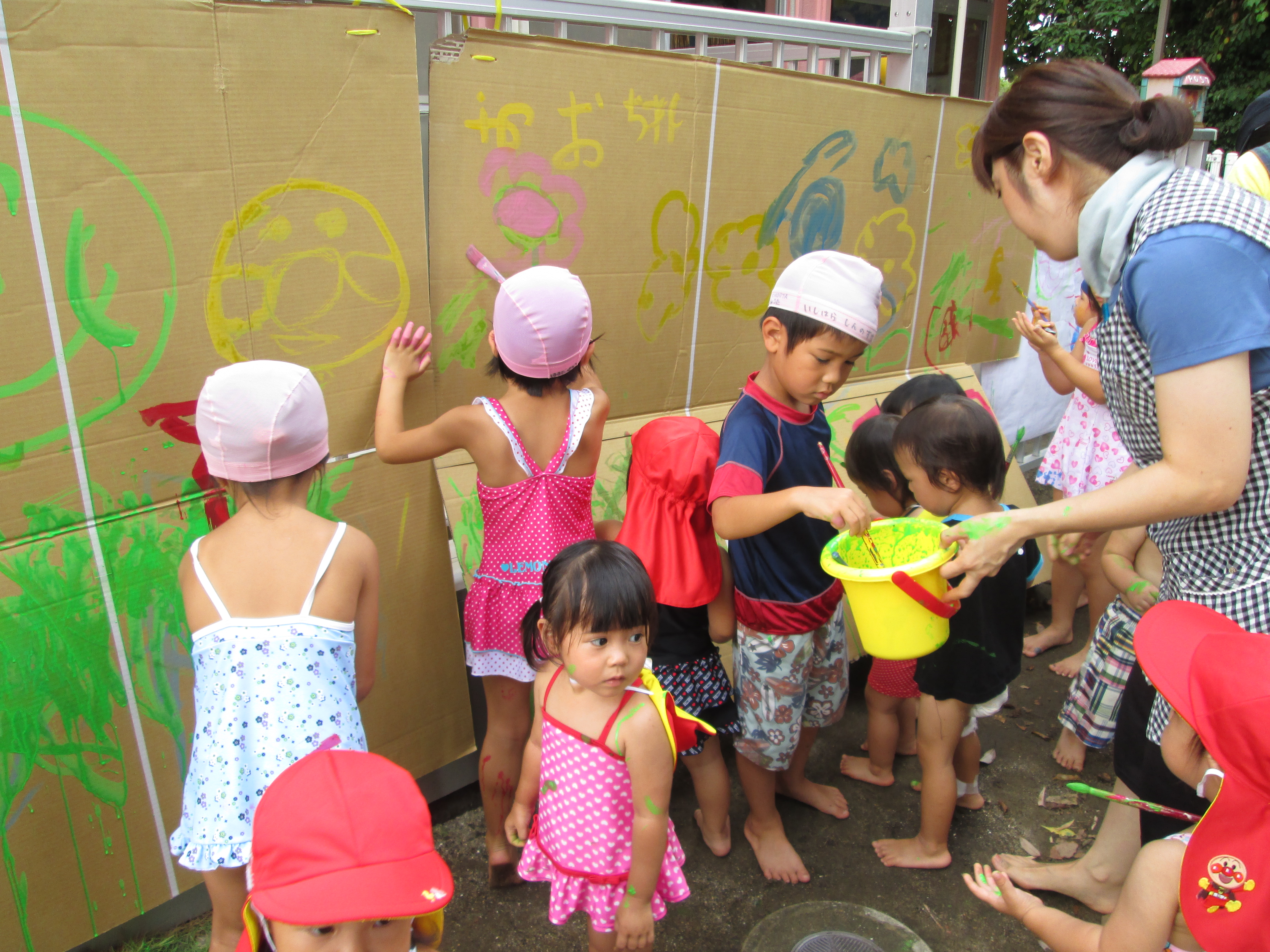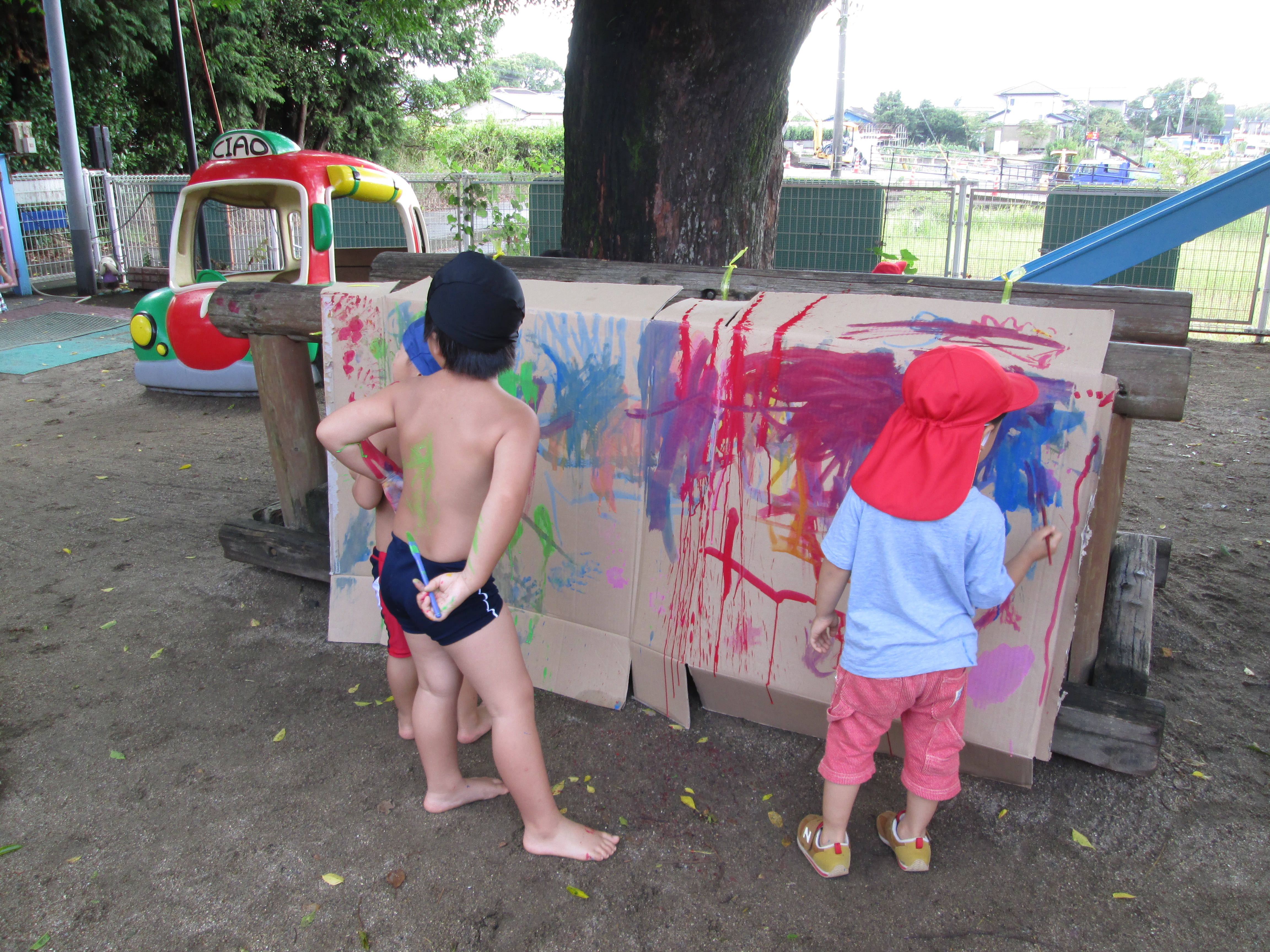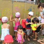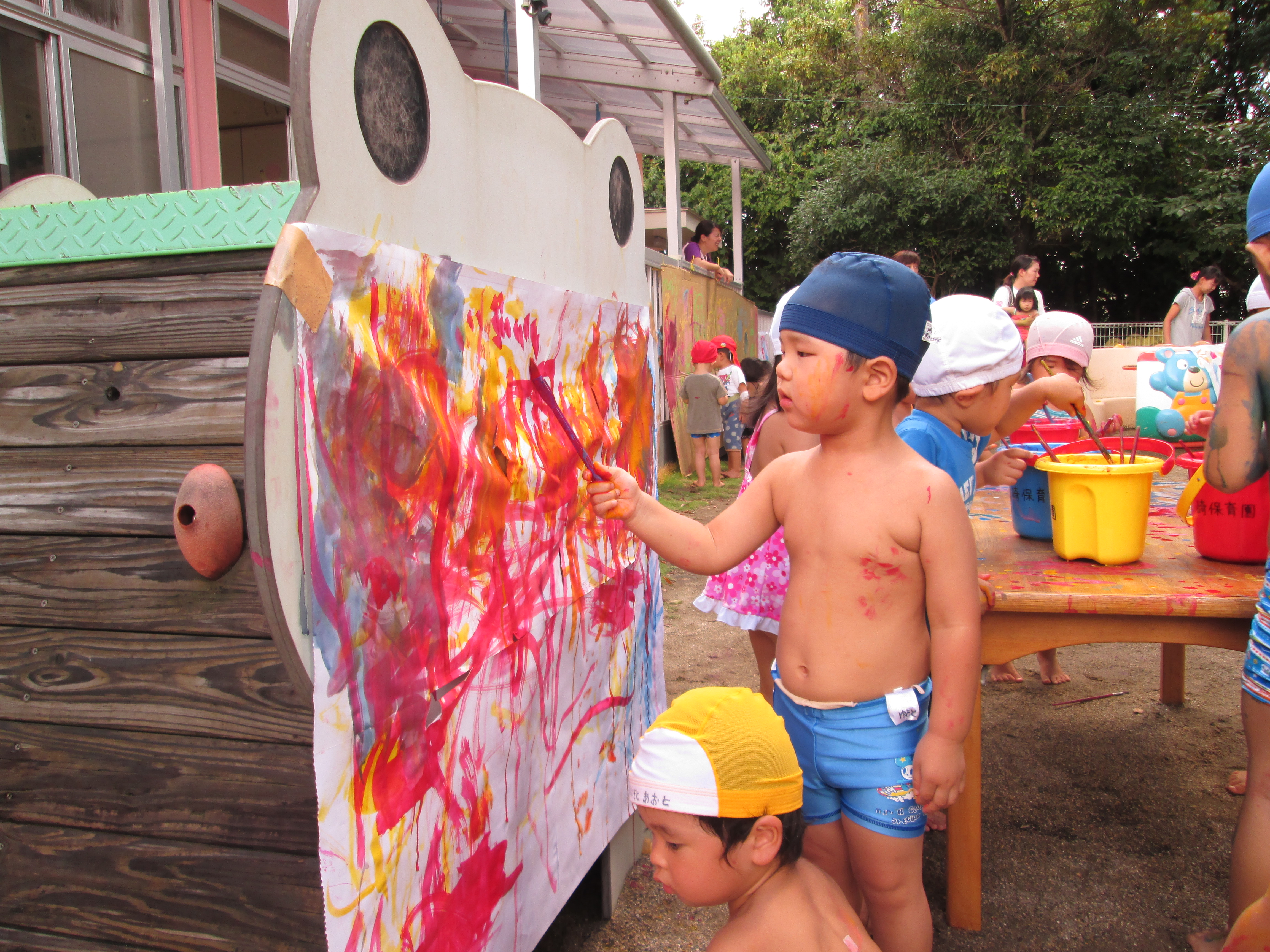 8月誕生会 8月21日(水) 8月の誕生会は、水着に着替えて外で行いました。 先生のマジックショーを見た後は、園庭に設置したキャンバスに色々な絵の具を使ってダイナミックにお絵描きを楽しみました。 大きな紙に伸び伸びと表現する子ども達・・・。素敵な作品が完成しましたよ。