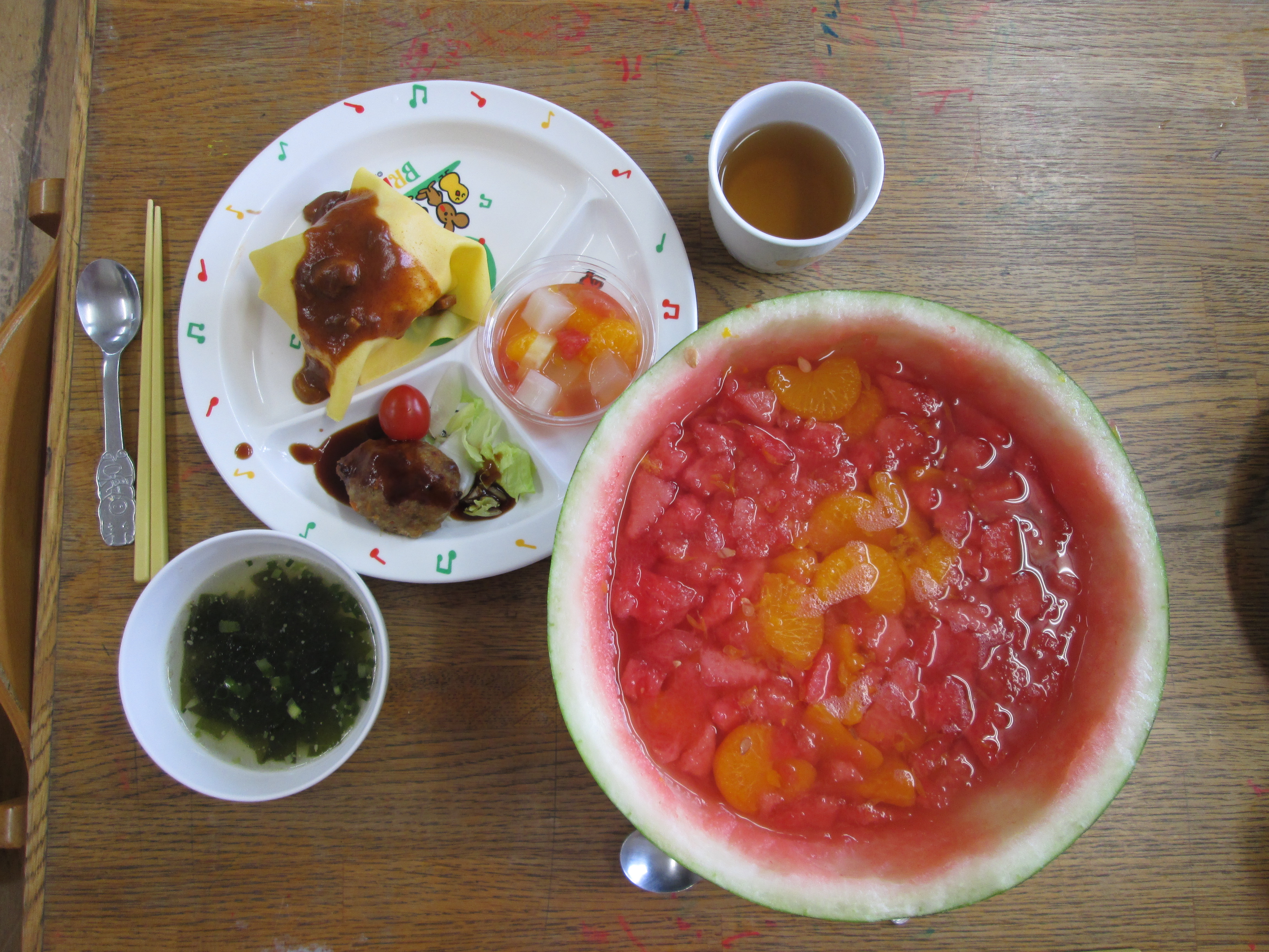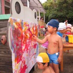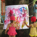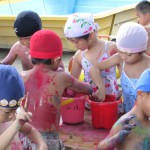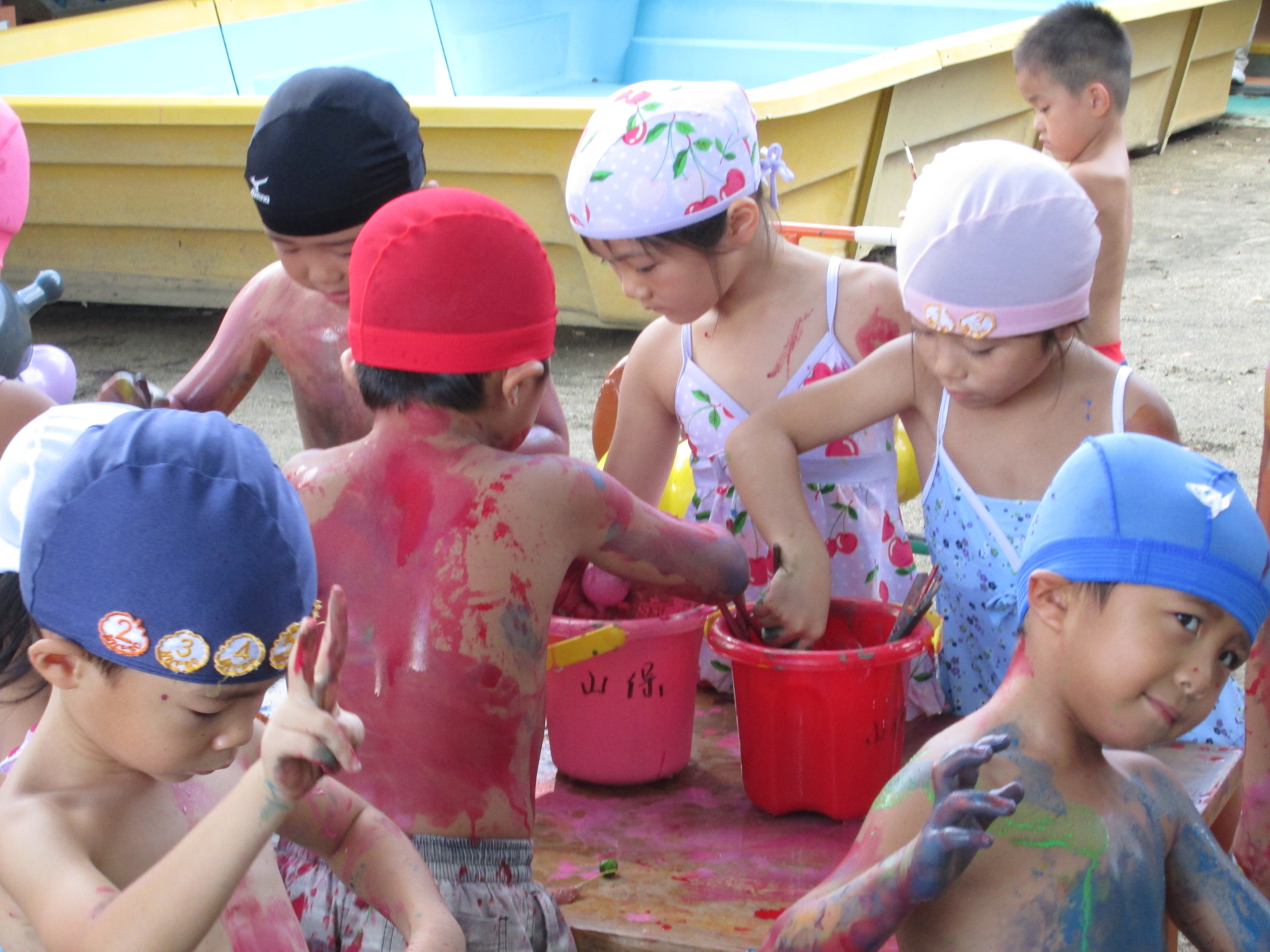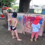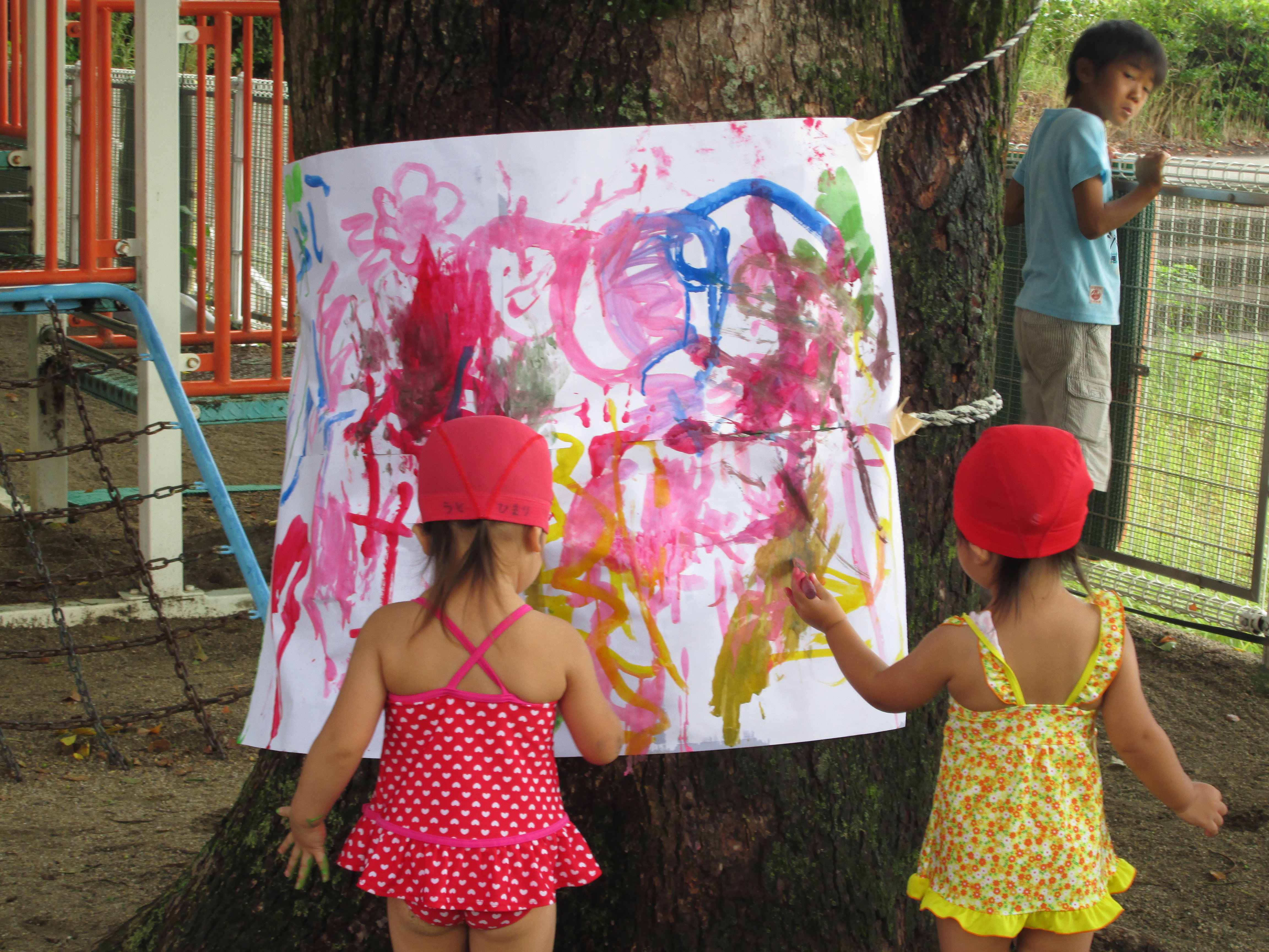 8月誕生会 8月21日(水) 8月の誕生会は、水着に着替えて外で行いました。 先生のマジックショーを見た後は、園庭に設置したキャンバスに色々な絵の具を使ってダイナミックにお絵描きを楽しみました。 大きな紙に伸び伸びと表現する子ども達・・・。素敵な作品が完成しましたよ。