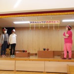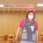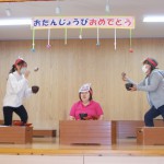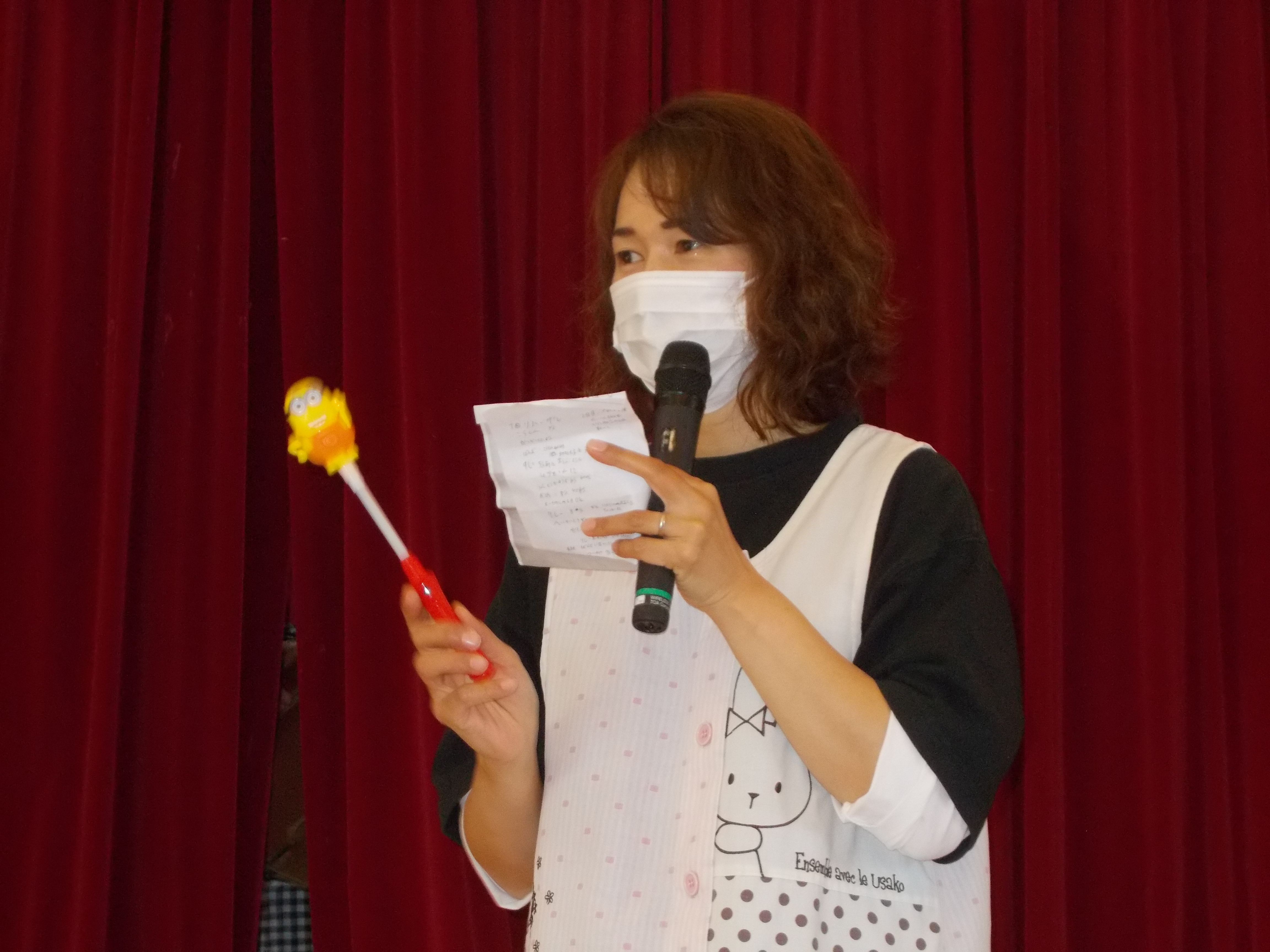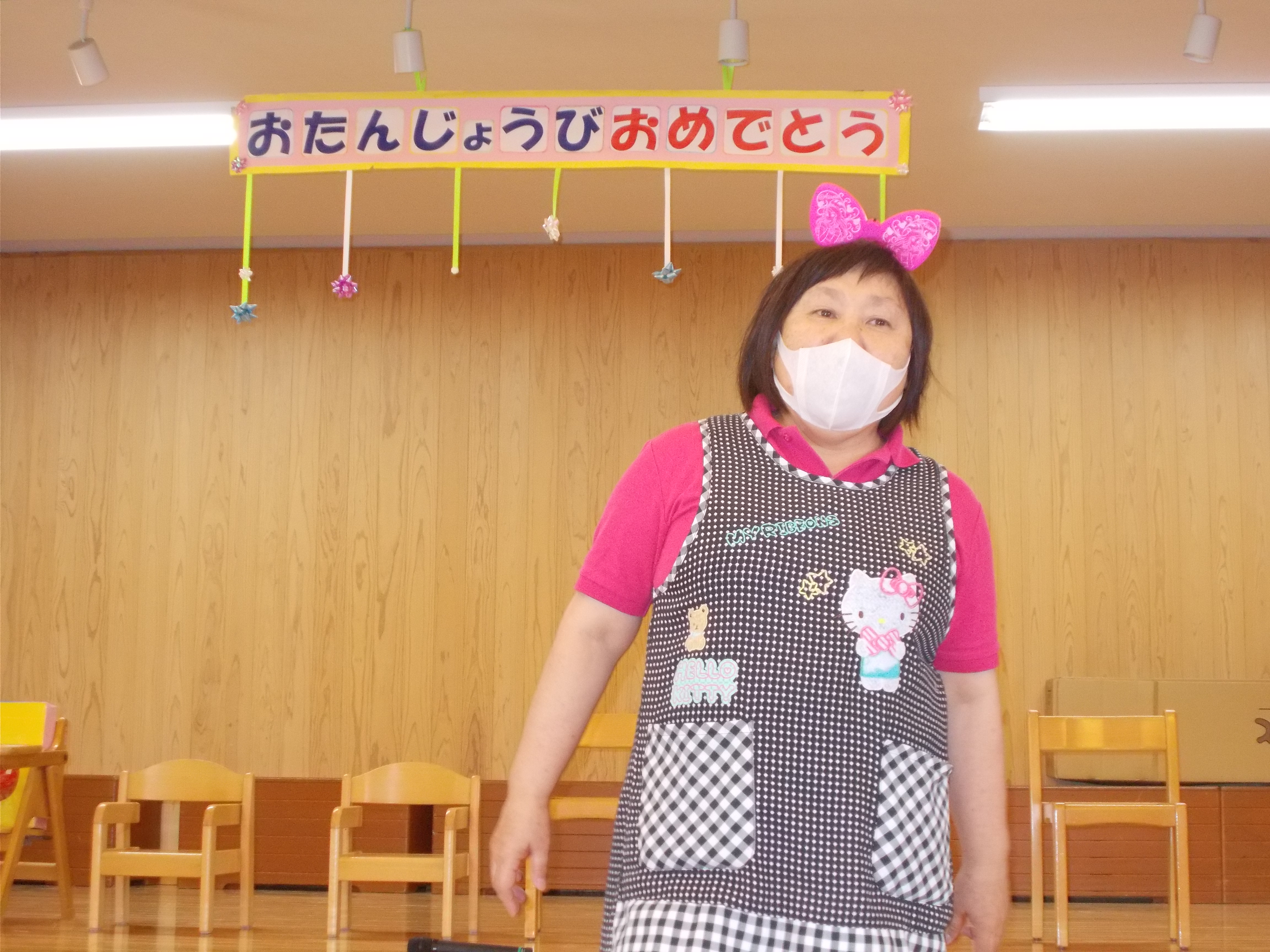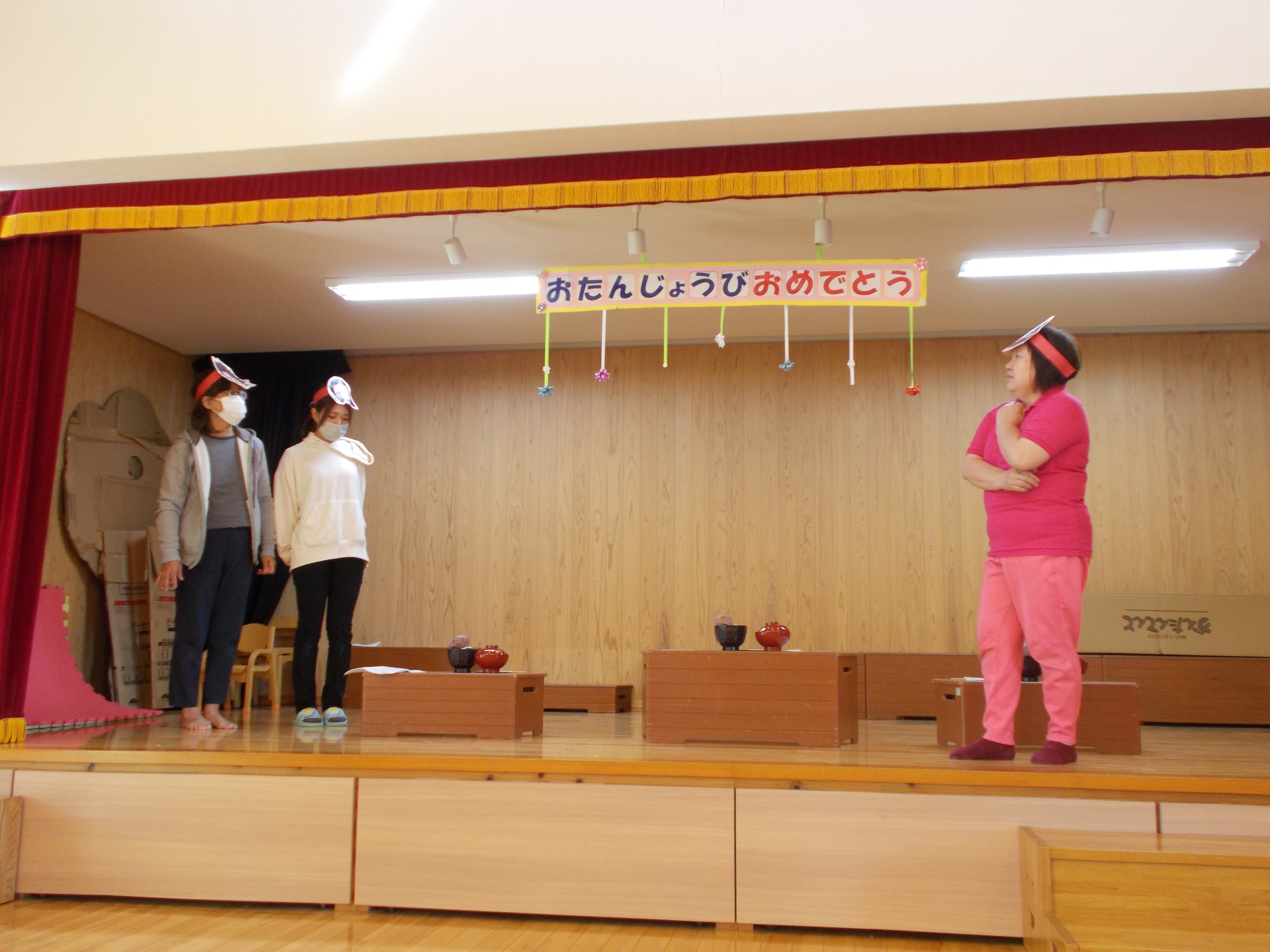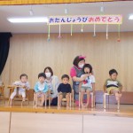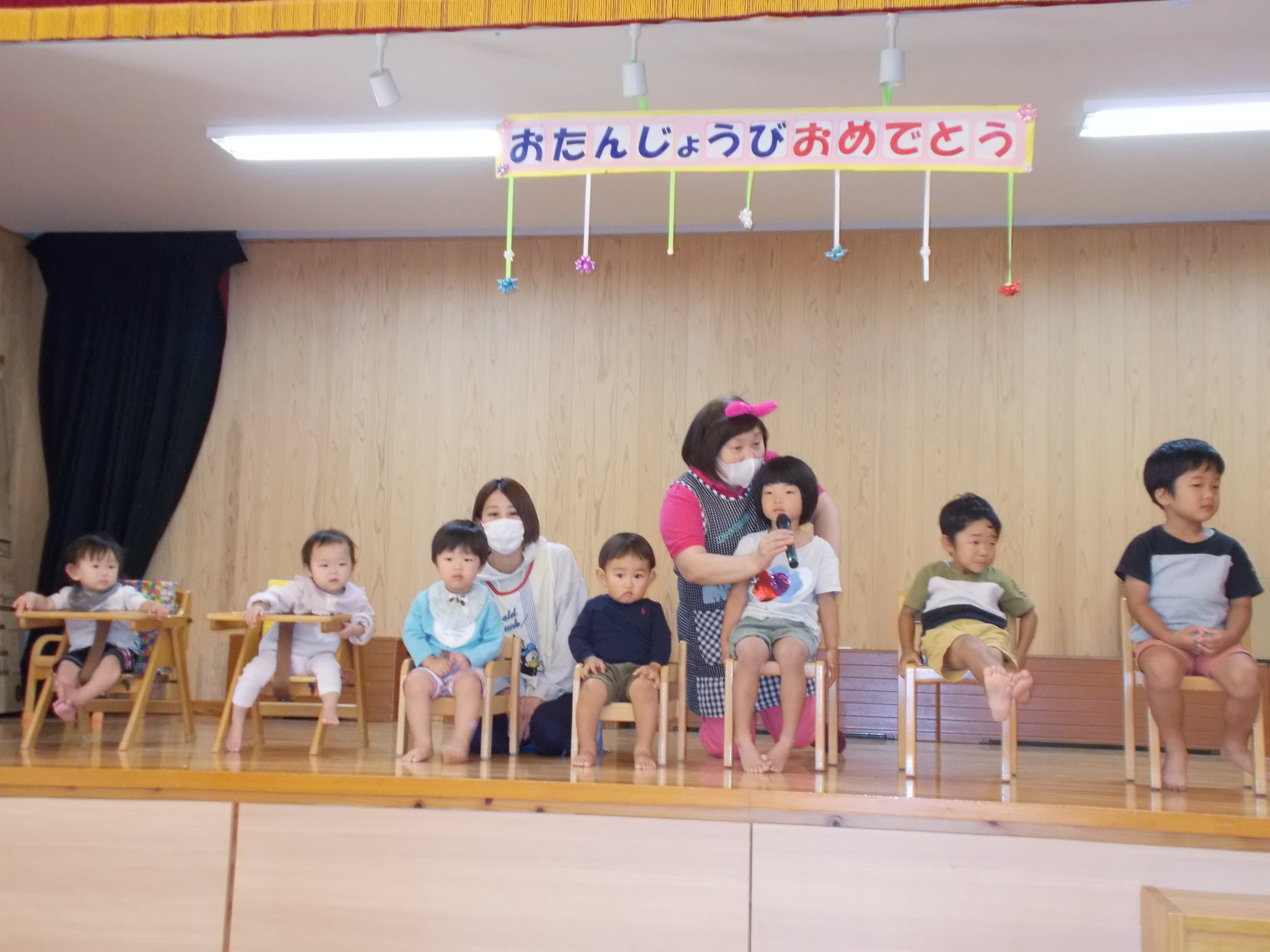 10月 誕生会 10月20日(水) 10月の誕生会が行われました。 季節の歌を歌ったり、誕生絵本のプレゼントをしたりとみんなでお祝いをしました。 毎回楽しみにしている出し物では、鬼滅の刃に登場する炭治郎・禰豆子・伊之助に扮した『おいもコロコロ』の劇に大笑いしたり、全集中の呼吸でクイズに答えたりしていました。