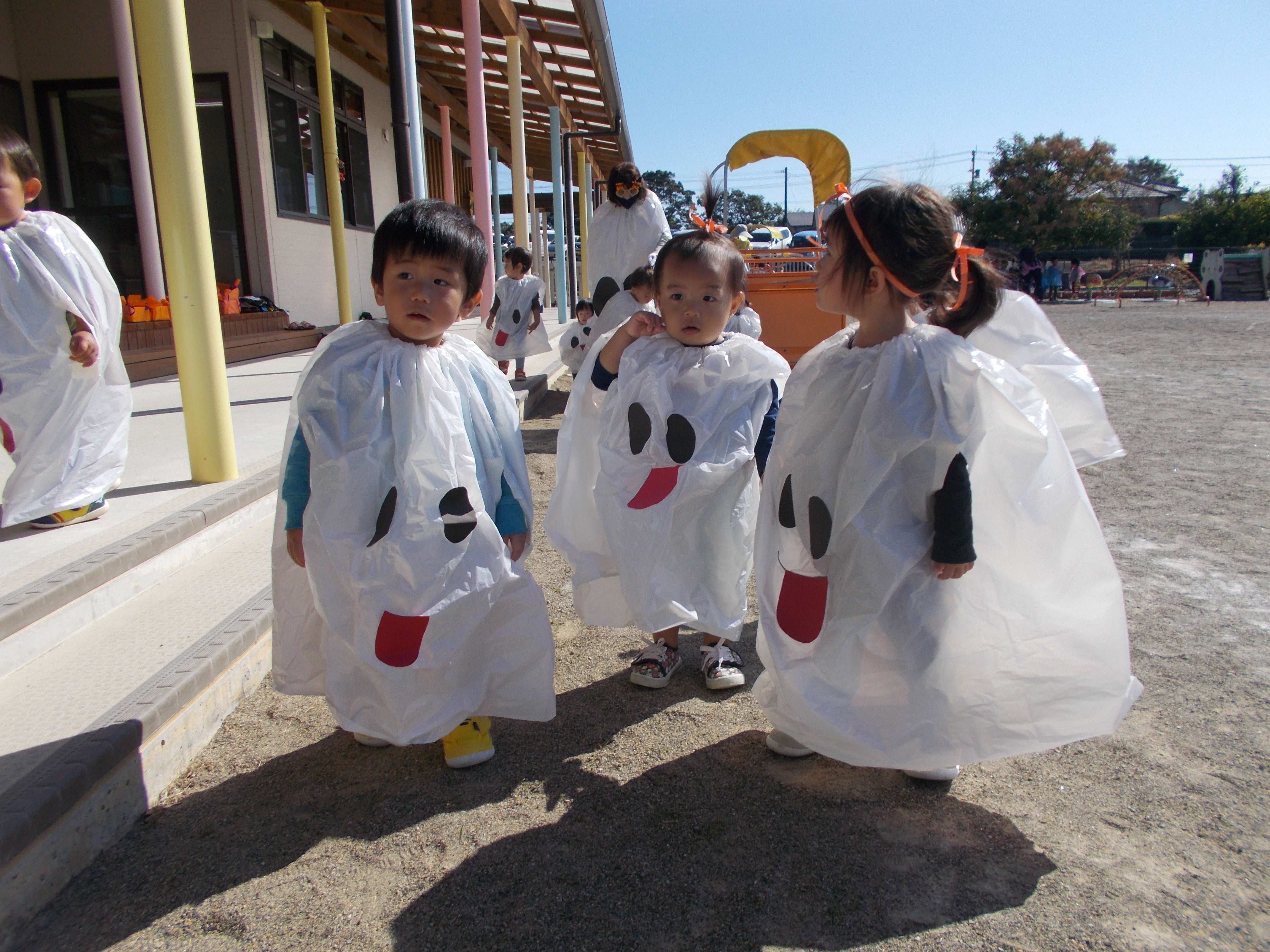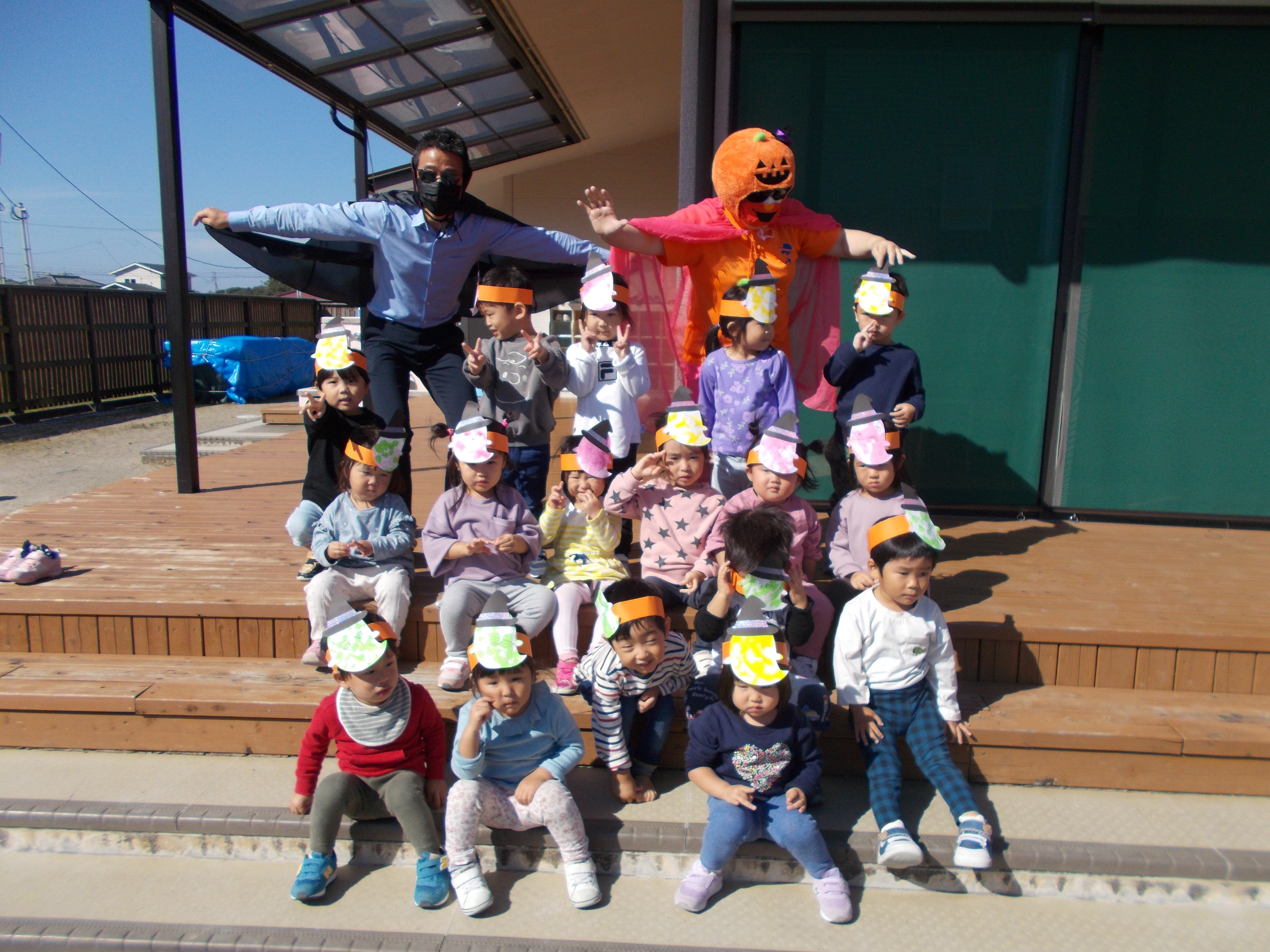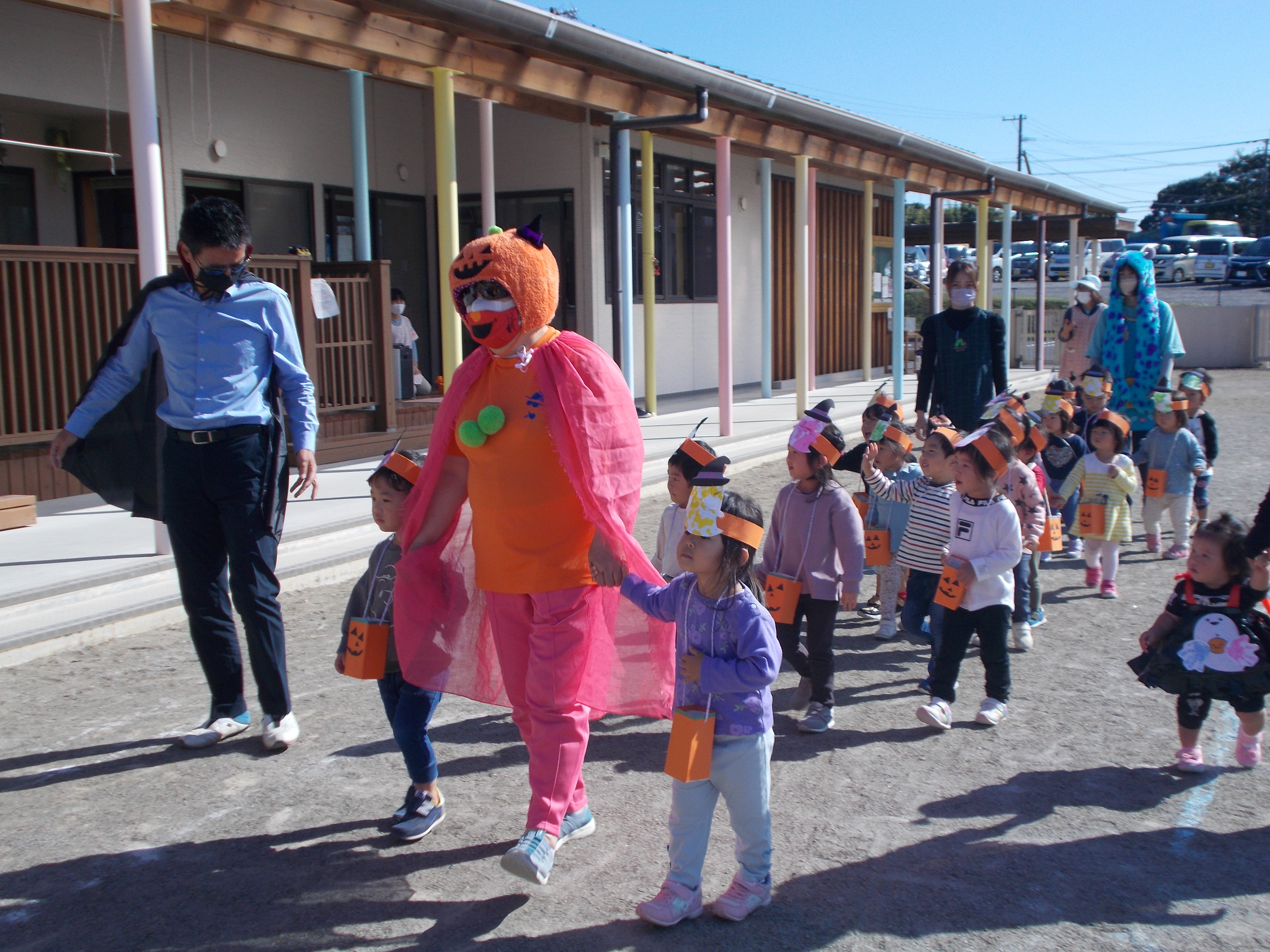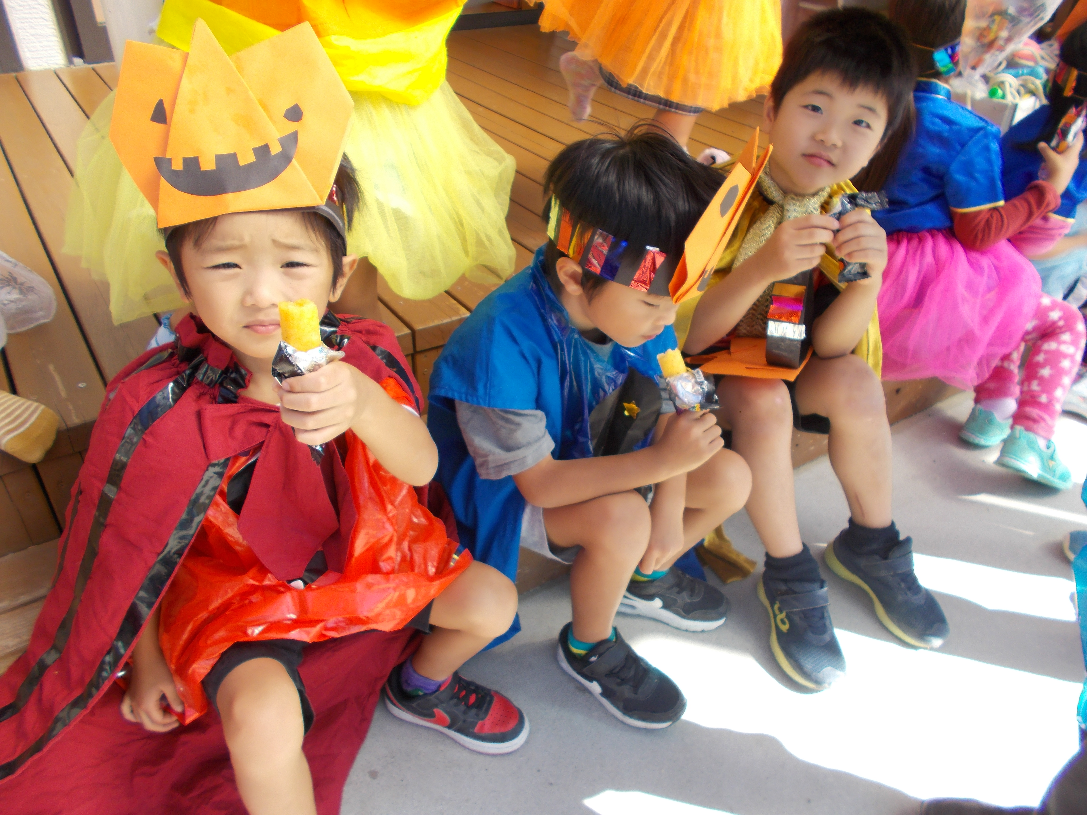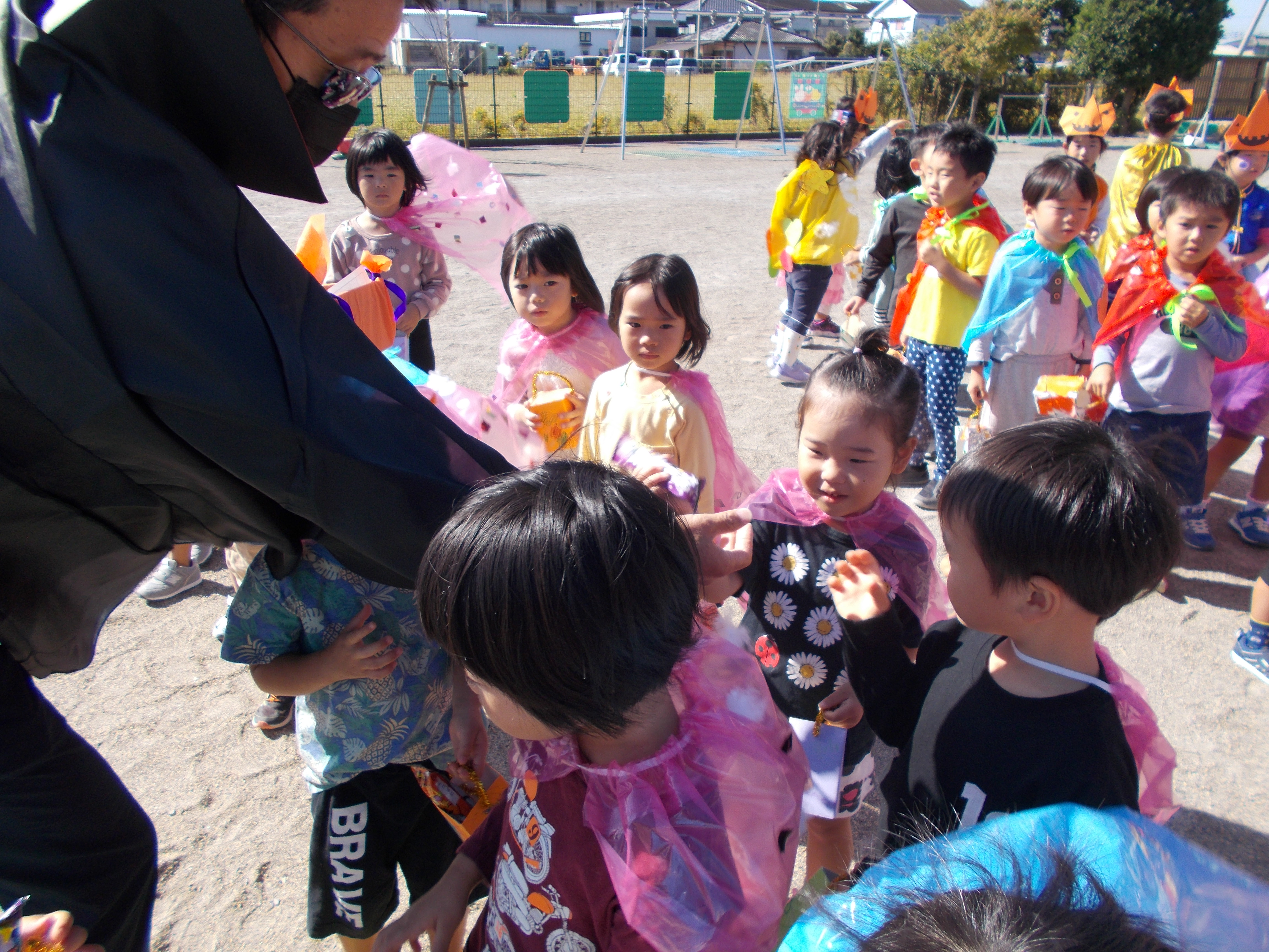 ハロウィン 10月29日(金) オバケや海賊、お姫様の仮装をしてハロウィンパレードを楽しみました。 途中、「トリックオアトリート」の言葉を聞くと、お菓子をくれる優しいドラキュラ伯爵も登場! もらったお菓子を皆で食べて、楽しい時間を過ごしました。
