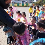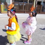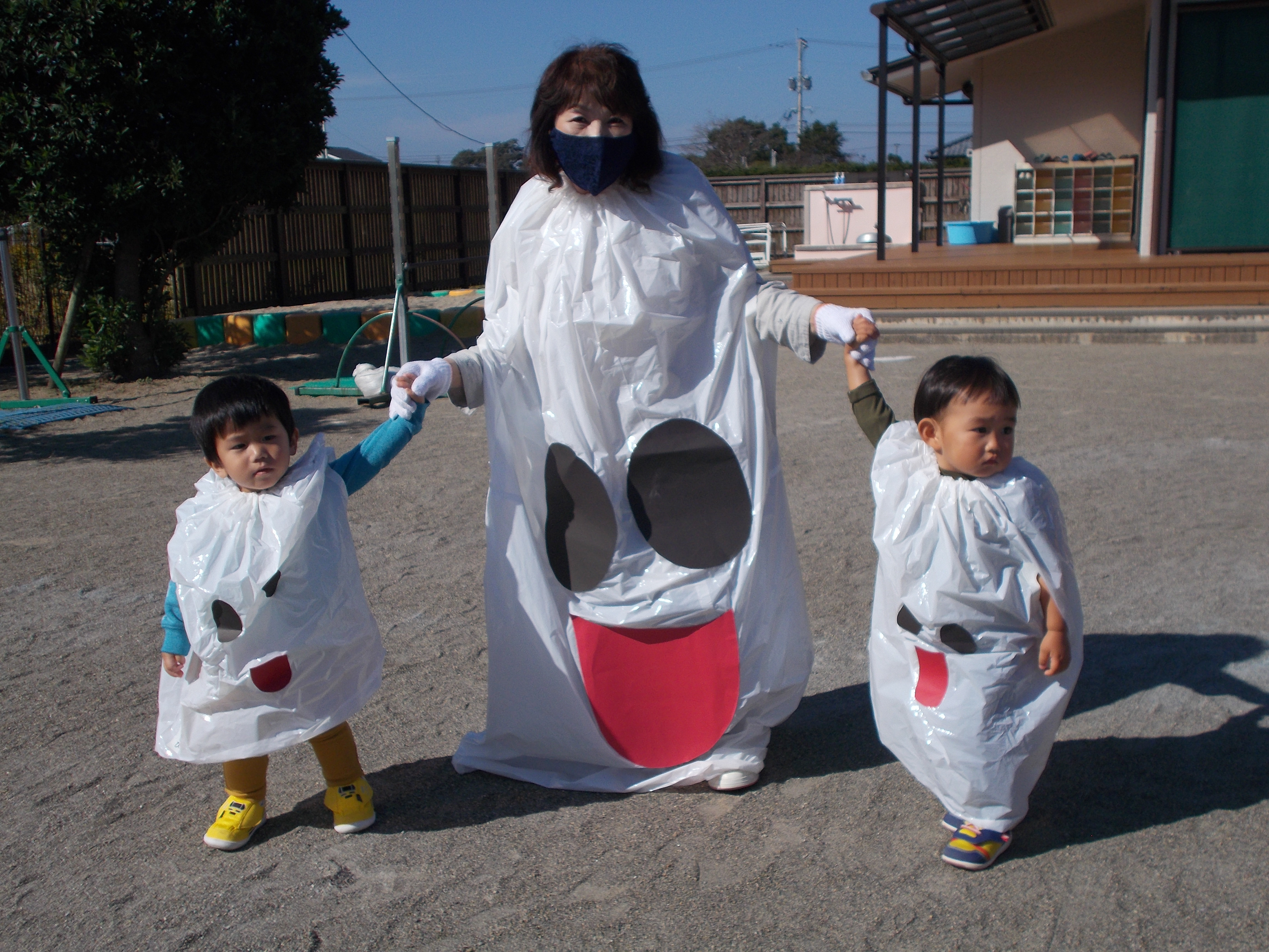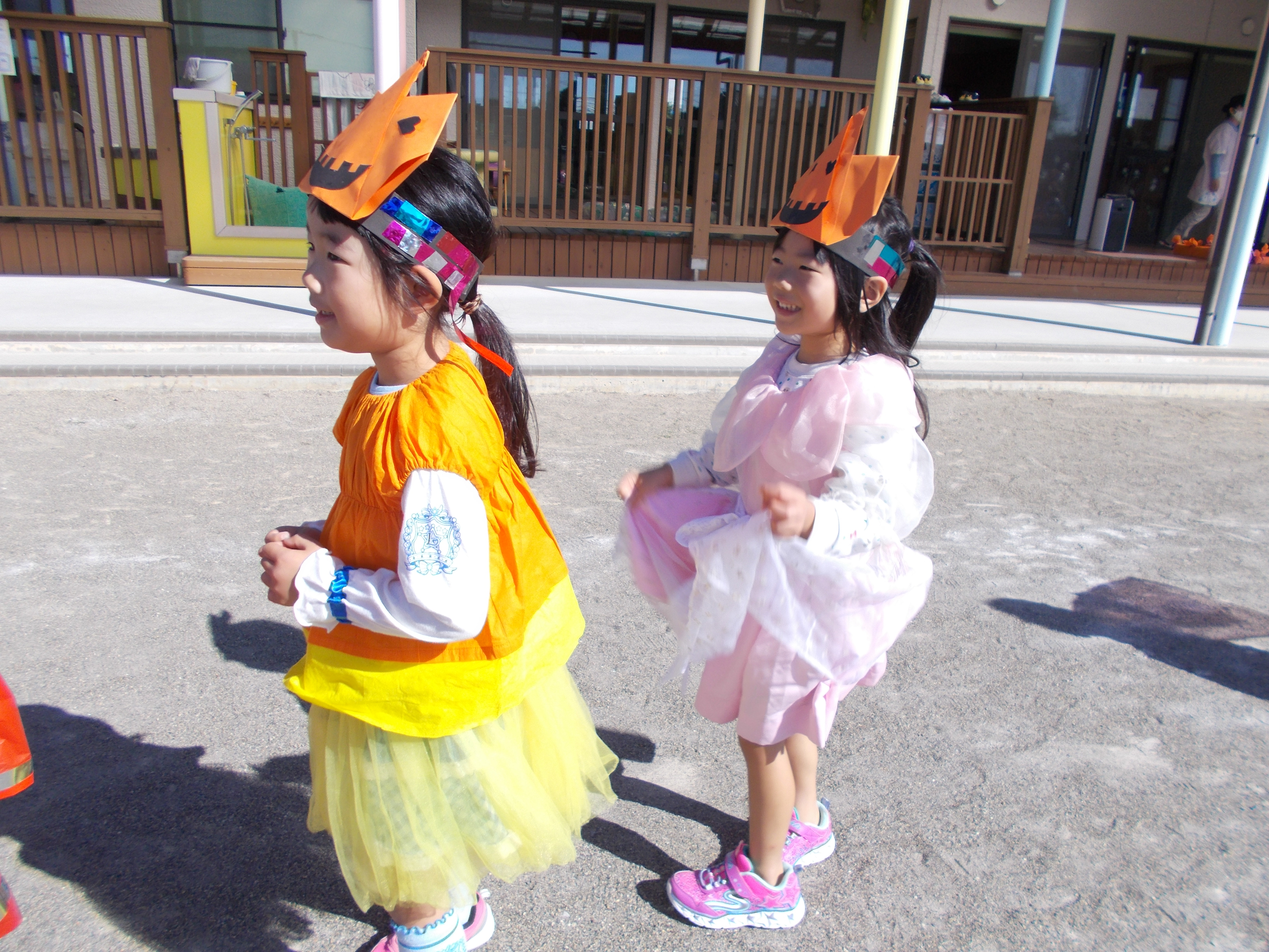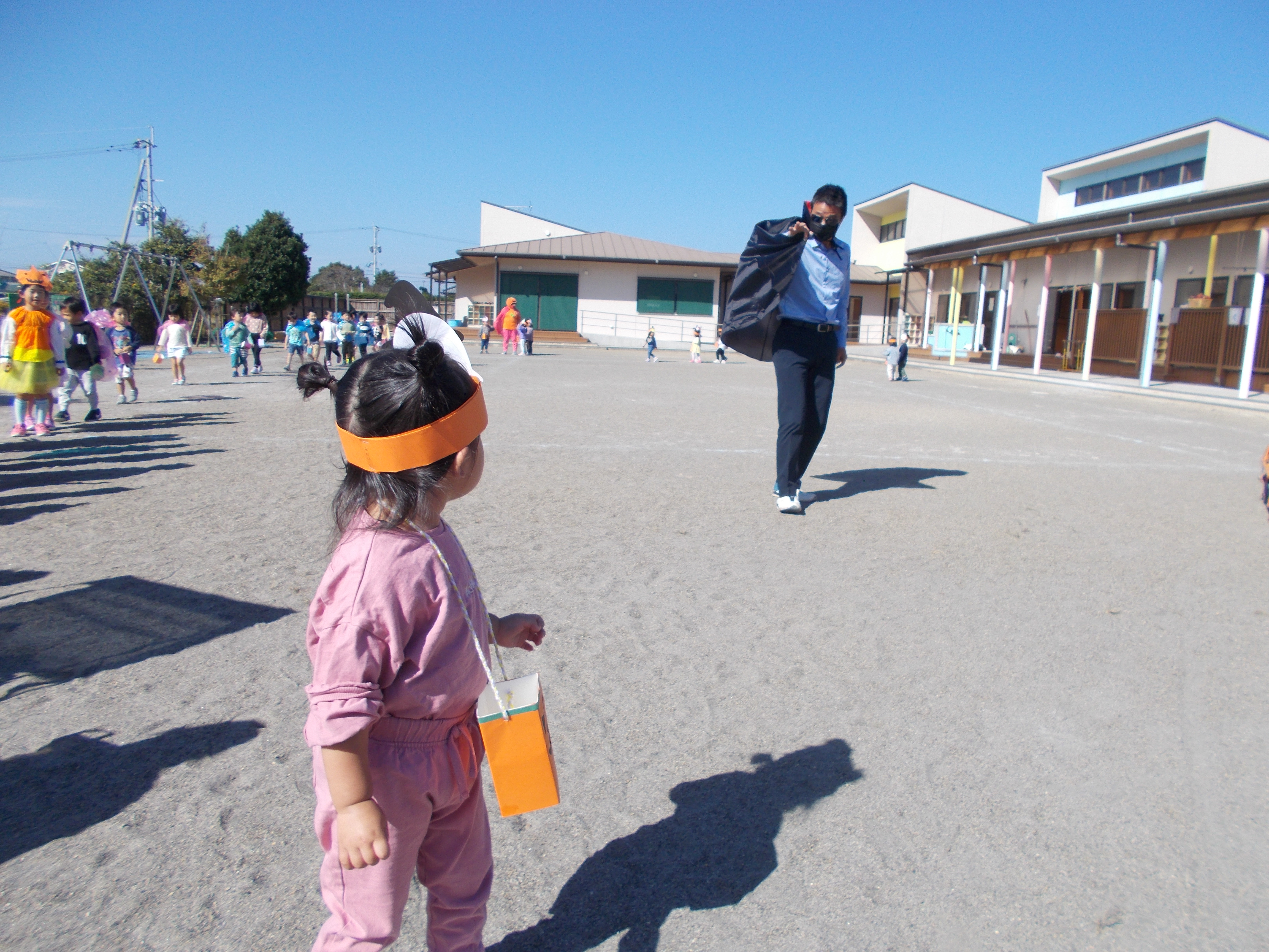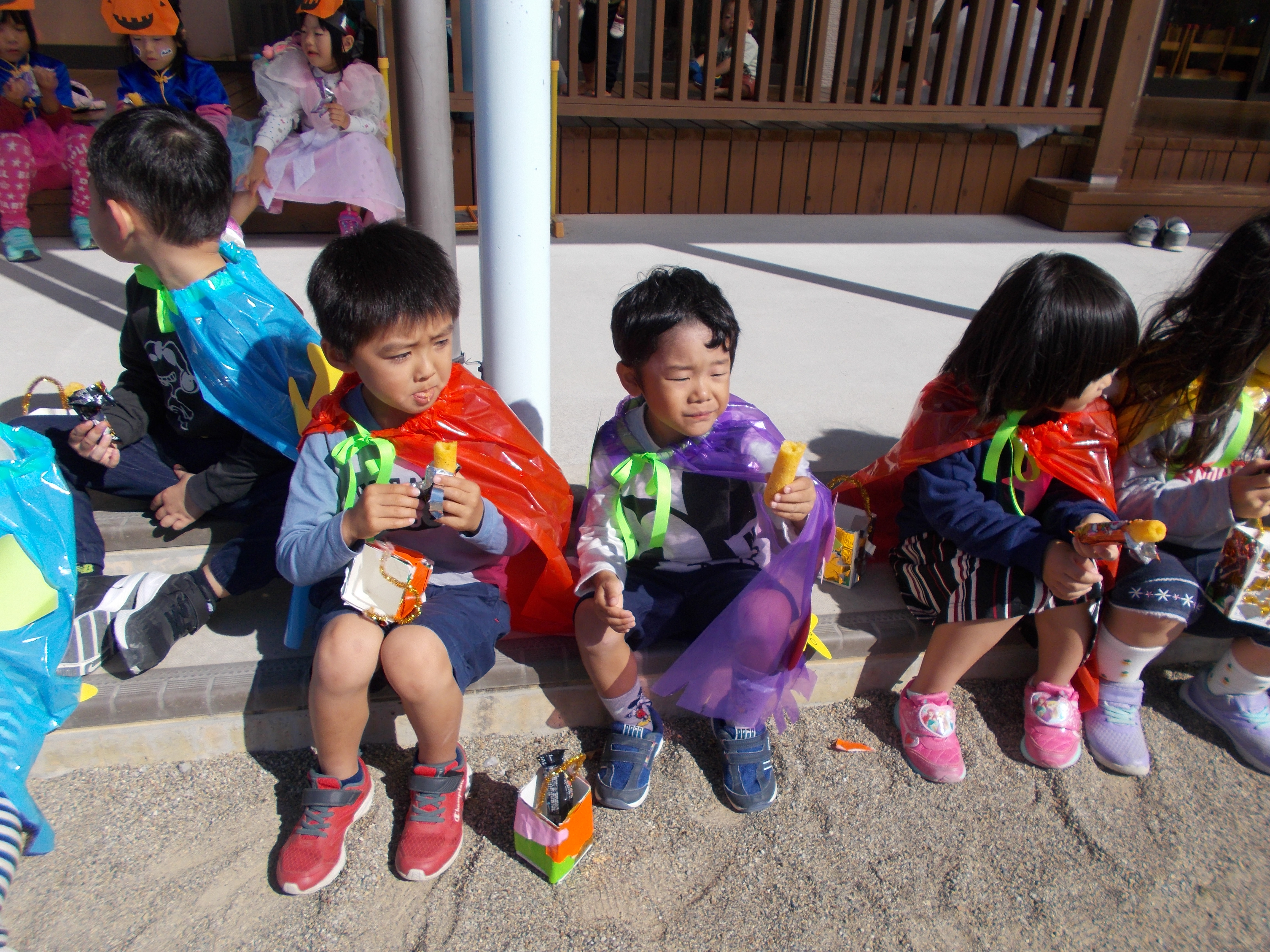 ハロウィン 10月29日(金) オバケや海賊、お姫様の仮装をしてハロウィンパレードを楽しみました。 途中、「トリックオアトリート」の言葉を聞くと、お菓子をくれる優しいドラキュラ伯爵も登場! もらったお菓子を皆で食べて、楽しい時間を過ごしました。