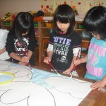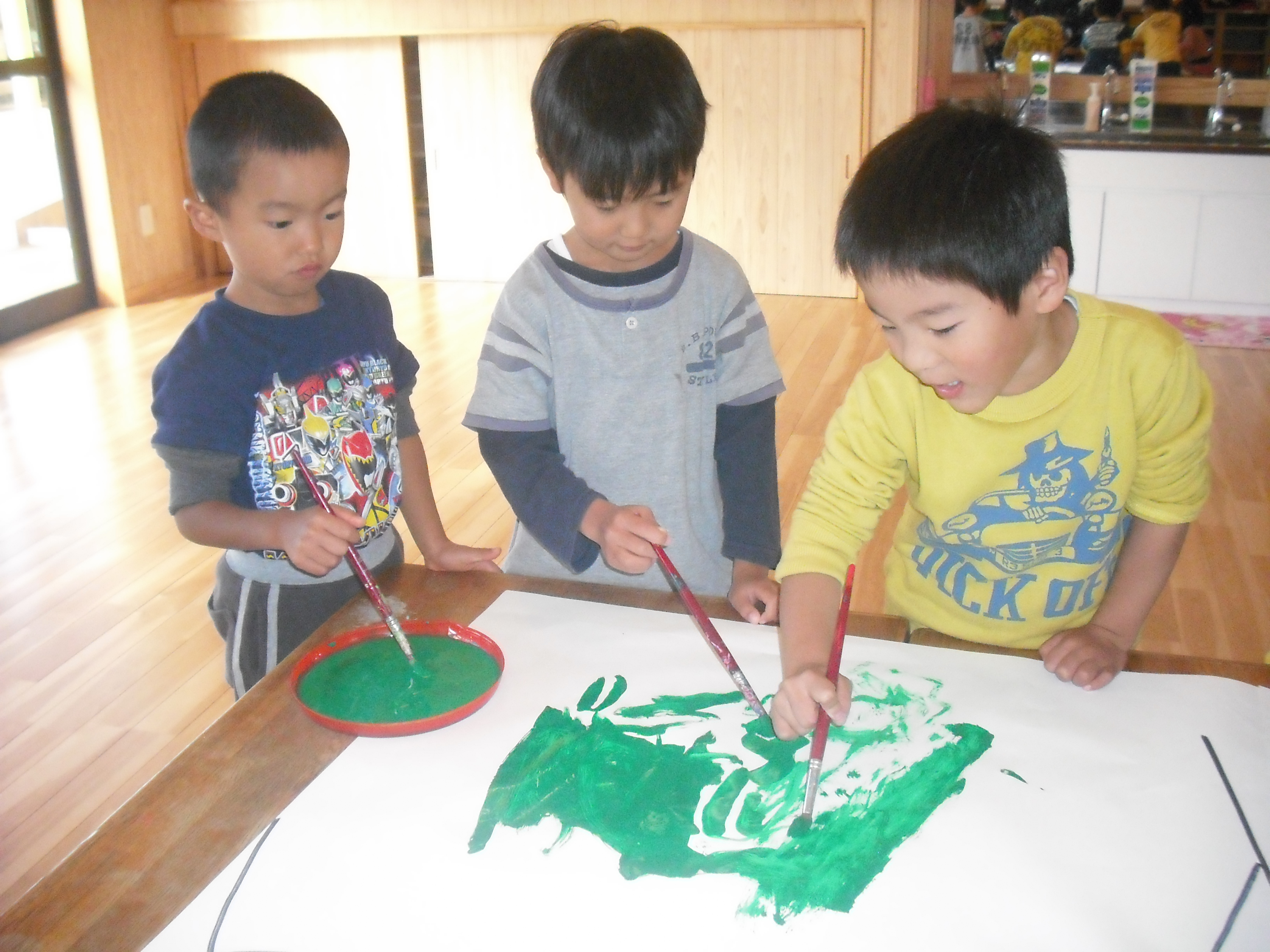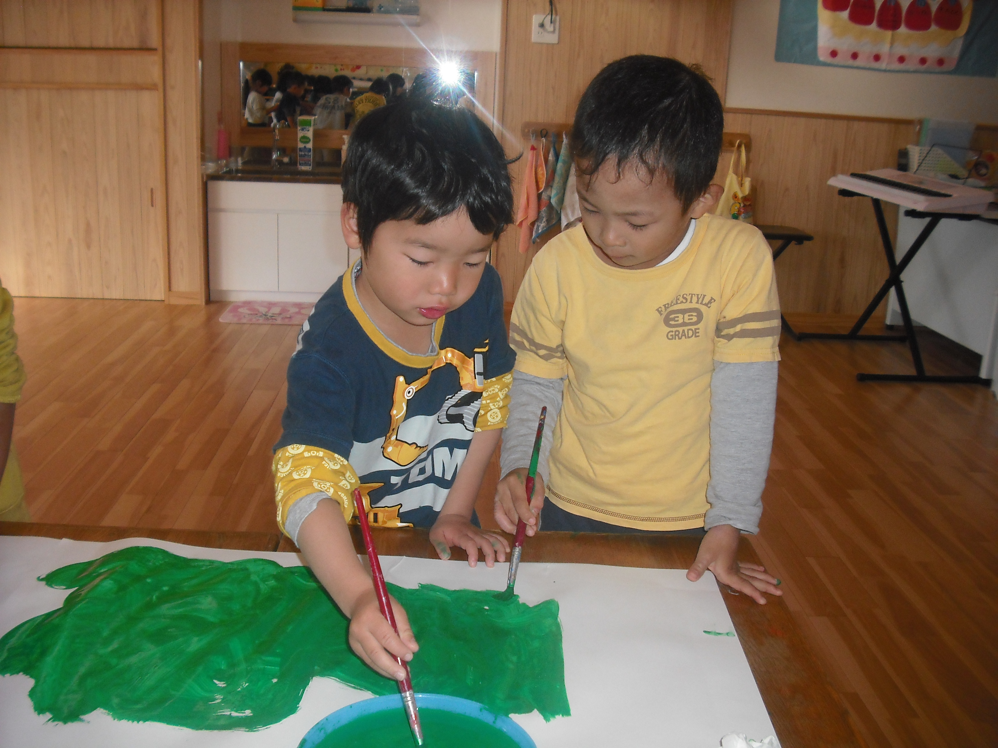 ぞう組さんが、大きな模造紙に色塗りをしています。