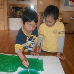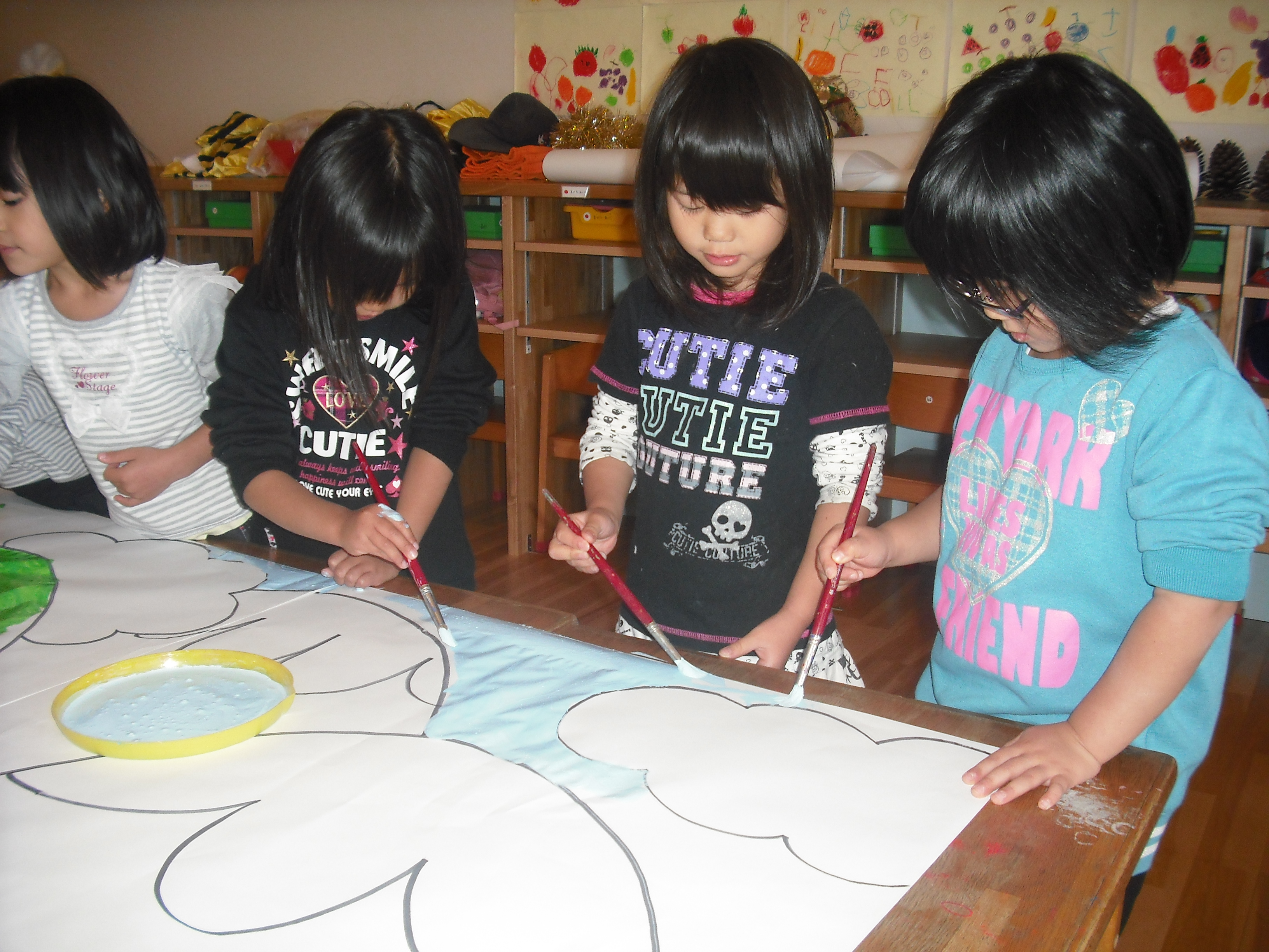 『これは雲かな?』 『ここは山だよ!』 発表会の背景が出来上がりました。