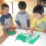緑の絵の具や水色の絵の具を使って、真剣に塗っています。