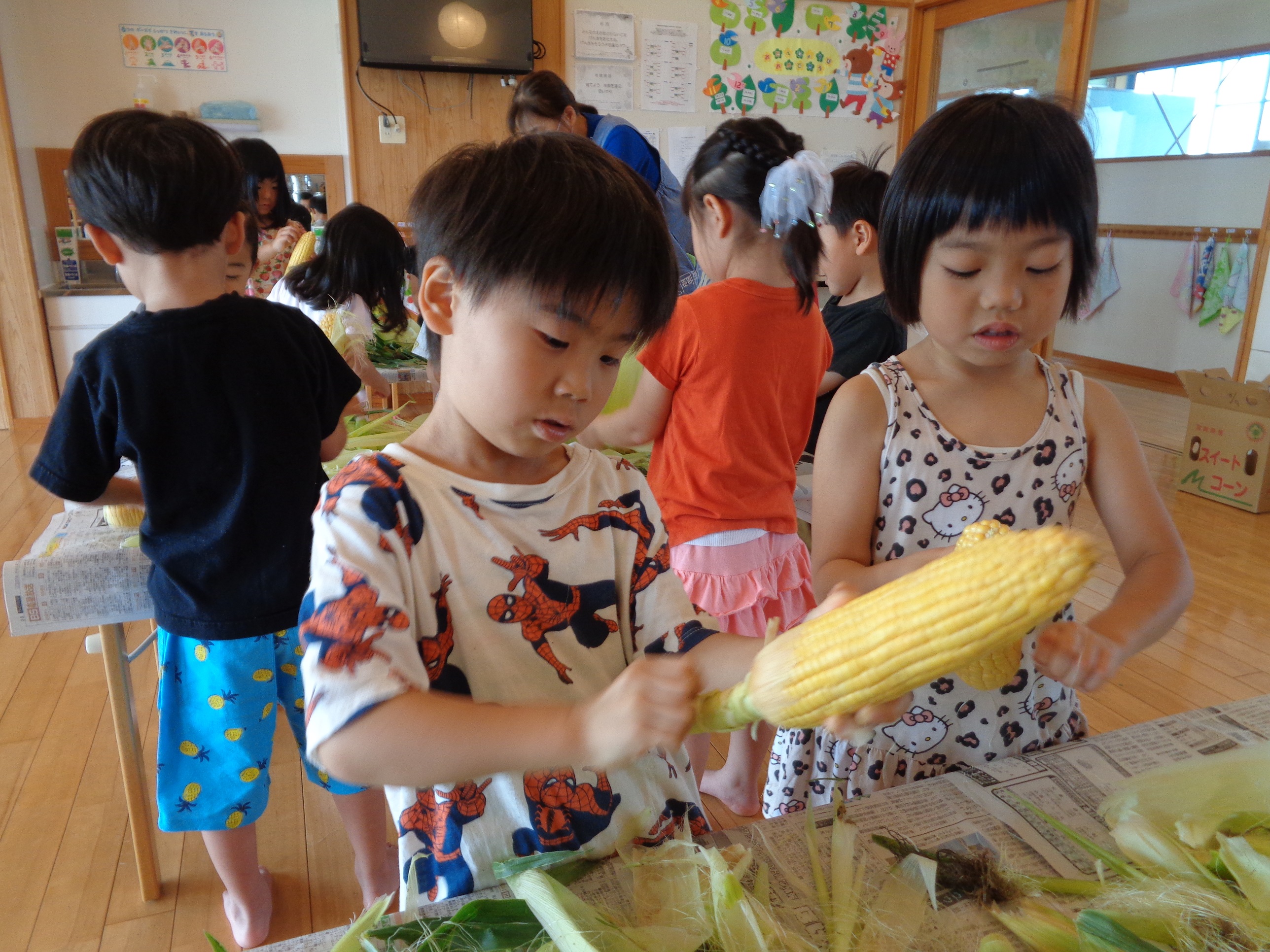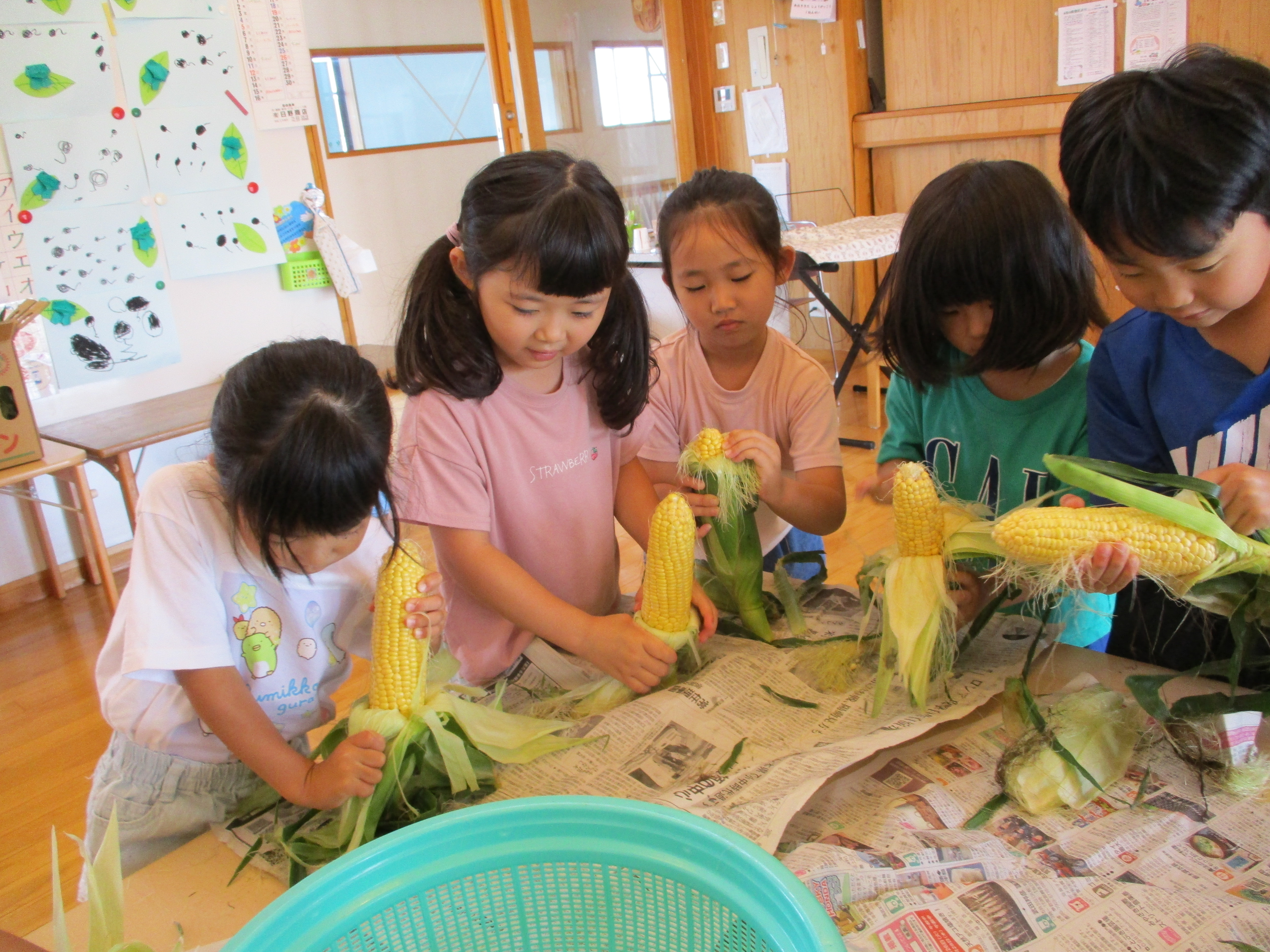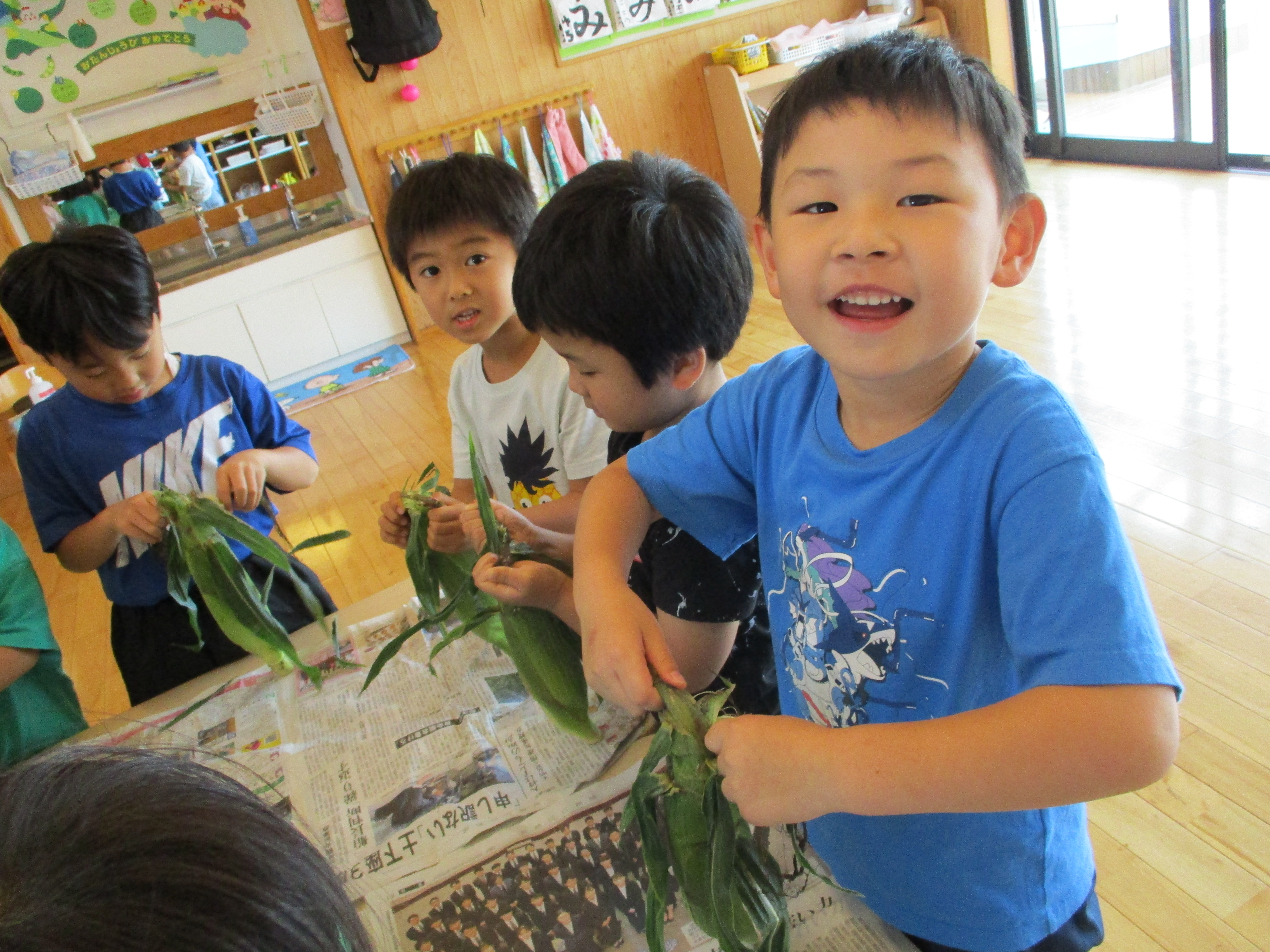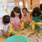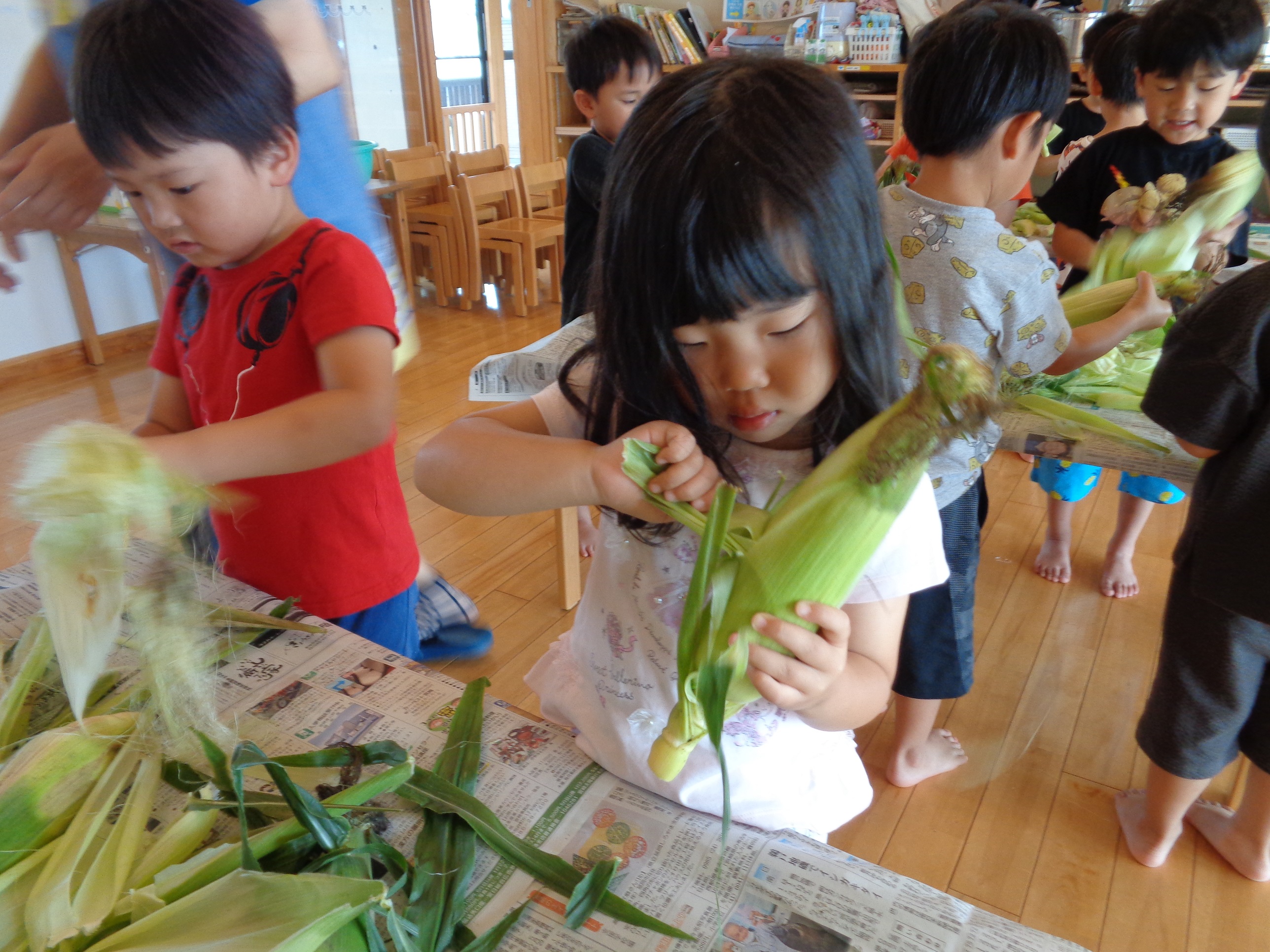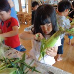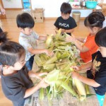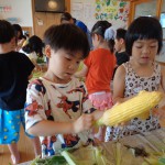 とうもろこしの皮むき 6月8日(水) とうもろこしの皮むきをしました。 新鮮な皮付きのとうもろこしから、虫がでてくると「きゃあ~虫が出てきた~」 土が少し付いていると、「わあ~土が付いてる~」と、大騒ぎしながらの皮むき体験となりました。 自分達で皮むきしたとうもろこしの味は、ほんの少し甘味が増したように感じたみたいです(*^^)v