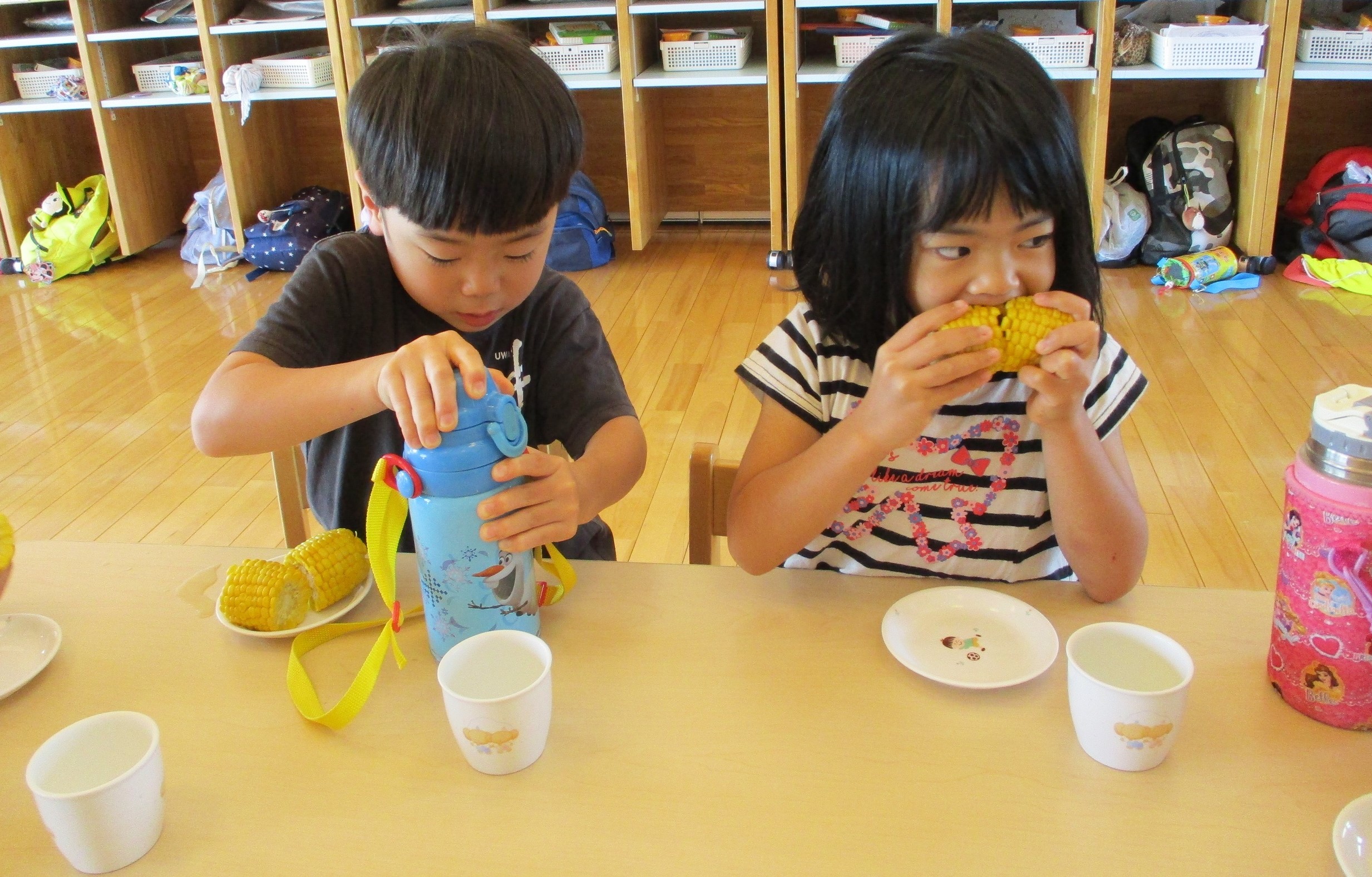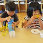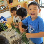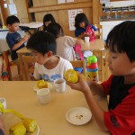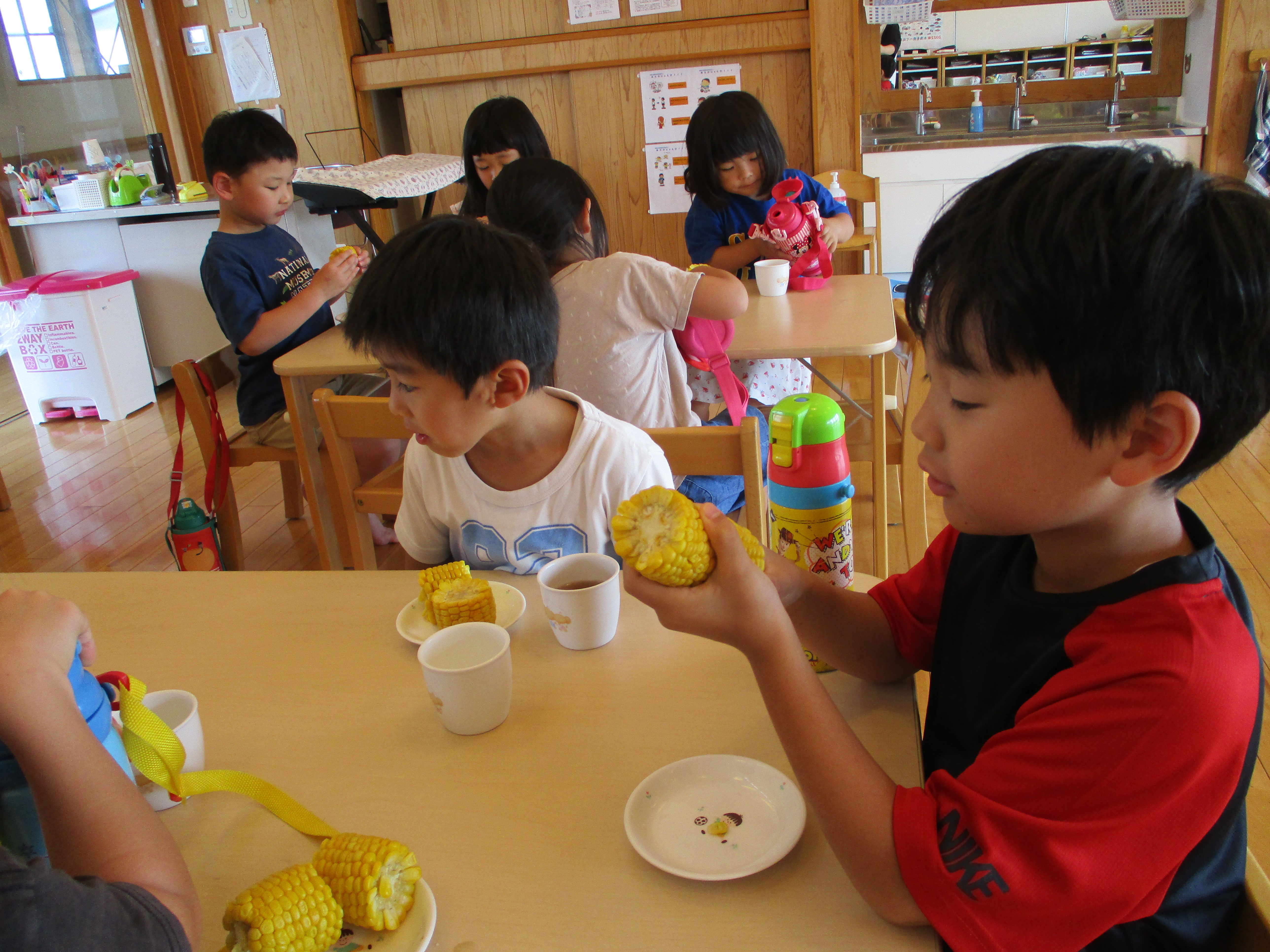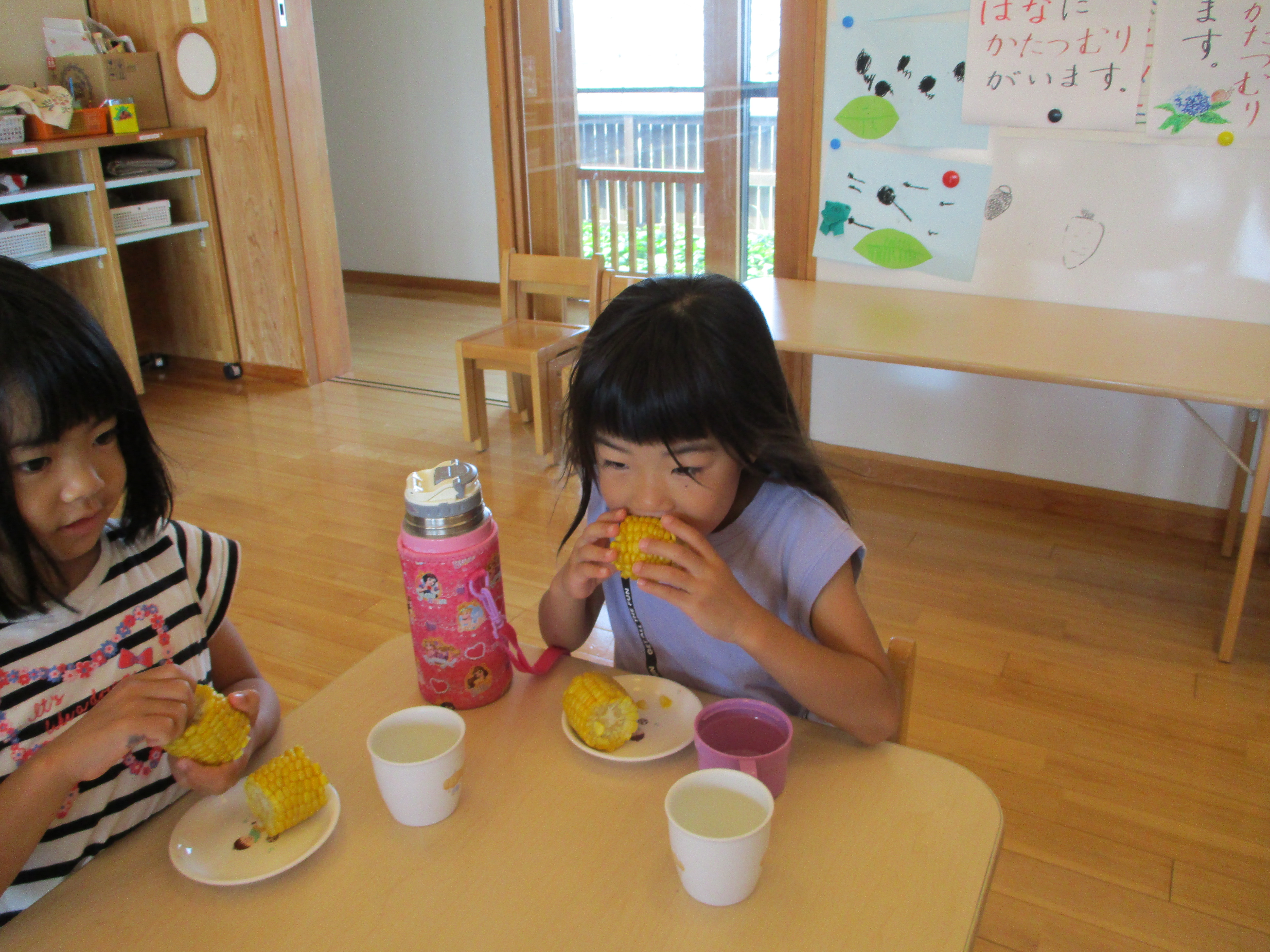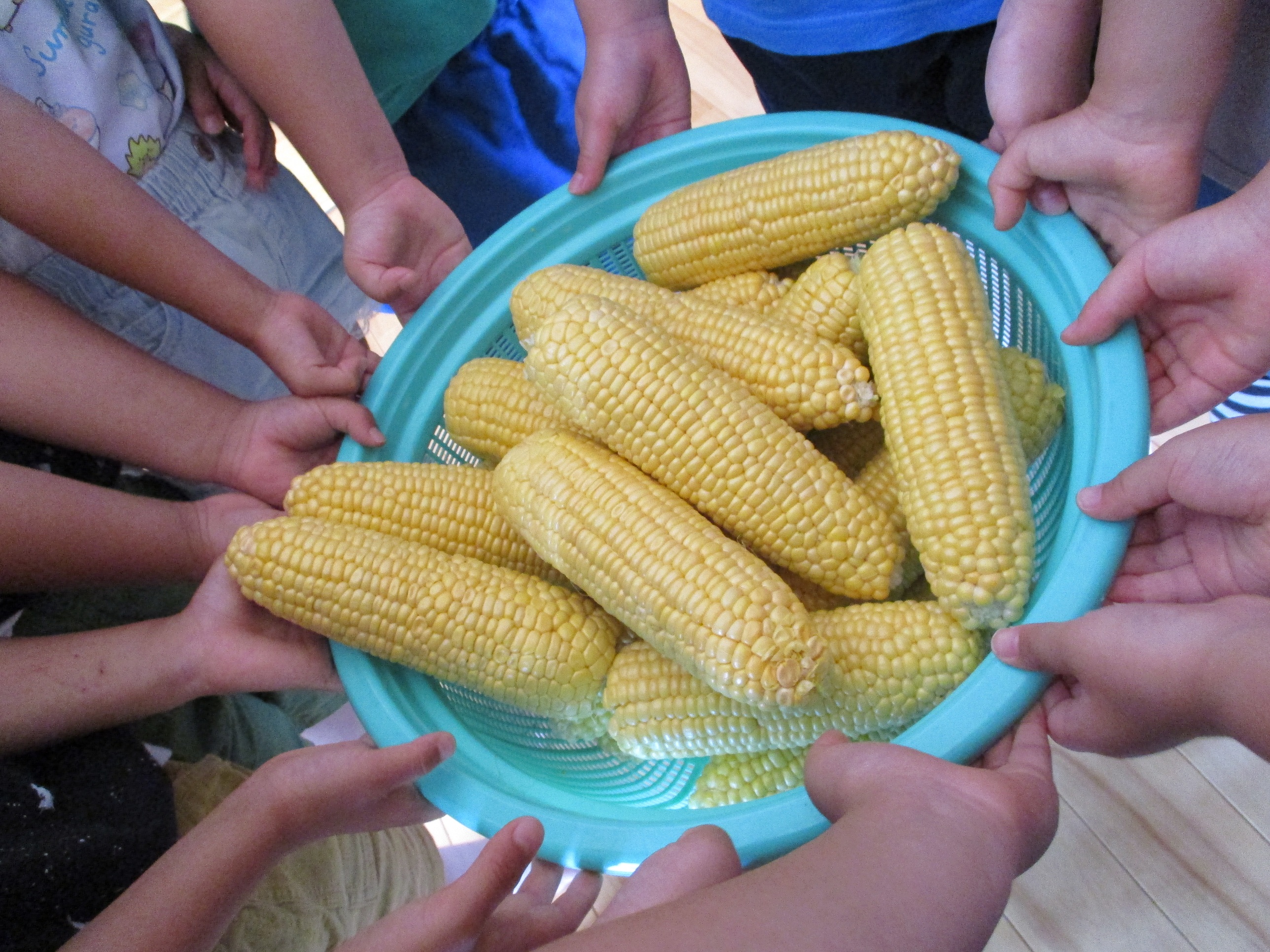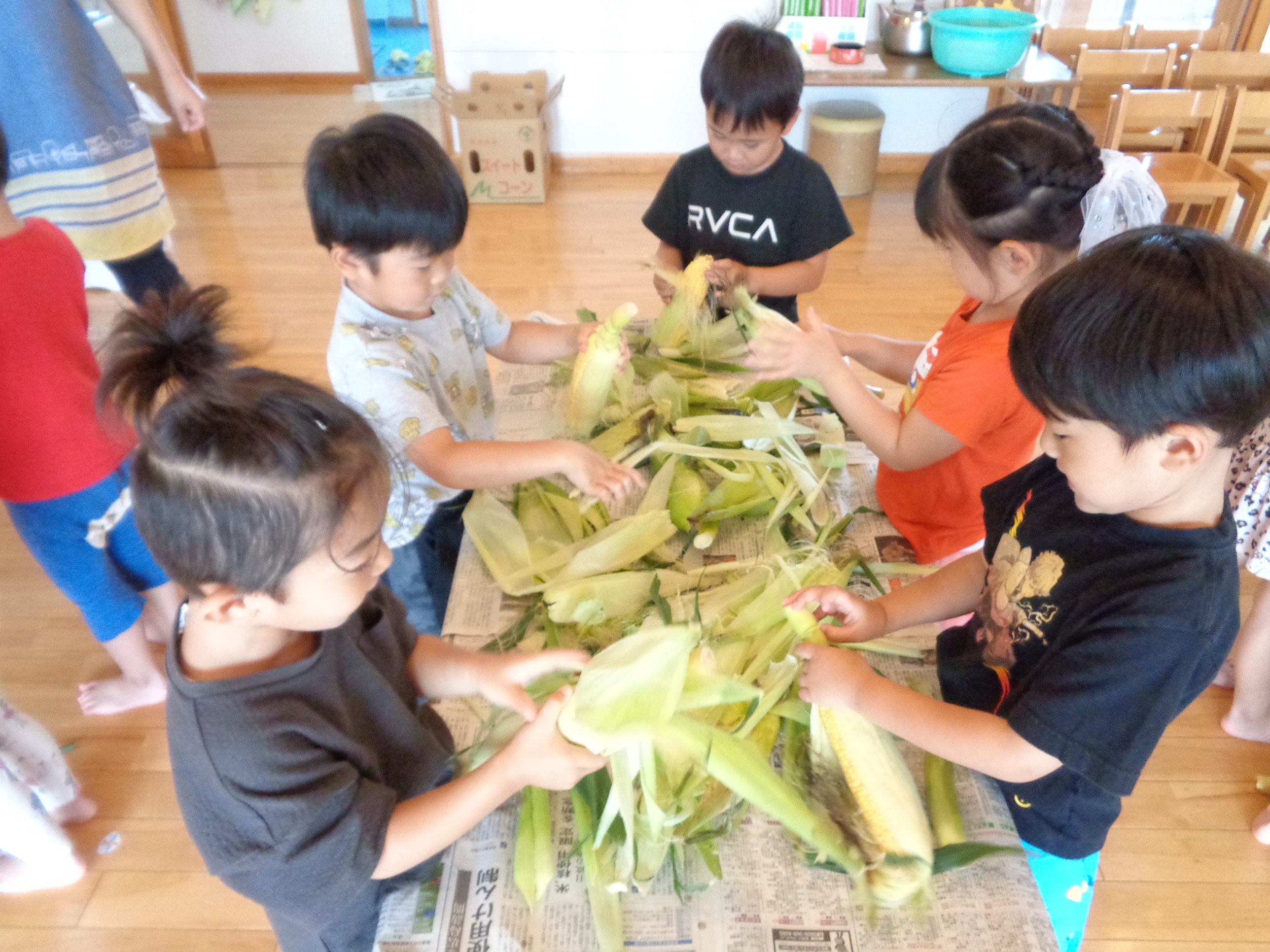 とうもろこしの皮むき 6月8日(水) とうもろこしの皮むきをしました。 新鮮な皮付きのとうもろこしから、虫がでてくると「きゃあ~虫が出てきた~」 土が少し付いていると、「わあ~土が付いてる~」と、大騒ぎしながらの皮むき体験となりました。 自分達で皮むきしたとうもろこしの味は、ほんの少し甘味が増したように感じたみたいです(*^^)v