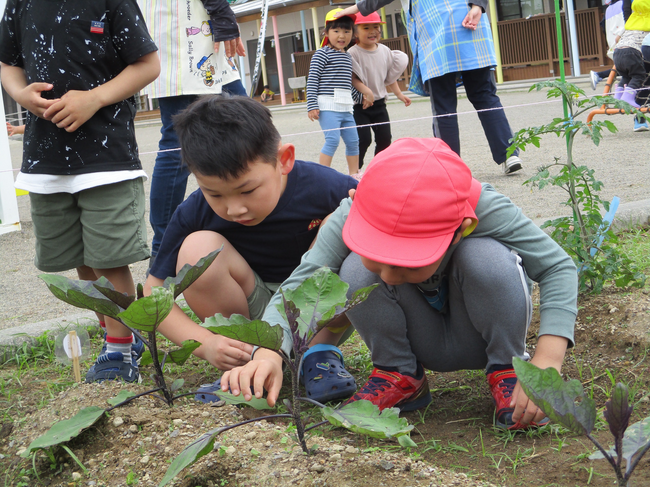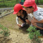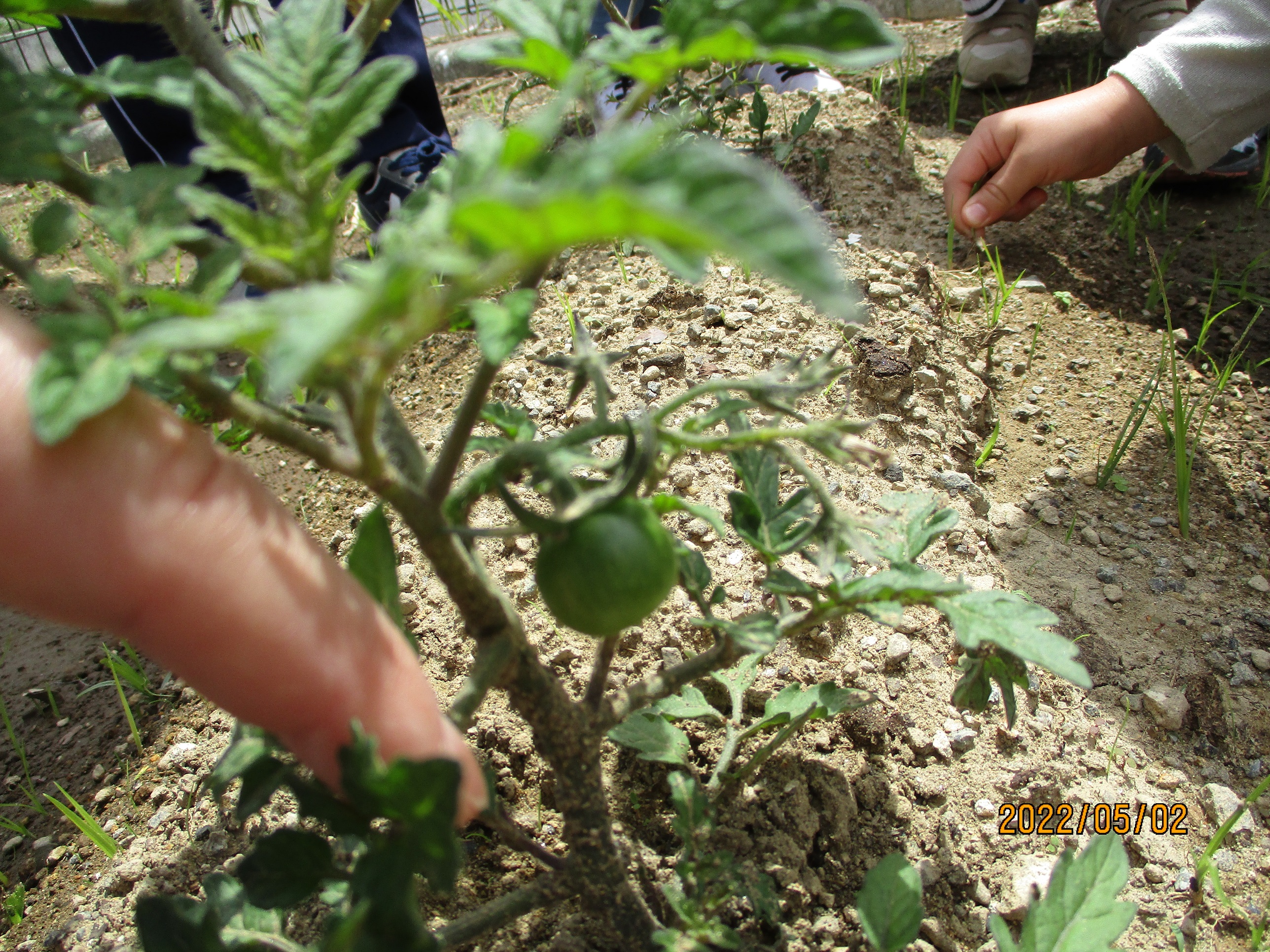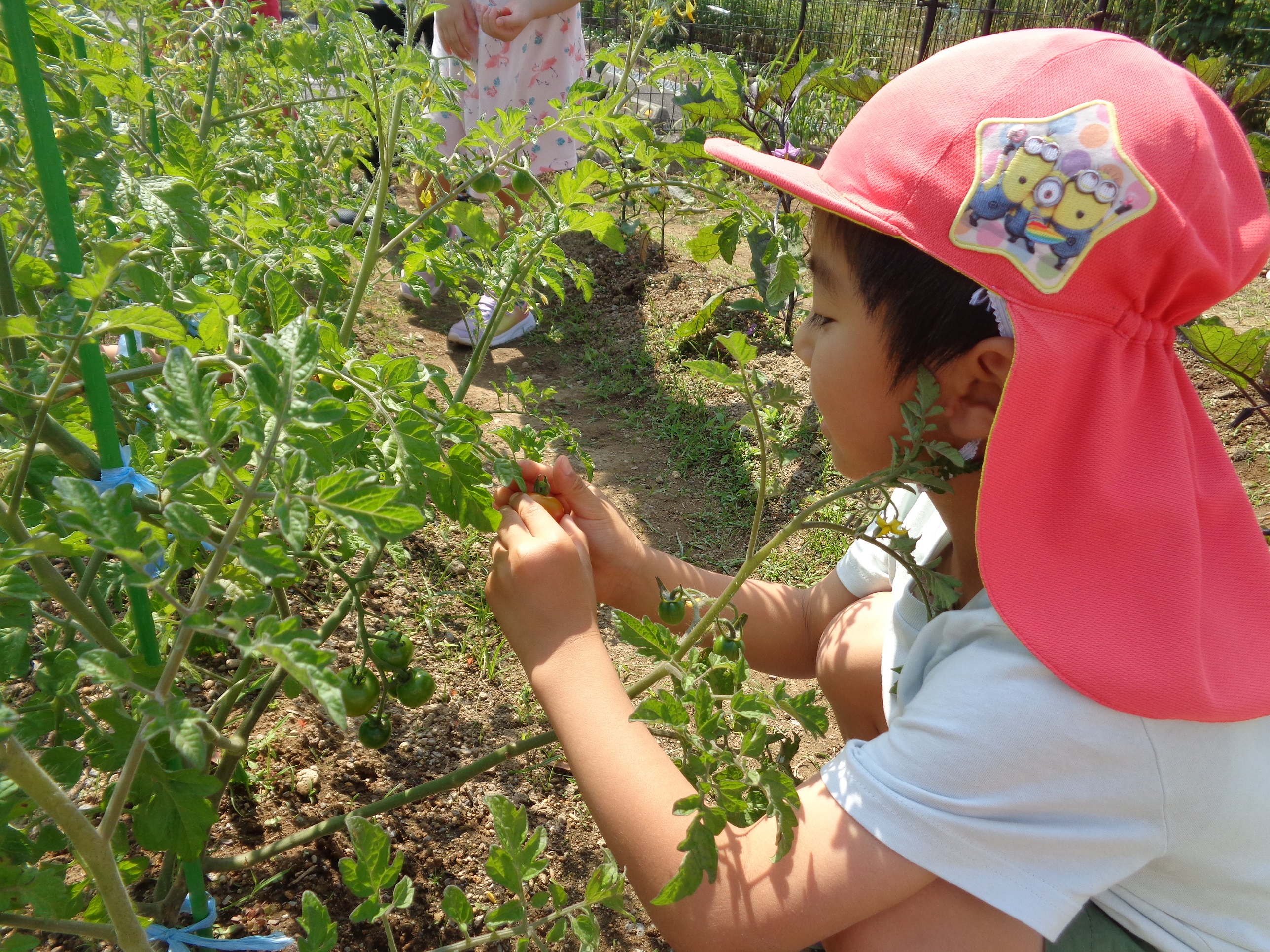 ふと顔をあげると、かわいいミニトマトが…思わず「わあ~」と歓声をあげながらなでていました。たくさんの野菜が育ちますように。