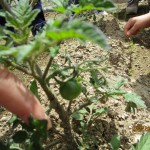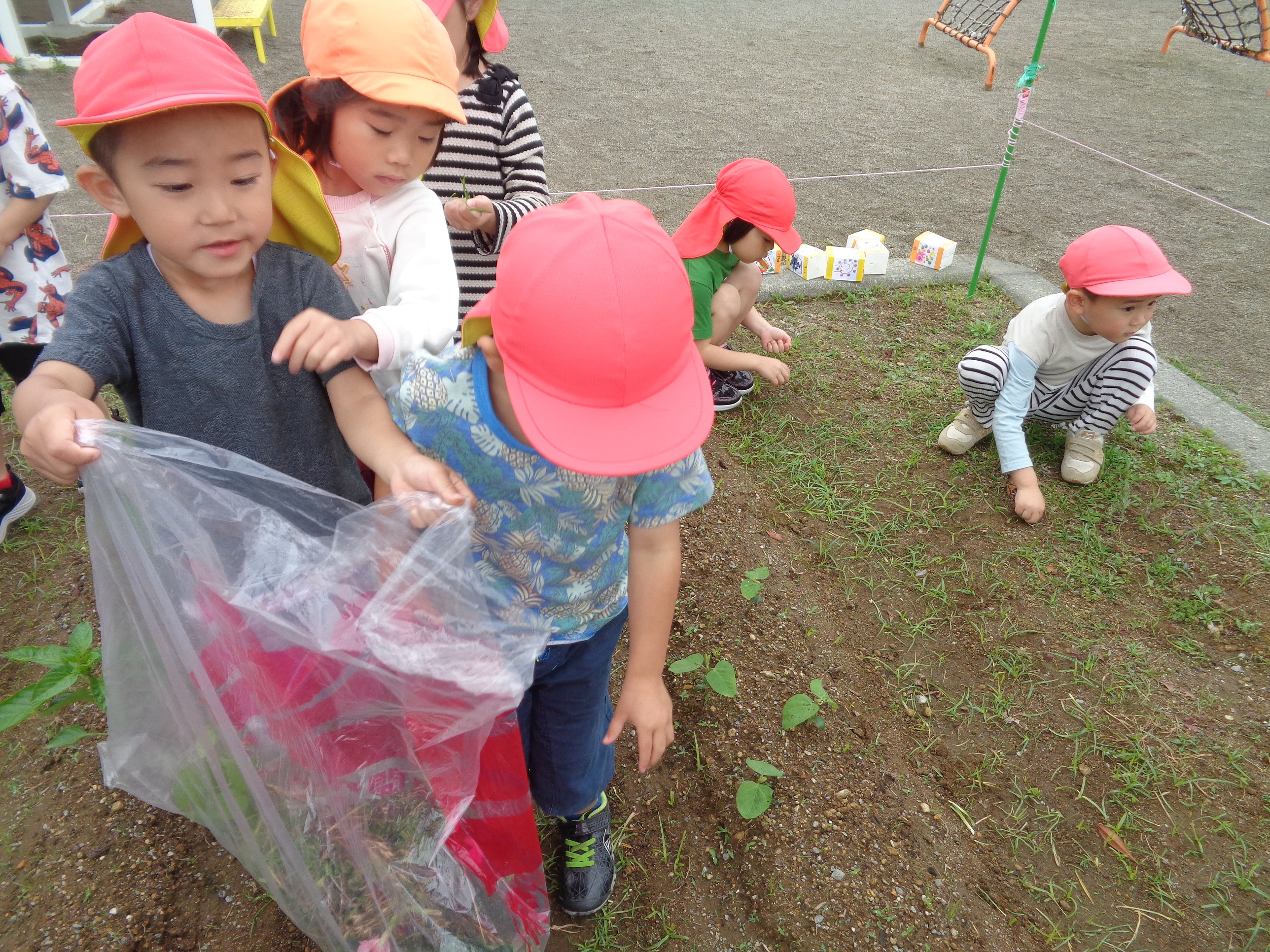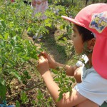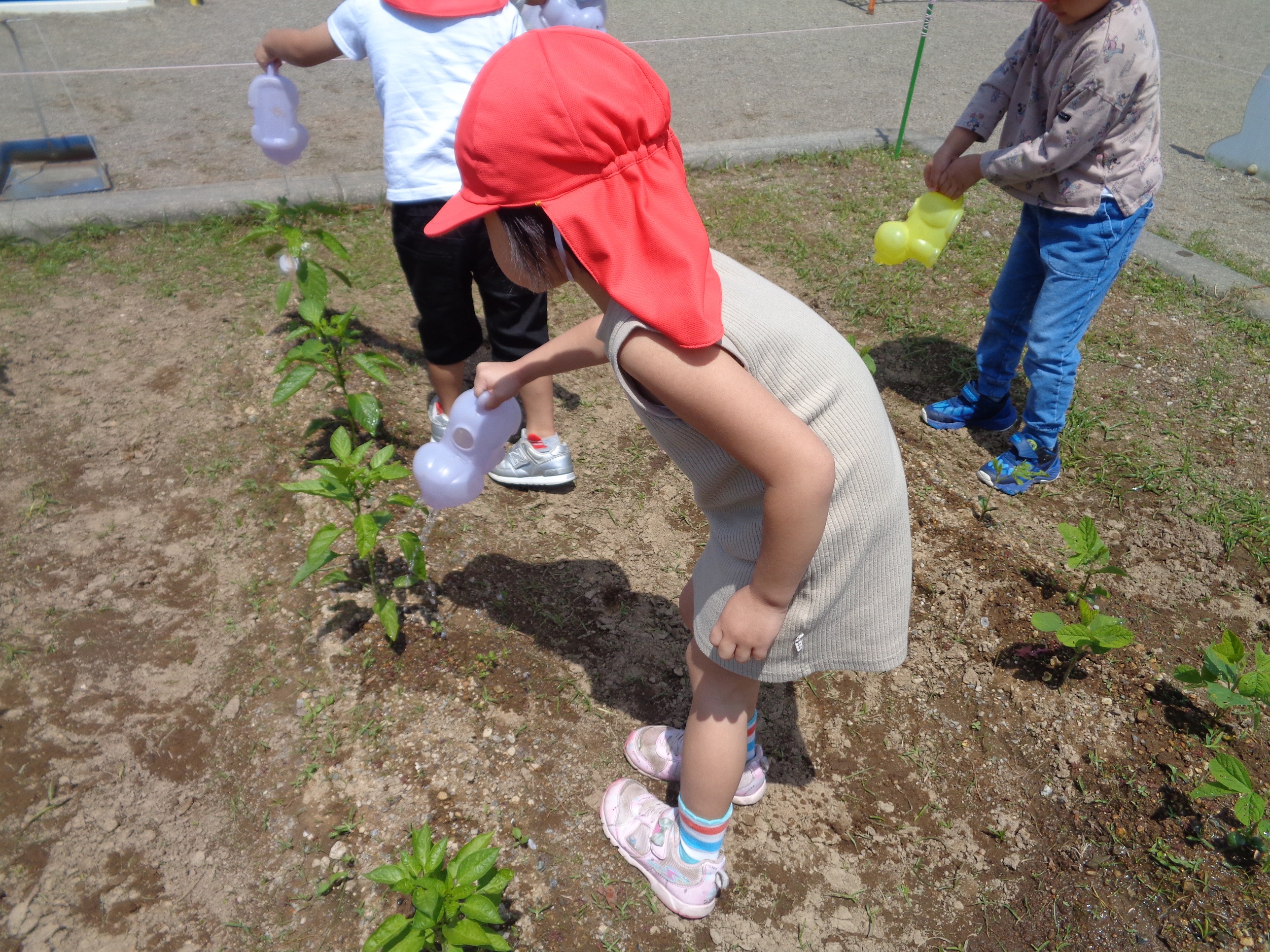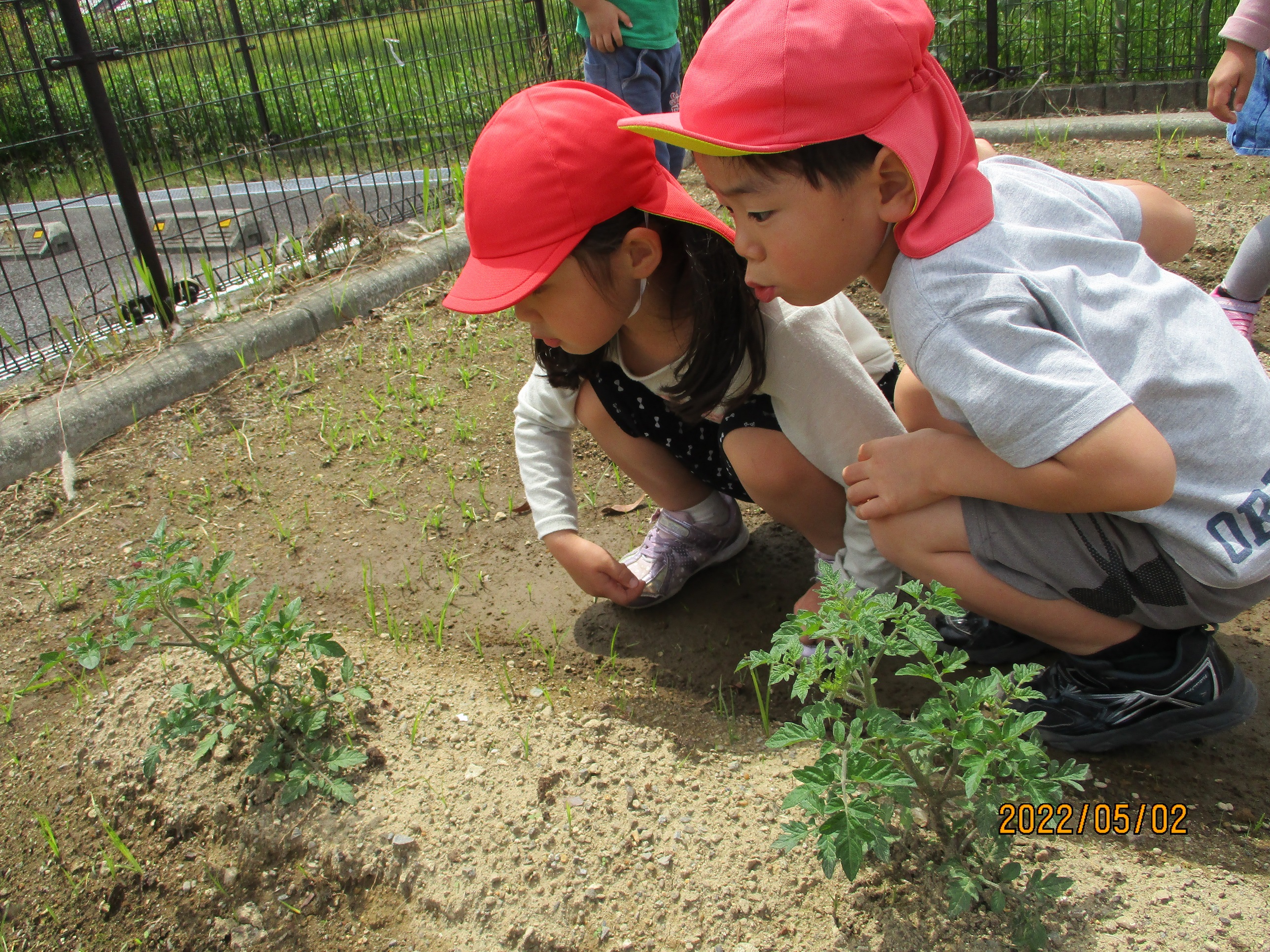 ふと顔をあげると、かわいいミニトマトが…思わず「わあ~」と歓声をあげながらなでていました。たくさんの野菜が育ちますように。