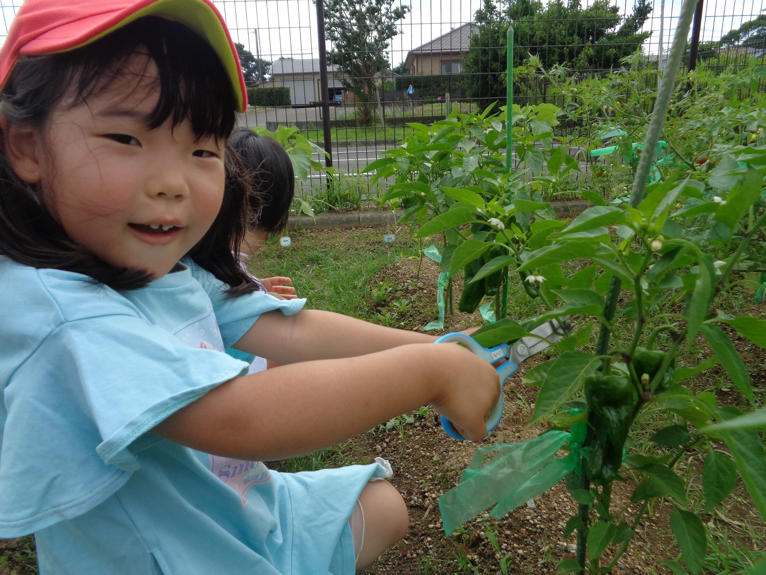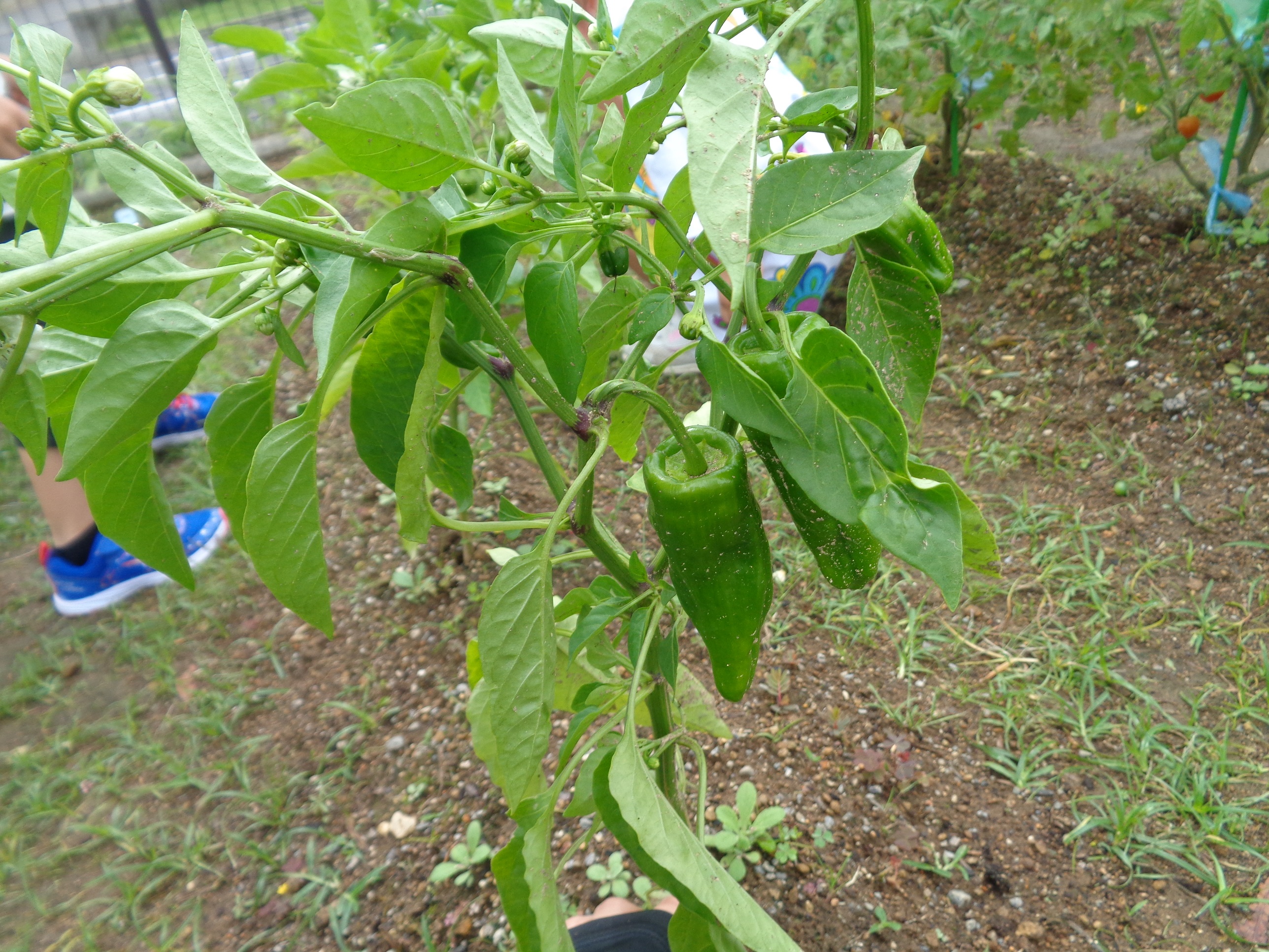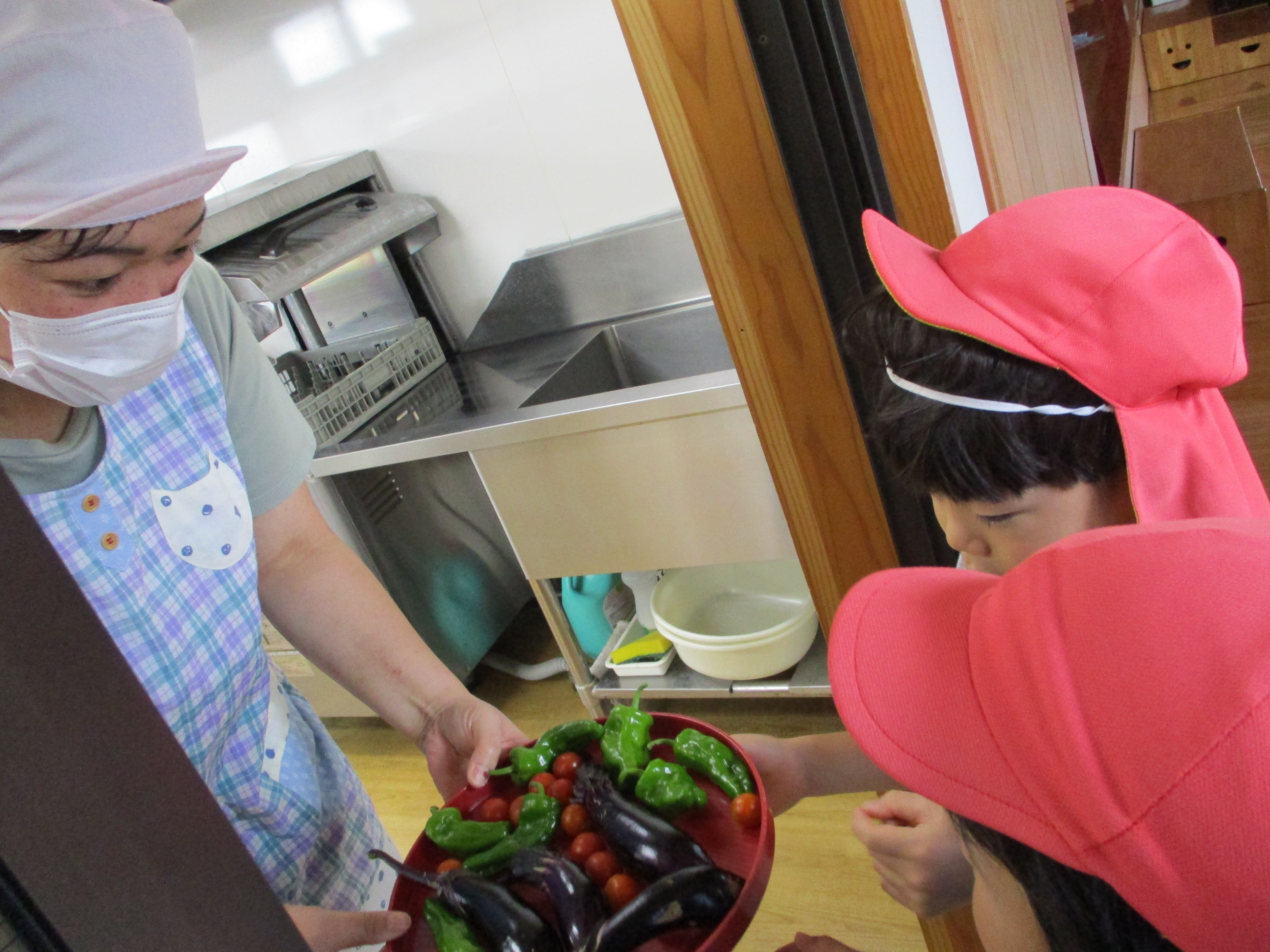 食育(収穫) 6月~7月にかけて次々と実った保育園の野菜を収穫しました。 給食室に届けると、給食先生も立派な野菜にビックリ!早速給食で出してくれました。 野菜が苦手な子どもも保育園で出来た野菜だと知ると、パクリと食べて「おいしい」と、言ってくれました。 野菜の成長を知ることで、子ども達がどんどん野菜好きになってくれたらいいな~♪