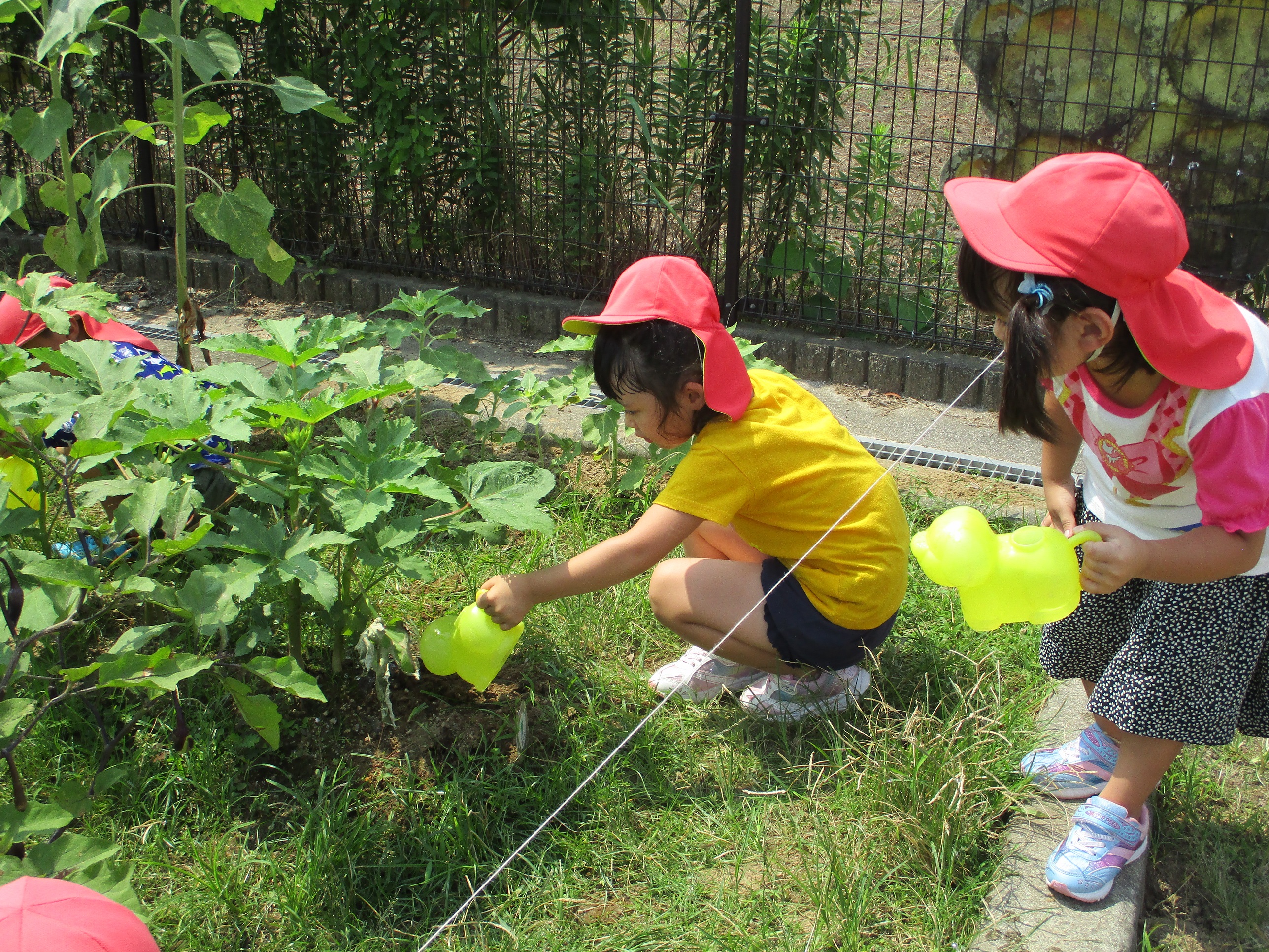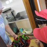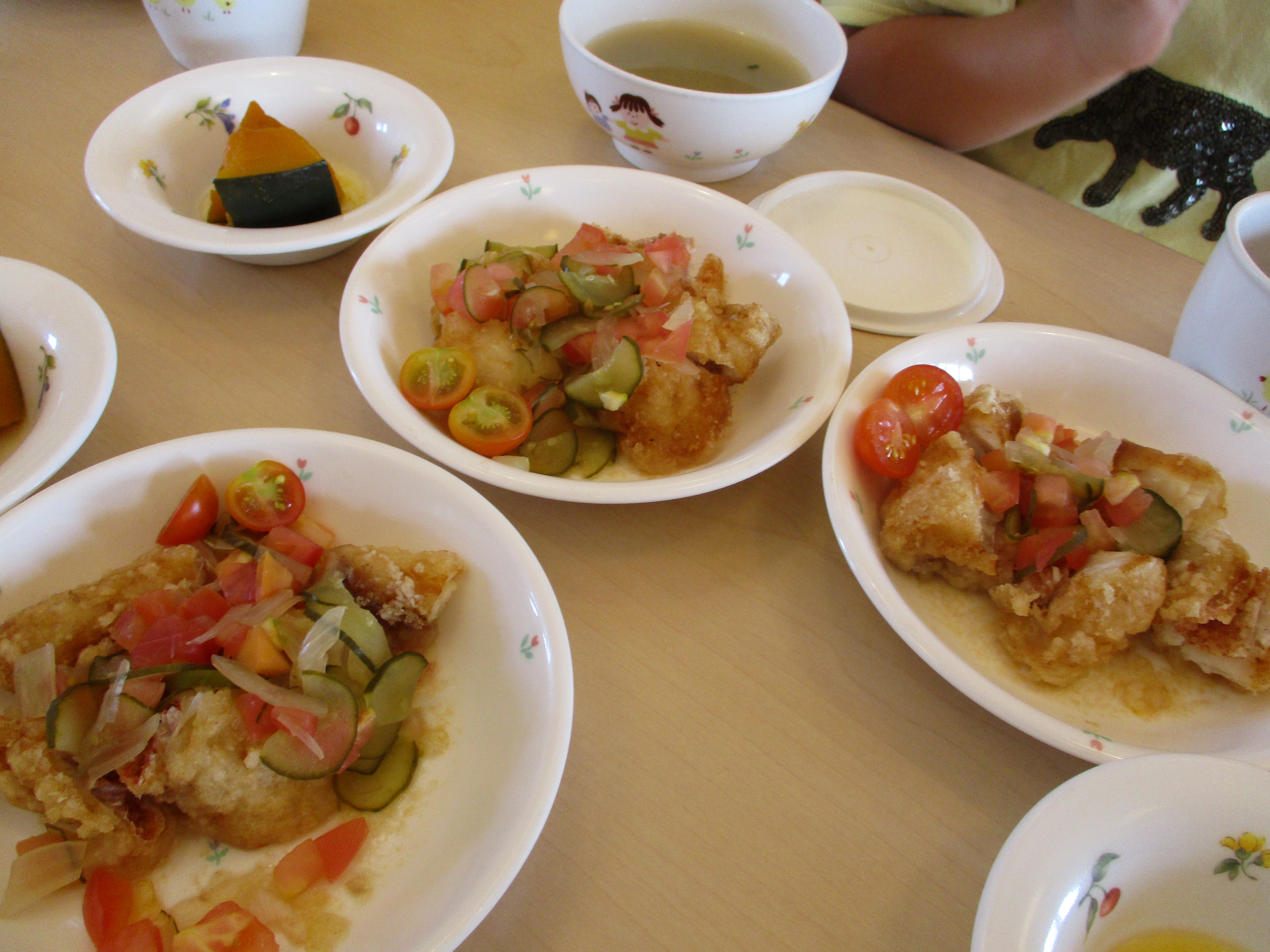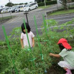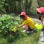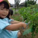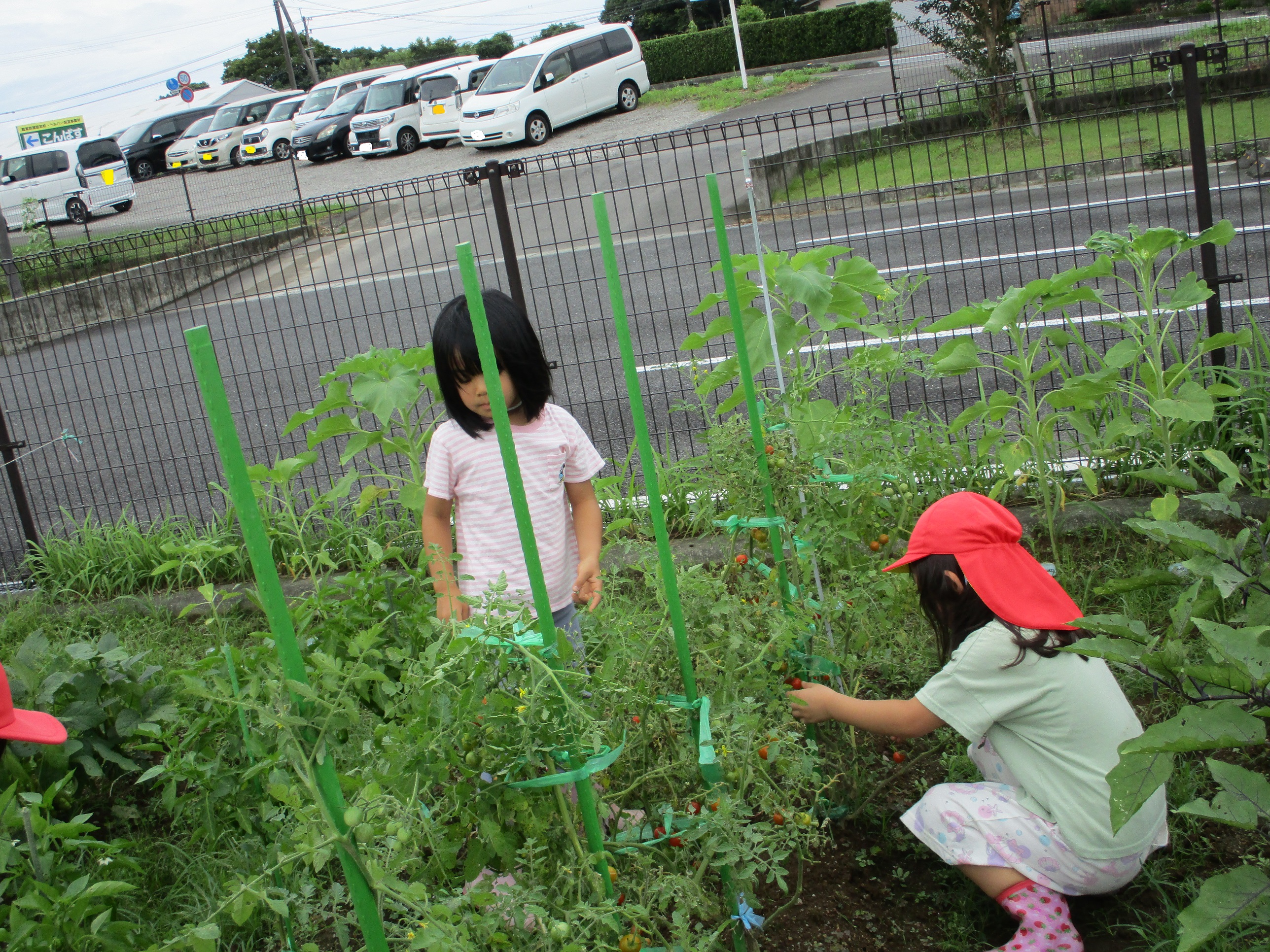 食育(収穫) 6月~7月にかけて次々と実った保育園の野菜を収穫しました。 給食室に届けると、給食先生も立派な野菜にビックリ!早速給食で出してくれました。 野菜が苦手な子どもも保育園で出来た野菜だと知ると、パクリと食べて「おいしい」と、言ってくれました。 野菜の成長を知ることで、子ども達がどんどん野菜好きになってくれたらいいな~♪