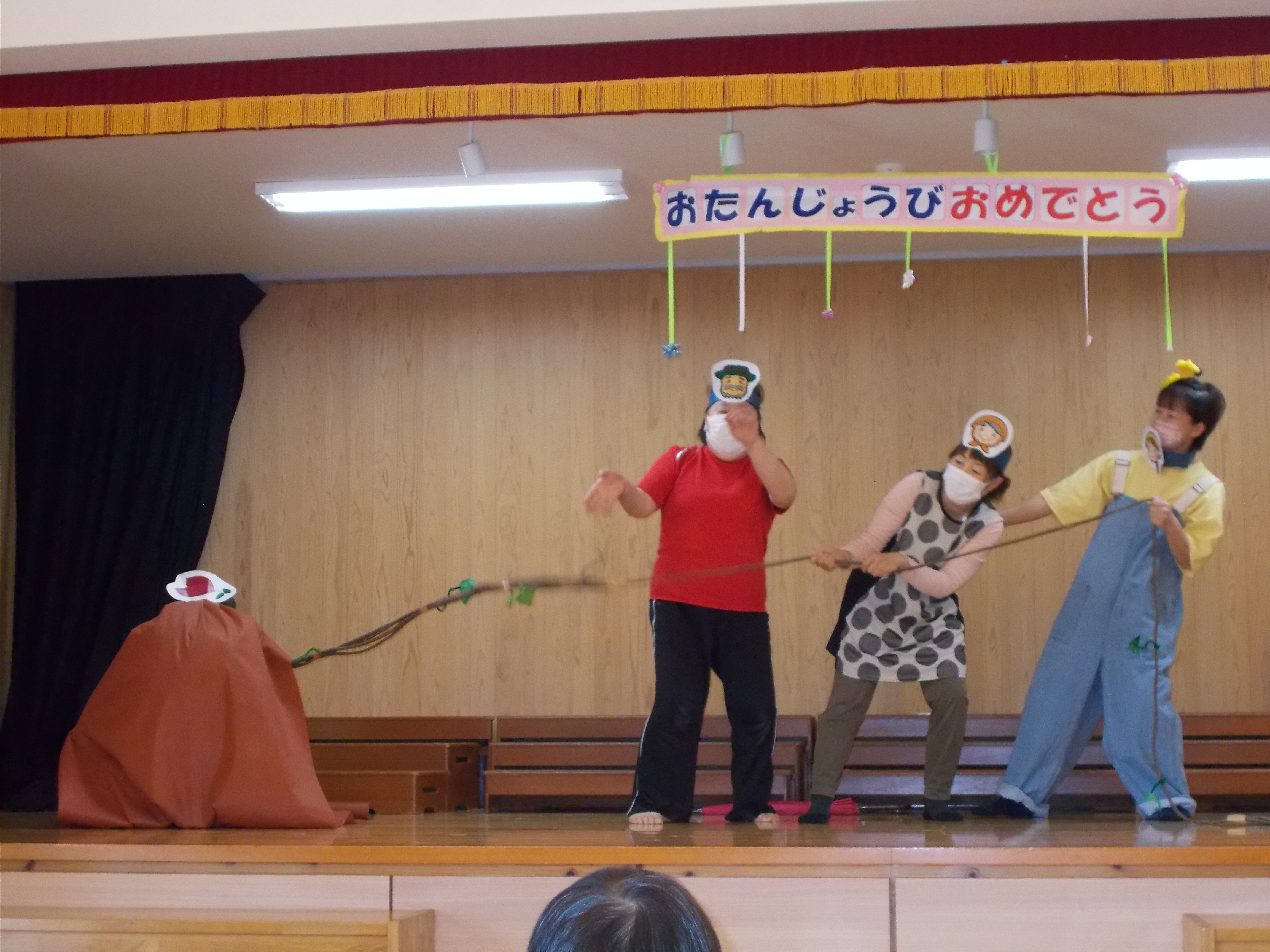 9月 誕生会 9月21日(水) 9月の誕生会でした。 9月の誕生者は、なんと10名! ステージの上は、とても賑やかでした。 職員の出し物は、『大きなお芋』の劇でした。皆で力を合わせてやっと抜けた大きなお芋のように力強く成長しますように。