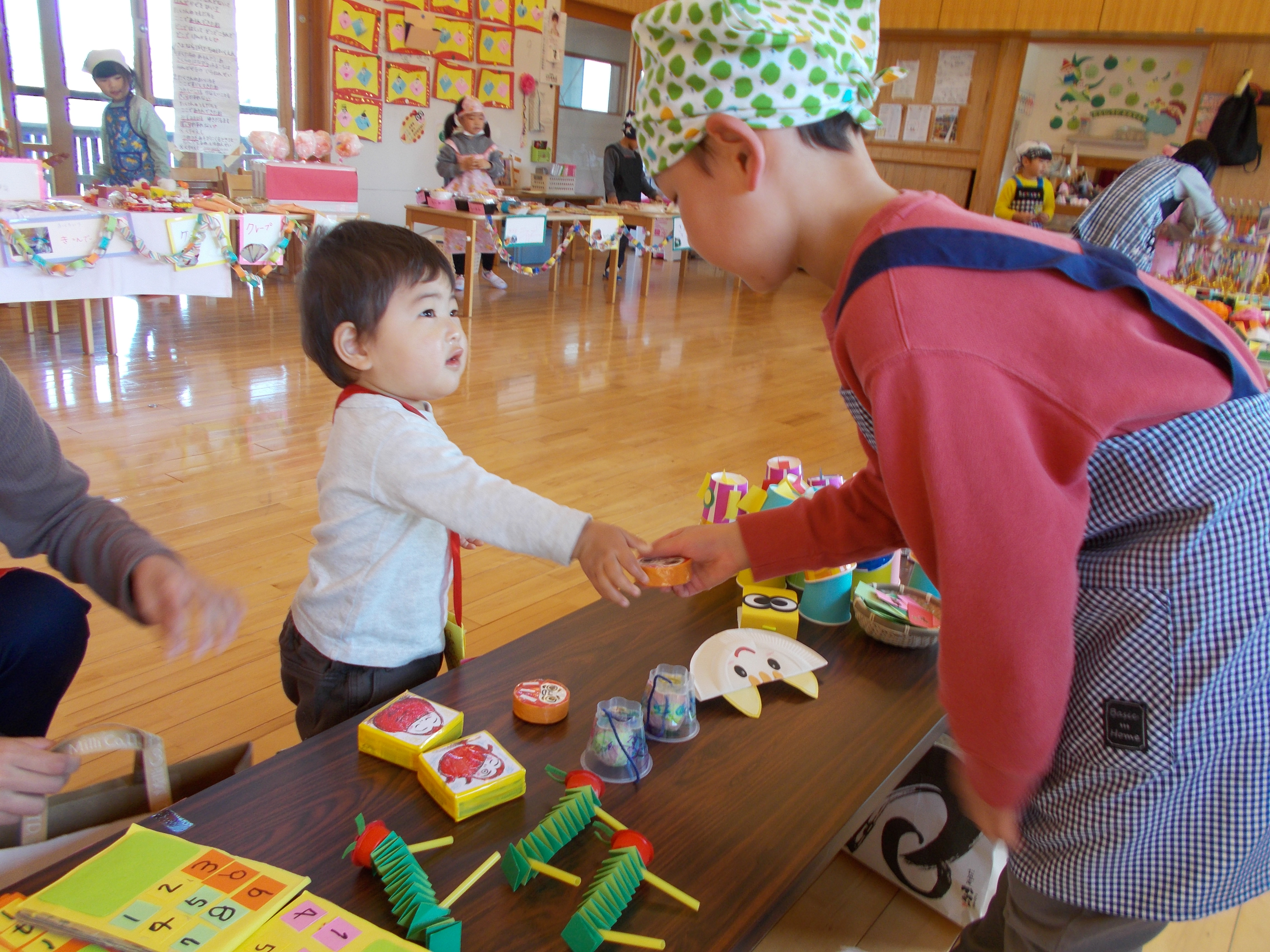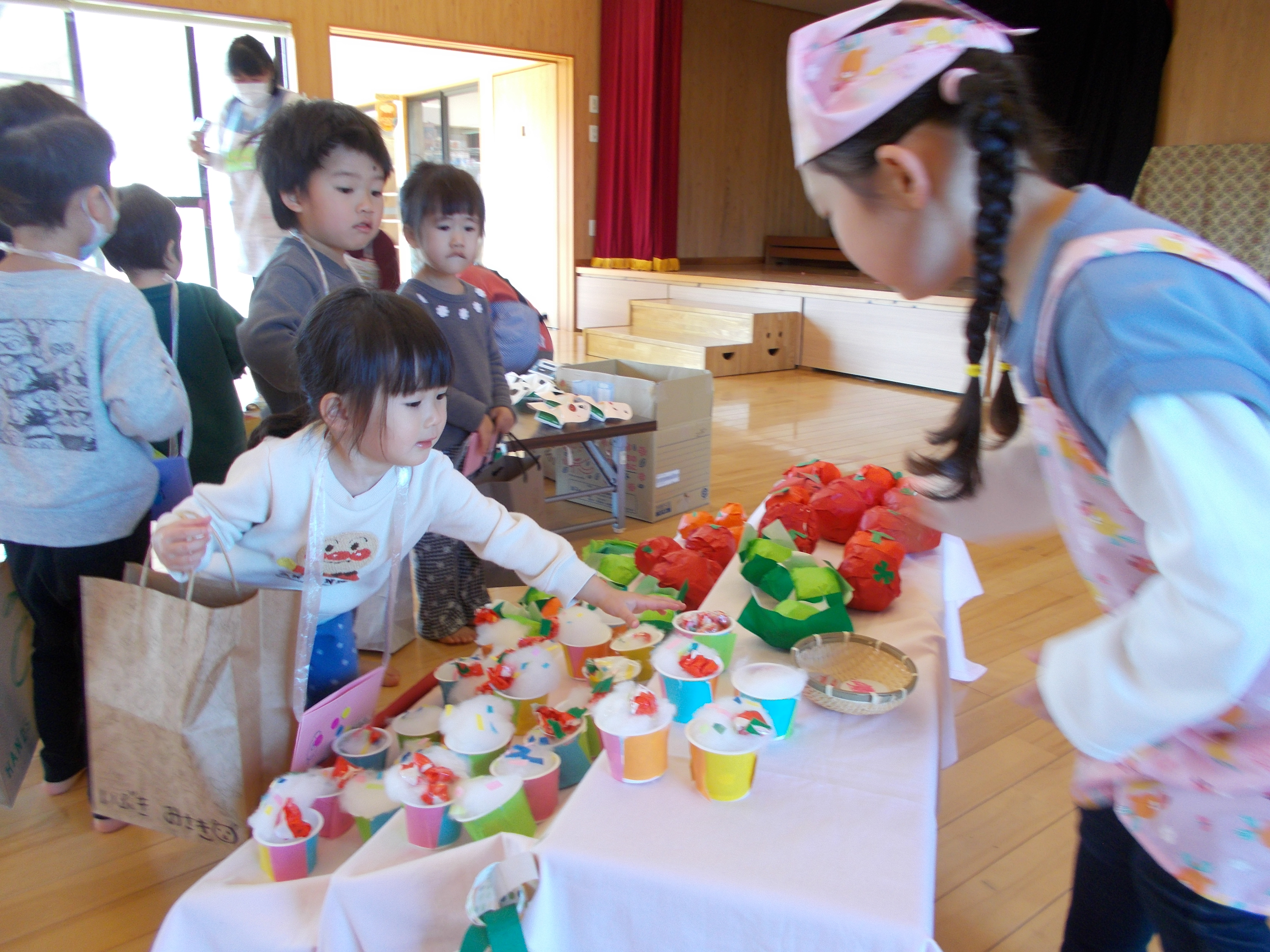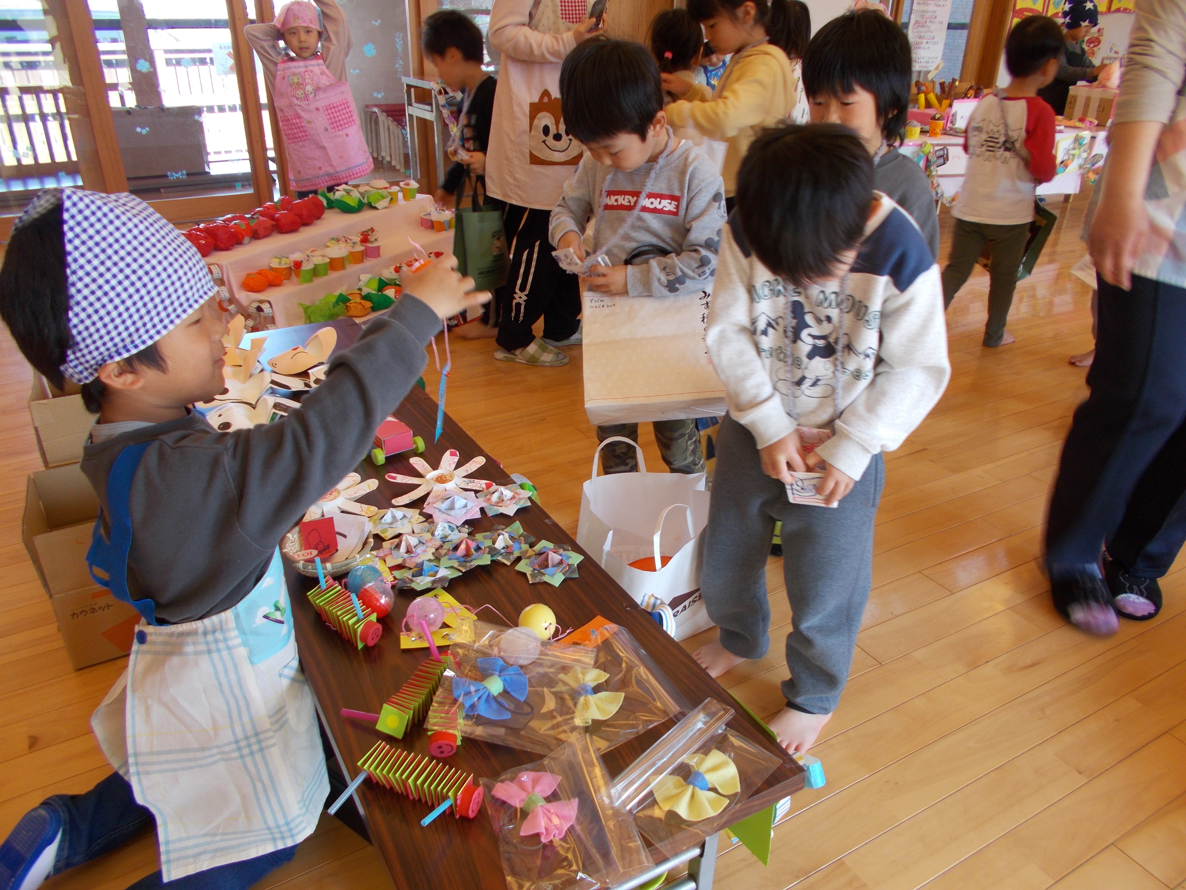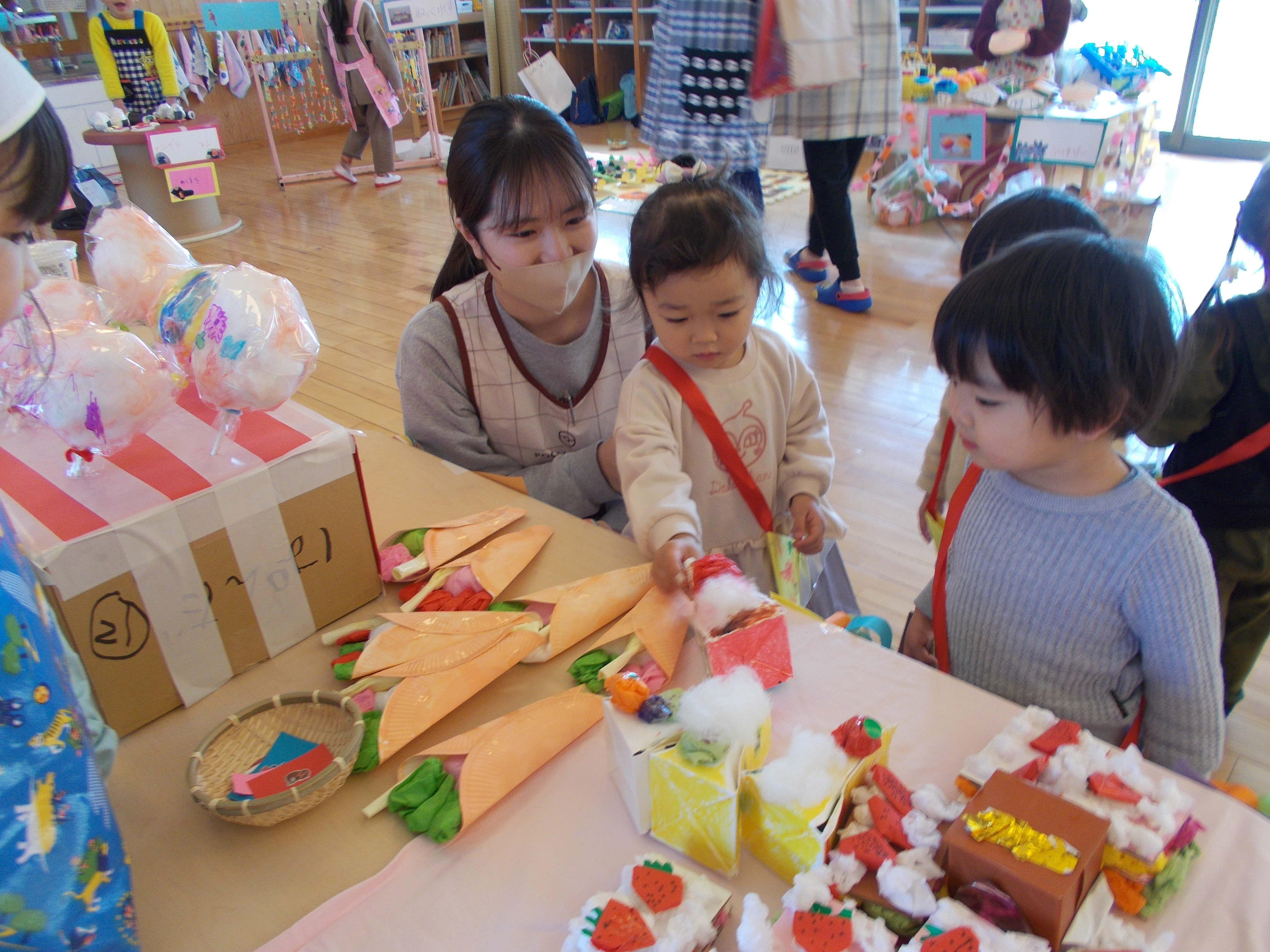 おかいものごっこ 3月8日(水) 保育士や子ども達と、少しずつ作ってきた商品でおかいものごっこをしました。 アクセサリーやケーキ、お弁当におもちゃと、お店にやってきた子ども達は、目をキラキラ輝かせてお買い物を楽しんでいました。 買った物を友達と見せ合うのも楽しみのひとつ♡のようです。