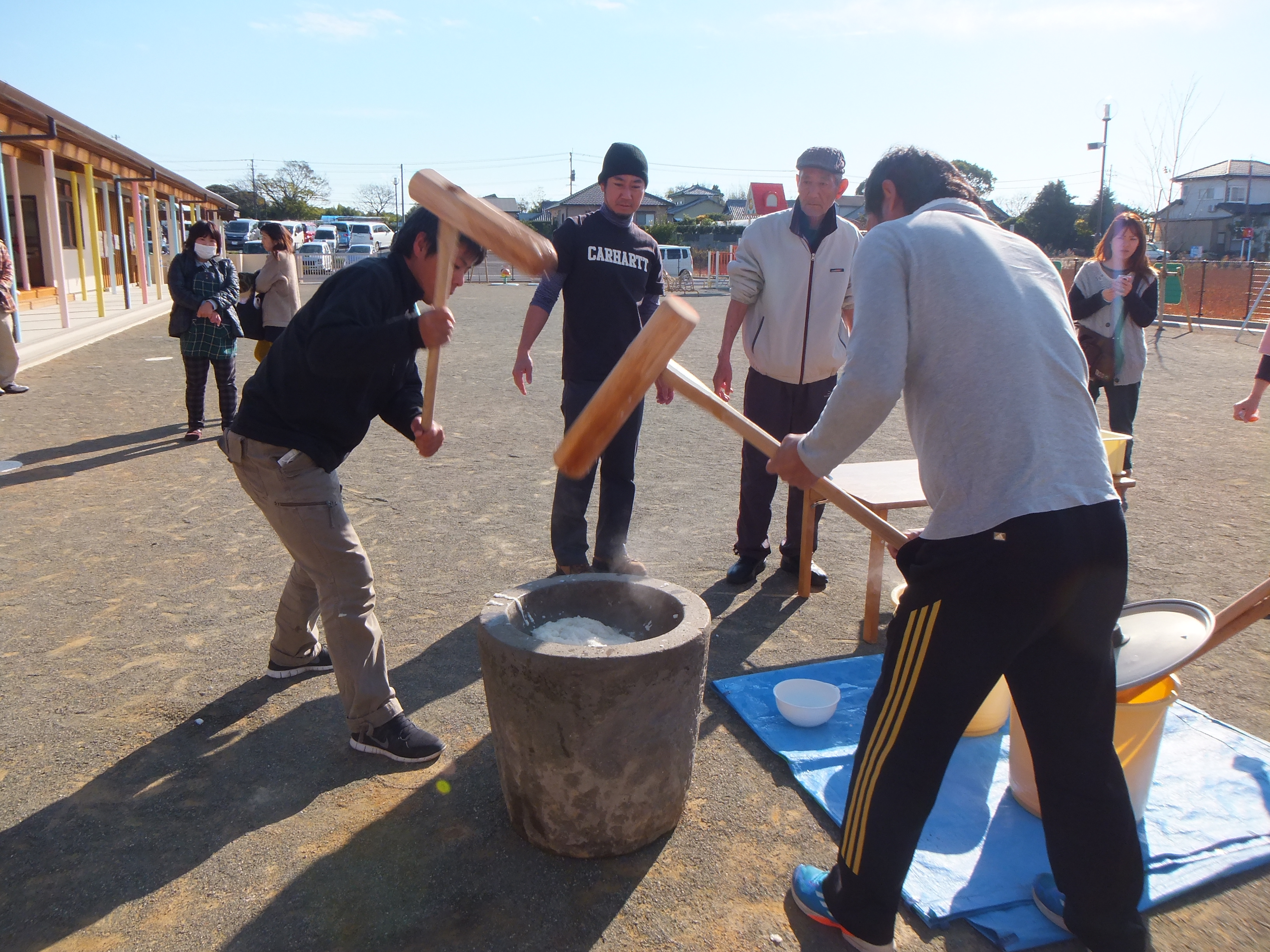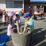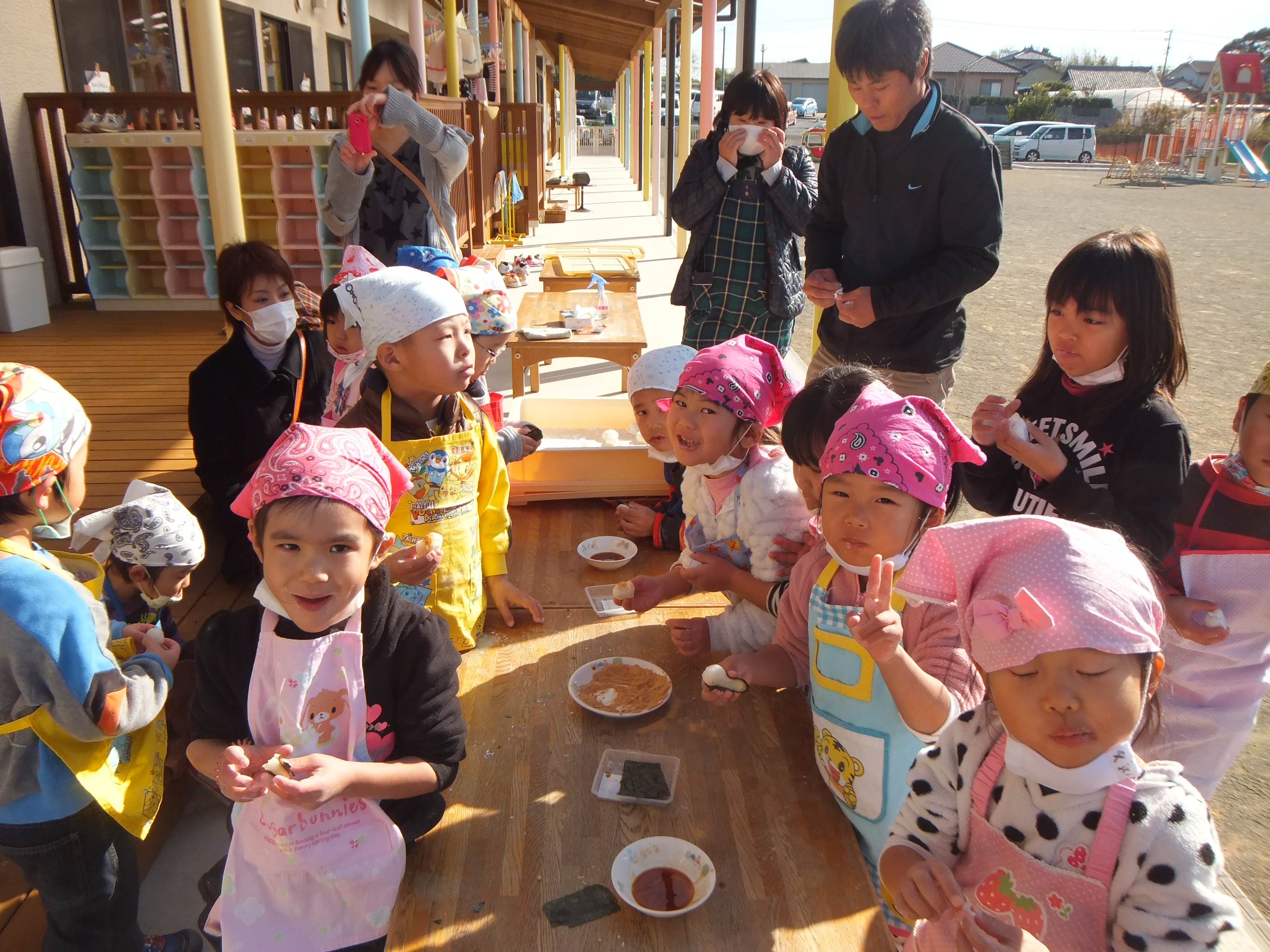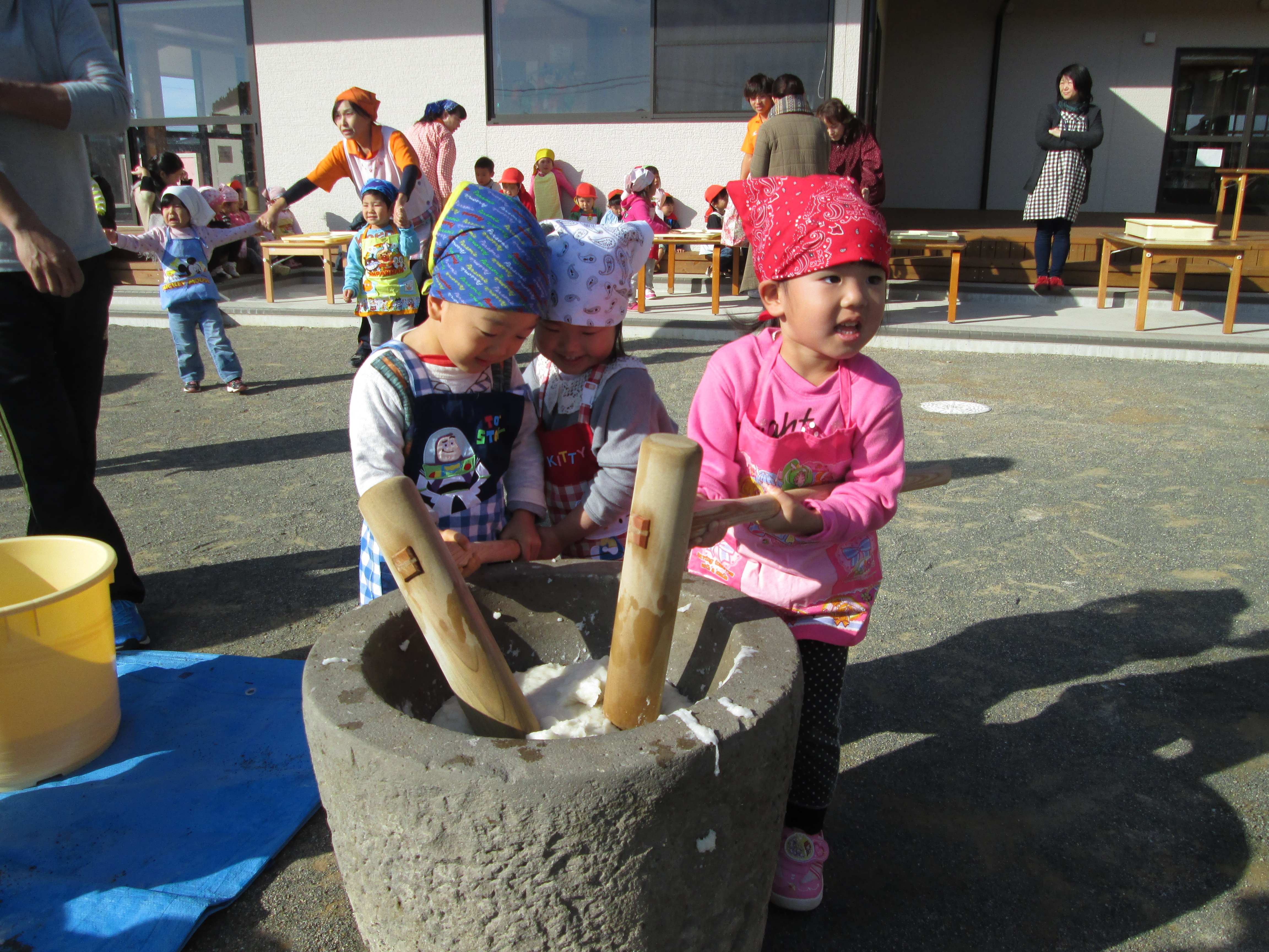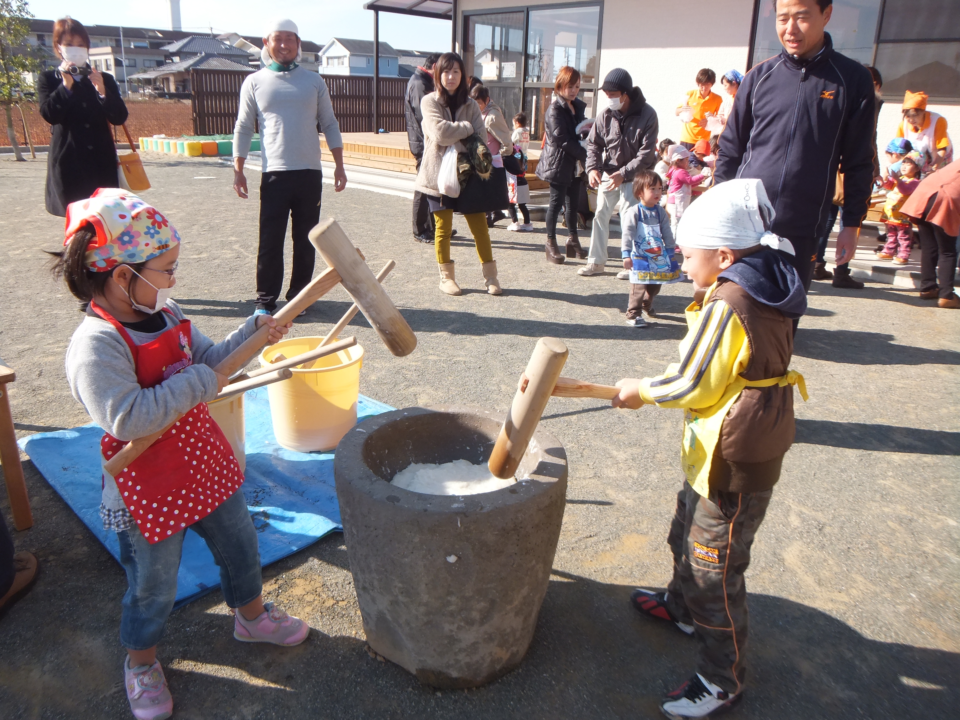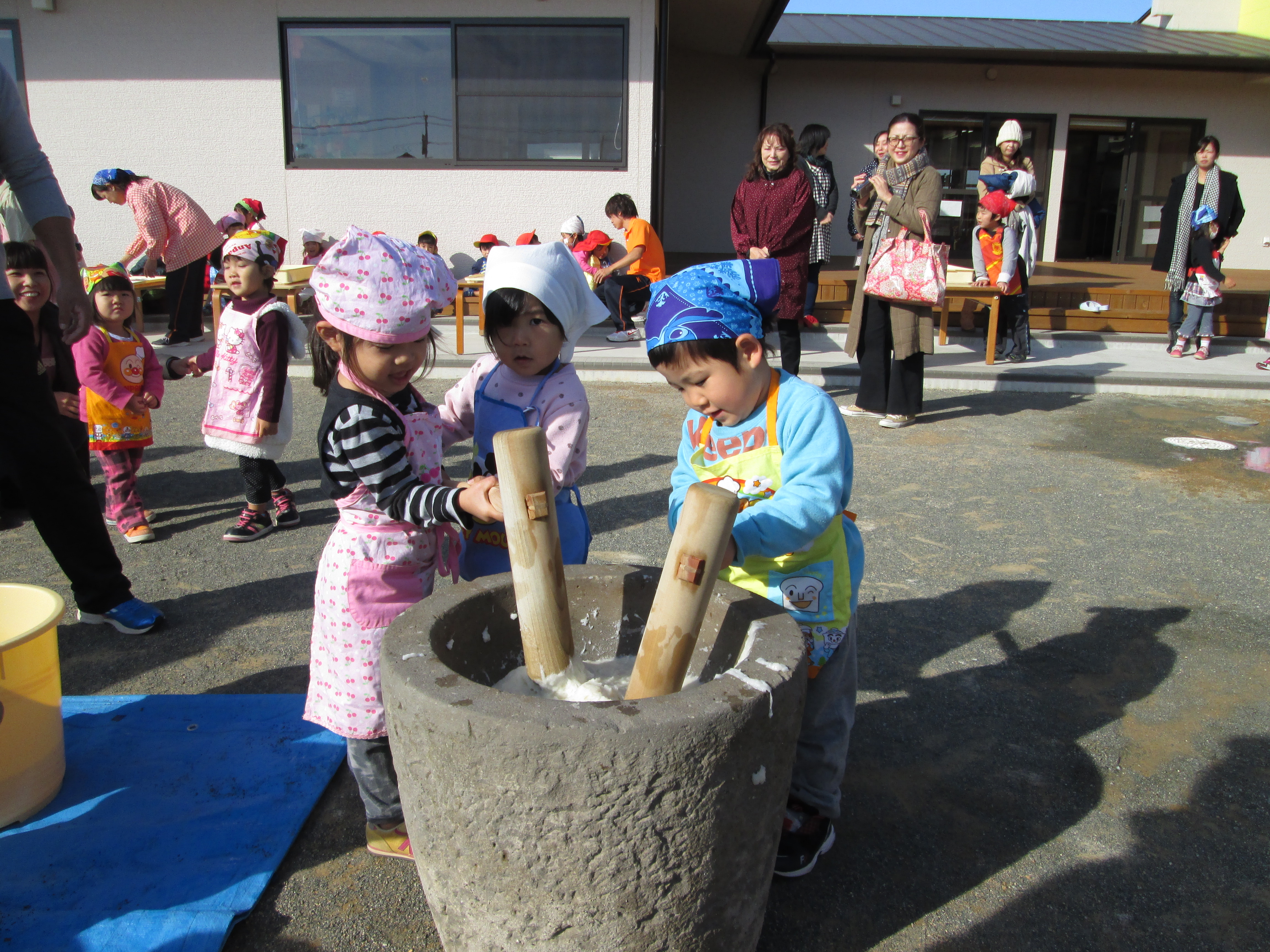もちつき大会 12月14日(土) 餅つきを行いました。 ぺったんぺったん・・・杵を持ち上げ交互につきます。 蒸したもち米が、どんどん柔らかくなって大きなおもちができました。 つきたてのお餅は美味しいね~♪ きなこや醤油をつけて、お腹一杯食べましたよ。