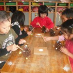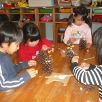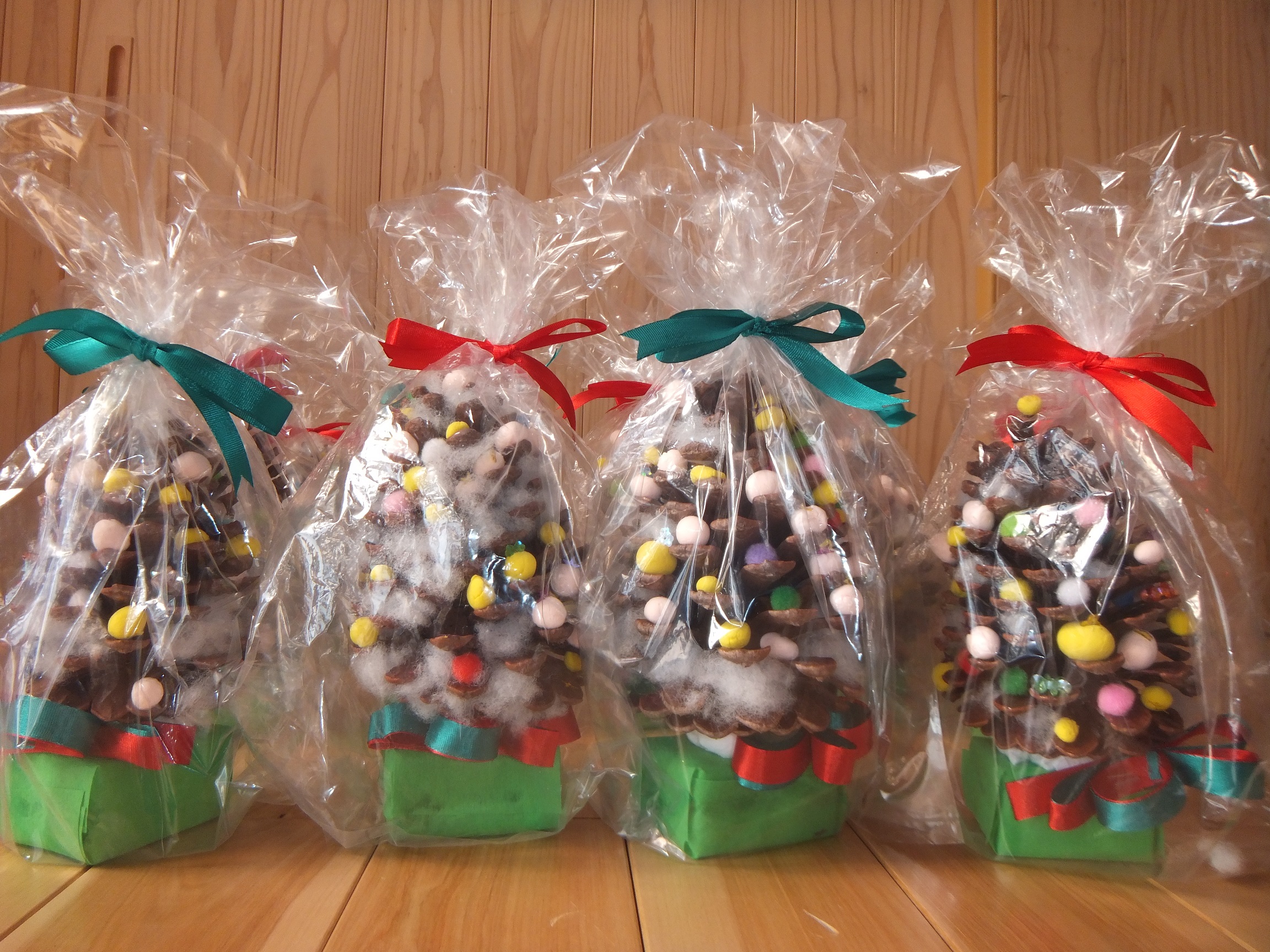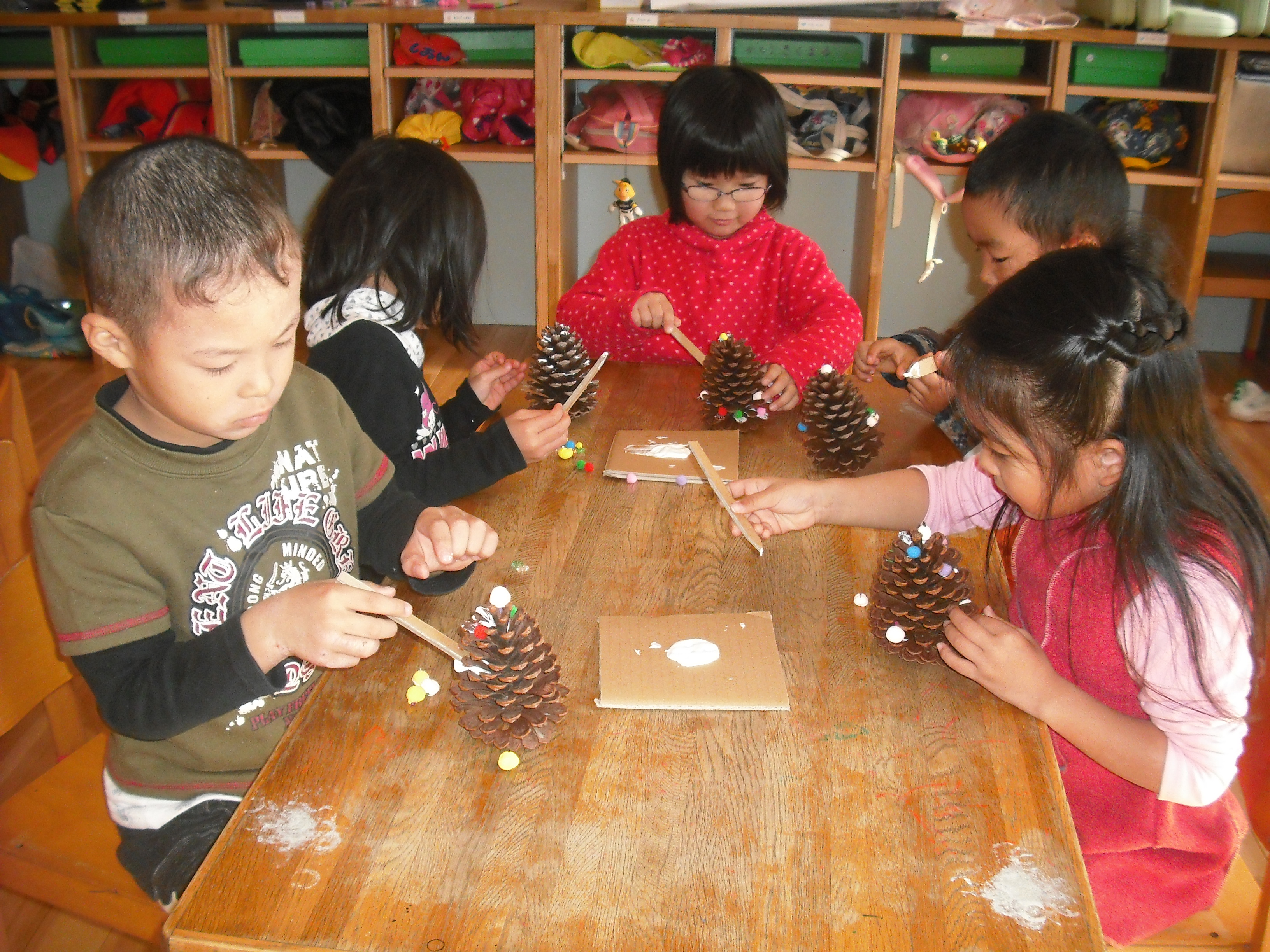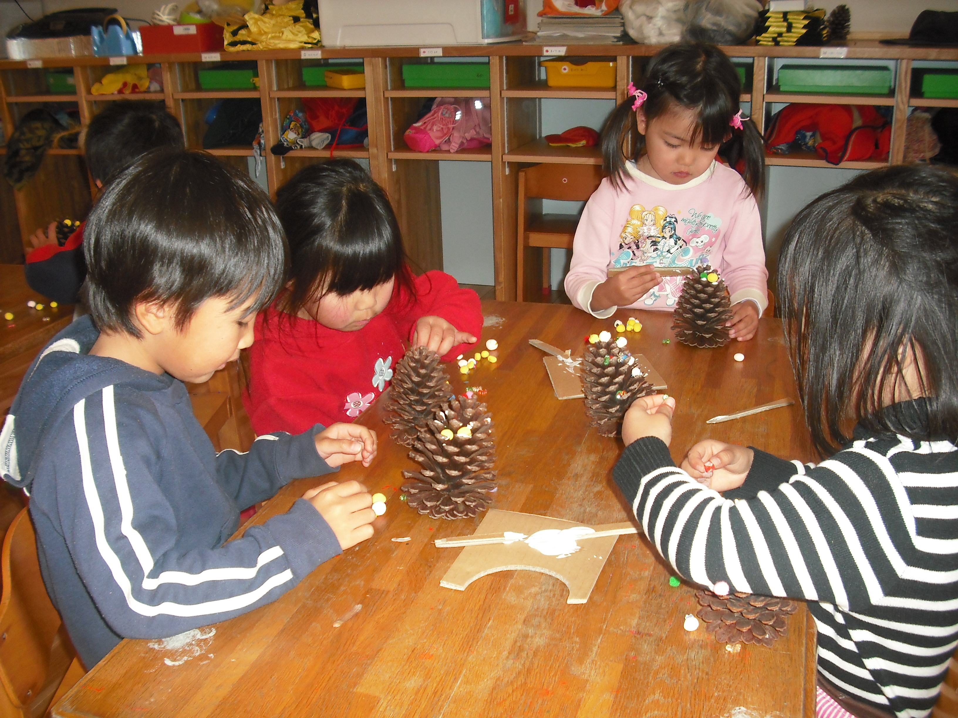クリスマスツリー作り 12月12日(木) ぞう組さんは、大きな松ぼっくりに小さくちぎって丸めた紙粘土をはりつけて、何やら作製中・・・。 飾りつけが完成し、可愛いクリスマスツリーの出来上がりです。 お家に飾ってクリスマスを楽しんで下さいね。