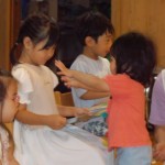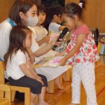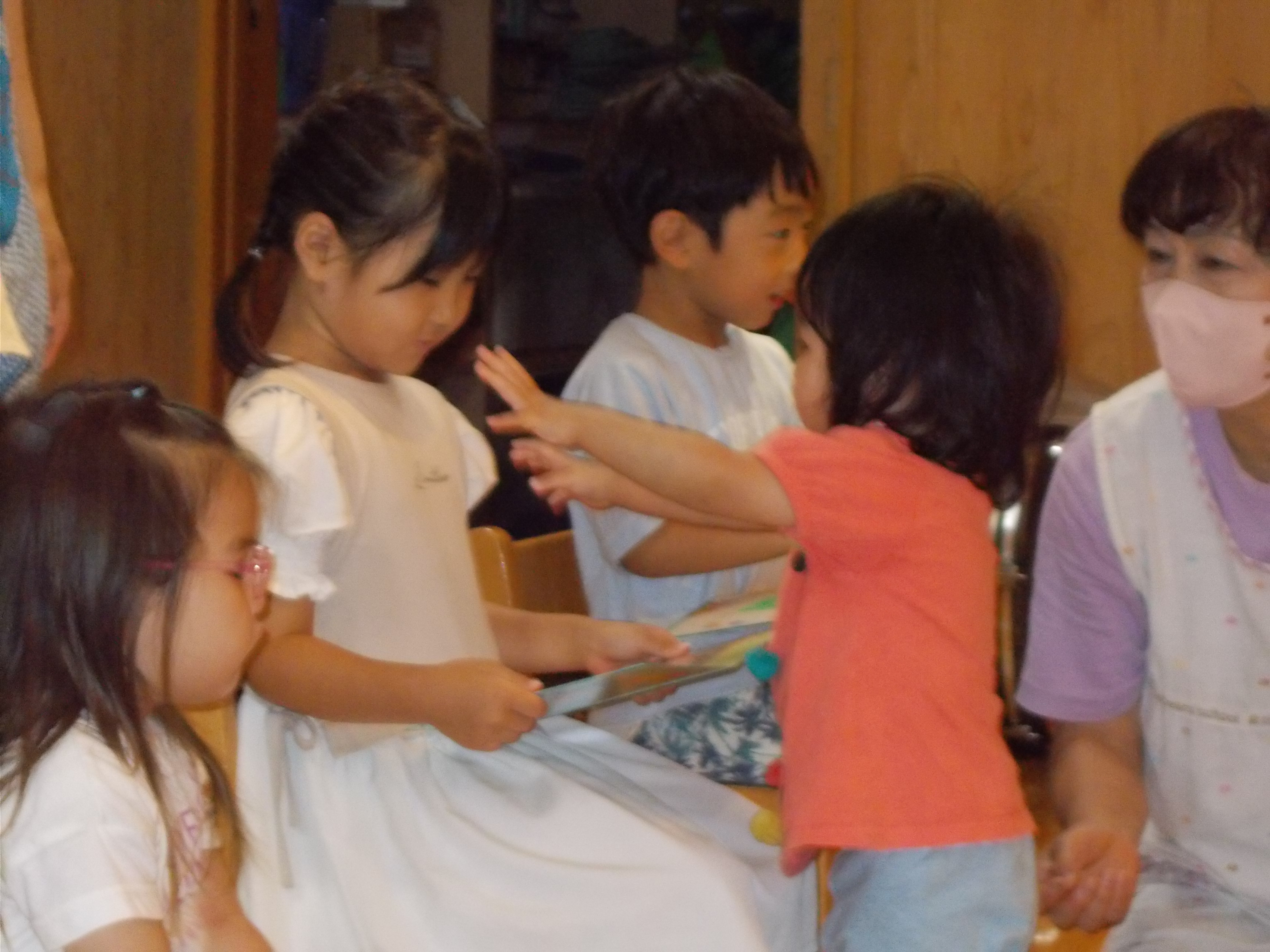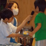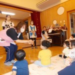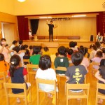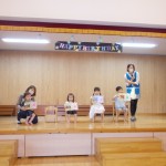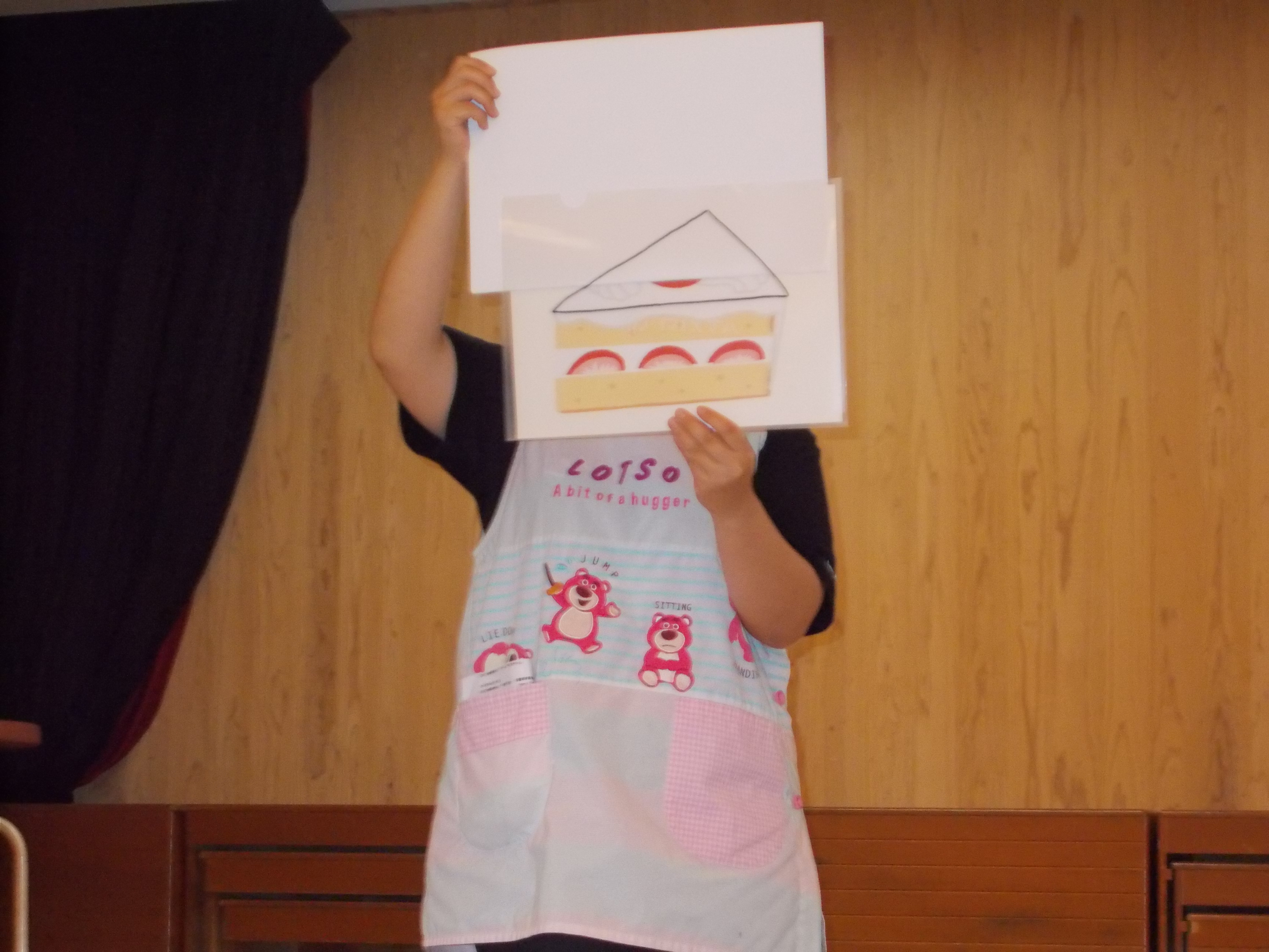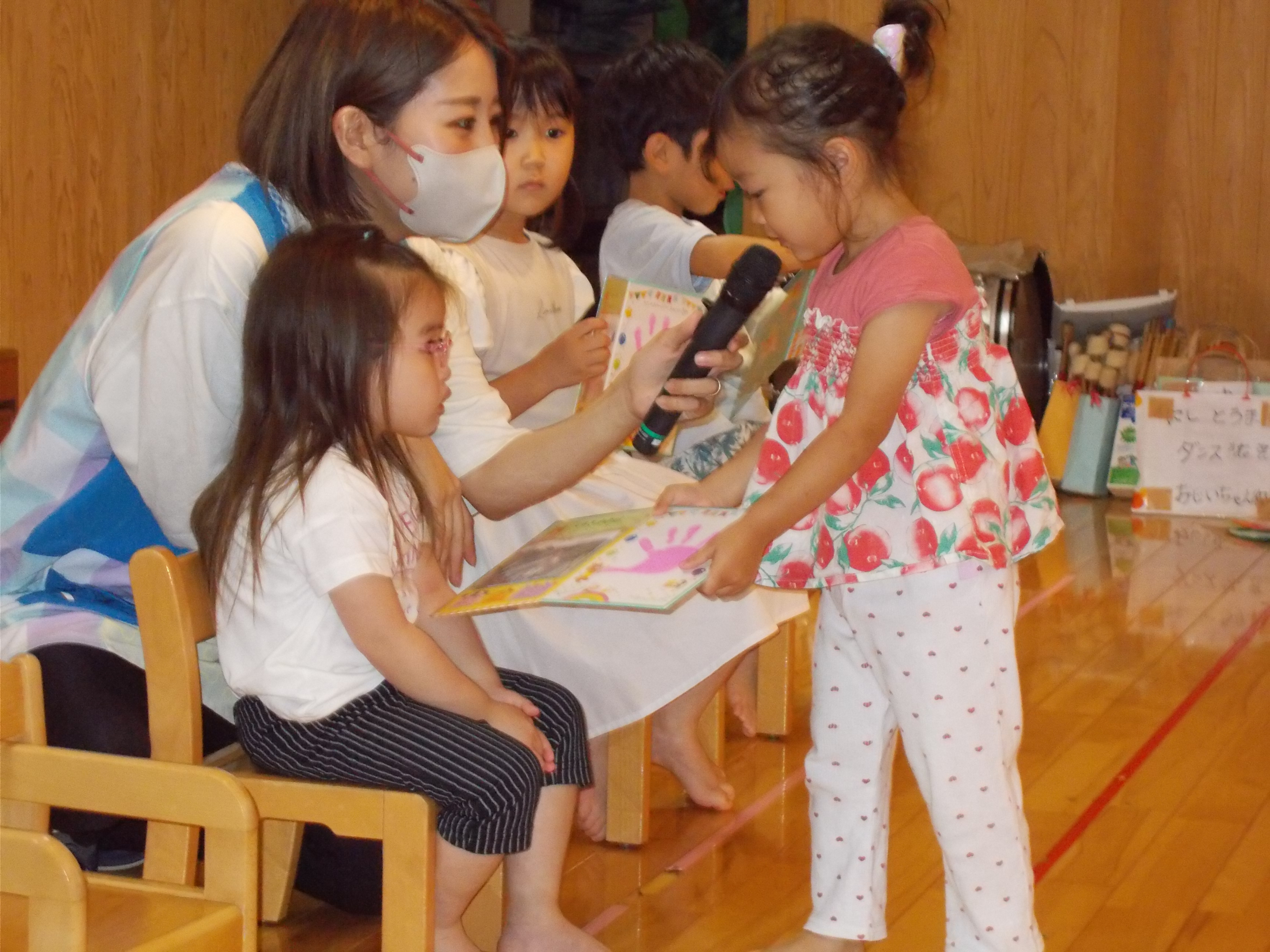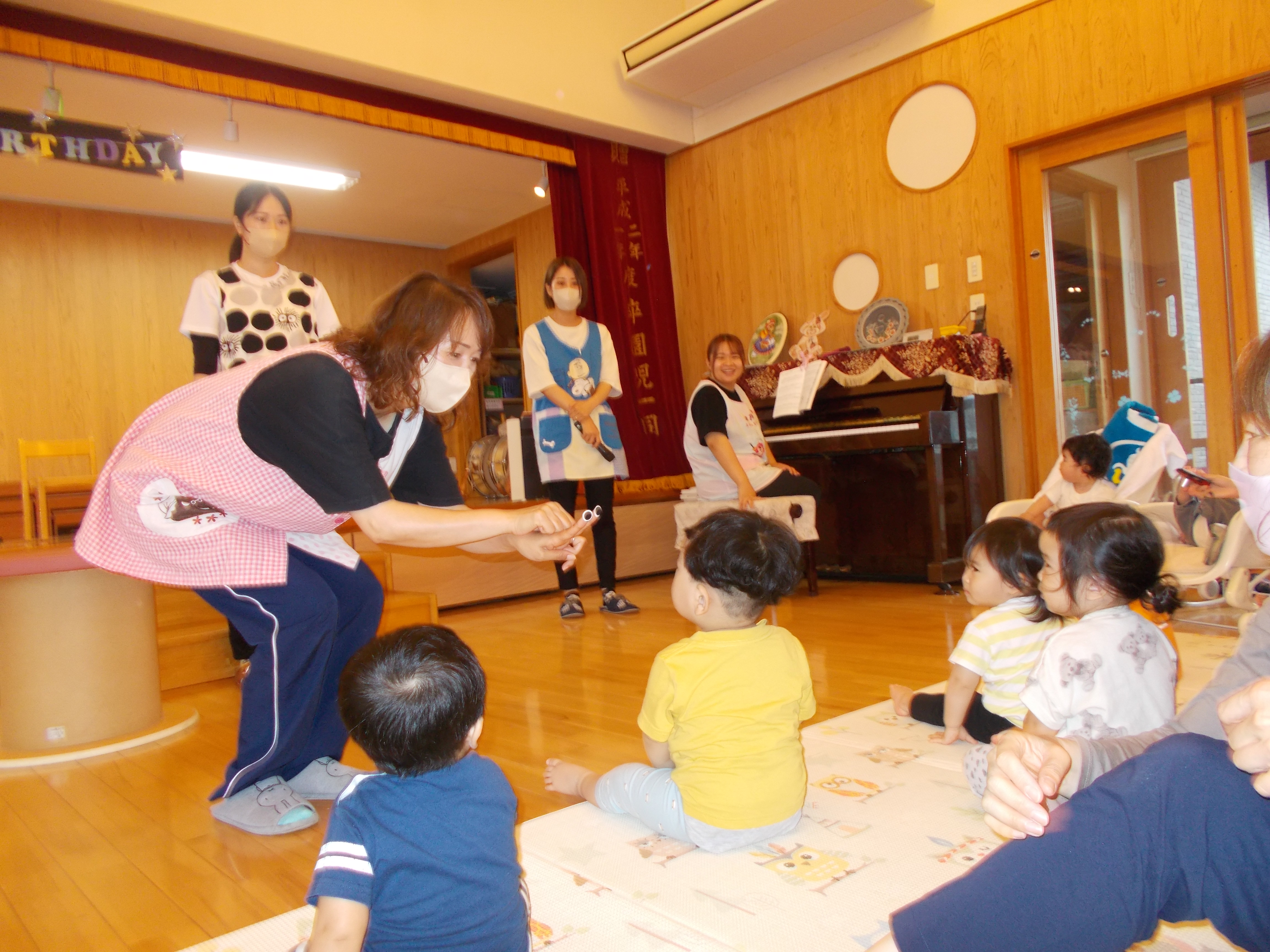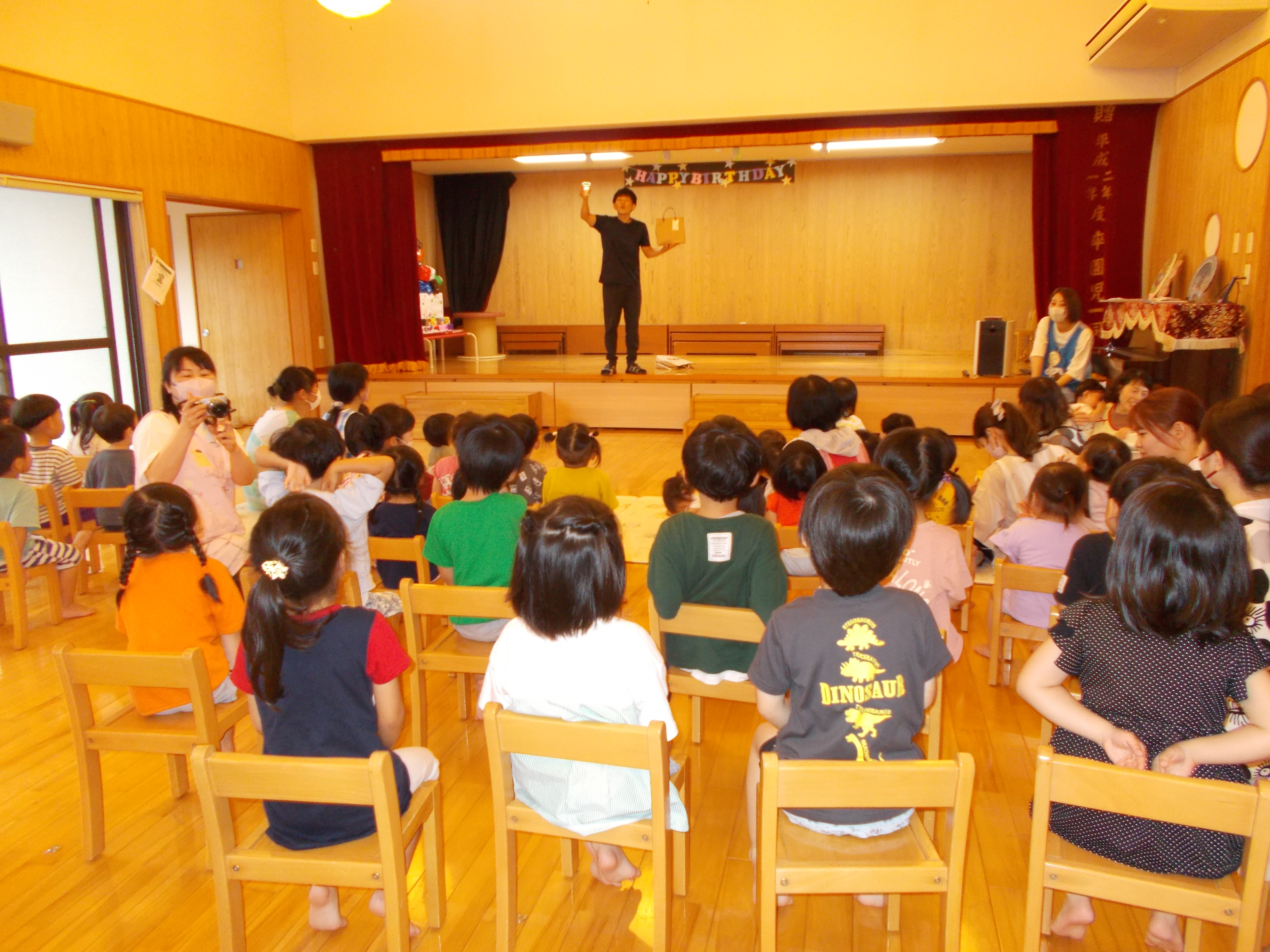 保育士の出し物の〇△▢クイズと、誰の傘かなクイズ、マジックショーでは、保育士のテンションの高さに子ども達もノリノリで参加していました。