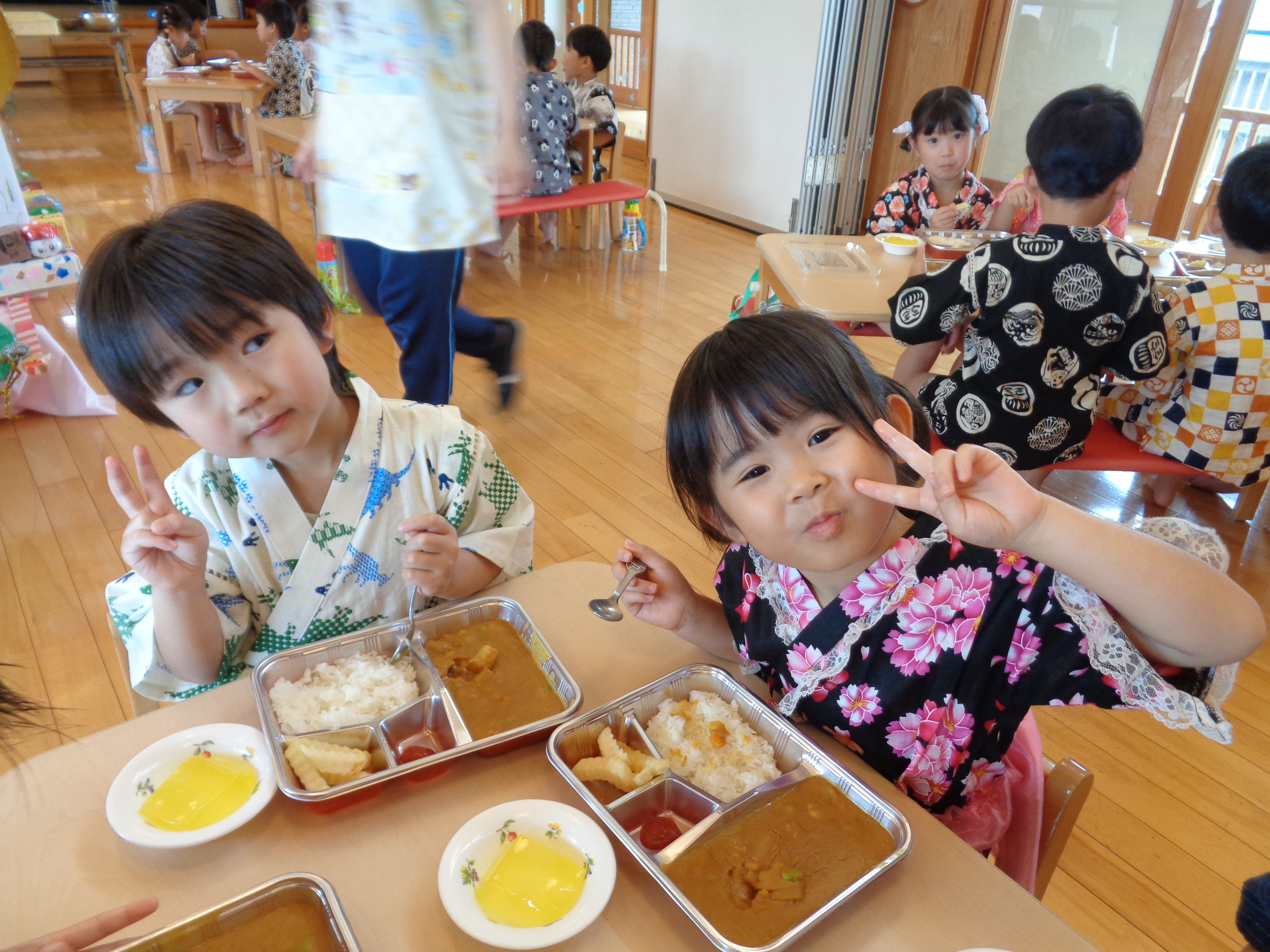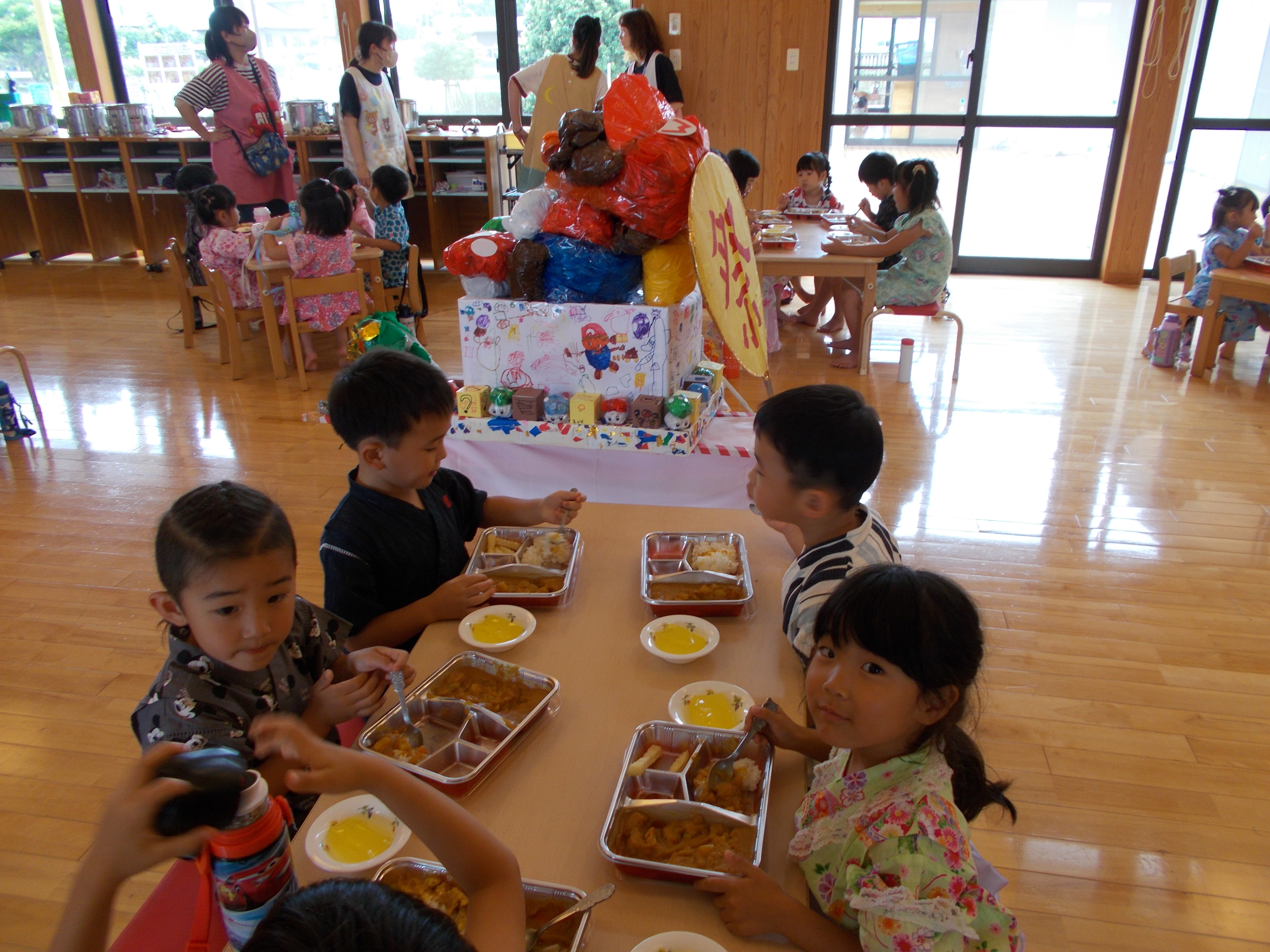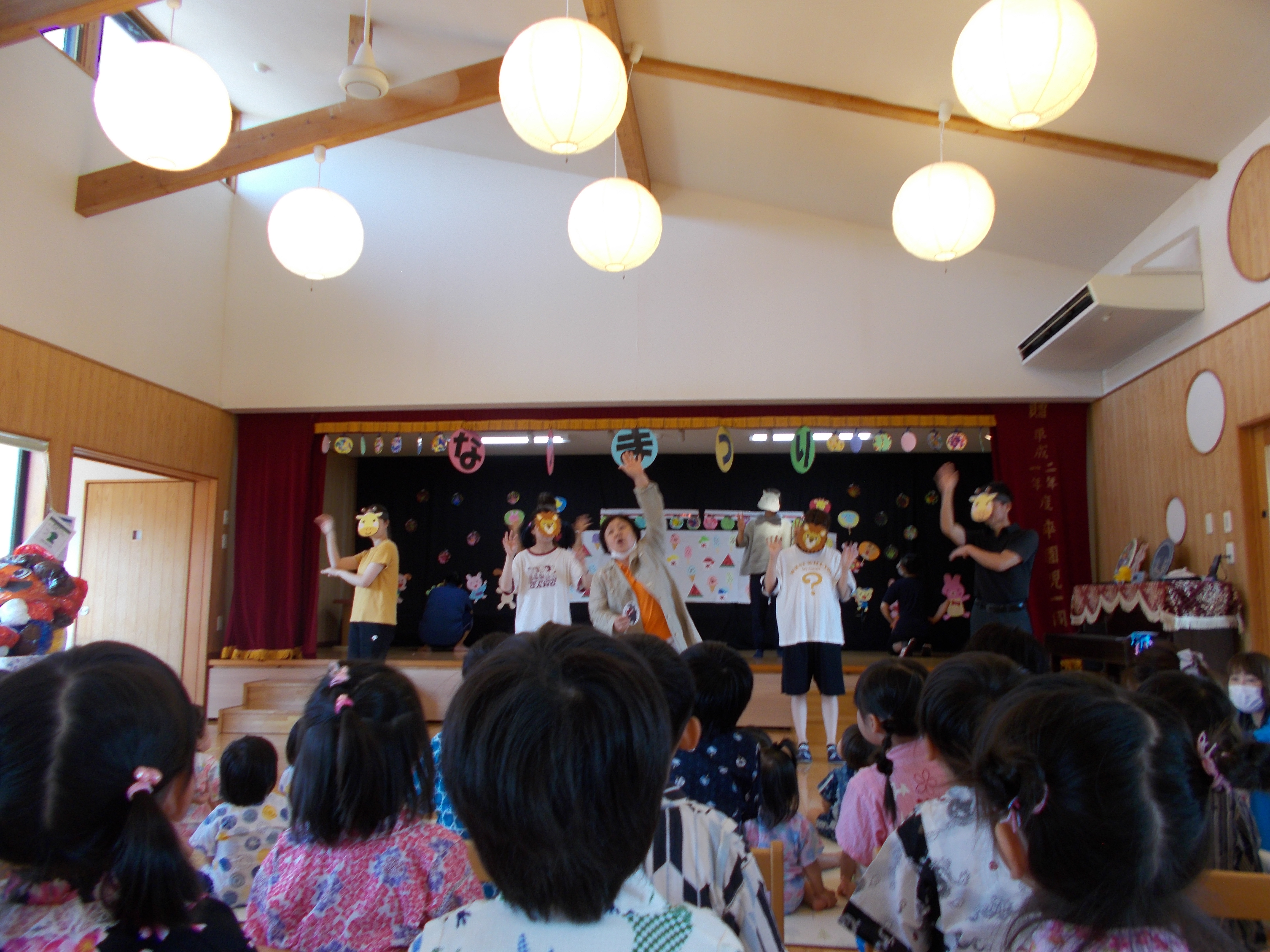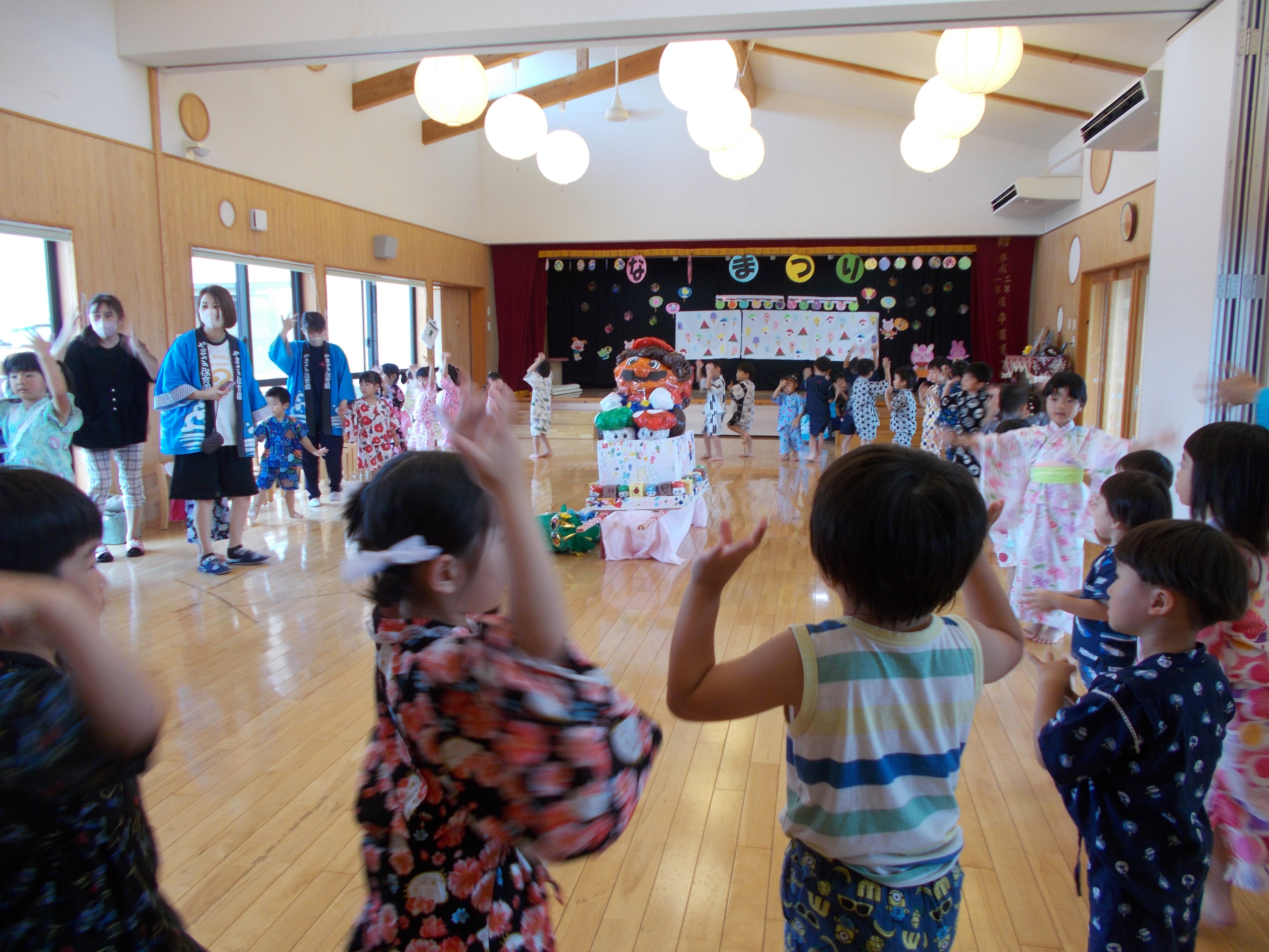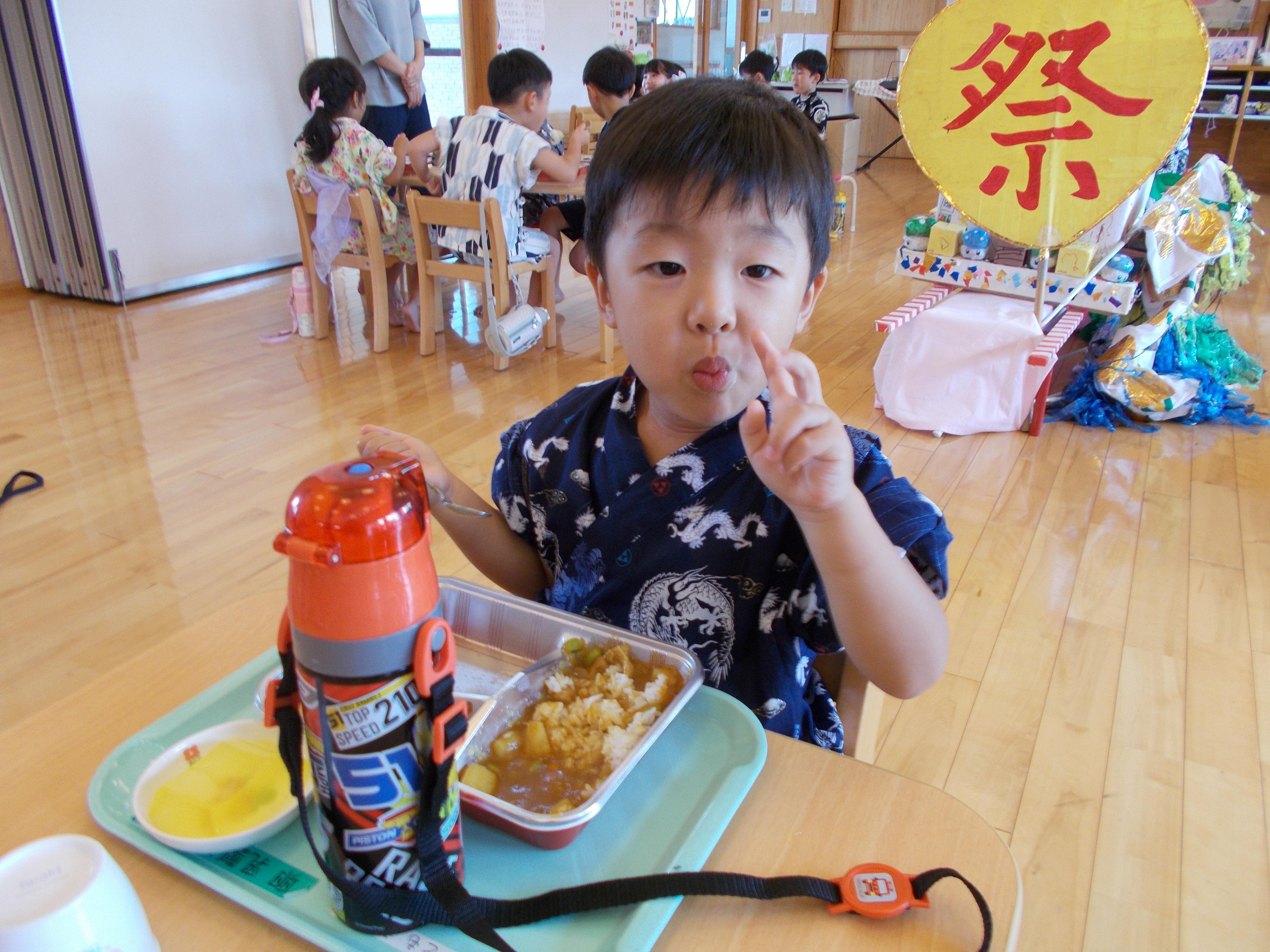 夏祭り 7月8日(土) 夏祭りに参加しました。 連日の猛暑により園庭での夏祭り開催が難しく、室内での夏祭りとなりました。 保育士のダンスやマジックショー神輿を囲んでの盆踊りと、声も高らかに大変盛り上がりました。 楽しい雰囲気の中で食べるカレーライスは、最高に美味しかったようです。 帰りは、手土産と思い出話で親子楽しい帰り道となり、微笑ましかったです。
