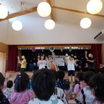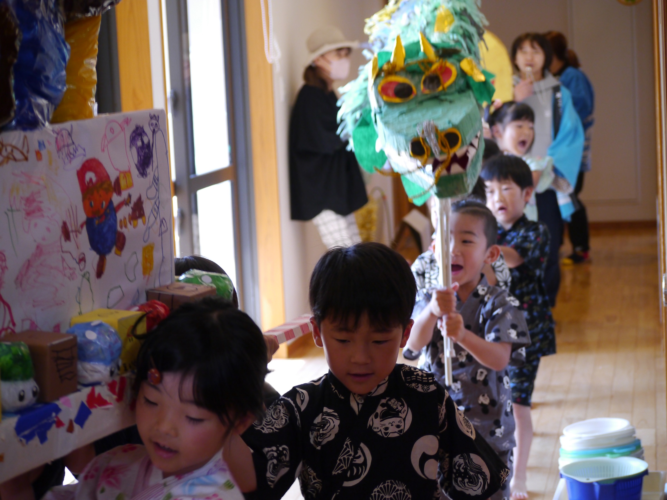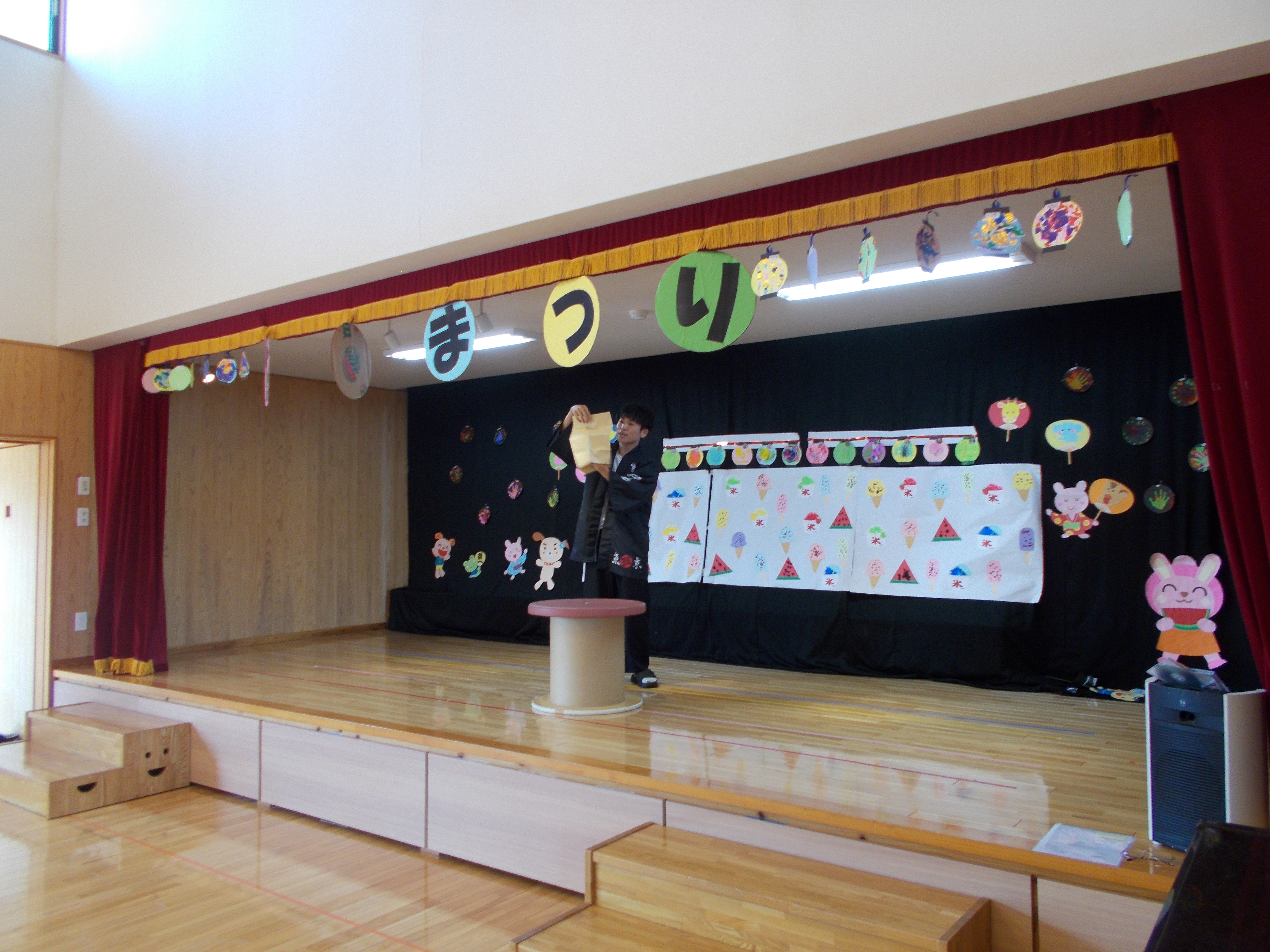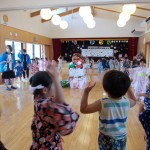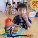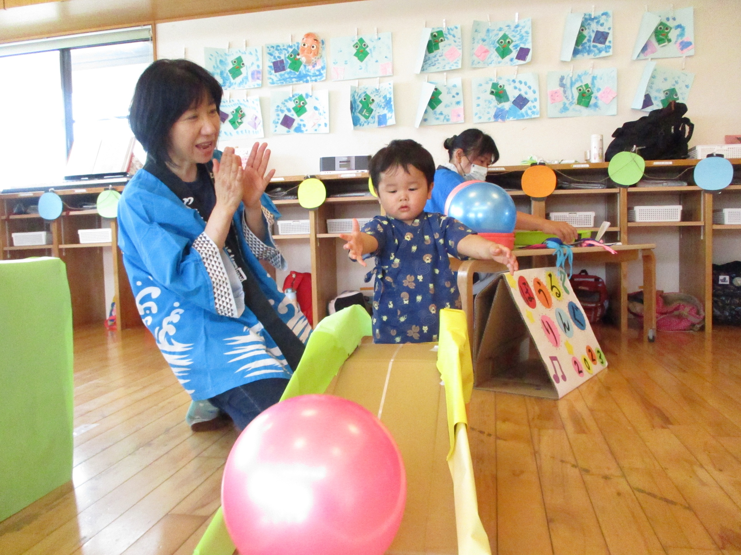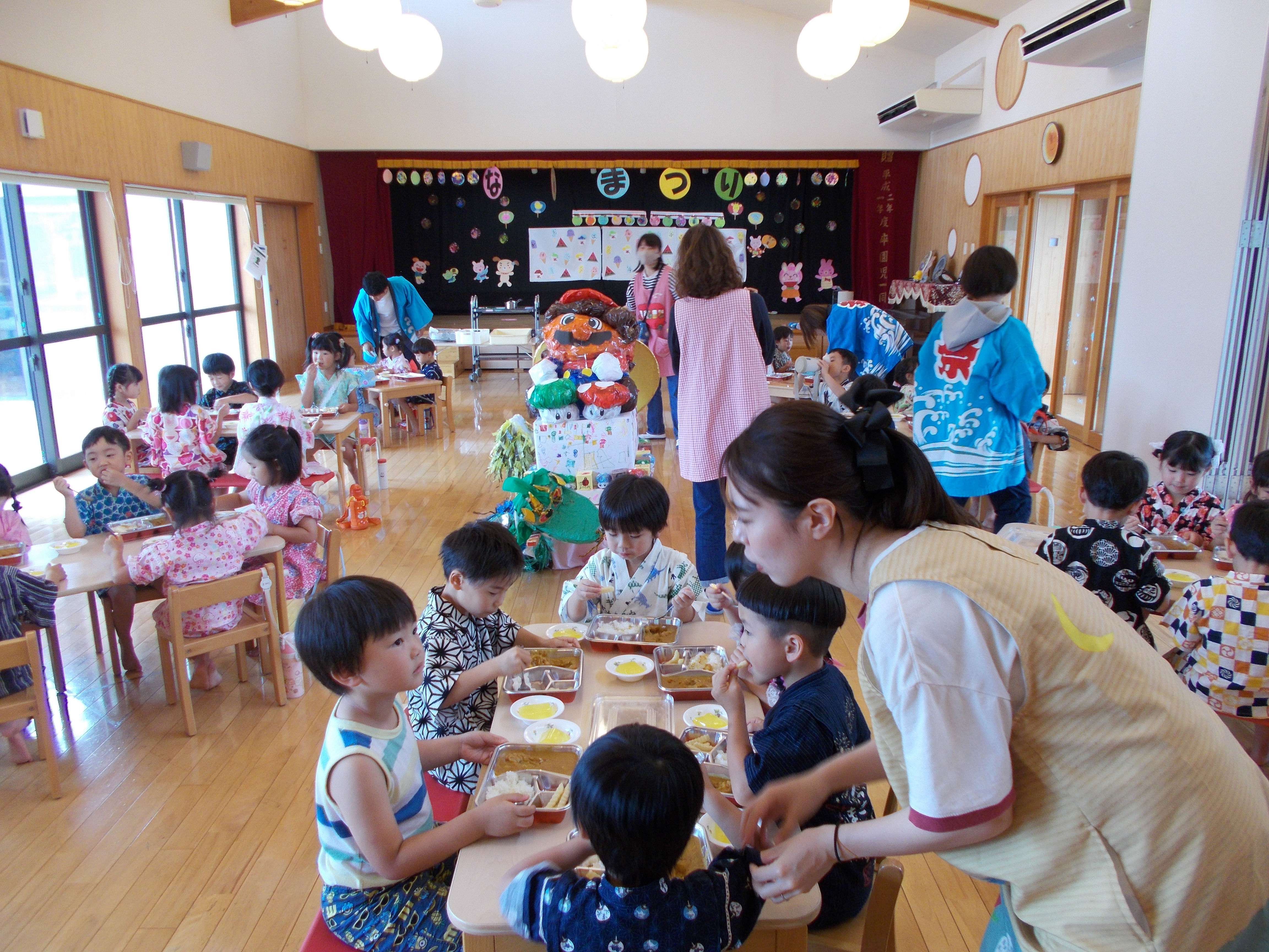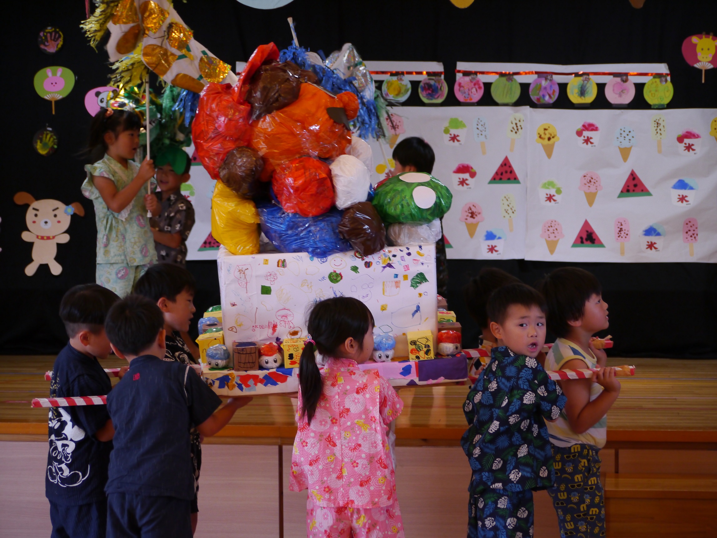 夏祭り 7月8日(土) 夏祭りに参加しました。 連日の猛暑により園庭での夏祭り開催が難しく、室内での夏祭りとなりました。 保育士のダンスやマジックショー神輿を囲んでの盆踊りと、声も高らかに大変盛り上がりました。 楽しい雰囲気の中で食べるカレーライスは、最高に美味しかったようです。 帰りは、手土産と思い出話で親子楽しい帰り道となり、微笑ましかったです。