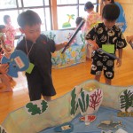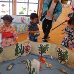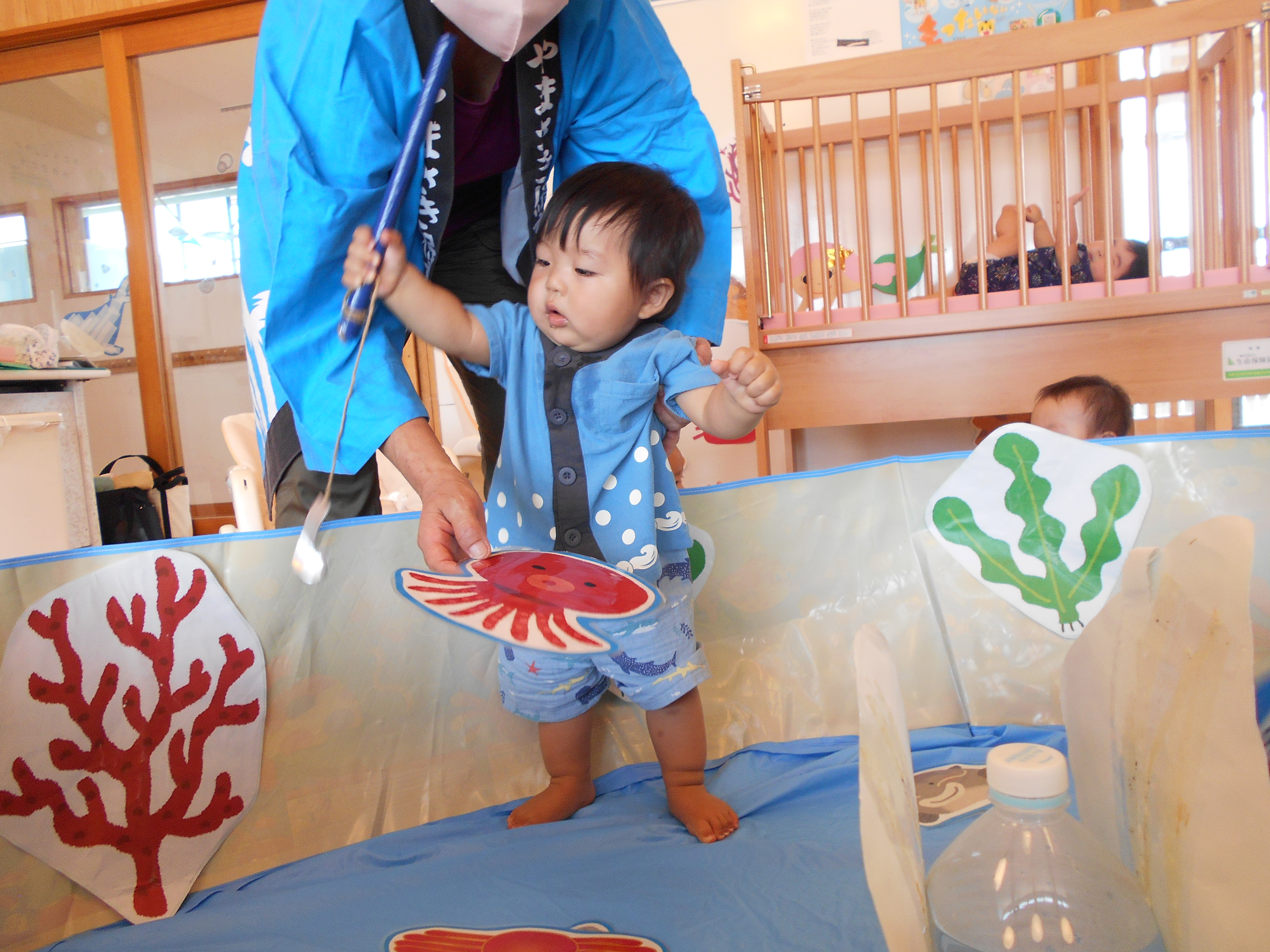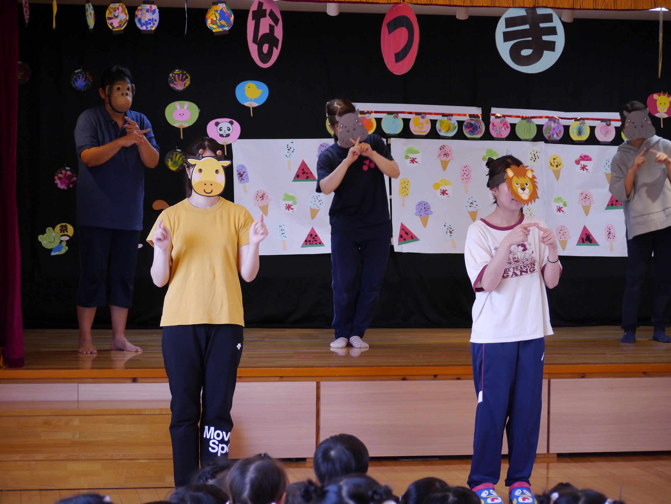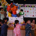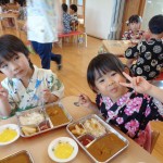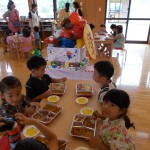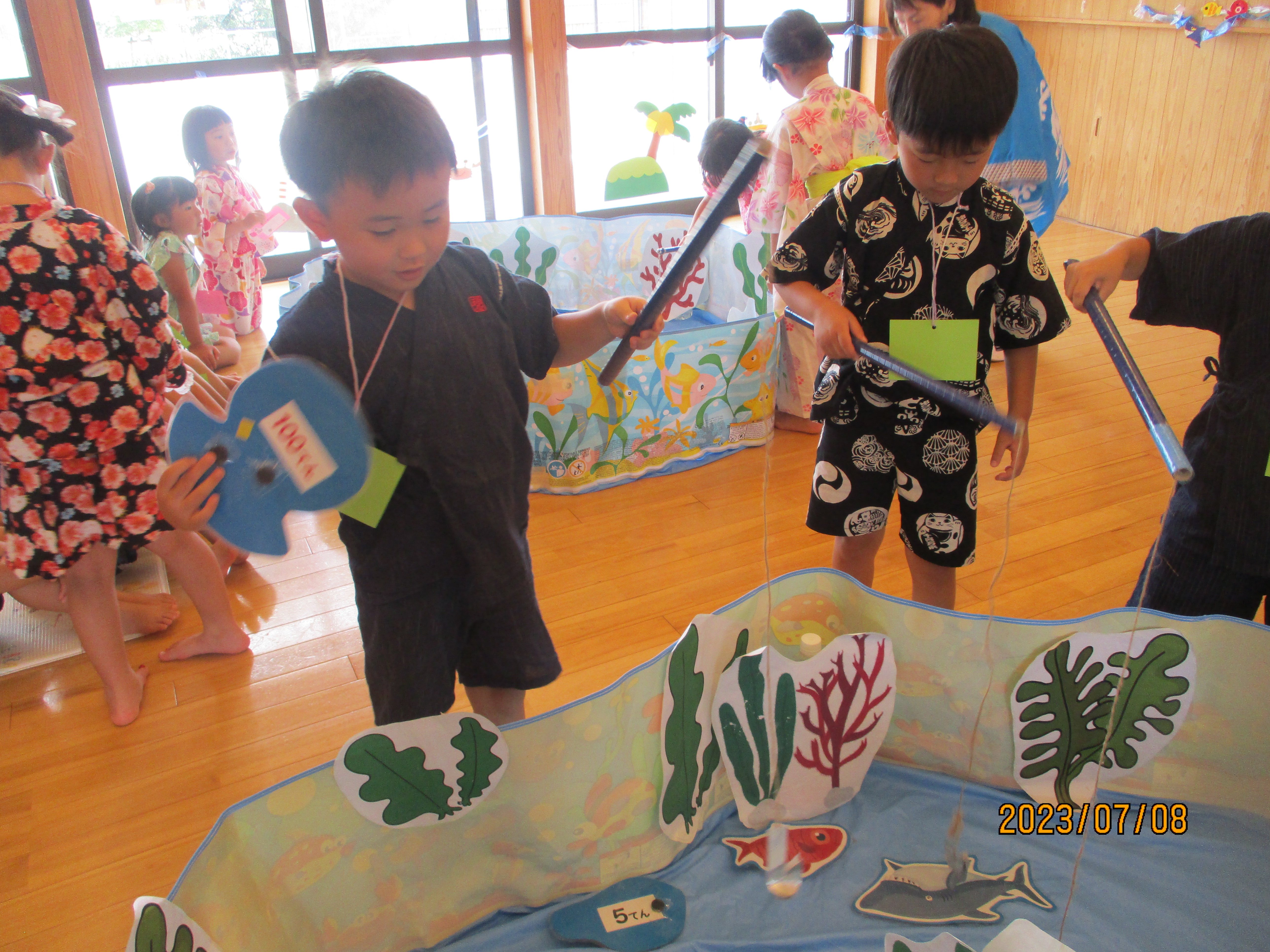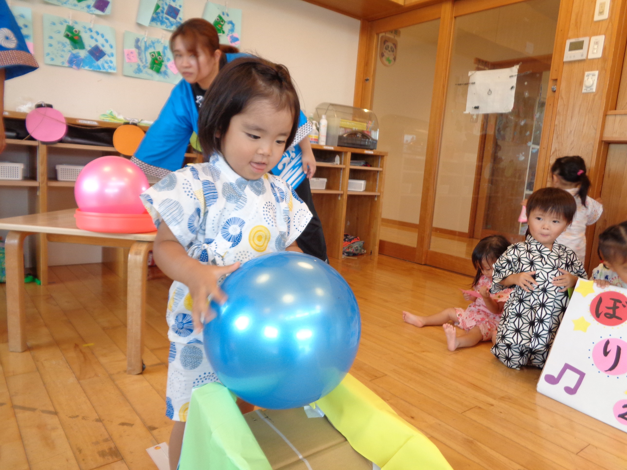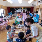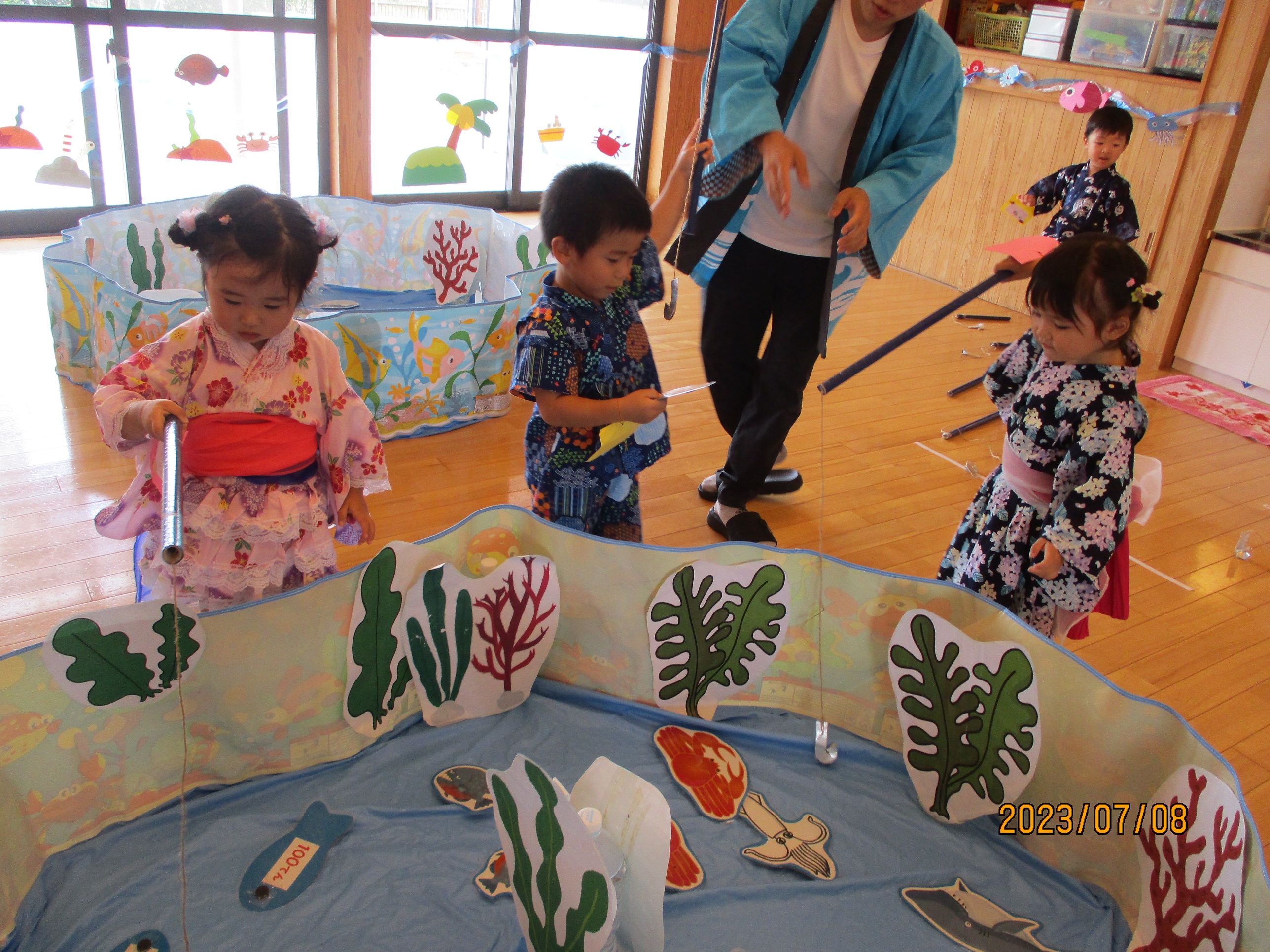 夏祭り 7月8日(土) 夏祭りに参加しました。 連日の猛暑により園庭での夏祭り開催が難しく、室内での夏祭りとなりました。 保育士のダンスやマジックショー神輿を囲んでの盆踊りと、声も高らかに大変盛り上がりました。 楽しい雰囲気の中で食べるカレーライスは、最高に美味しかったようです。 帰りは、手土産と思い出話で親子楽しい帰り道となり、微笑ましかったです。