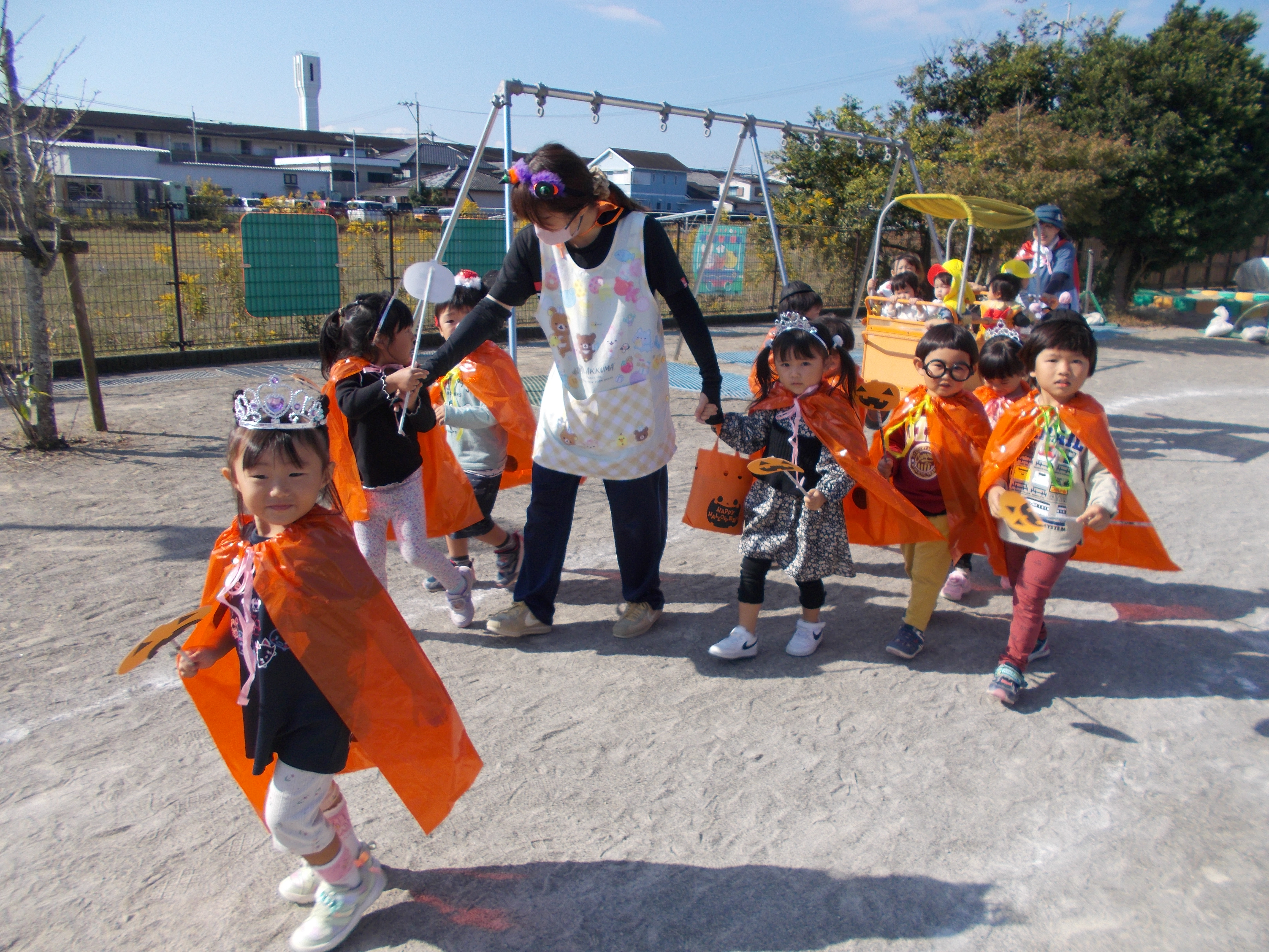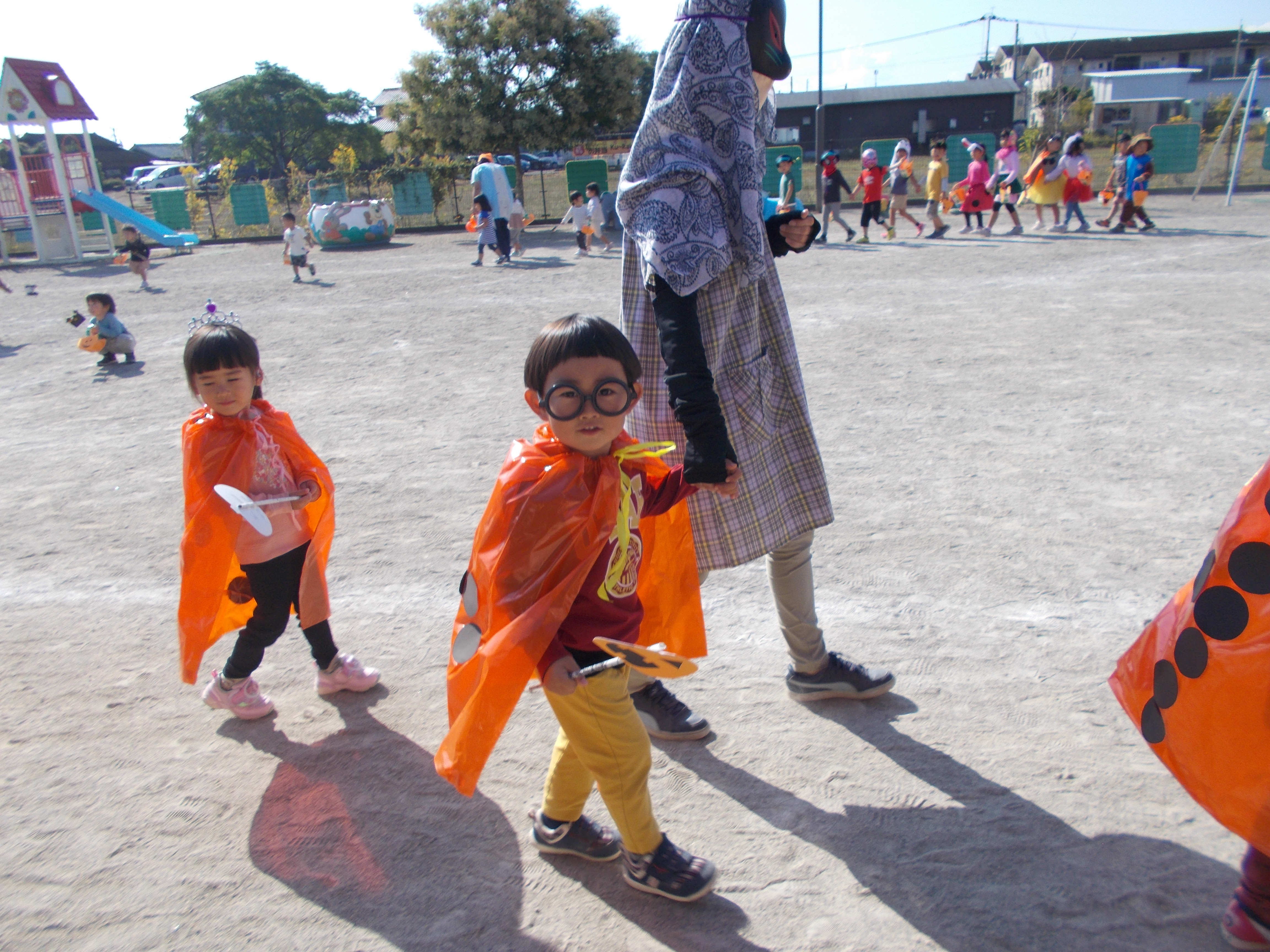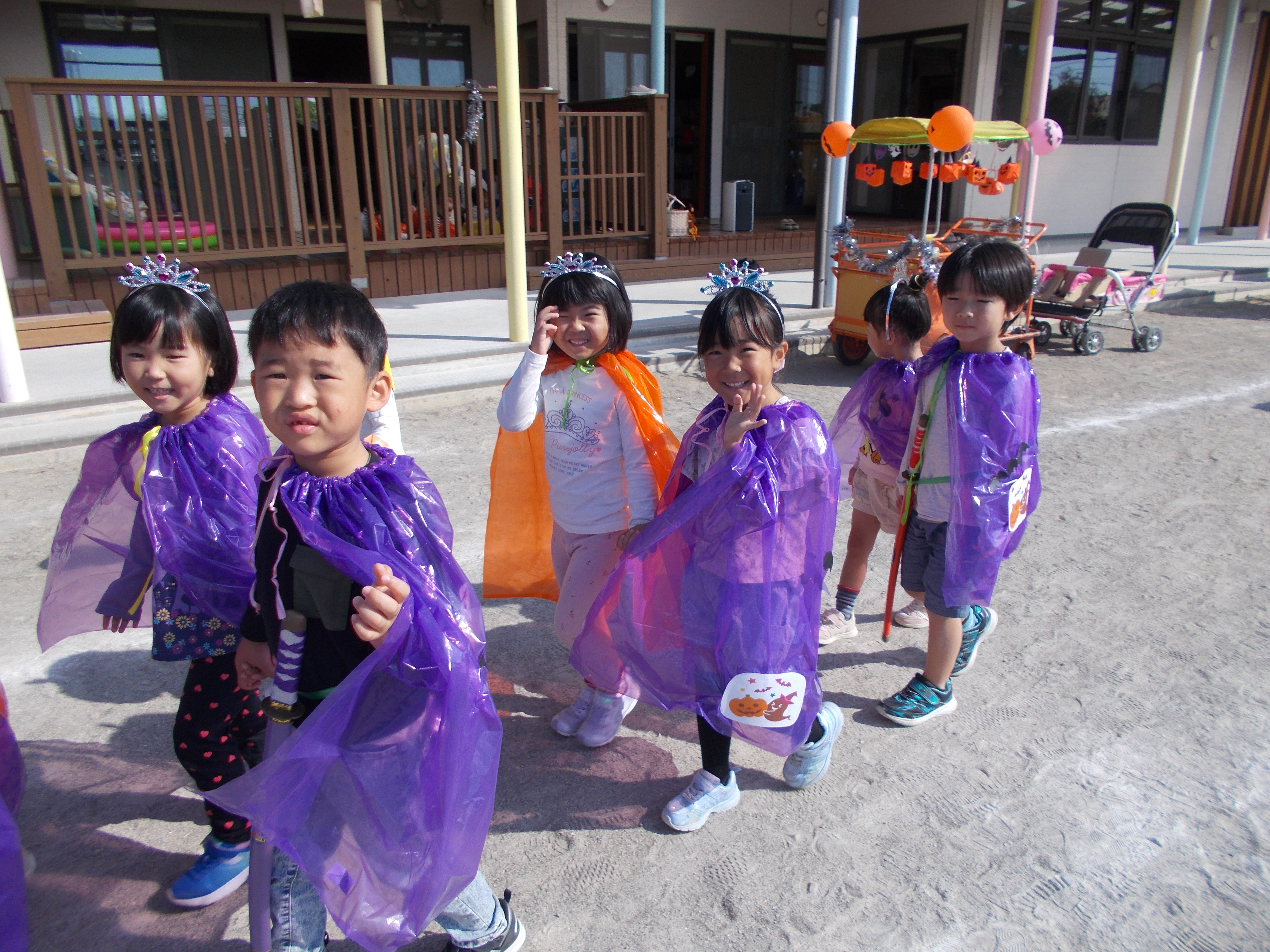 ハロウィン 10月31日(火) ハロウィンパレードを楽しみました。 かわいらしく仮装をして、皆楽しそう(^^♪ 「トリックオアトリート」と保育士に言うとお菓子を貰えるのですが、誰がお菓子を持っているのか分からず、子ども達はみんなで大捜索! 人気の高かったのは、おさげの可愛い魔女さん(*’ω’*) 魔女さんから貰いたいと、集まってました。