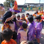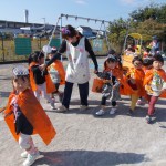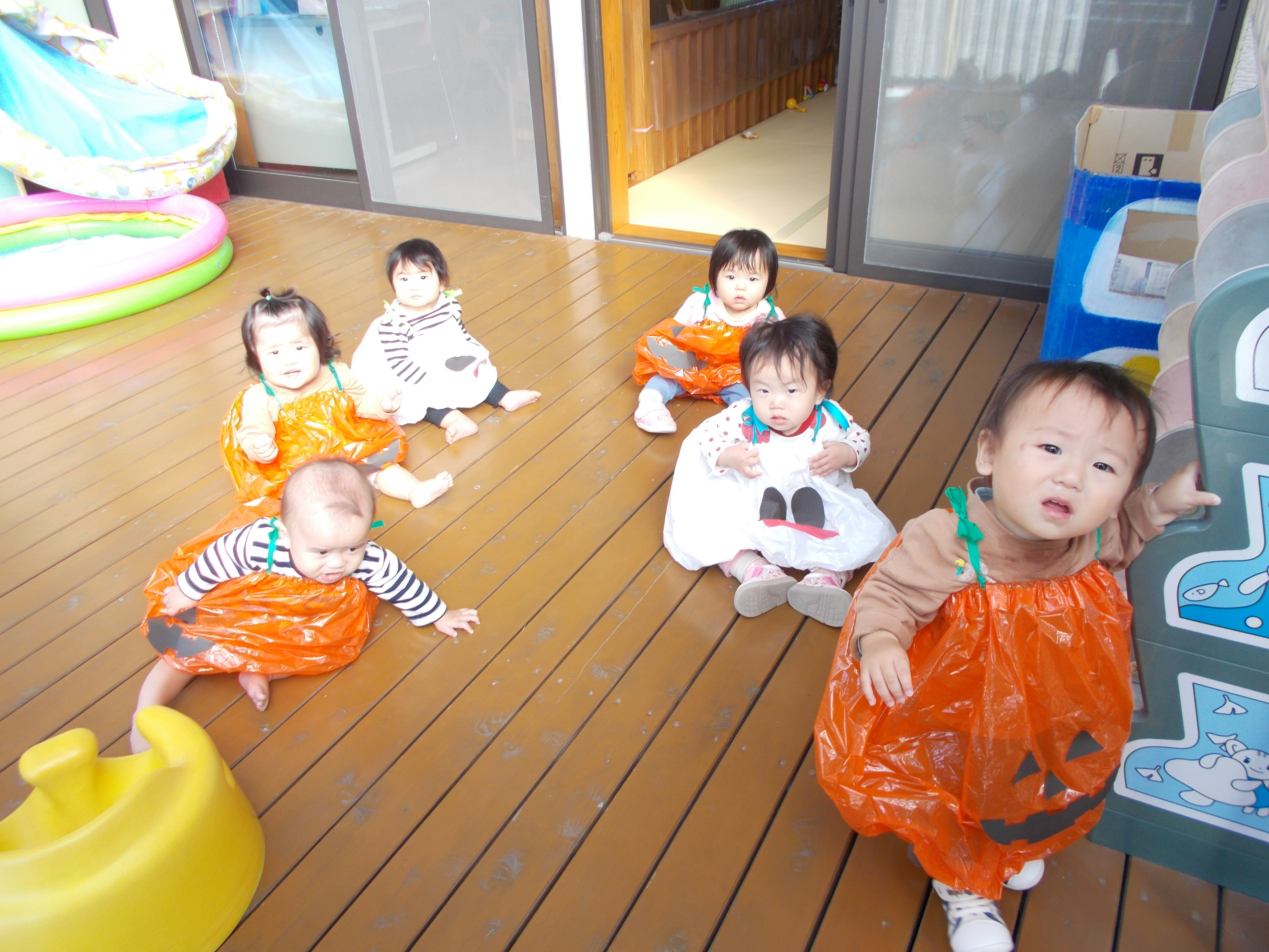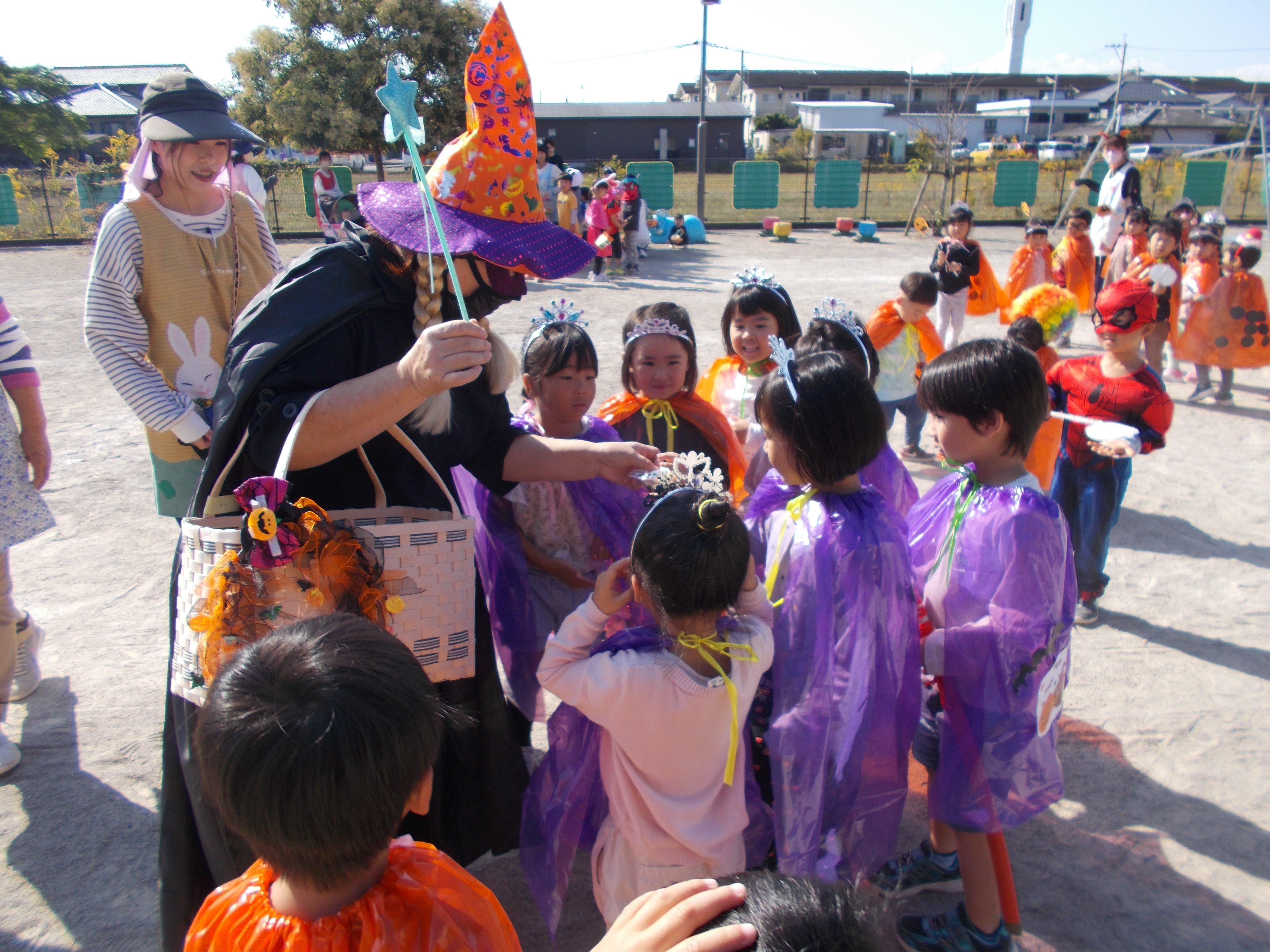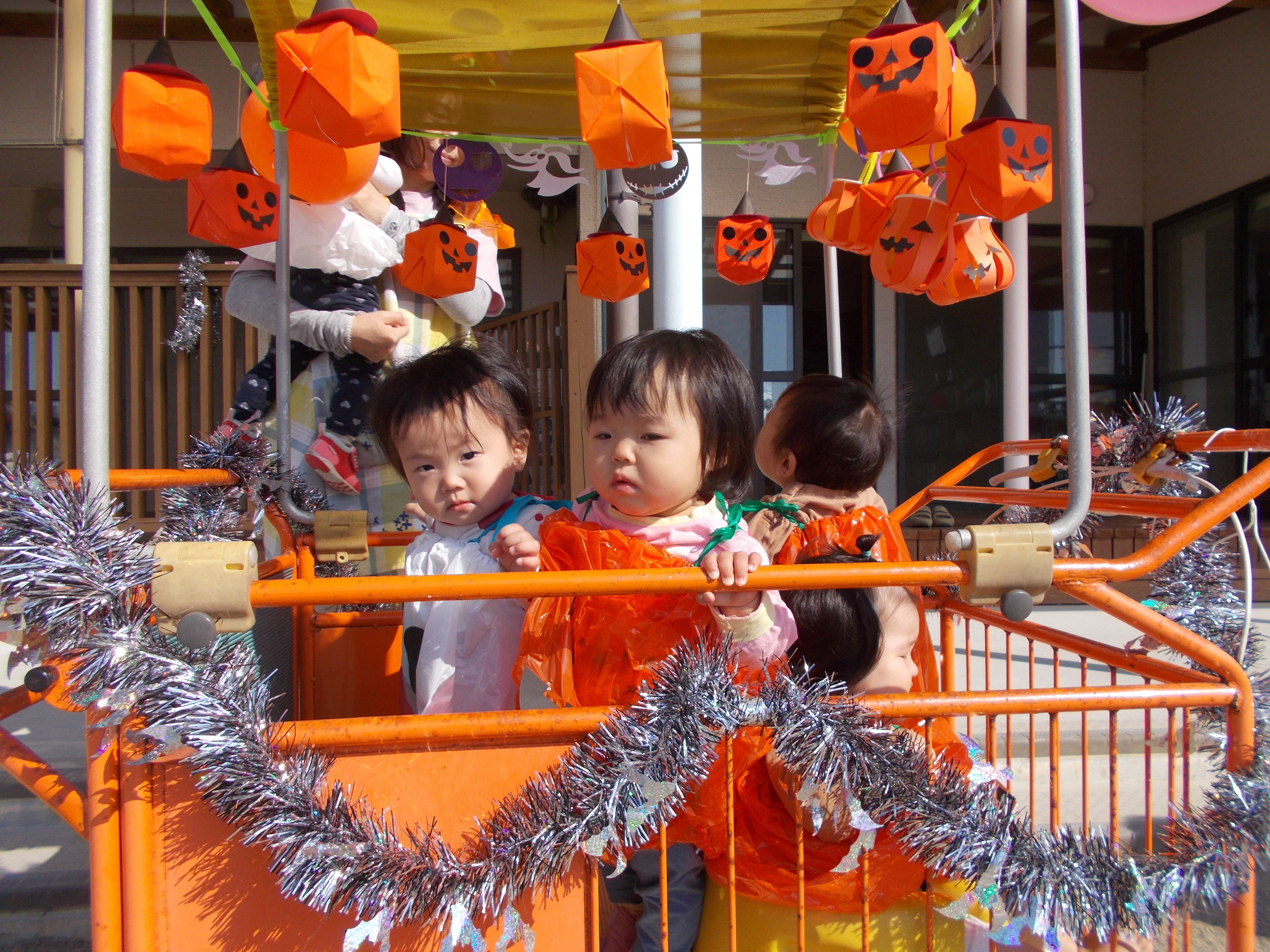 ハロウィン 10月31日(火) ハロウィンパレードを楽しみました。 かわいらしく仮装をして、皆楽しそう(^^♪ 「トリックオアトリート」と保育士に言うとお菓子を貰えるのですが、誰がお菓子を持っているのか分からず、子ども達はみんなで大捜索! 人気の高かったのは、おさげの可愛い魔女さん(*’ω’*) 魔女さんから貰いたいと、集まってました。