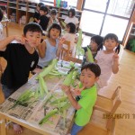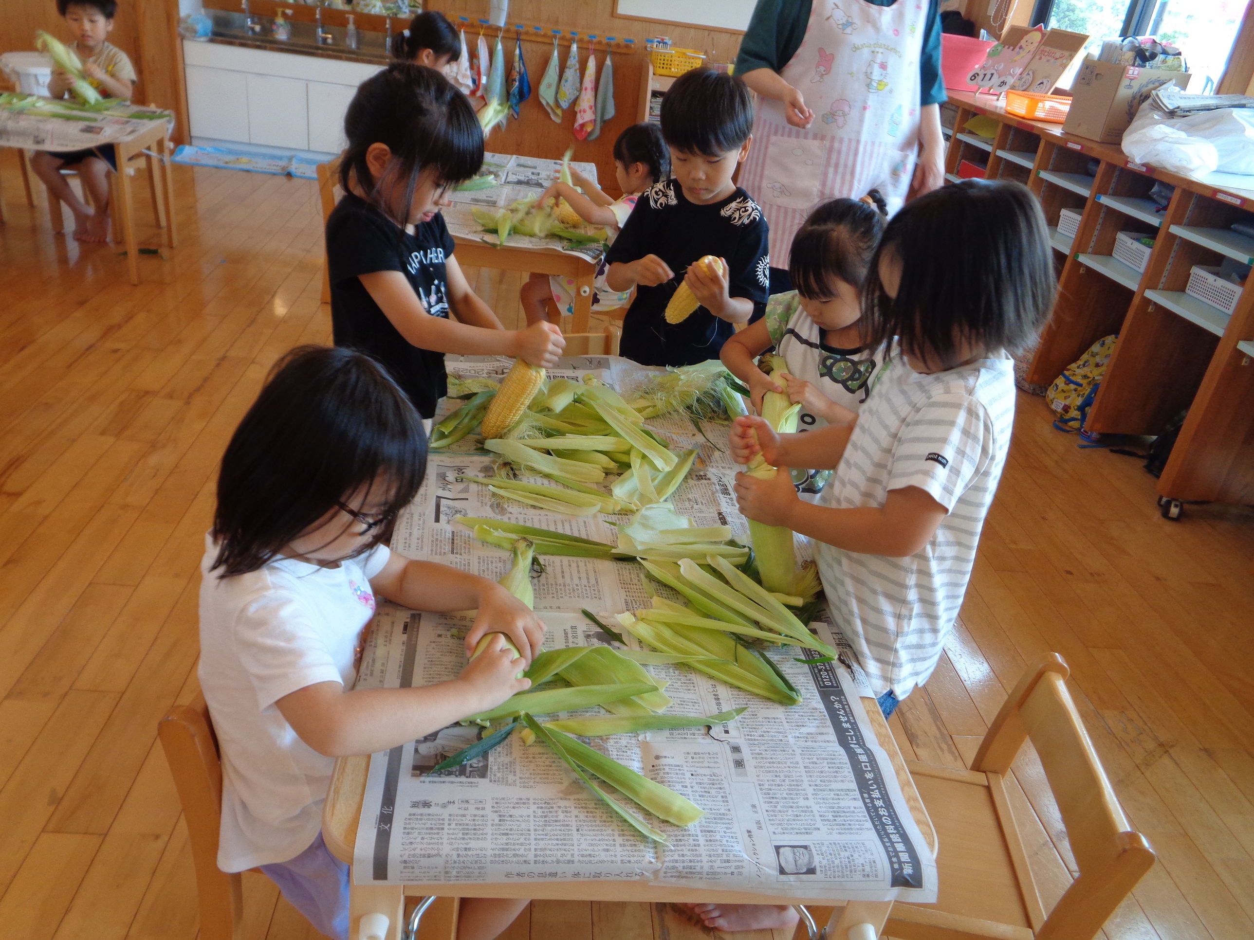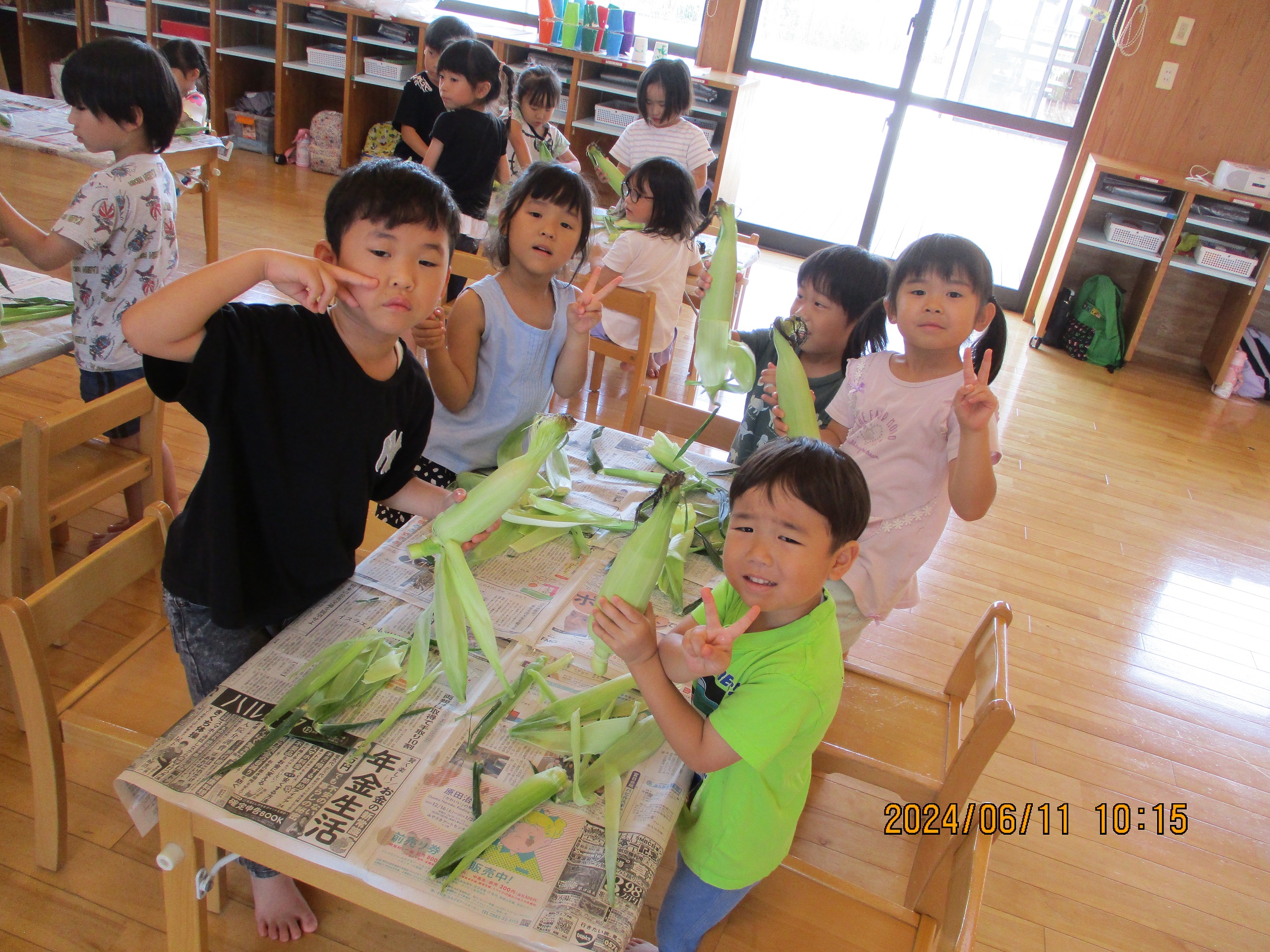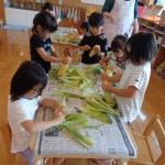 「まだ(トウモロコシ)見えないよ~」「おひげがたくさんあるね~」等、いろんなことを感じながら剥いてくれました。今日のおやつでいただきます♪