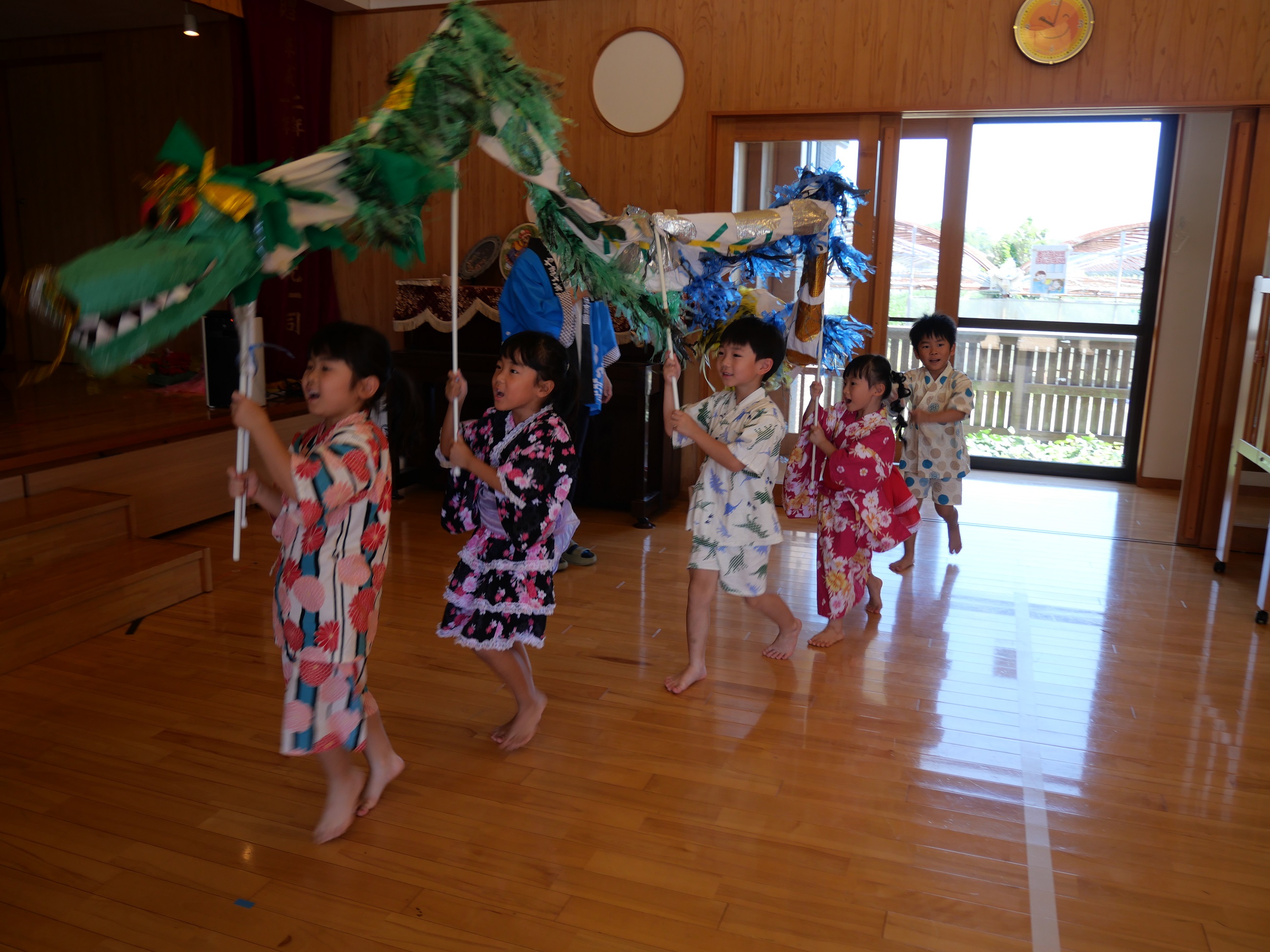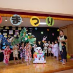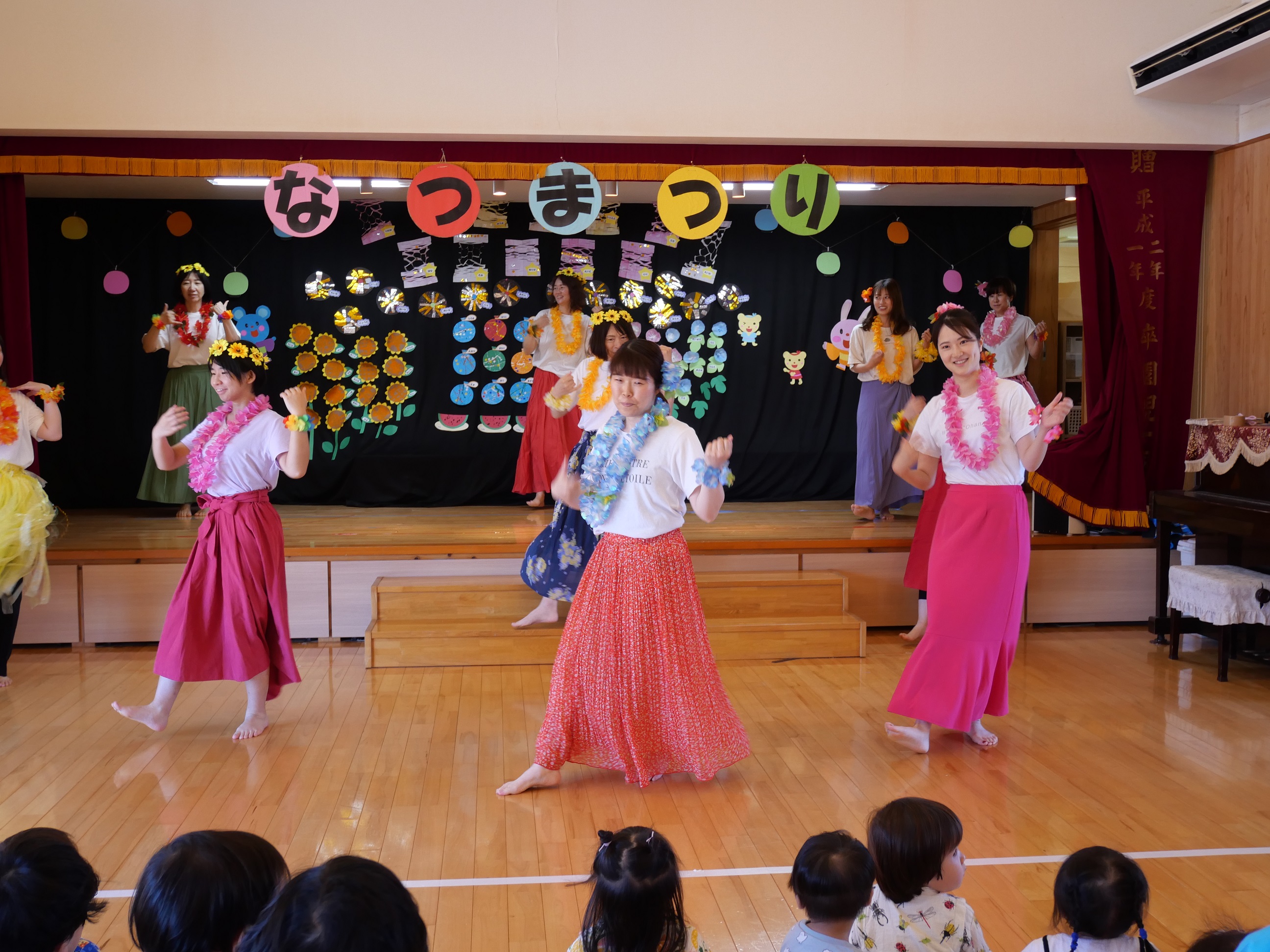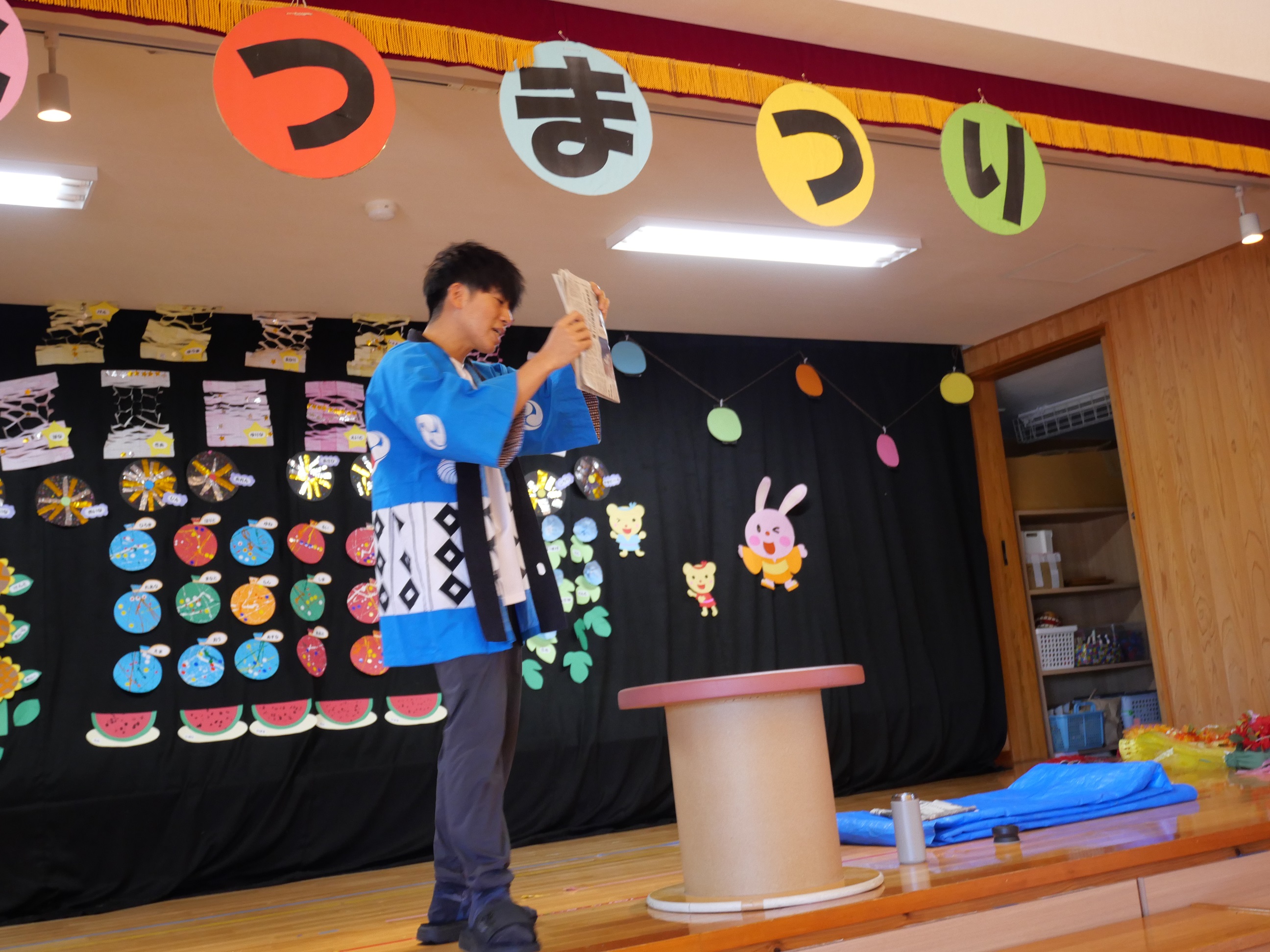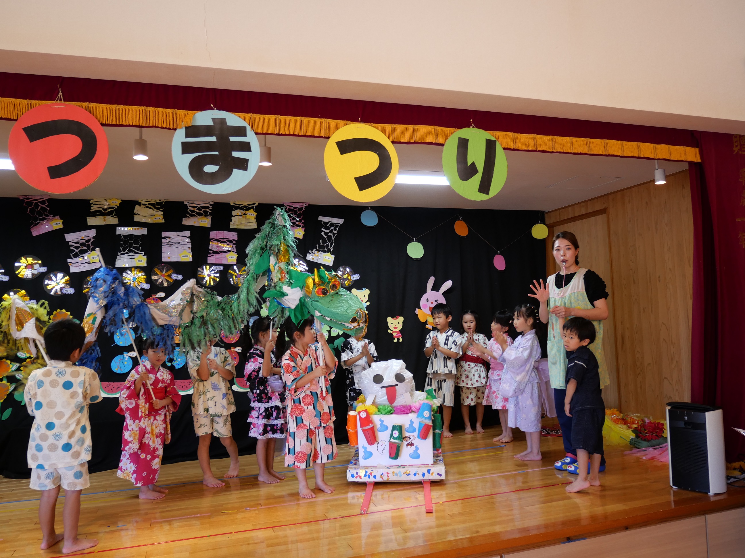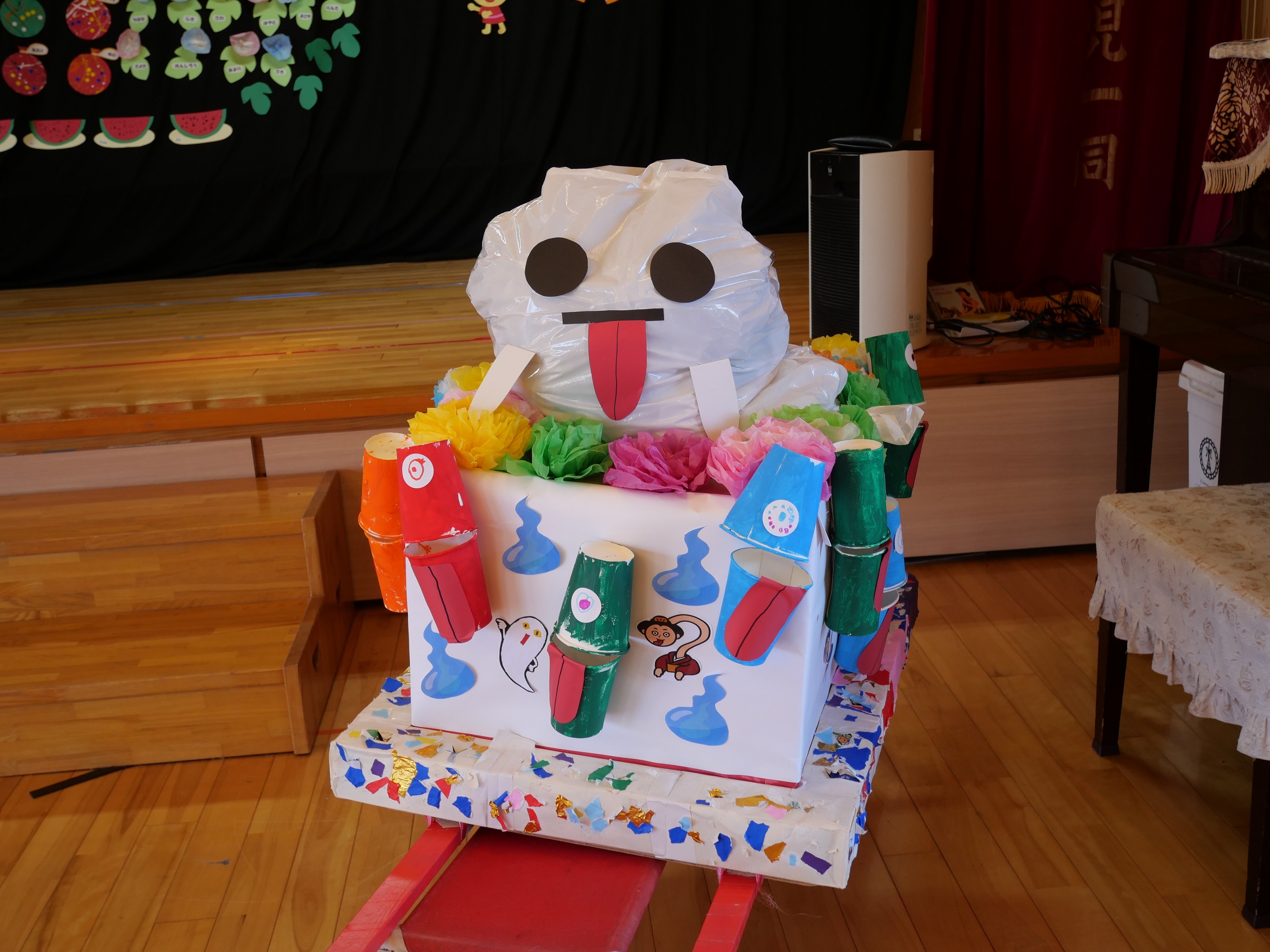 「ワッショイ!!ワッショイ!!」」元気のいい声が園内に響きます♪年長児手作りのおばけのお神輿を担いでお祭りスタートです。先生たちも楽しみながらマジックやフラダンスをして盛り上がりました!!
