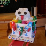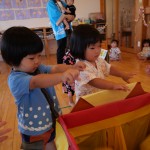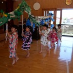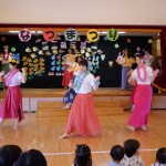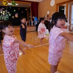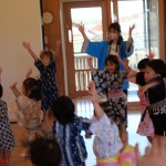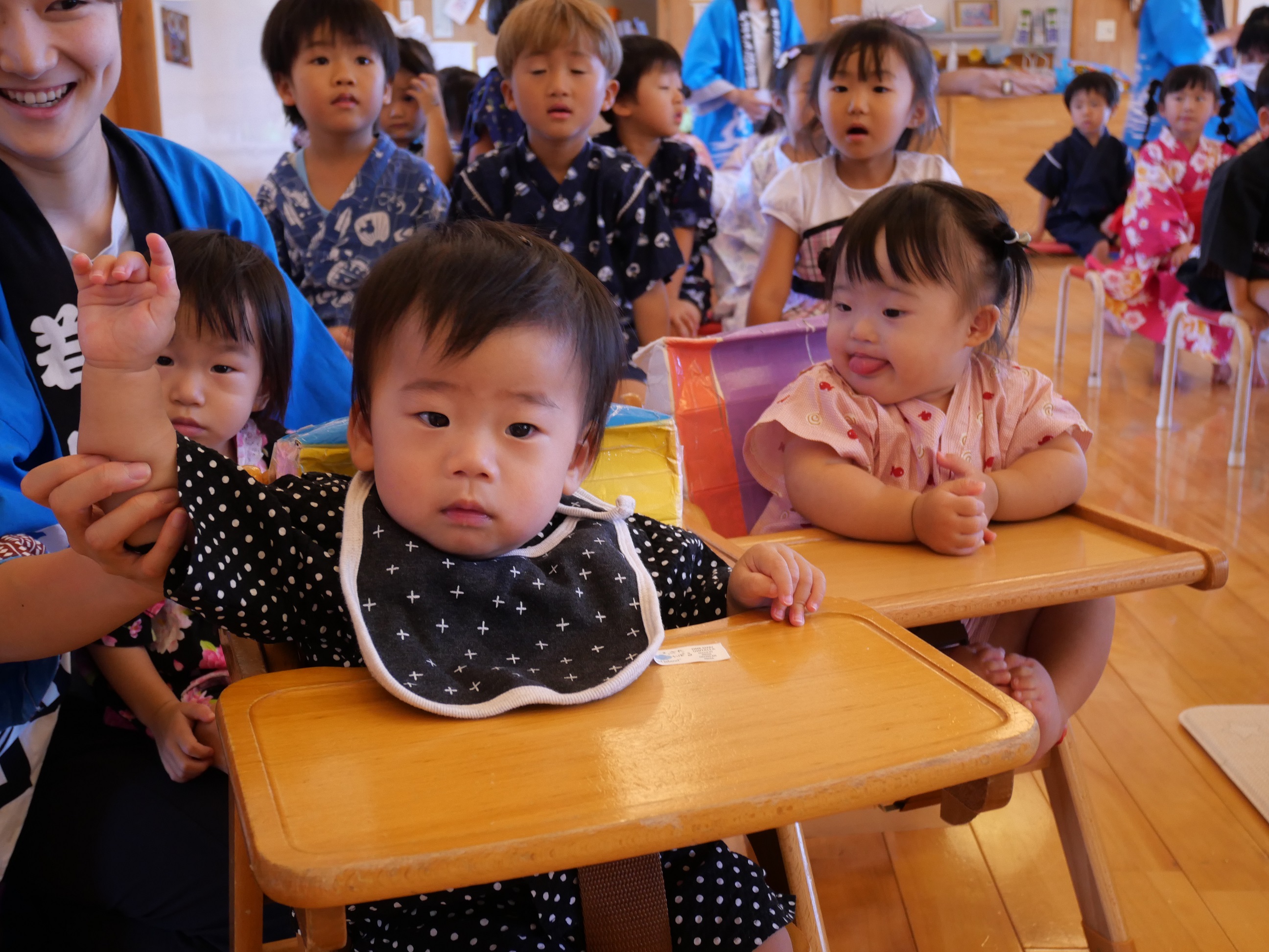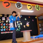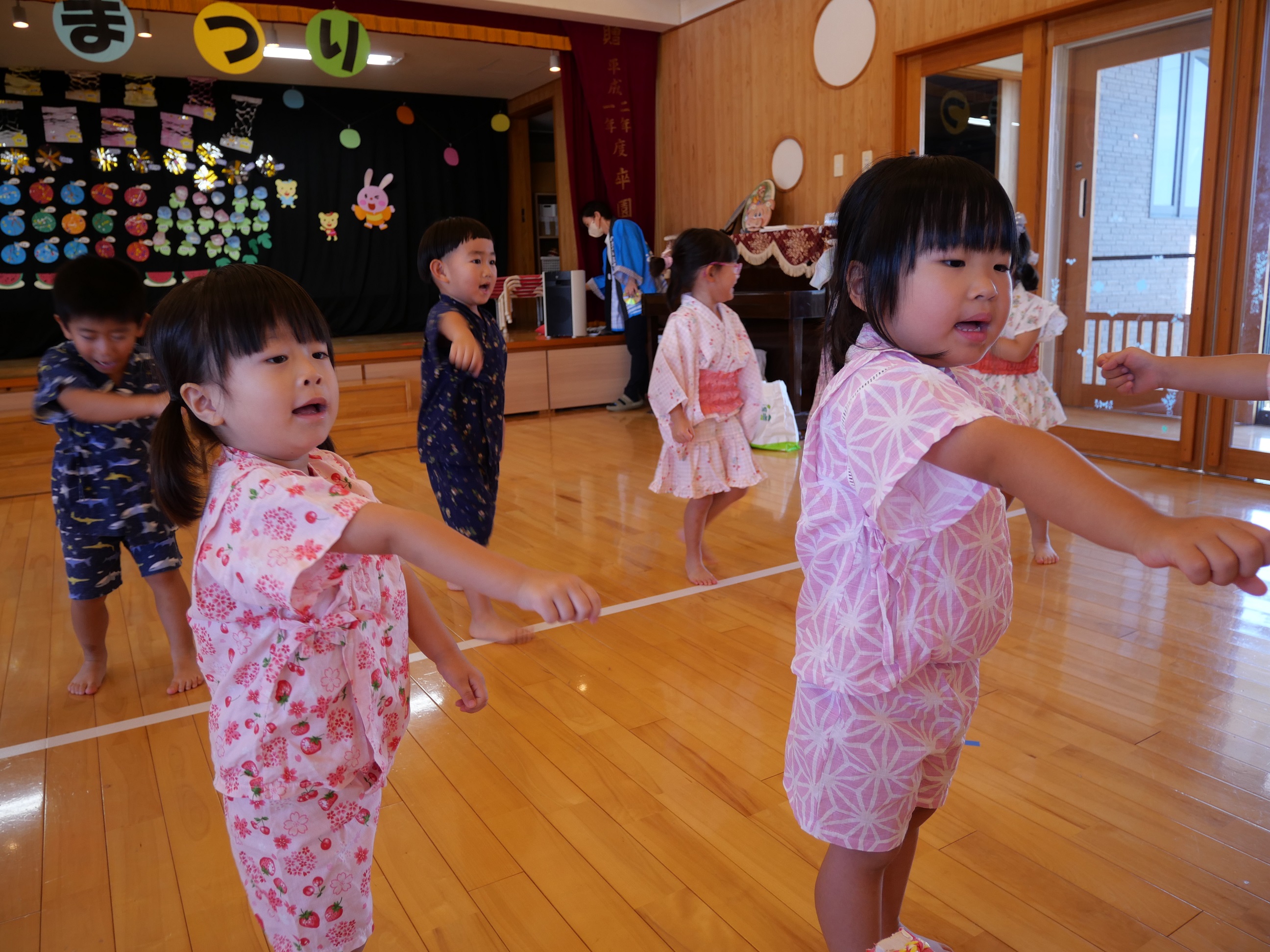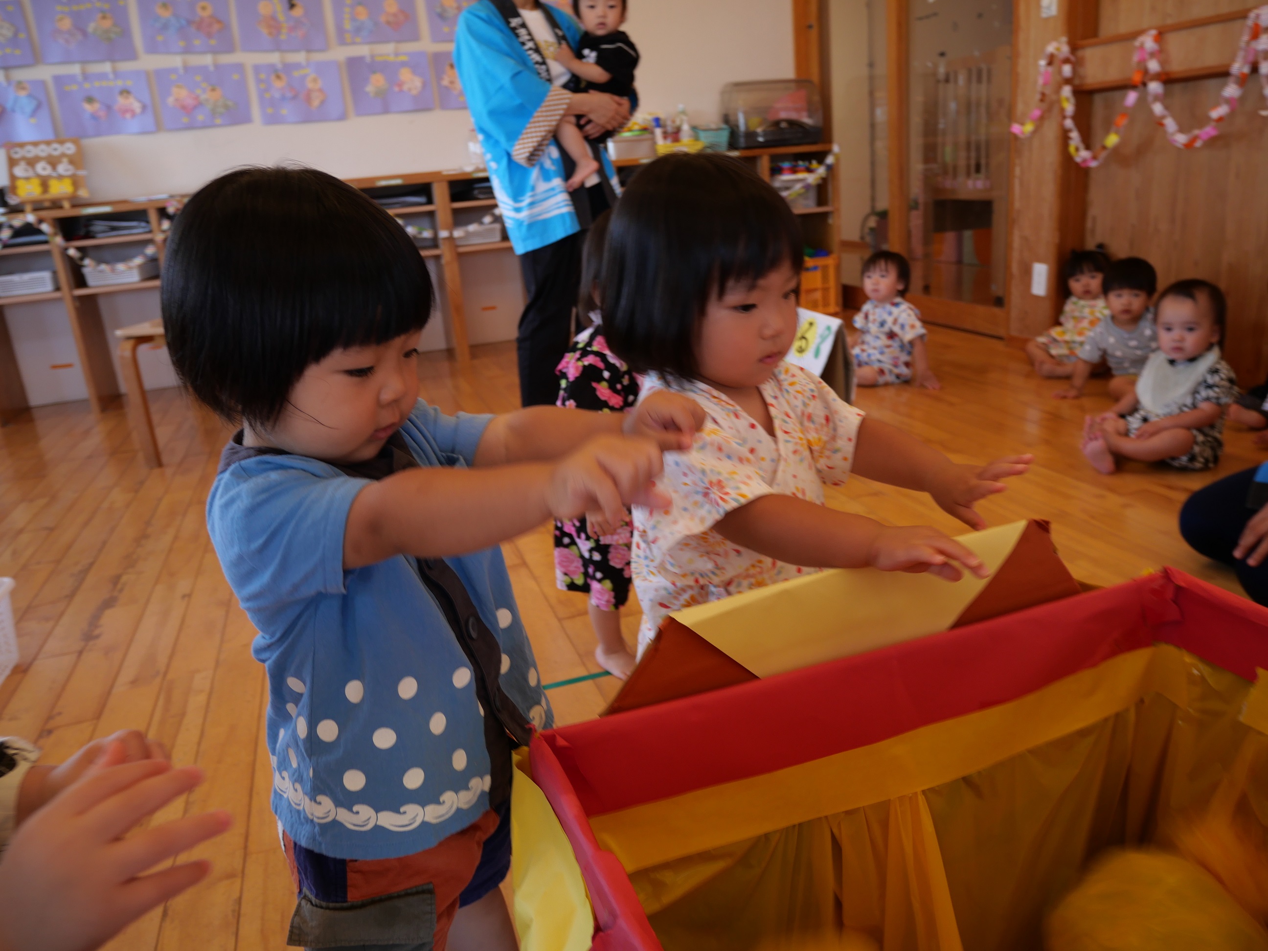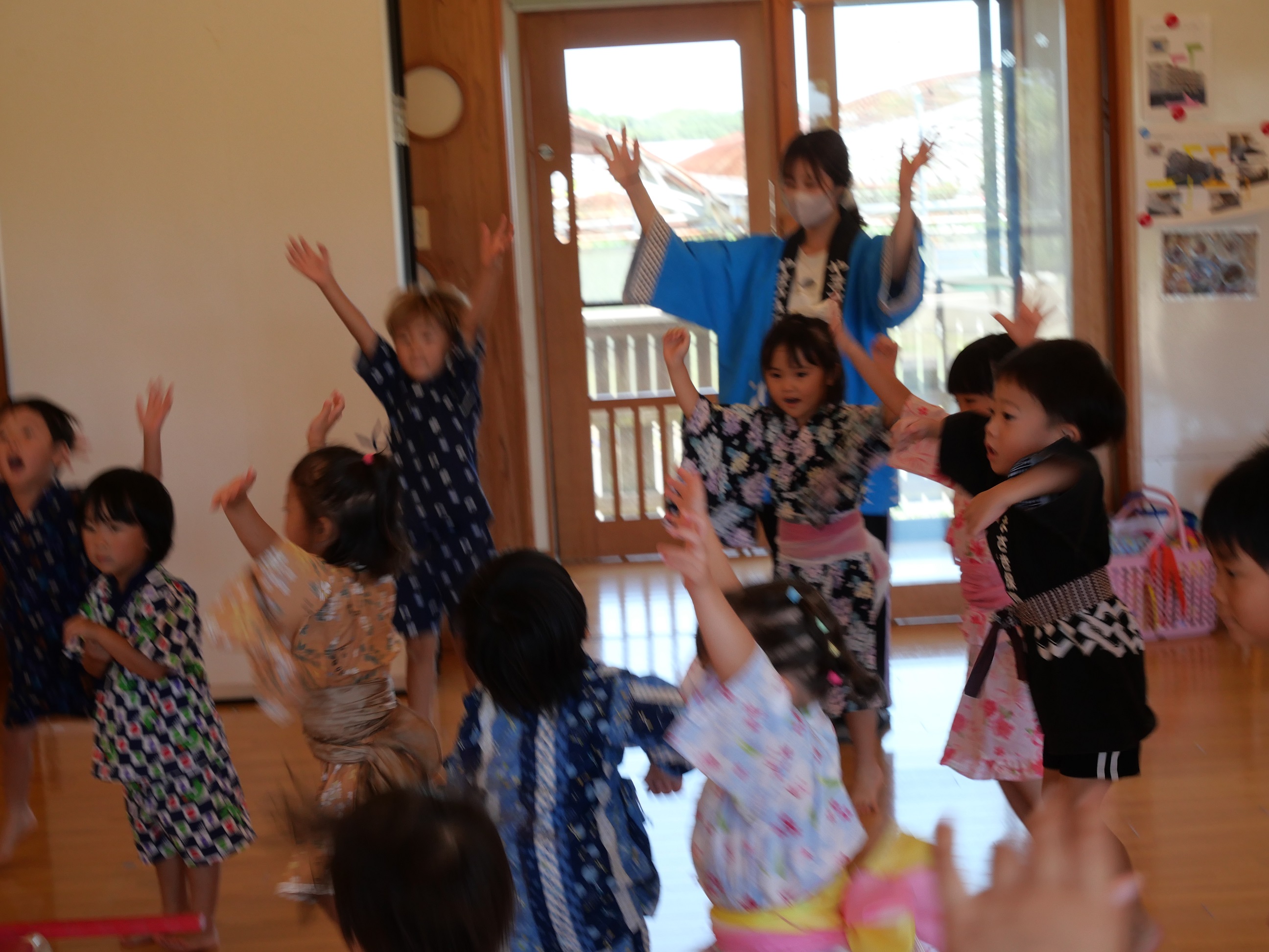 「ワッショイ!!ワッショイ!!」」元気のいい声が園内に響きます♪年長児手作りのおばけのお神輿を担いでお祭りスタートです。先生たちも楽しみながらマジックやフラダンスをして盛り上がりました!!