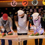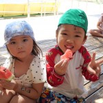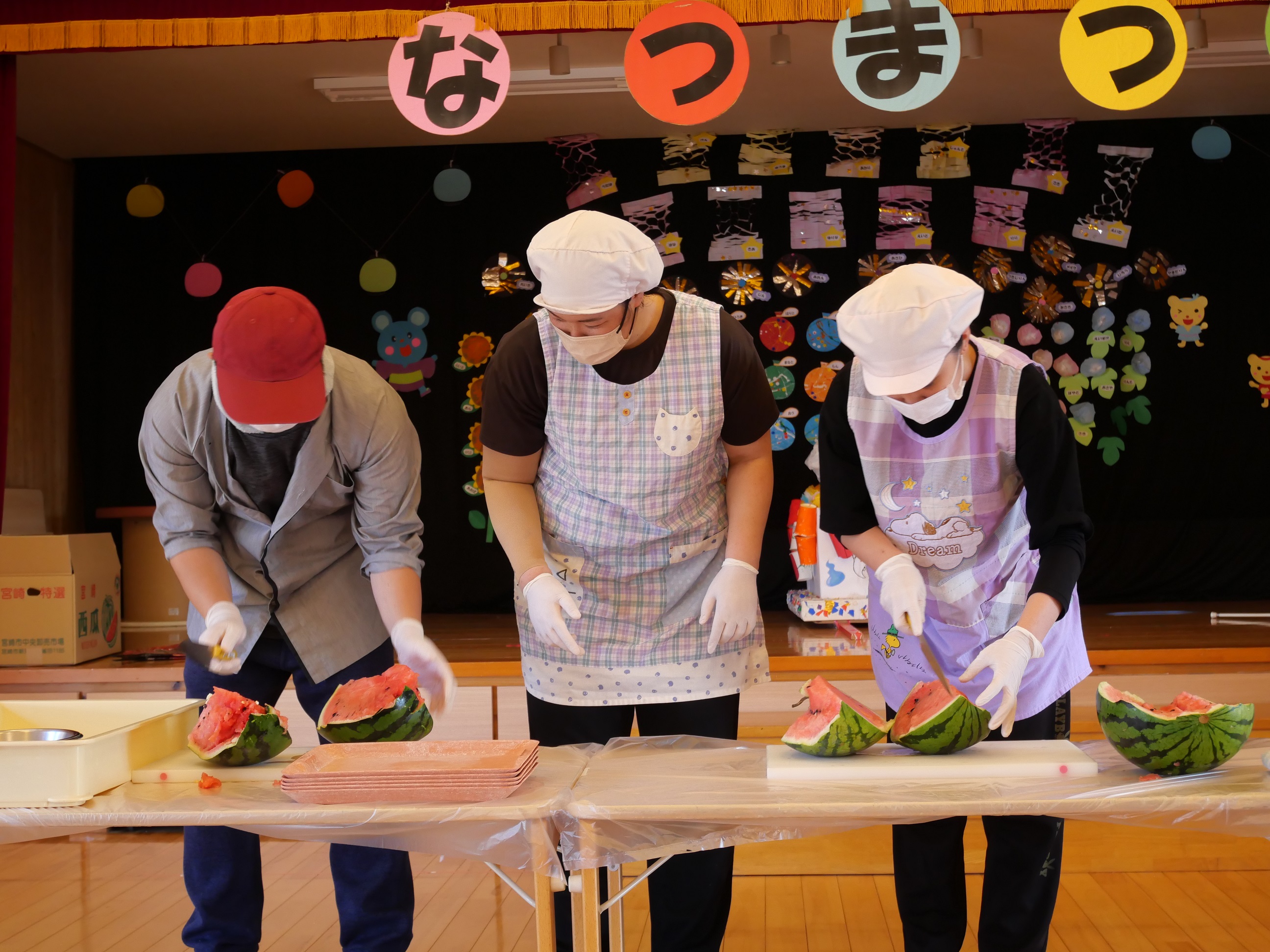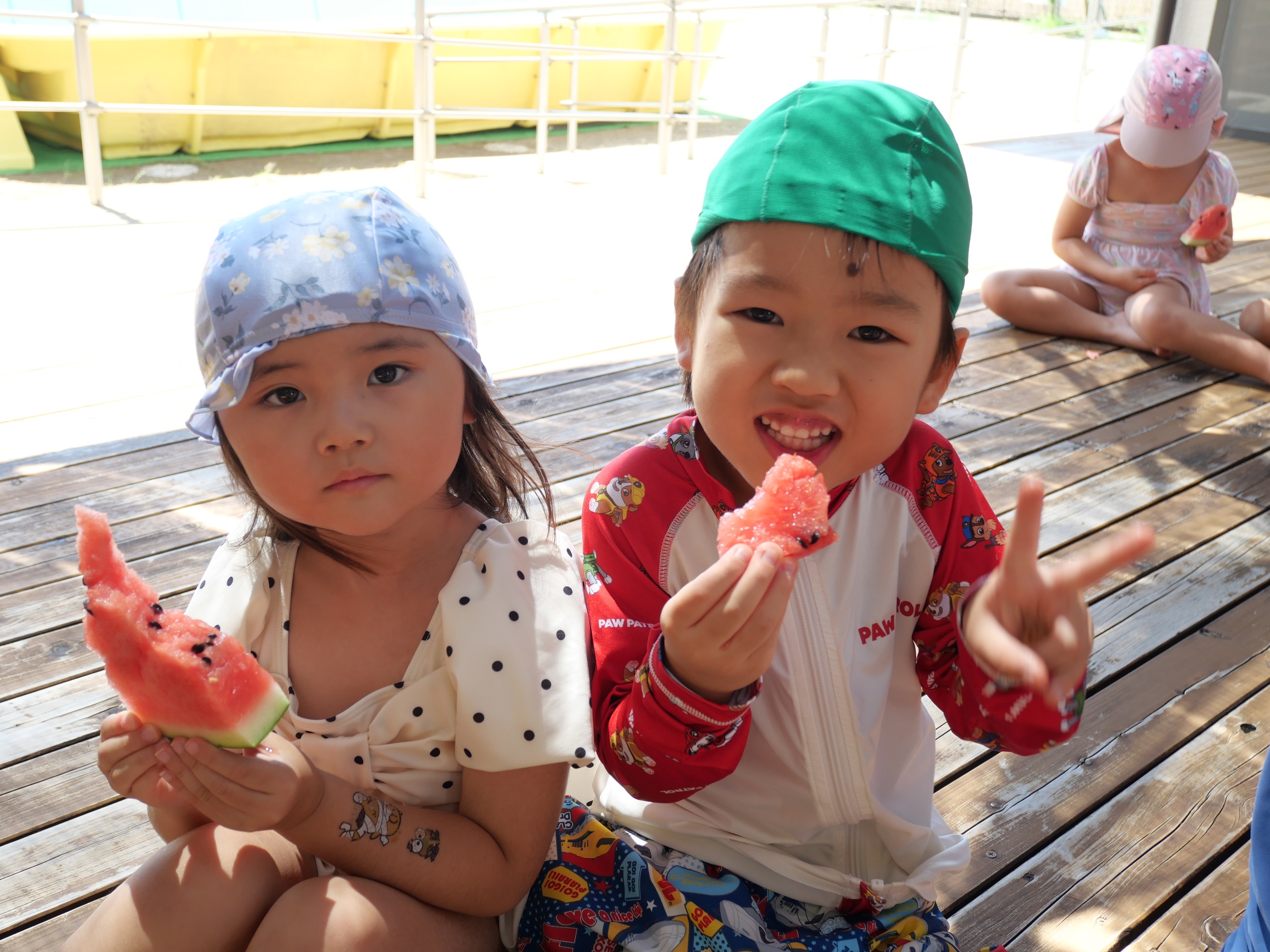 プール開き 7月9日(火) 今日は待ちに待ったプール開き✨まずは、みんなでスイカわりを行いました。目標を定めて”エイッ”!!いつ割れるのかドキドキでしたね。割ったすいかは給食先生が手際よくカットしてくれ美味しく頂きました。プール遊びも水しぶきをあげ「楽しいね~」と笑顔の子ども達でした。