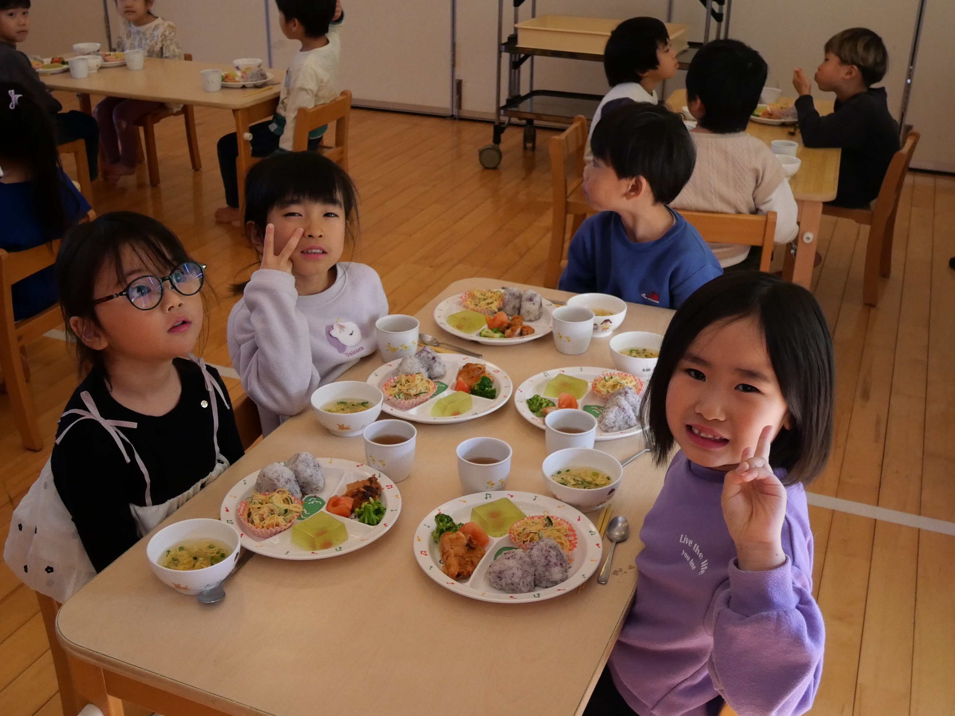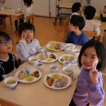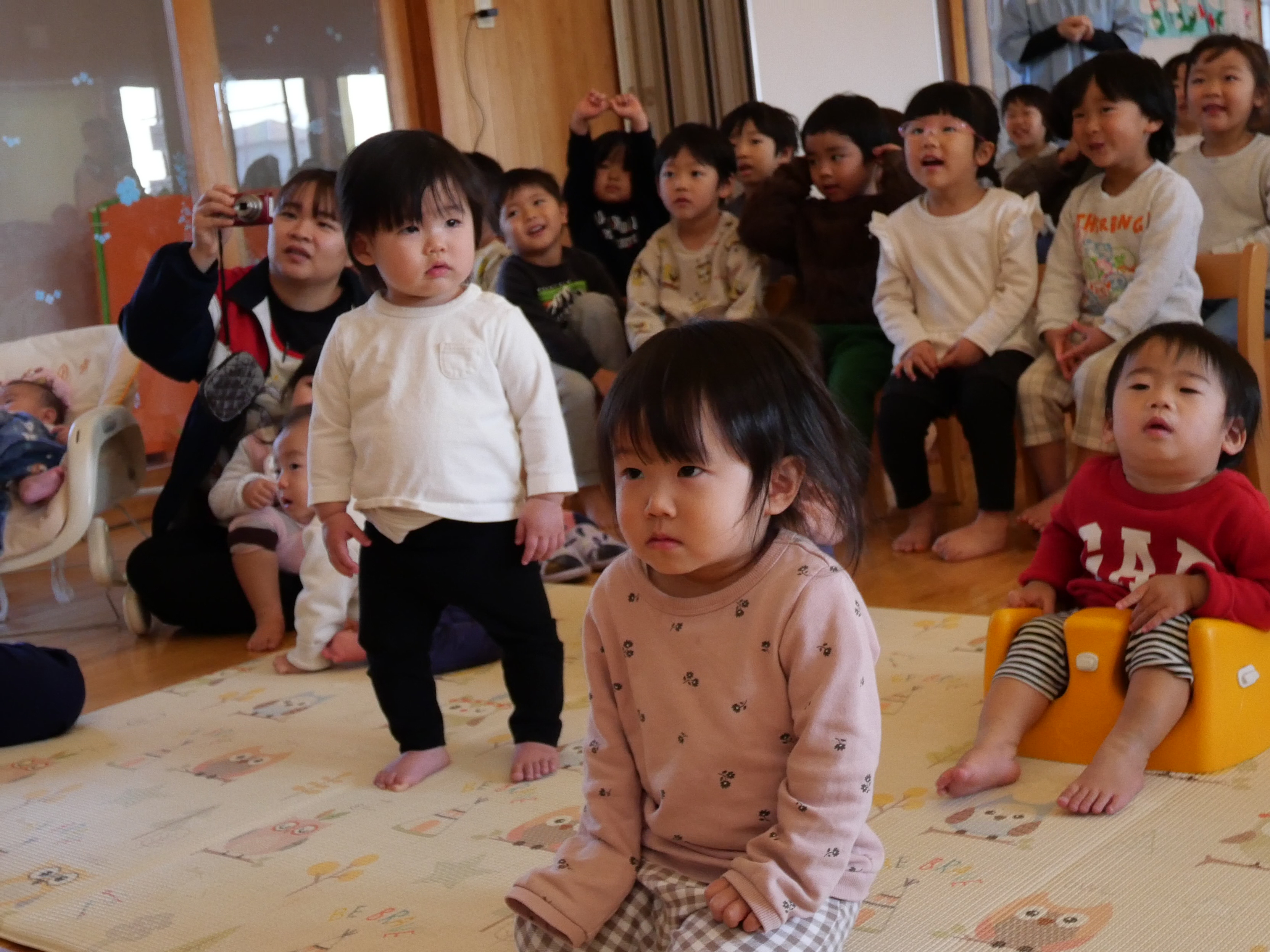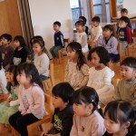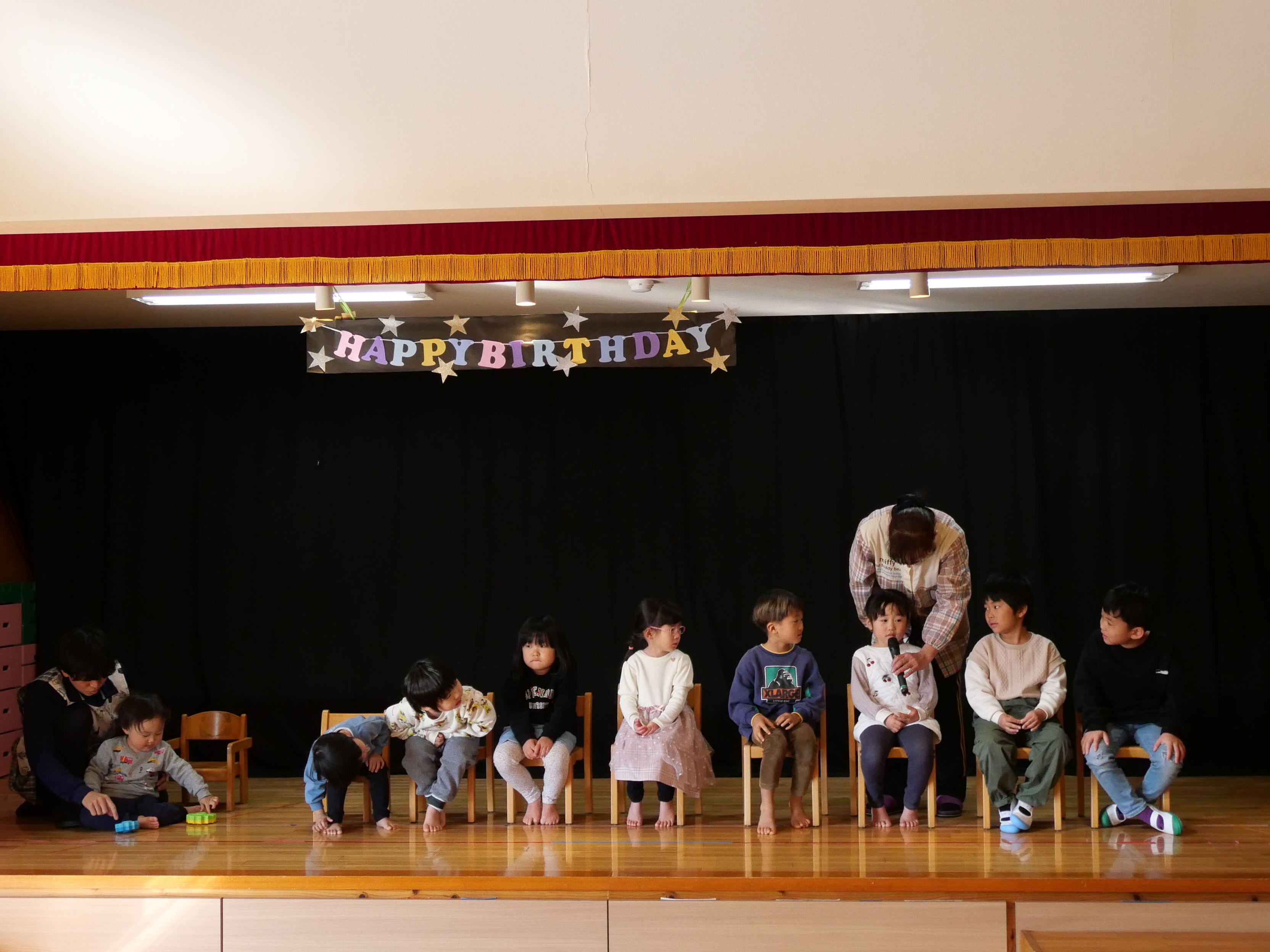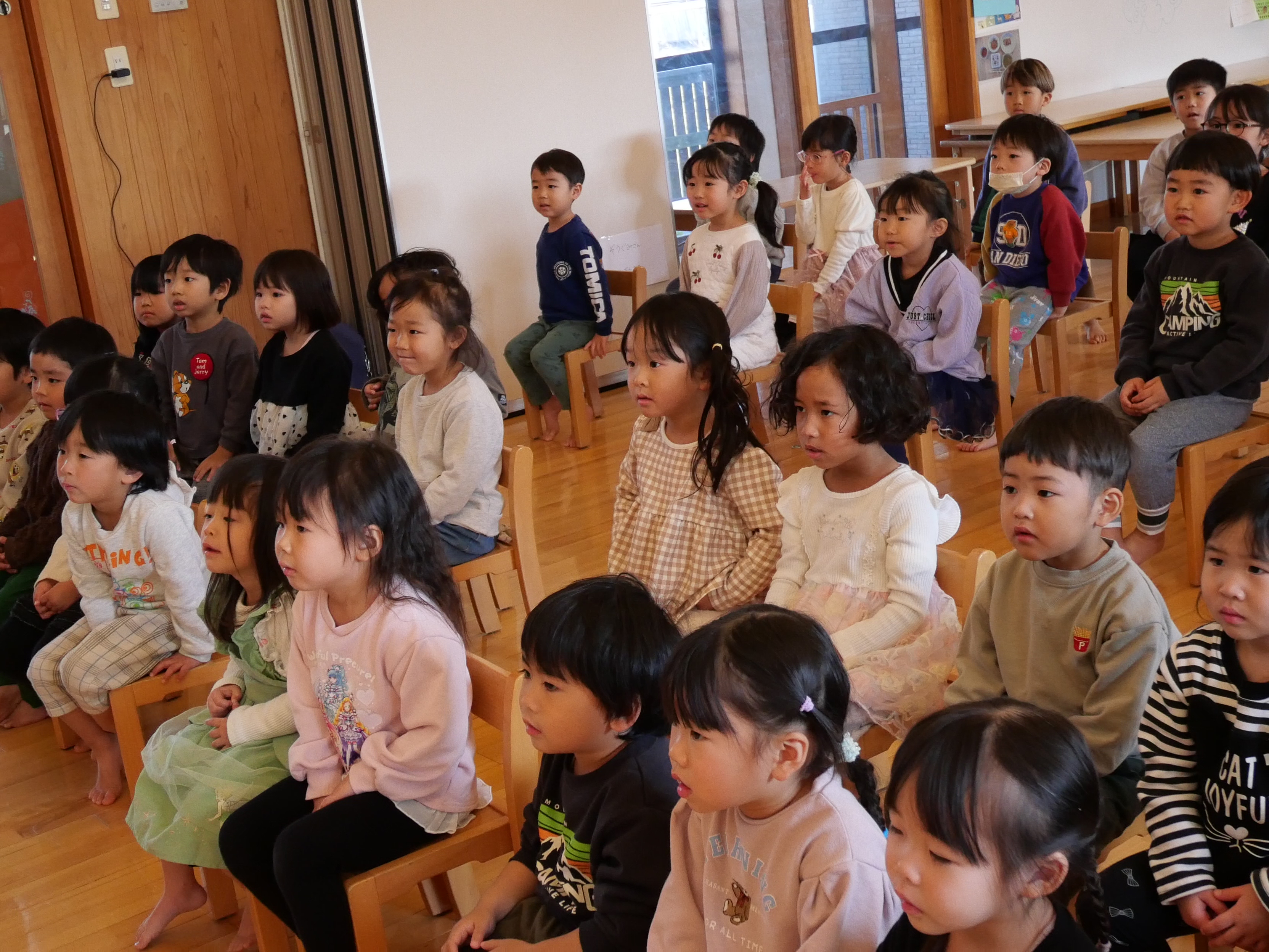 1月の誕生会 1月22日(水) 今月は9名のお友だちがお誕生日を迎えました。先生たちによる出し物は毎回楽しみで仕方のない子ども達。(密かに先生たちも・・・(笑))マジックショーは「なんでかな~」「すげ~」と目を丸くして見ています。劇も釘付け。小さいお友だちも真剣ですね。