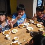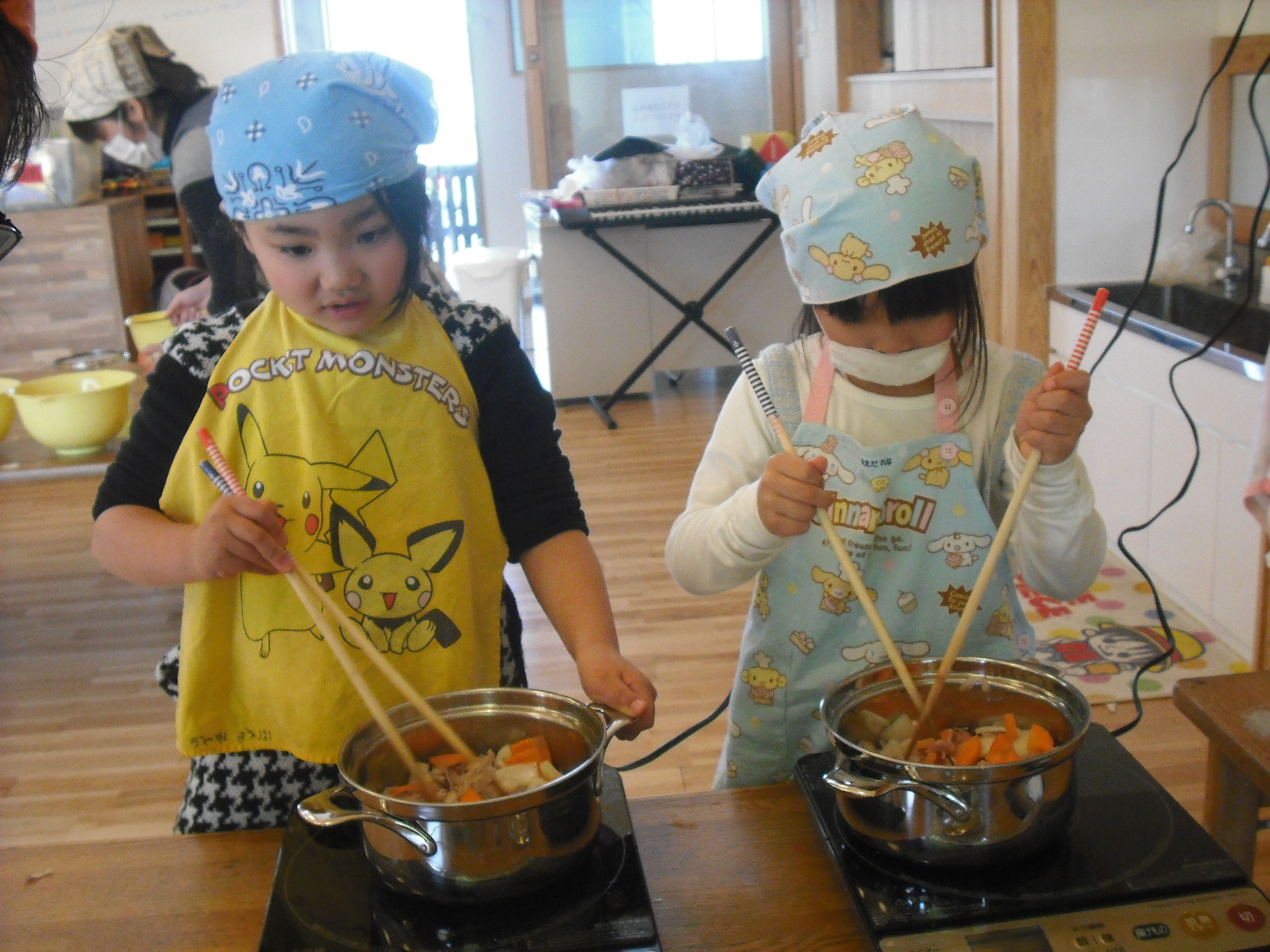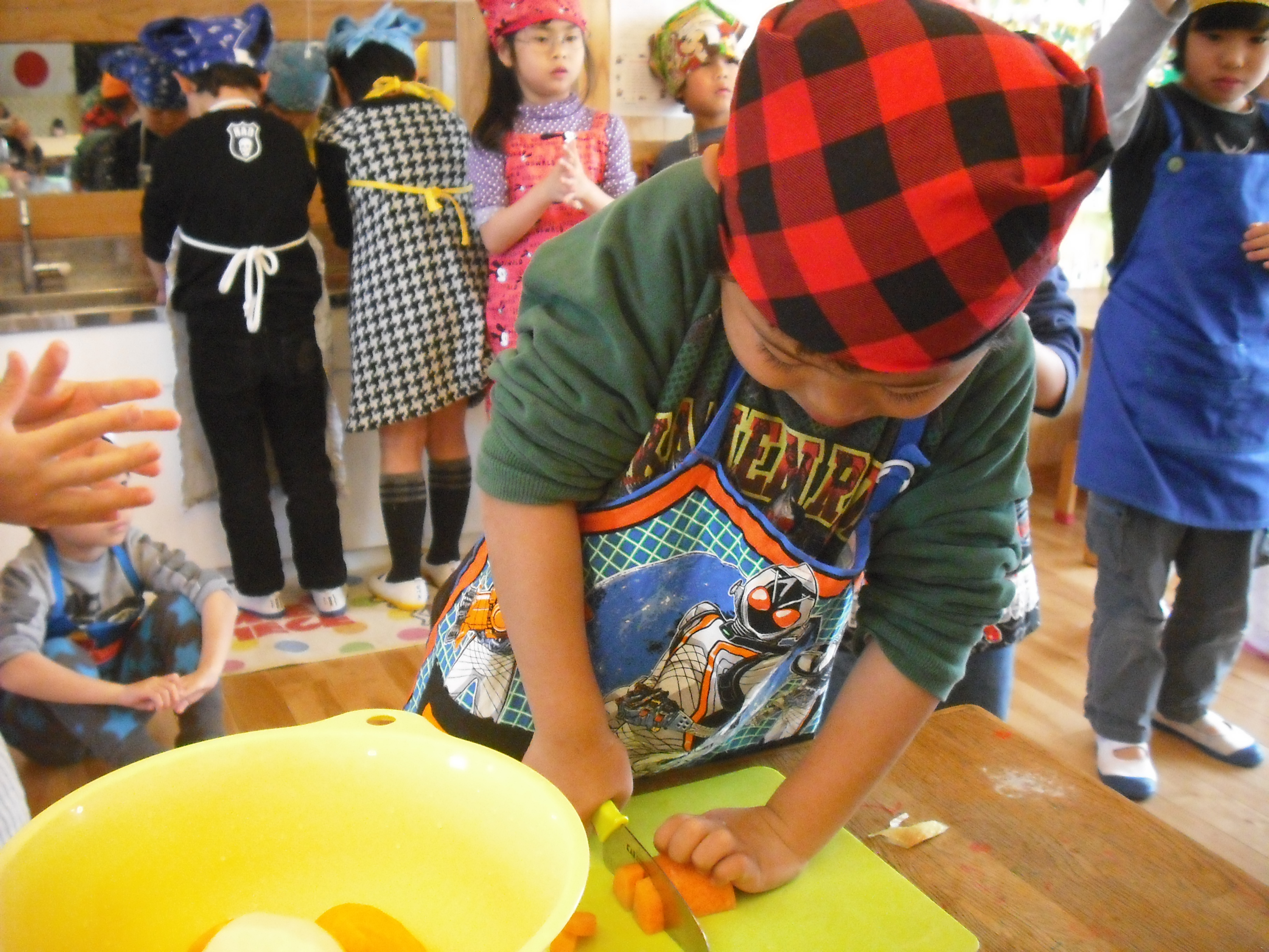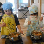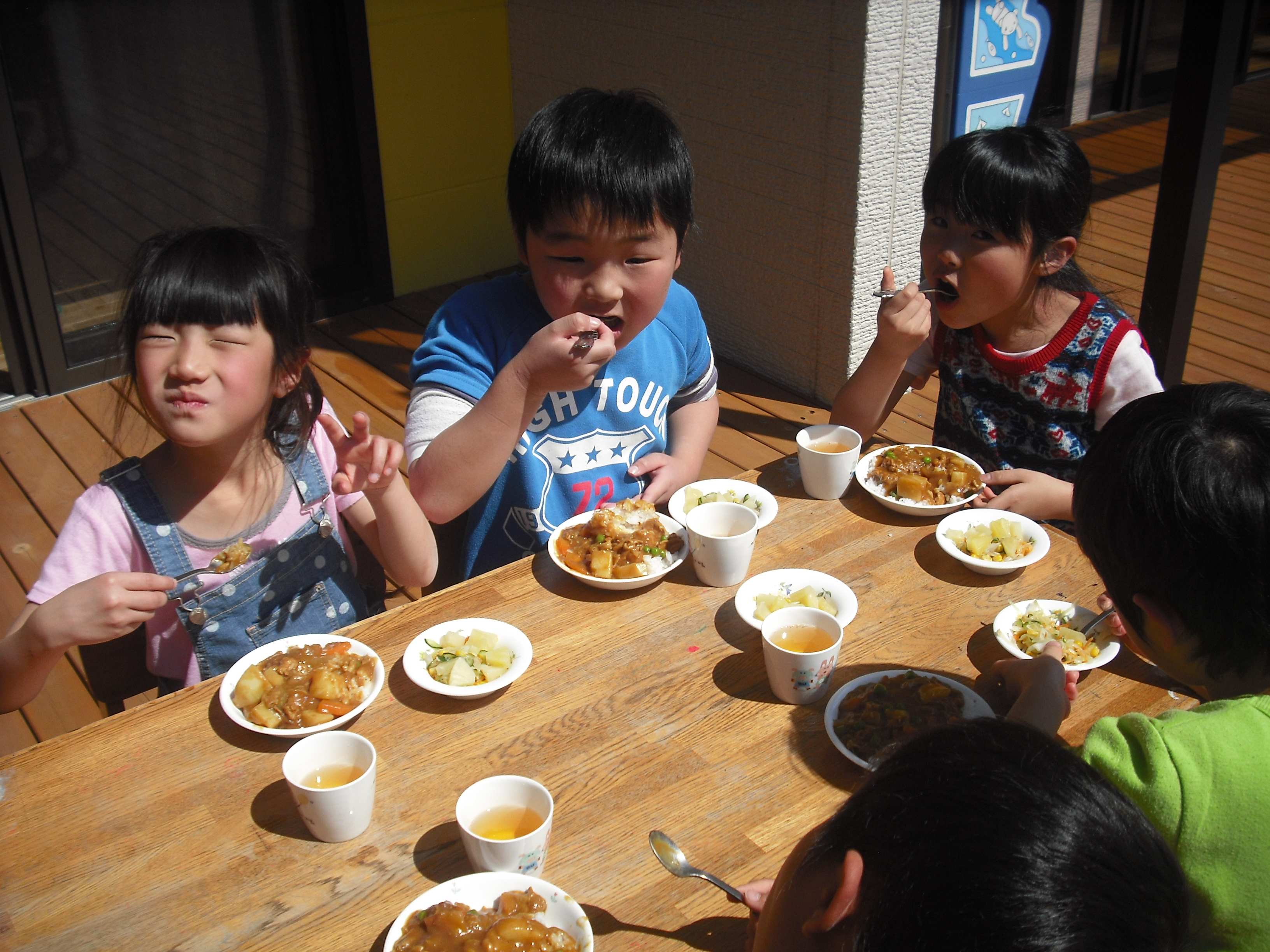 お別れ会(カレー作り) 3月13日(木) きりん組さんは、お別れ会で『カレー作り』を行いました。 じゃがいもの皮をむいたり、人参を切ったり・・・お家でお手伝いをしているのかな? みんなとっても上手でしたよ。 切った野菜を鍋で炒めて、カレールーで煮込んで、いい匂いがしてきましたね~♪ ウッドデッキで、出来上がったカレーをみんなで美味しくいただきました。楽しい思い出ができましたね。