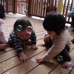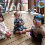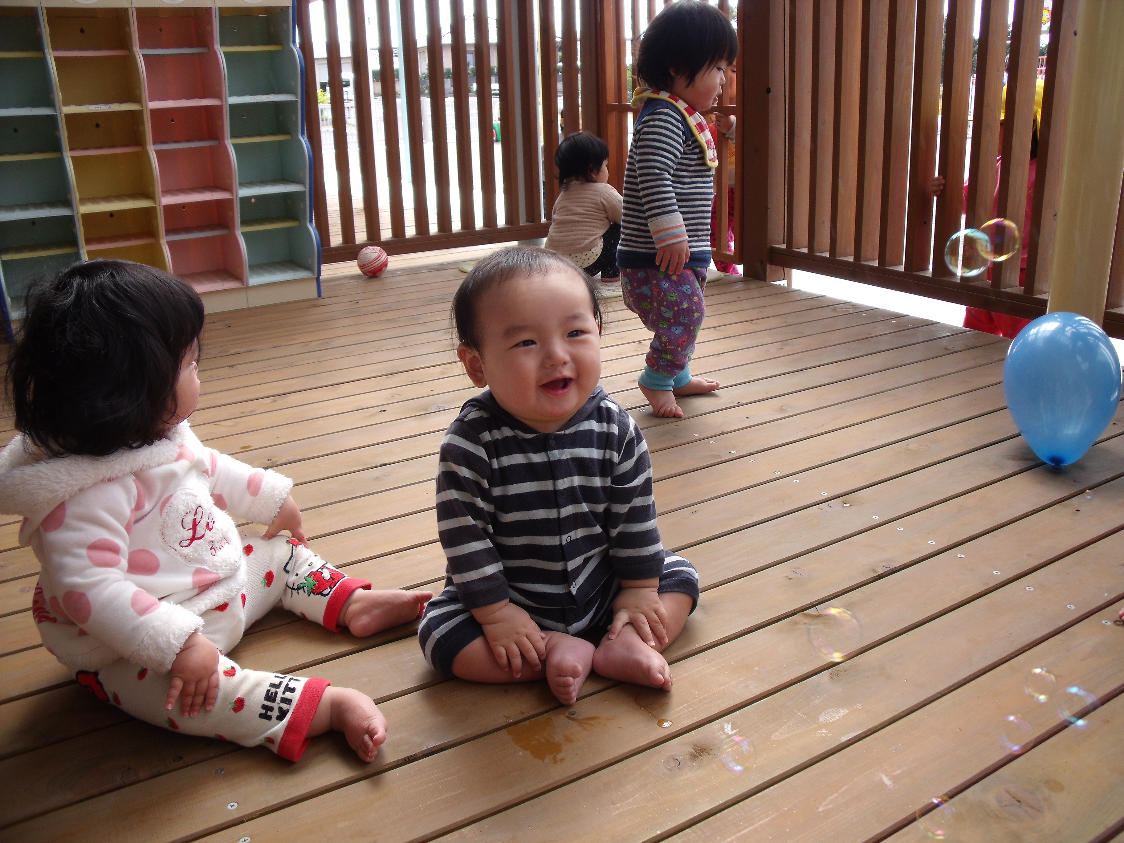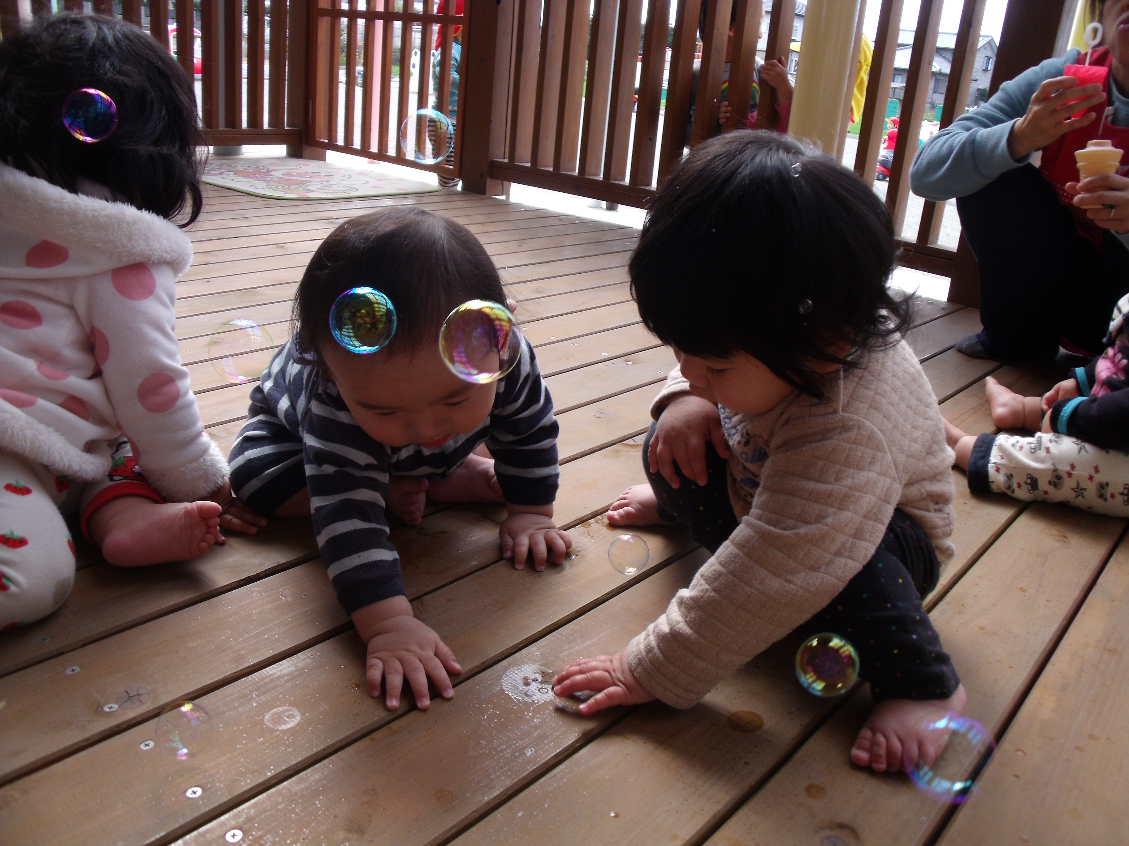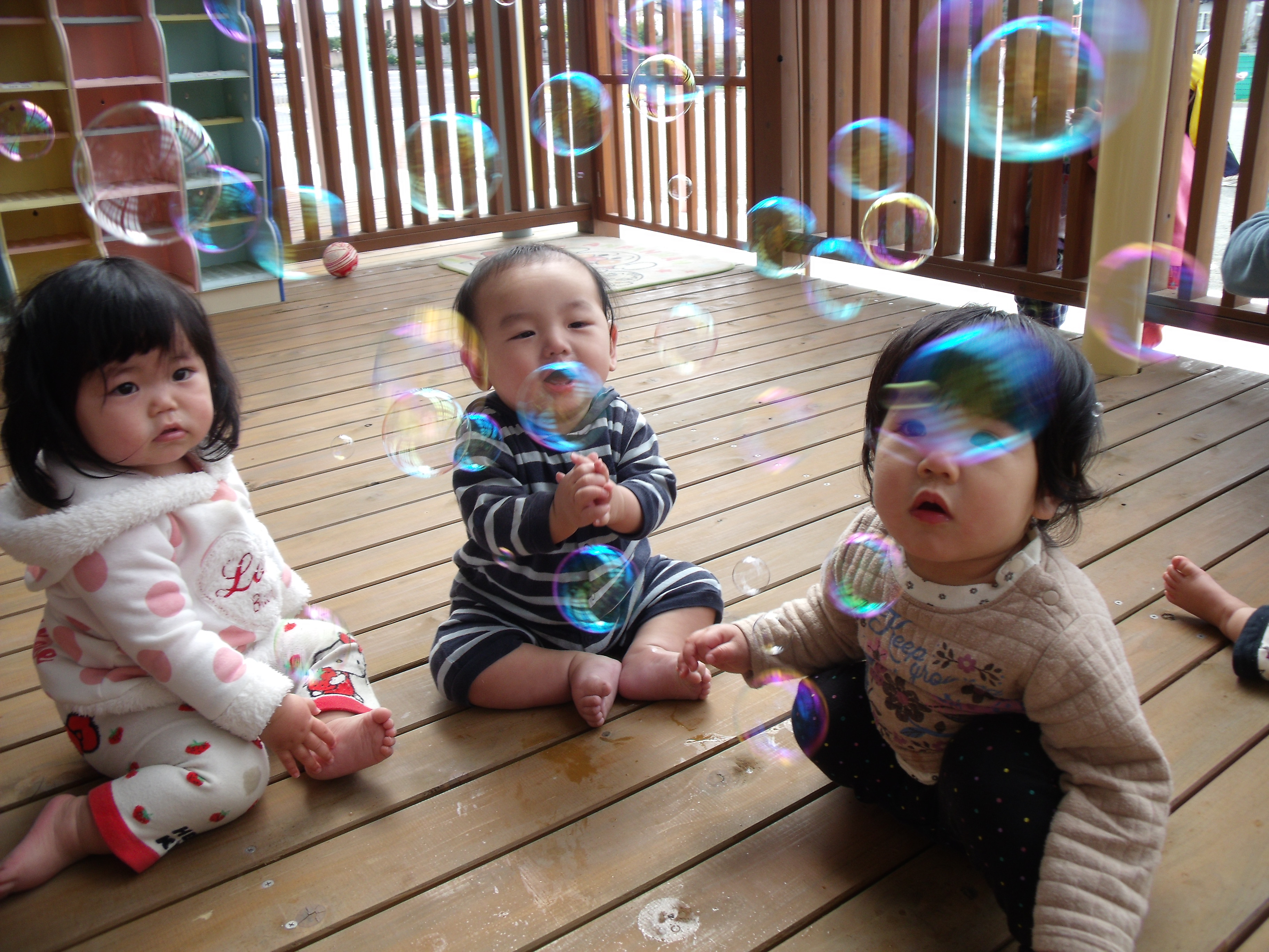 シャボン玉 3月14日(金) だんだん春らしくなってきましたね。 ひよこ組さんは、ウッドデッキでシャボン玉遊びを行いました。 キラキラ光る不思議な玉が浮いているよ~。手を伸ばしてつかまえようとしたら・・・パチンと割れて消えてしまいました。あれ?どこにいったのかな。不思議だね。