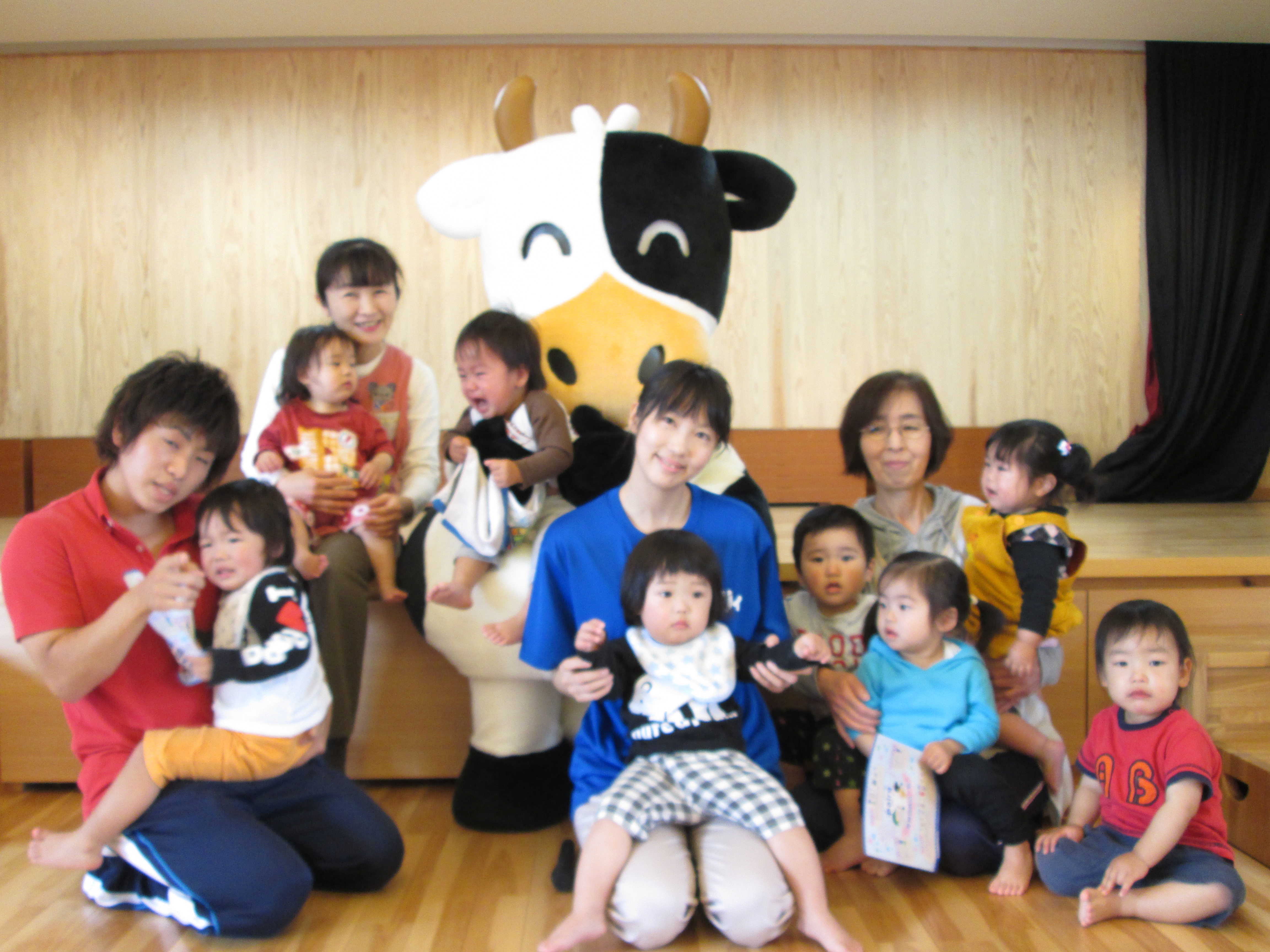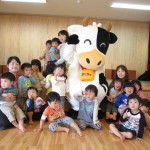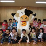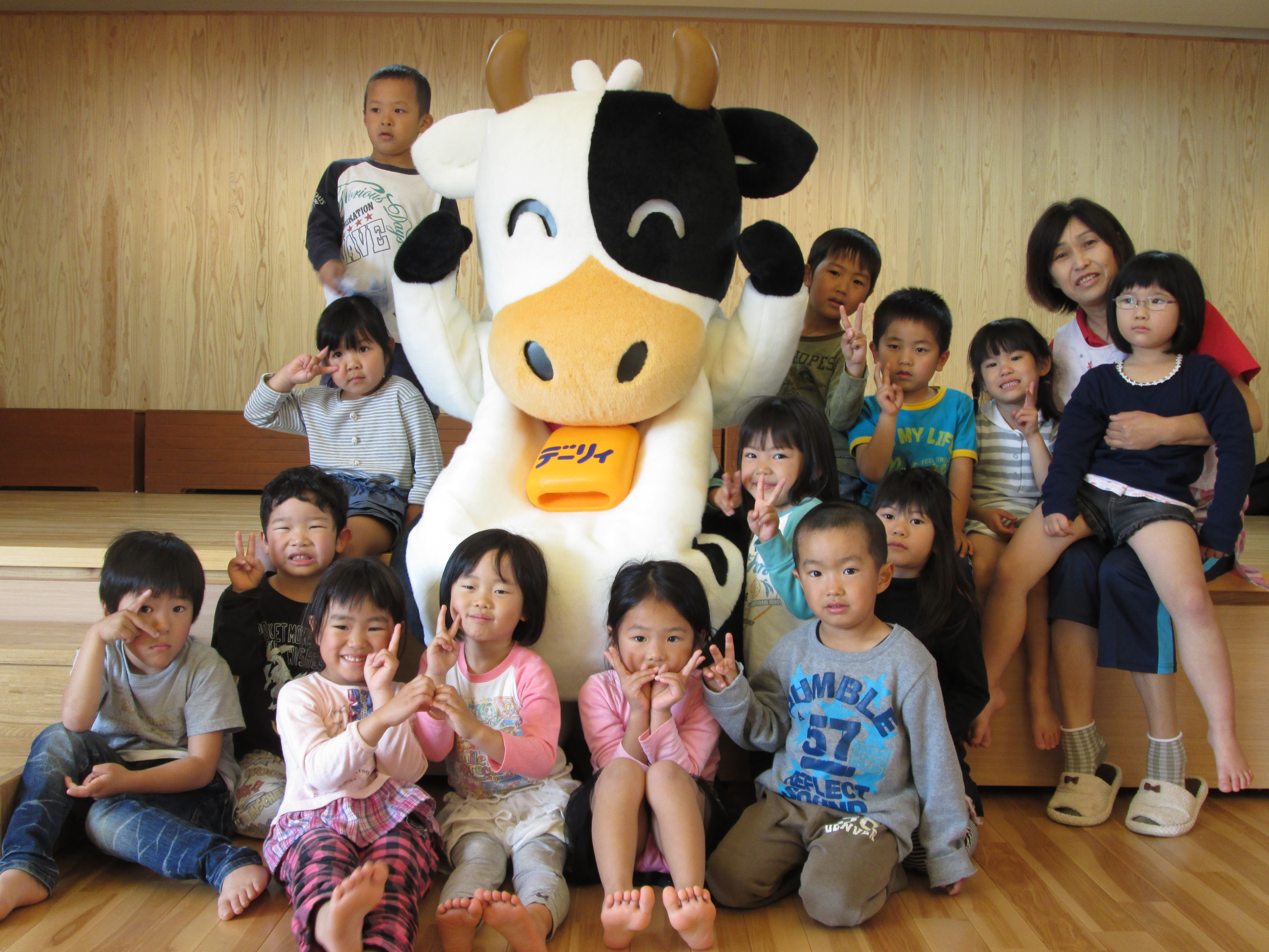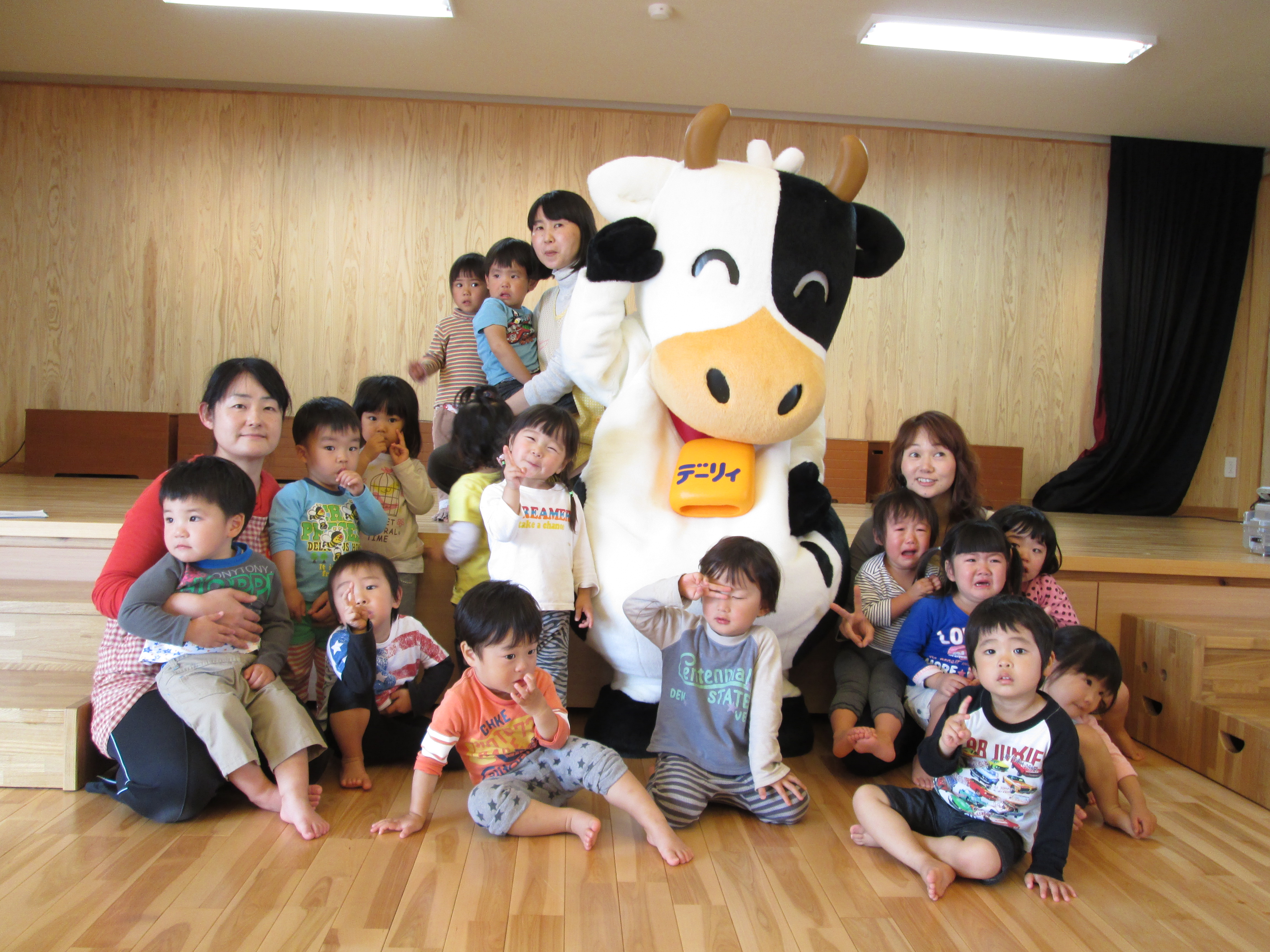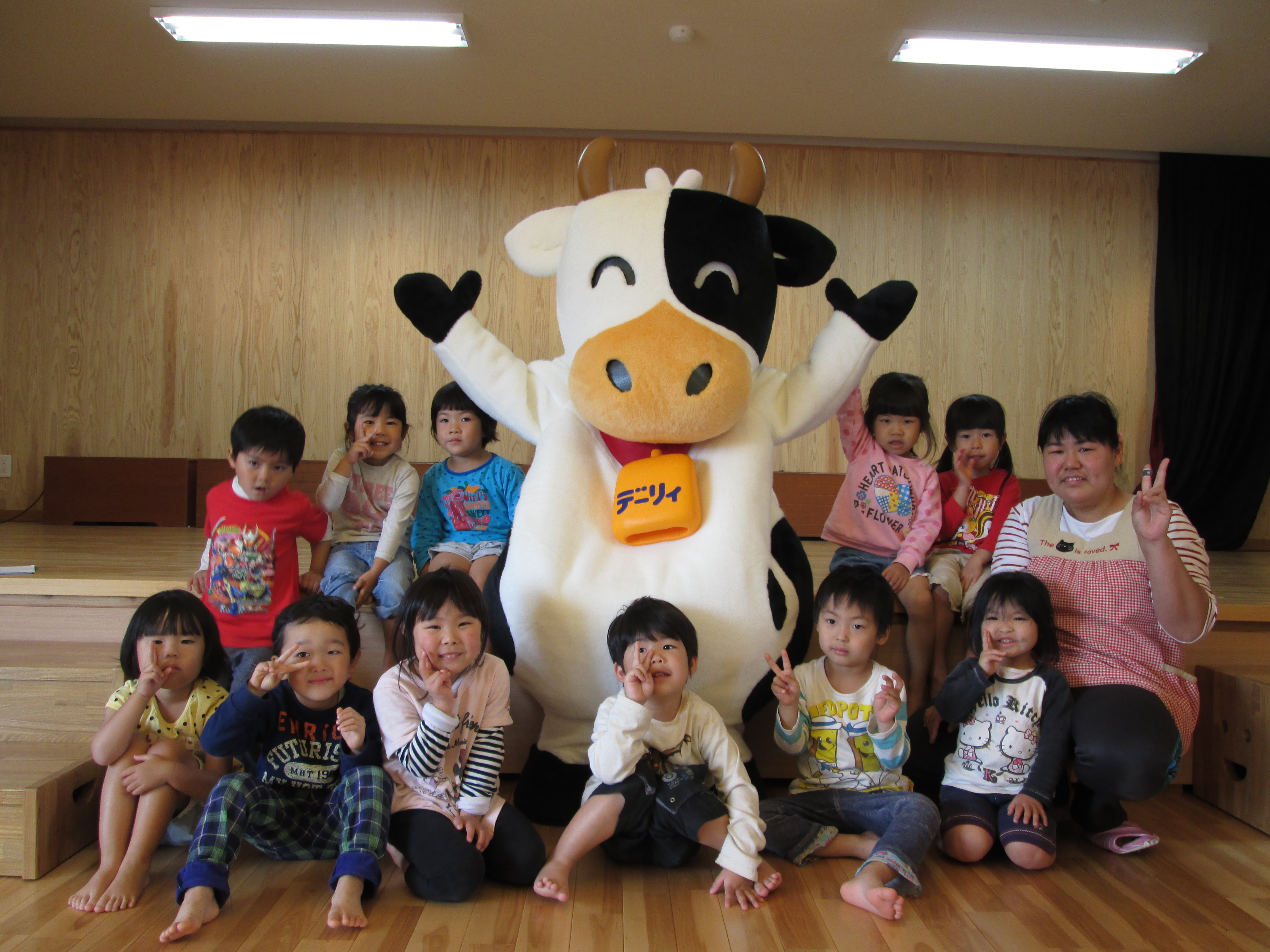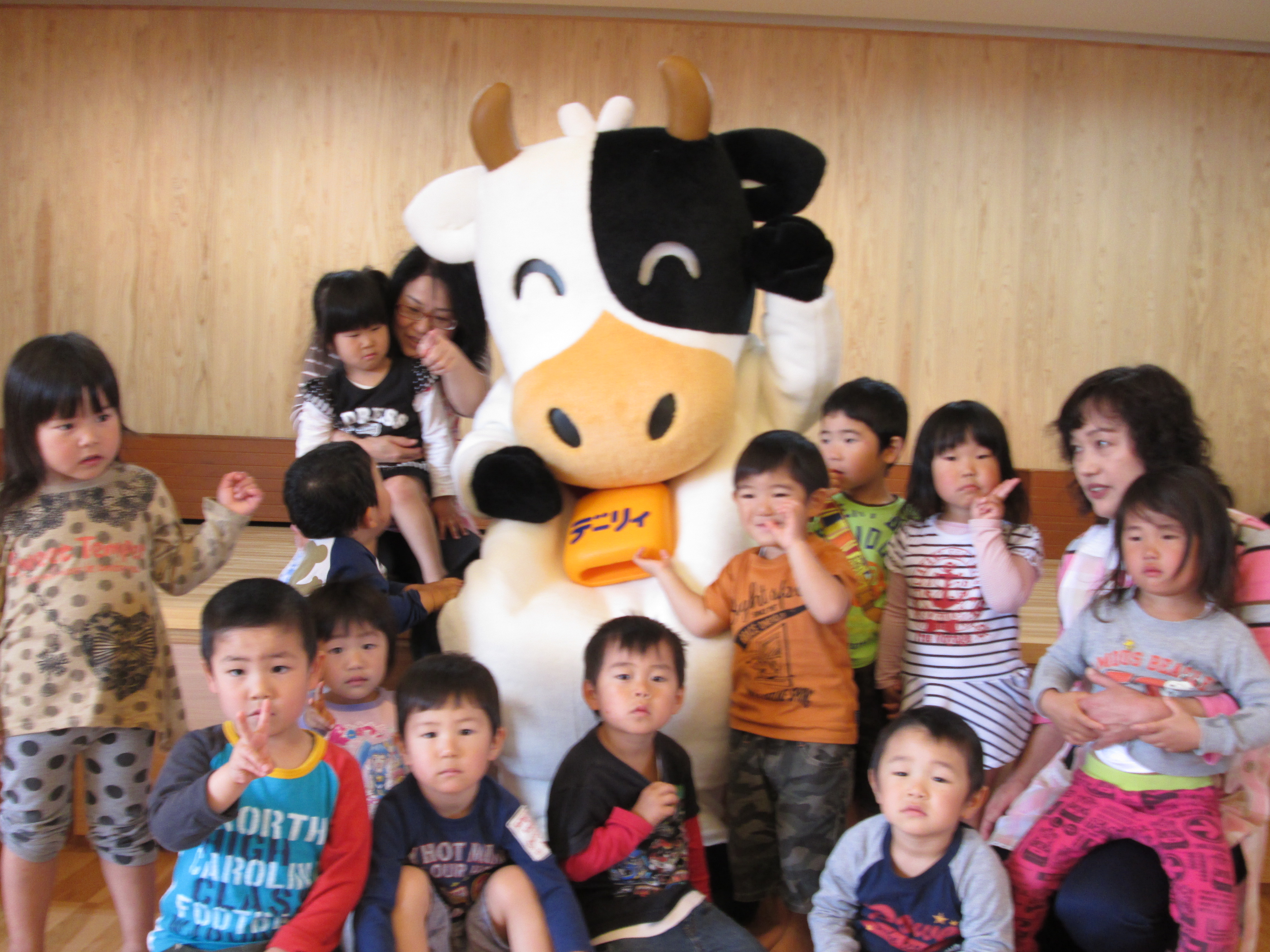 モーモーちゃん 4月30日(水) 今年も、『モーモーちゃん』が遊びにきてくれました。 昨年の事を思い出したのか、子ども達は『デーリィ飲んで~♪』と大喜び! モーモーちゃんと一緒にデーリィ体操で体を動かしたり、記念撮影を行ったりしました。 帰りには、モーモーちゃんからハンドタオルのプレゼントをいただきましたよ。