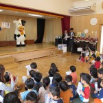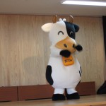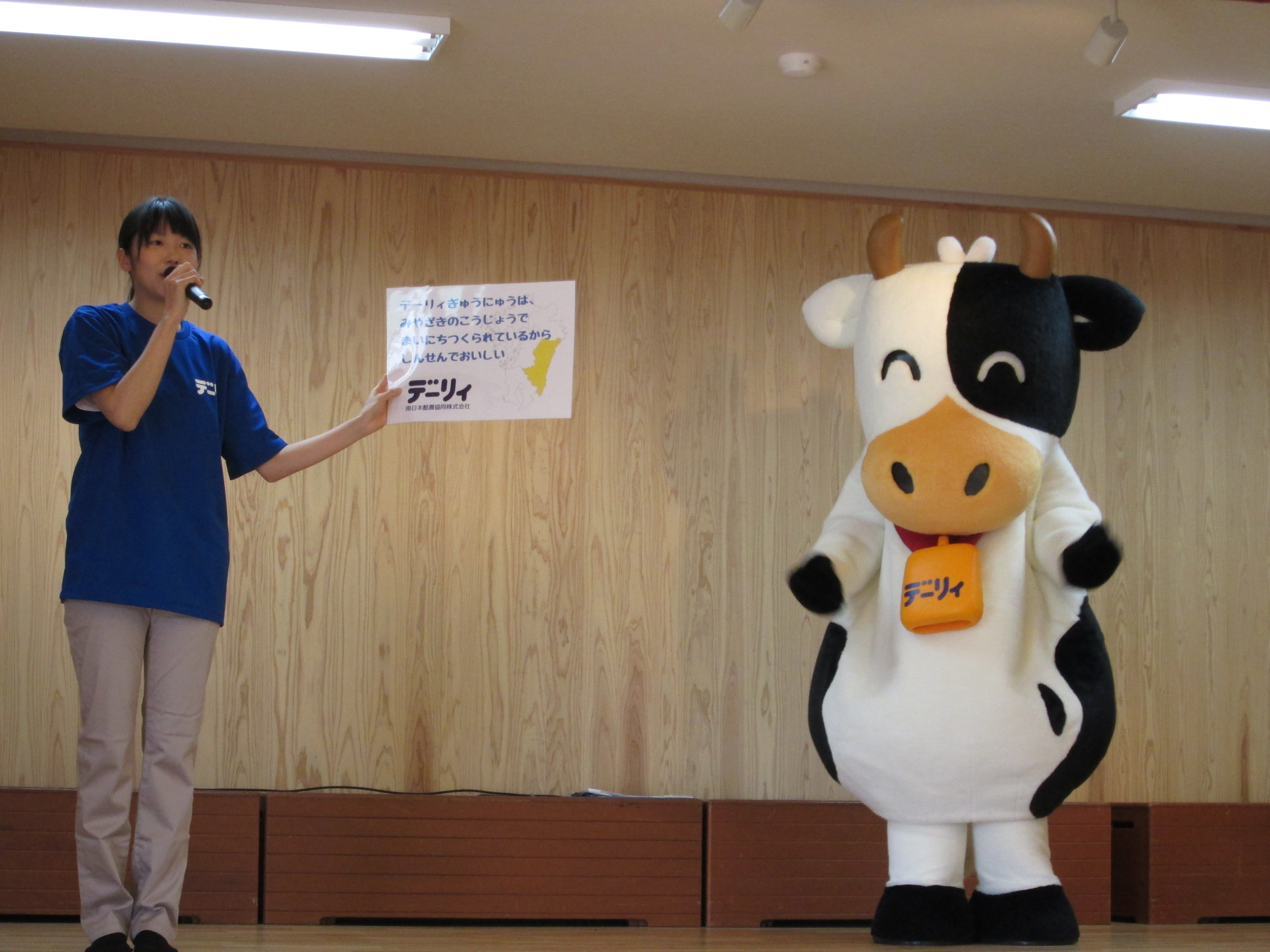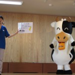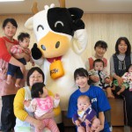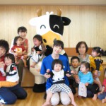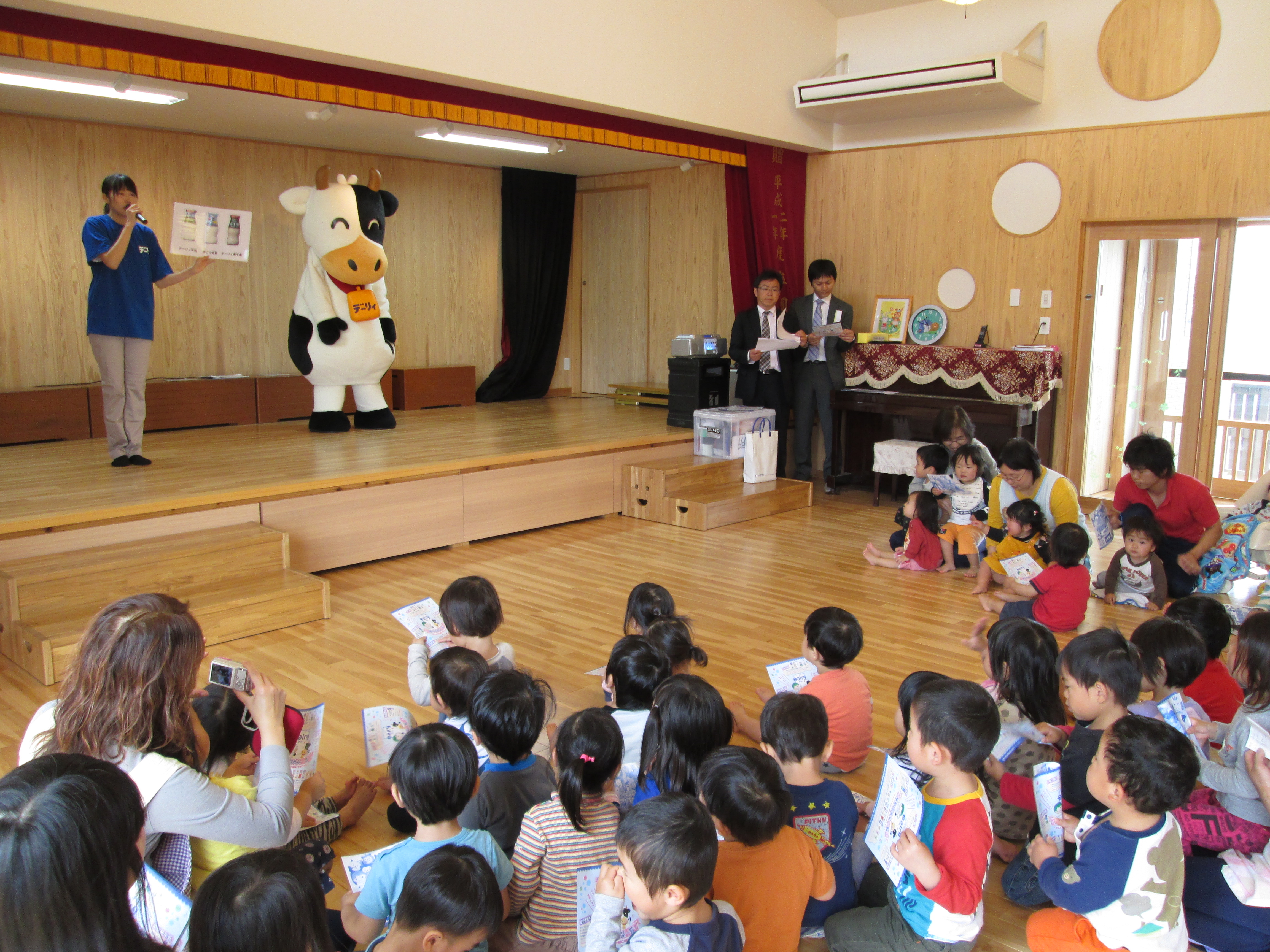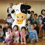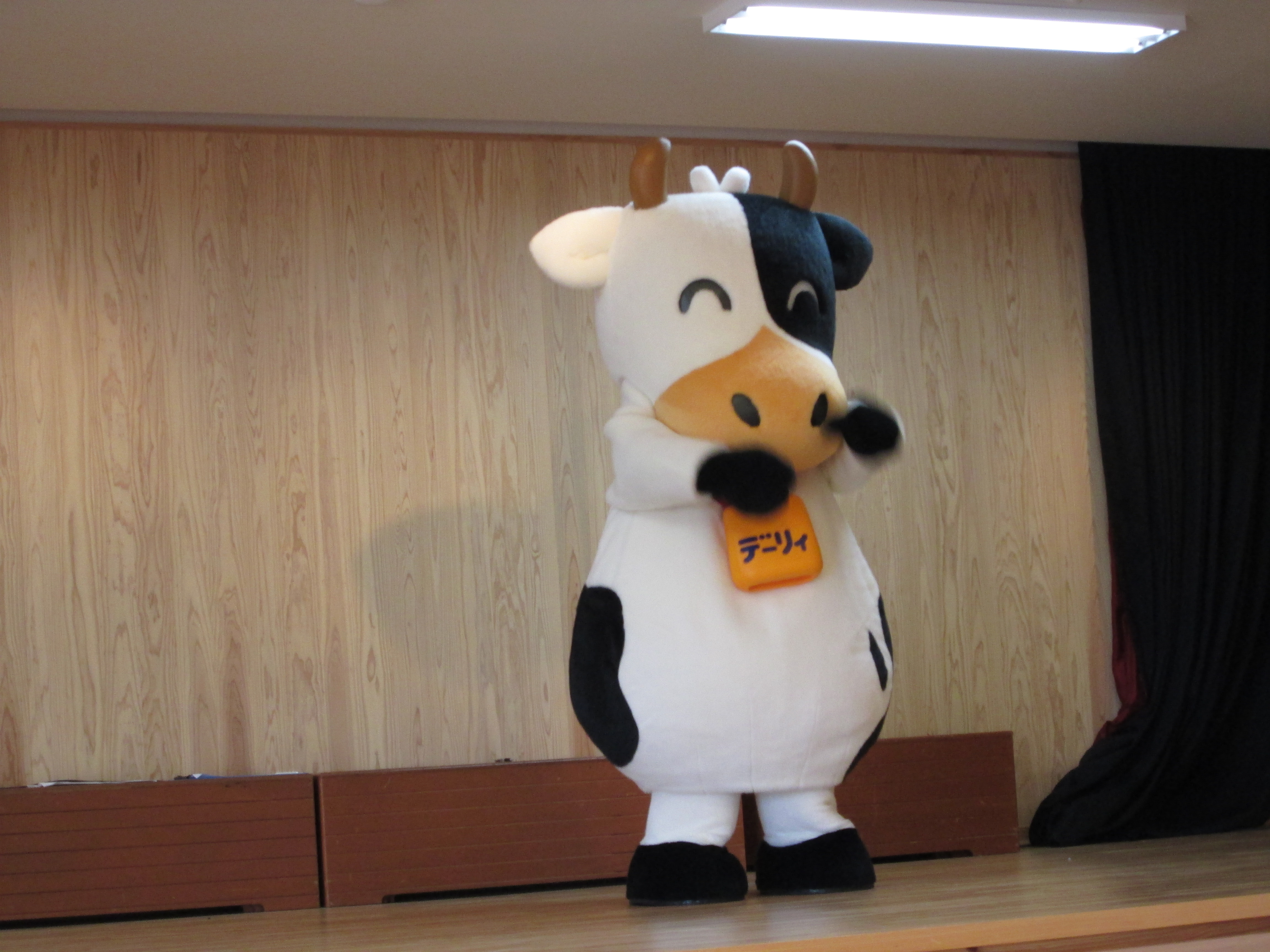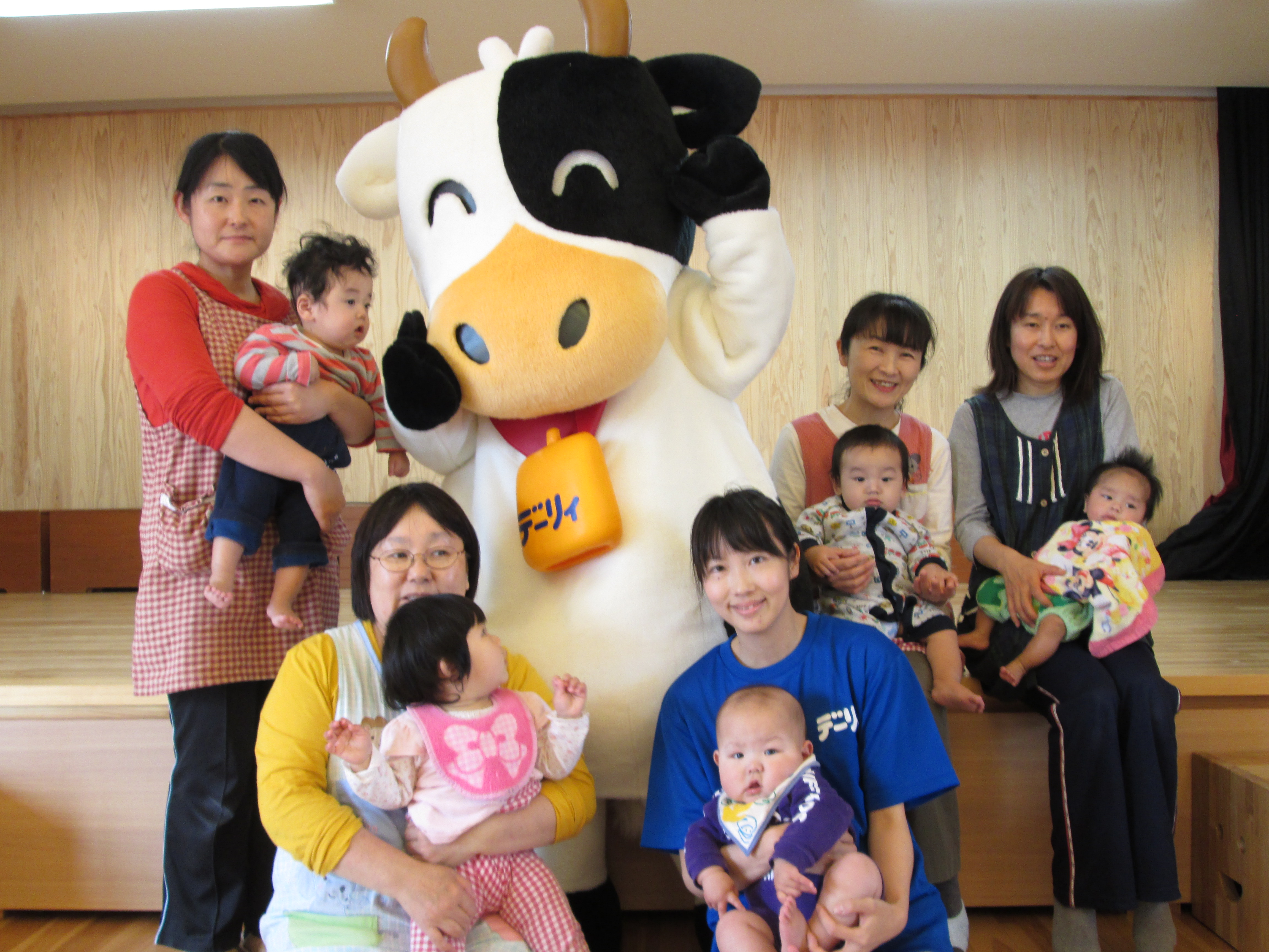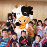 モーモーちゃん 4月30日(水) 今年も、『モーモーちゃん』が遊びにきてくれました。 昨年の事を思い出したのか、子ども達は『デーリィ飲んで~♪』と大喜び! モーモーちゃんと一緒にデーリィ体操で体を動かしたり、記念撮影を行ったりしました。 帰りには、モーモーちゃんからハンドタオルのプレゼントをいただきましたよ。