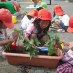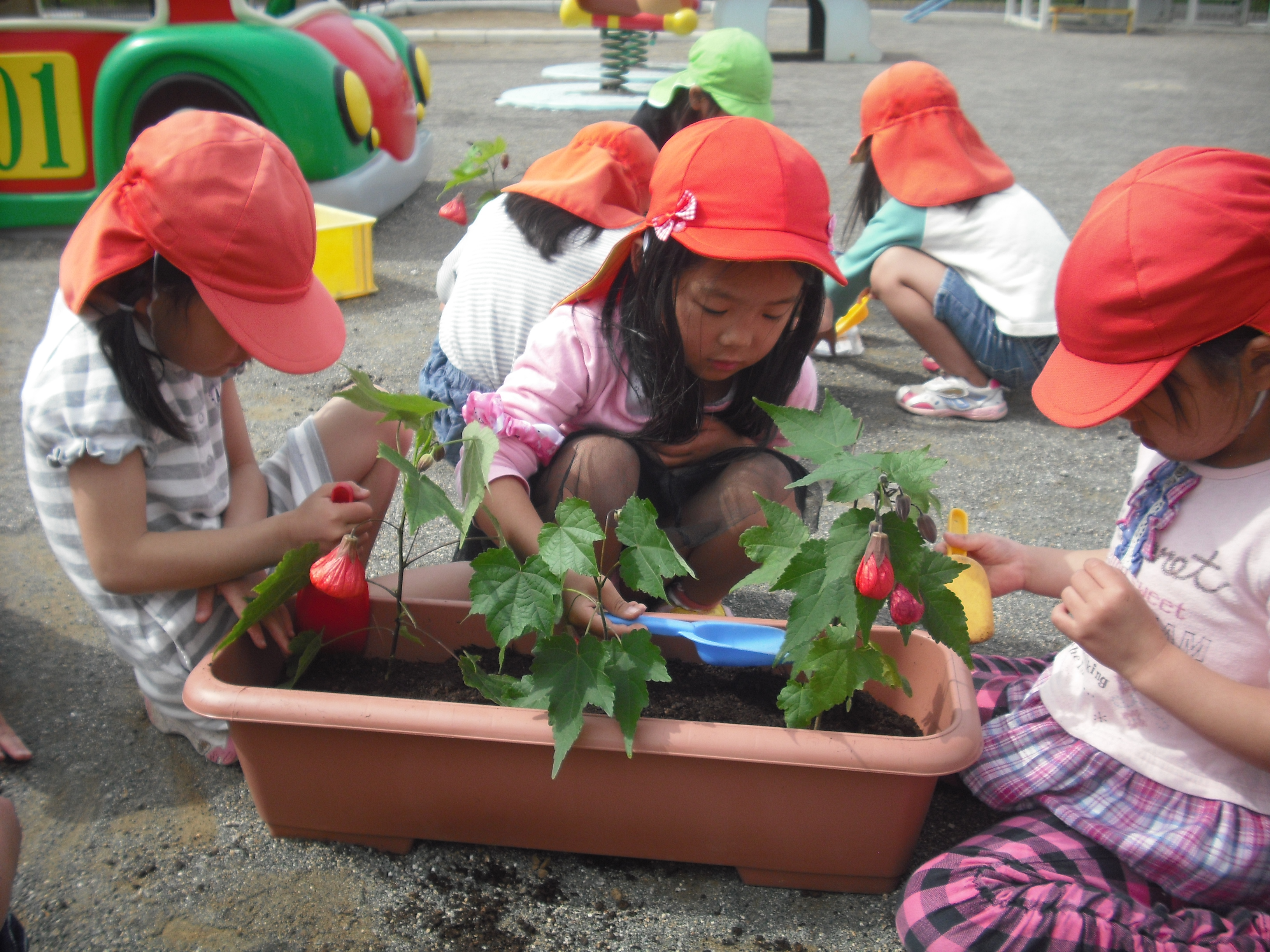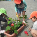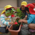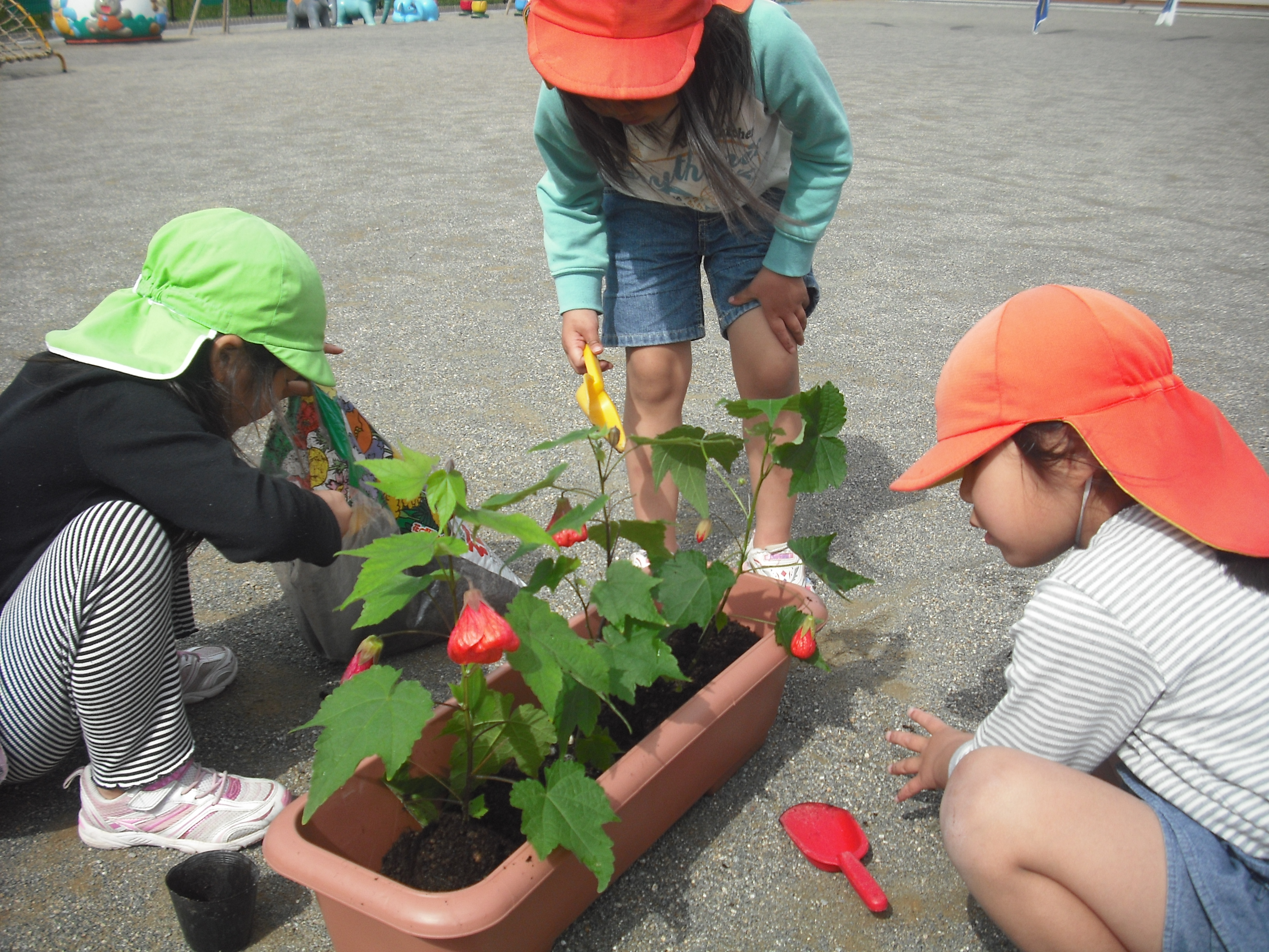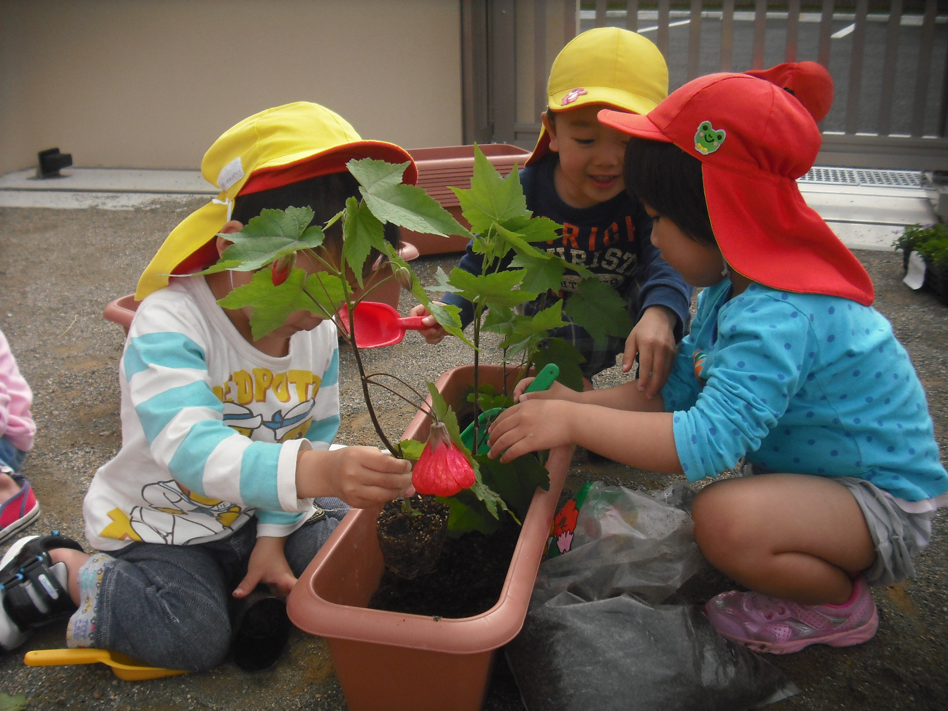 ガーデニング 4月25日(金) フローランテ宮崎様より、鯉のぼりのお礼に花の苗を沢山いただきました。 ぱんだ組・ぞう組・きりん組のお友達で、ガーデニングに挑戦! ポットから優しく苗を取り出しプランターへ・・・土の布団をかけて出来上がり。 沢山の花が園舎を飾ってくれました。